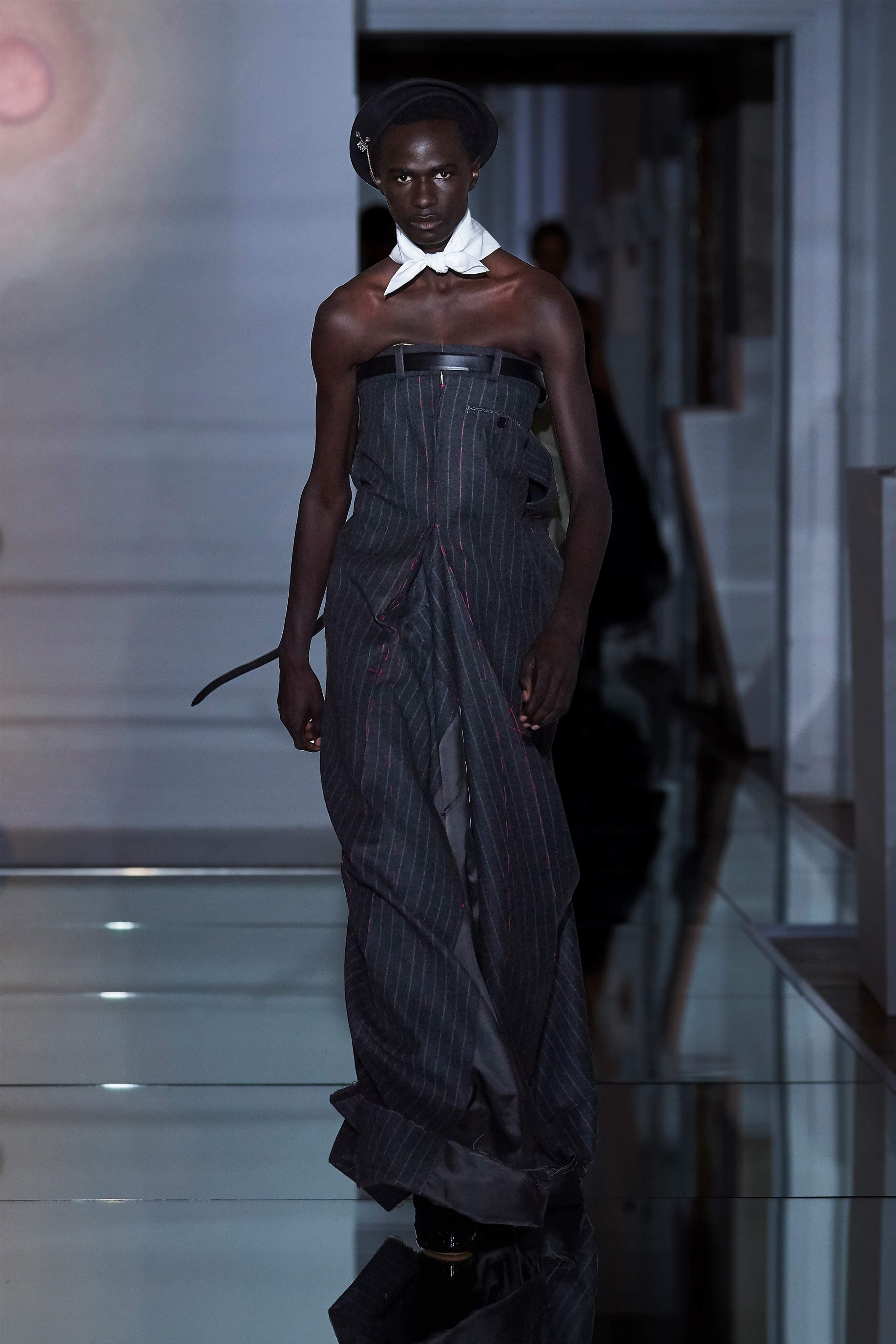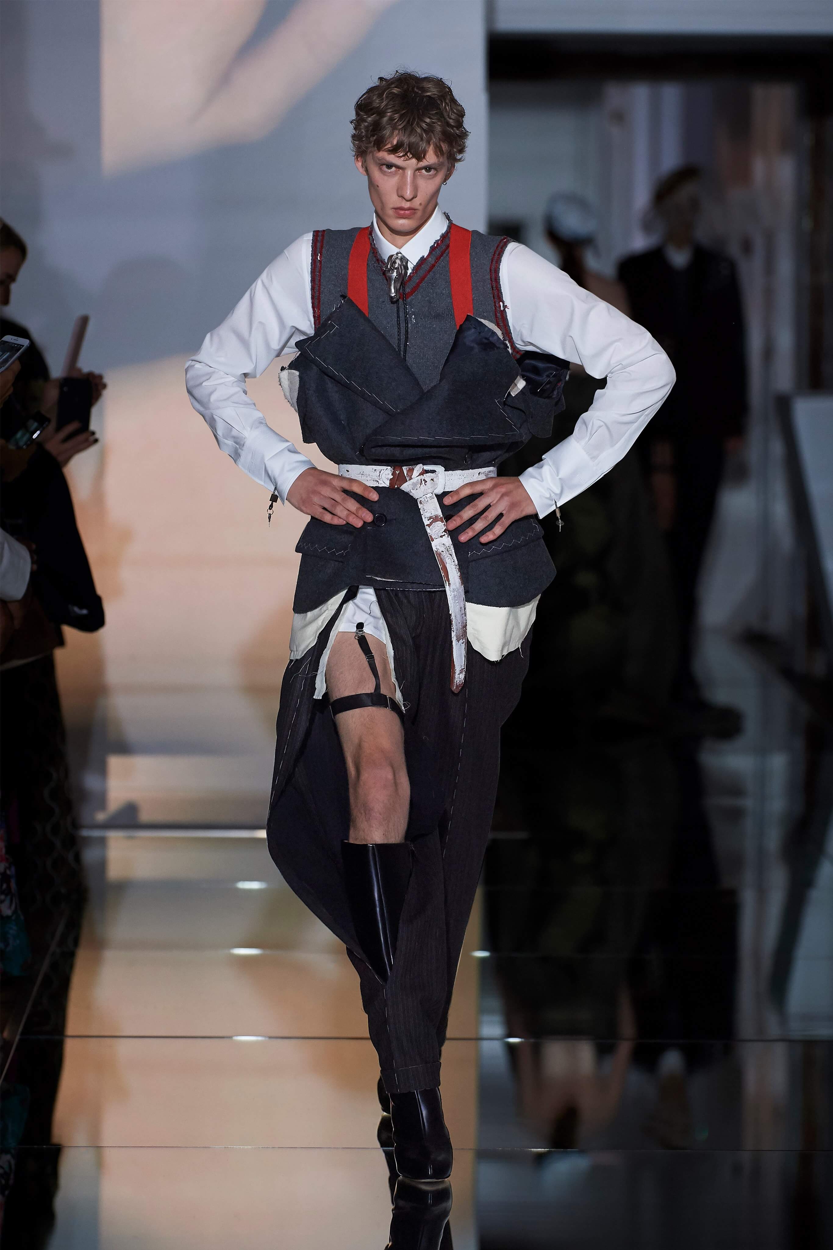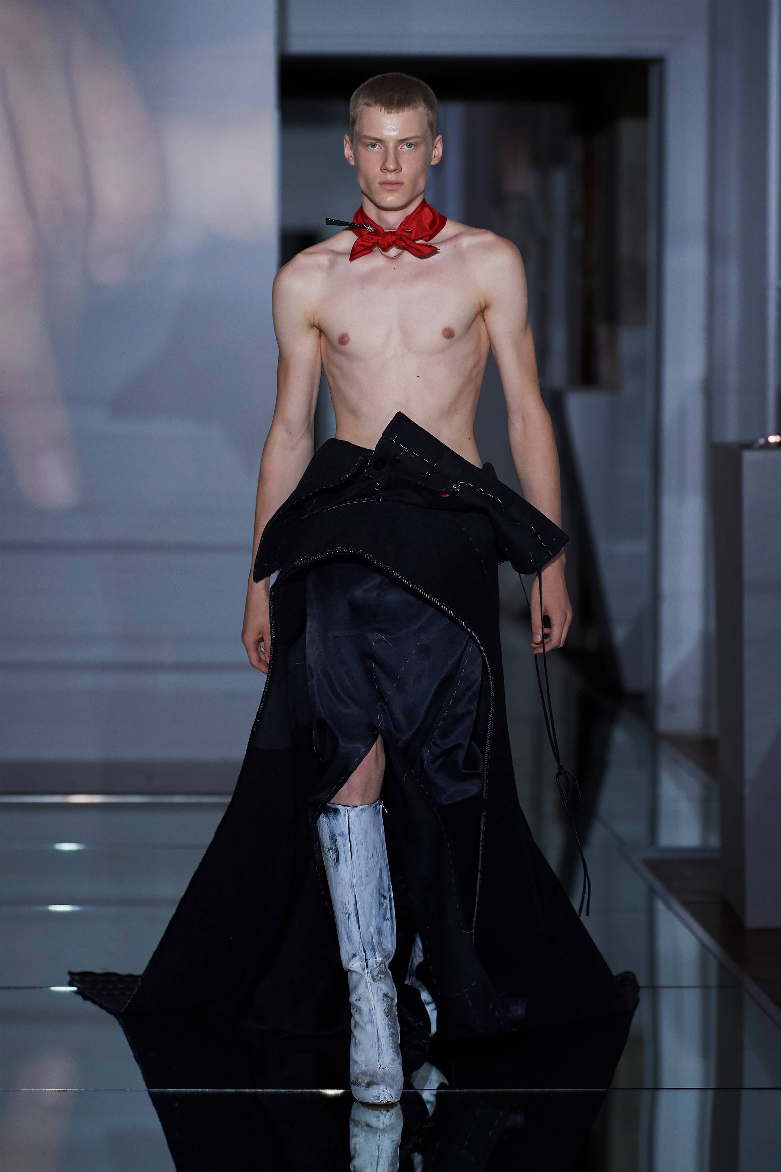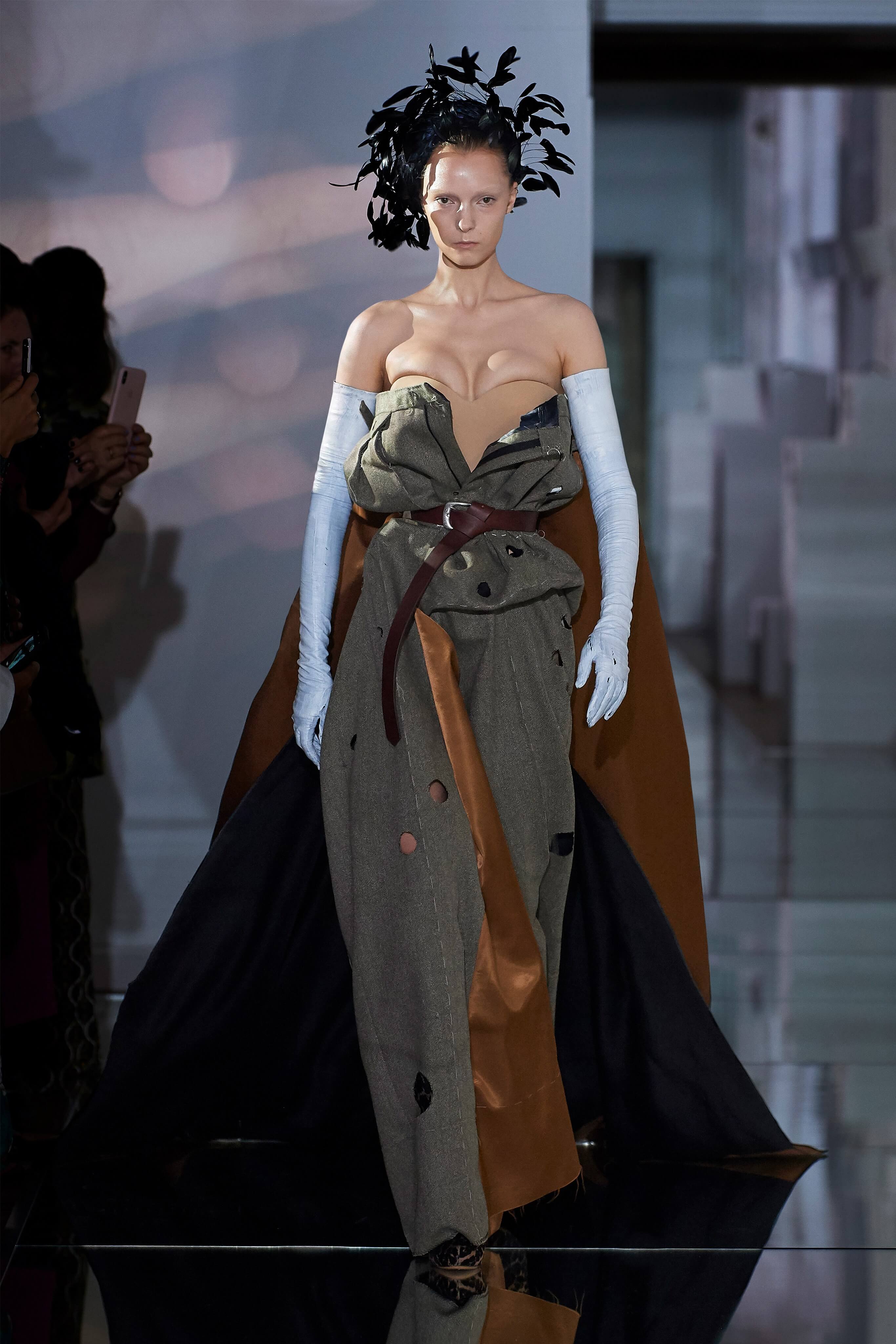 В прошлом сезоне Джон Гальяно представил на подиуме кутюрную коллекцию, посвященную вопросам внутренних тревог человека, воплотив переживания и поиски себя в гротескные и нарочито пёстрые образы. В этот раз декаданс также стал главным лейтмотивом коллекции, но теперь яркая палитра цветов сменилась возвышенной мрачностью и революционной эстетикой. Все устои перевёрнуты, а социальные структуры свергнуты, провозглашает Гальяно - и в подтверждение его слов одежда также подвергается трансформации: твидовые брюки превратились в бюстье, стянутые грубым ремнём под грудью, топы, пиджаки и тренчи стали юбками и поясными басками, а на отворотах пальто и жакетов, сшитых швами наружу, рдели алые шелковые платки - символы пламени человеческого сердца и революционного начала.