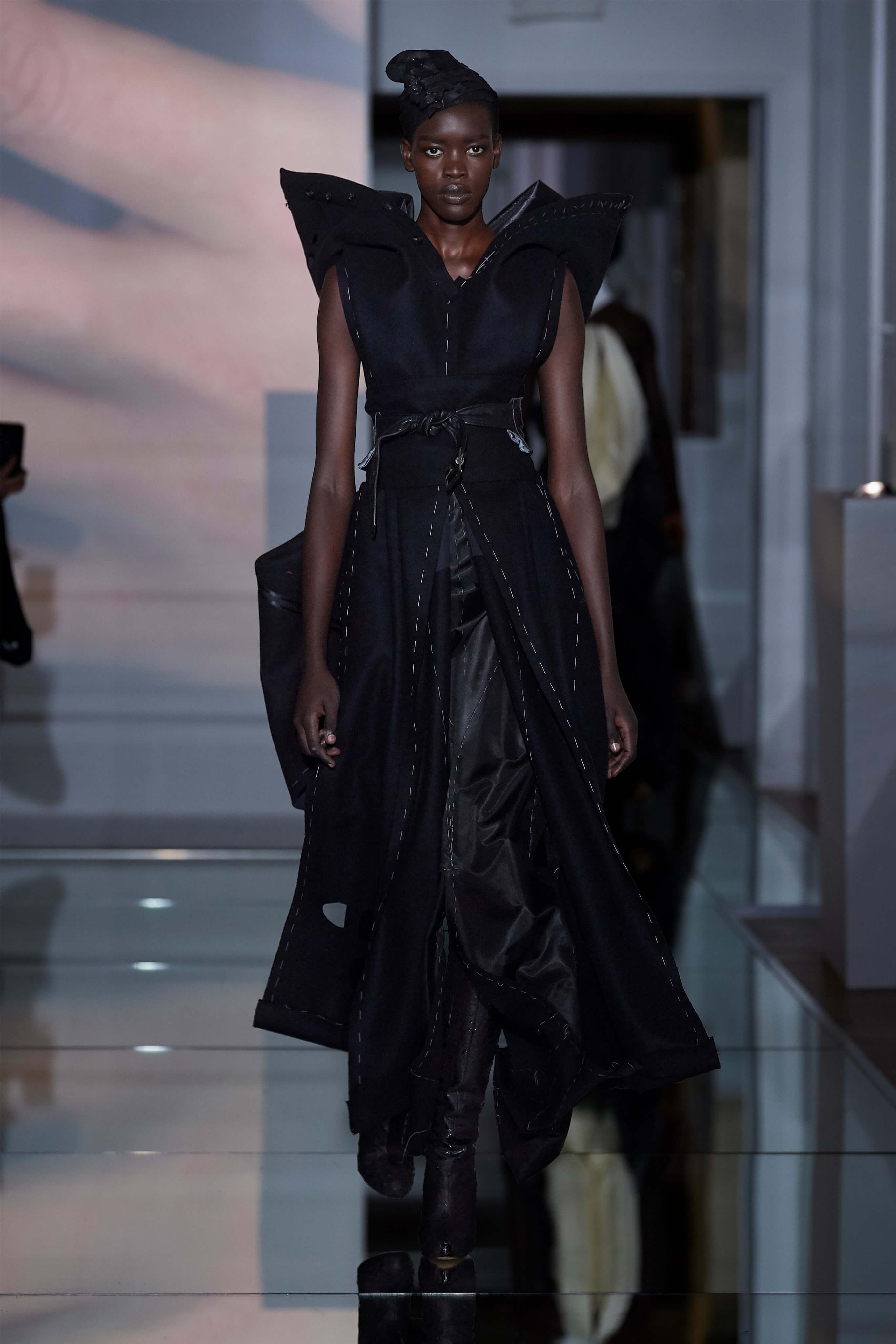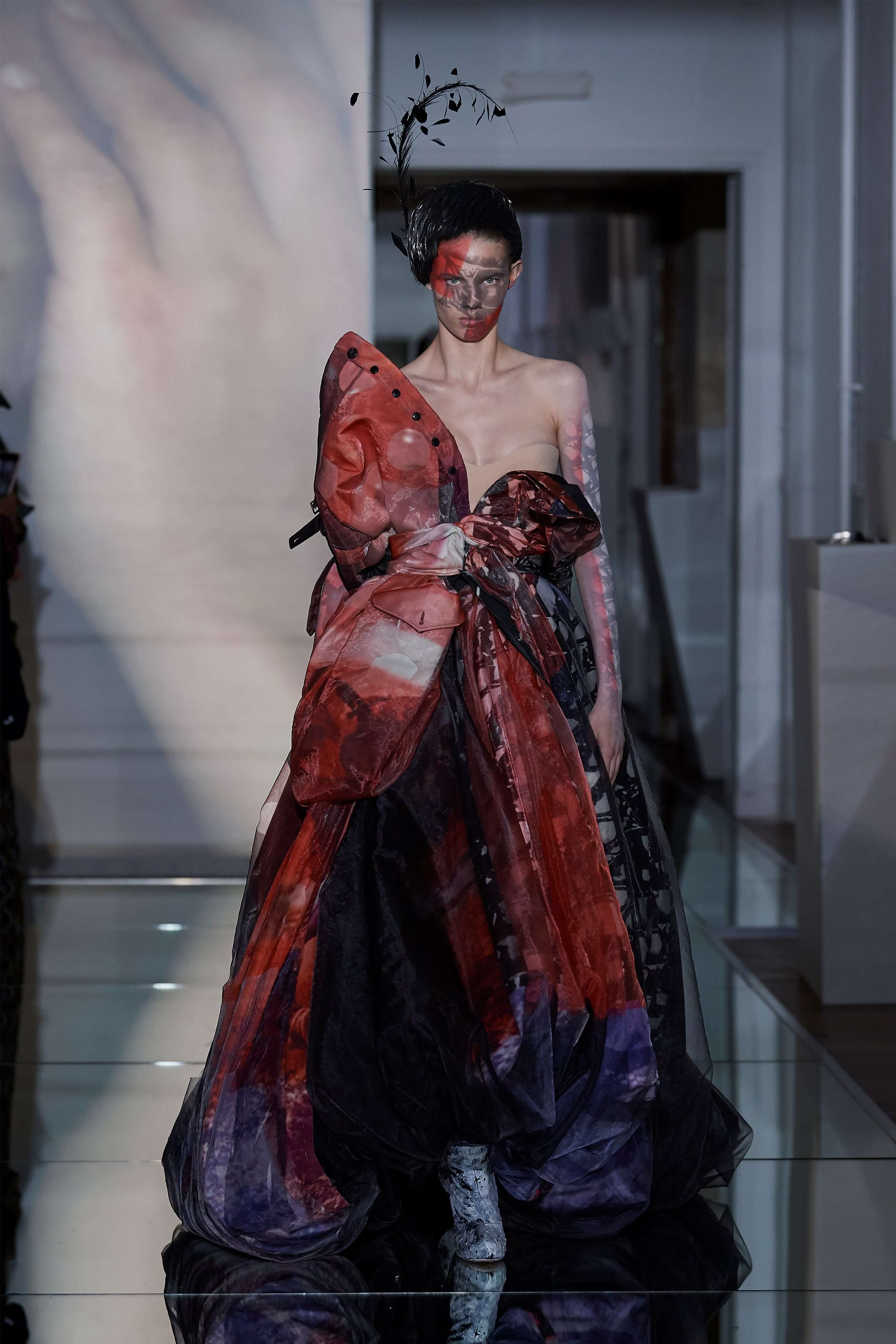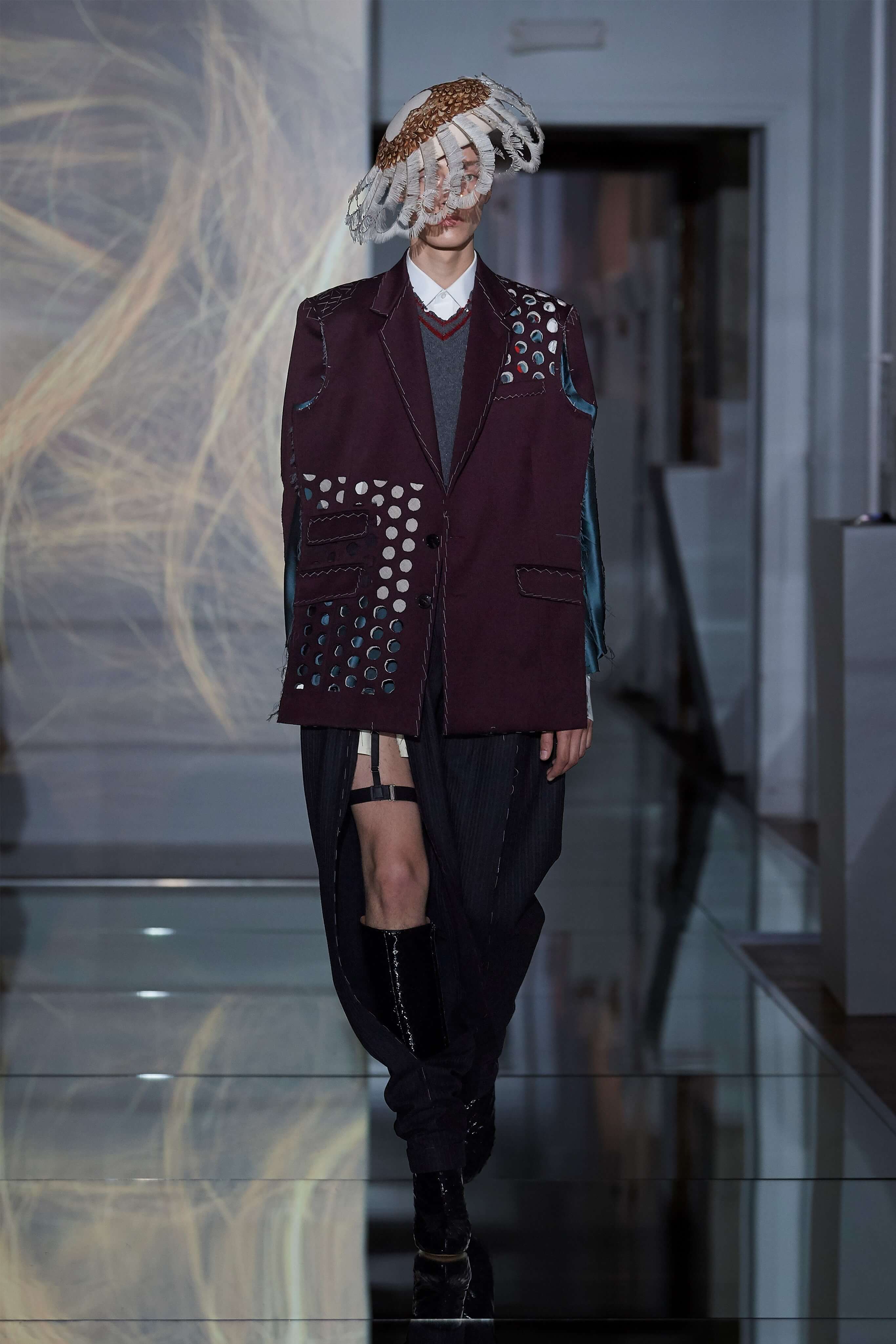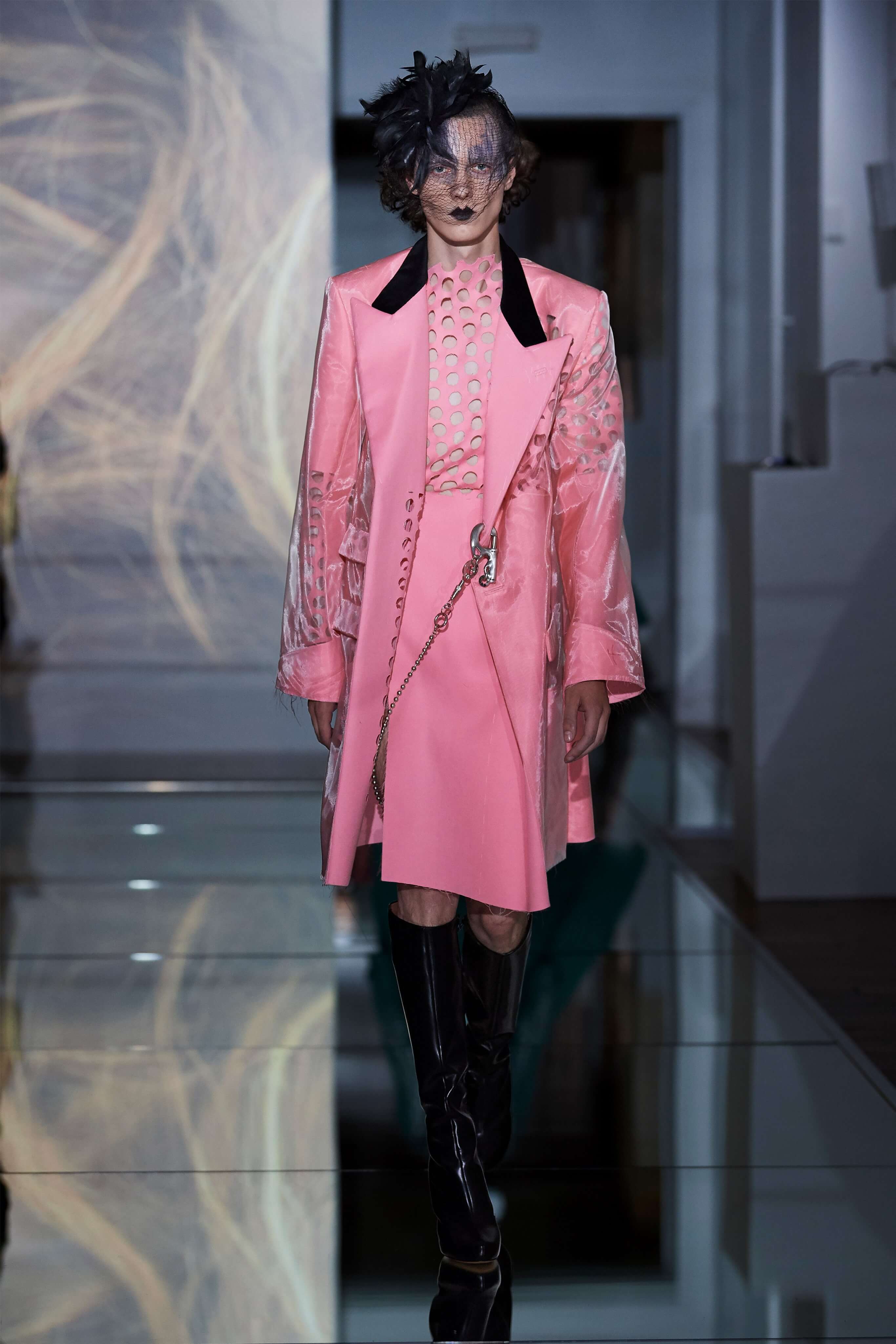 В прошлом сезоне Джон Гальяно представил на подиуме кутюрную коллекцию, посвященную вопросам внутренних тревог человека, воплотив переживания и поиски себя в гротескные и нарочито пёстрые образы. В этот раз декаданс также стал главным лейтмотивом коллекции, но теперь яркая палитра цветов сменилась возвышенной мрачностью и революционной эстетикой. Все устои перевёрнуты, а социальные структуры свергнуты, провозглашает Гальяно - и в подтверждение его слов одежда также подвергается трансформации: твидовые брюки превратились в бюстье, стянутые грубым ремнём под грудью, топы, пиджаки и тренчи стали юбками и поясными басками, а на отворотах пальто и жакетов, сшитых швами наружу, рдели алые шелковые платки - символы пламени человеческого сердца и революционного начала.