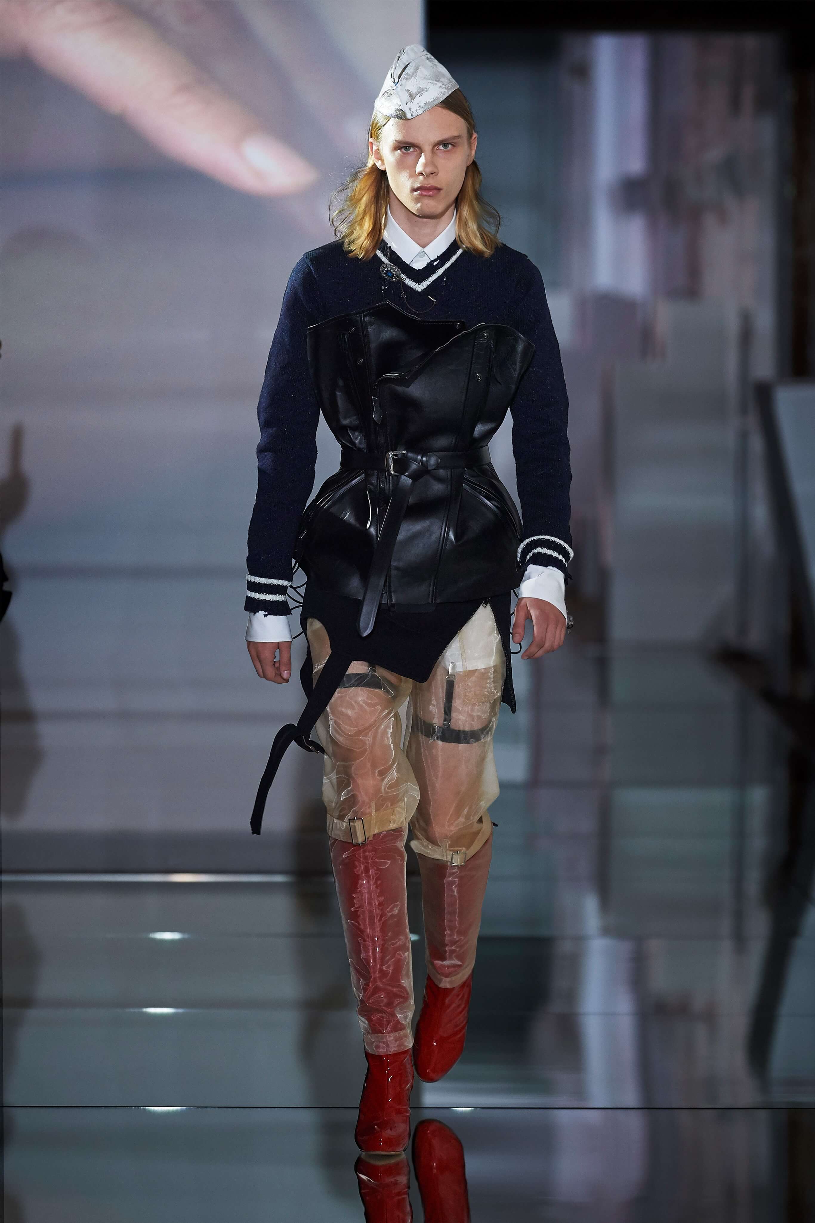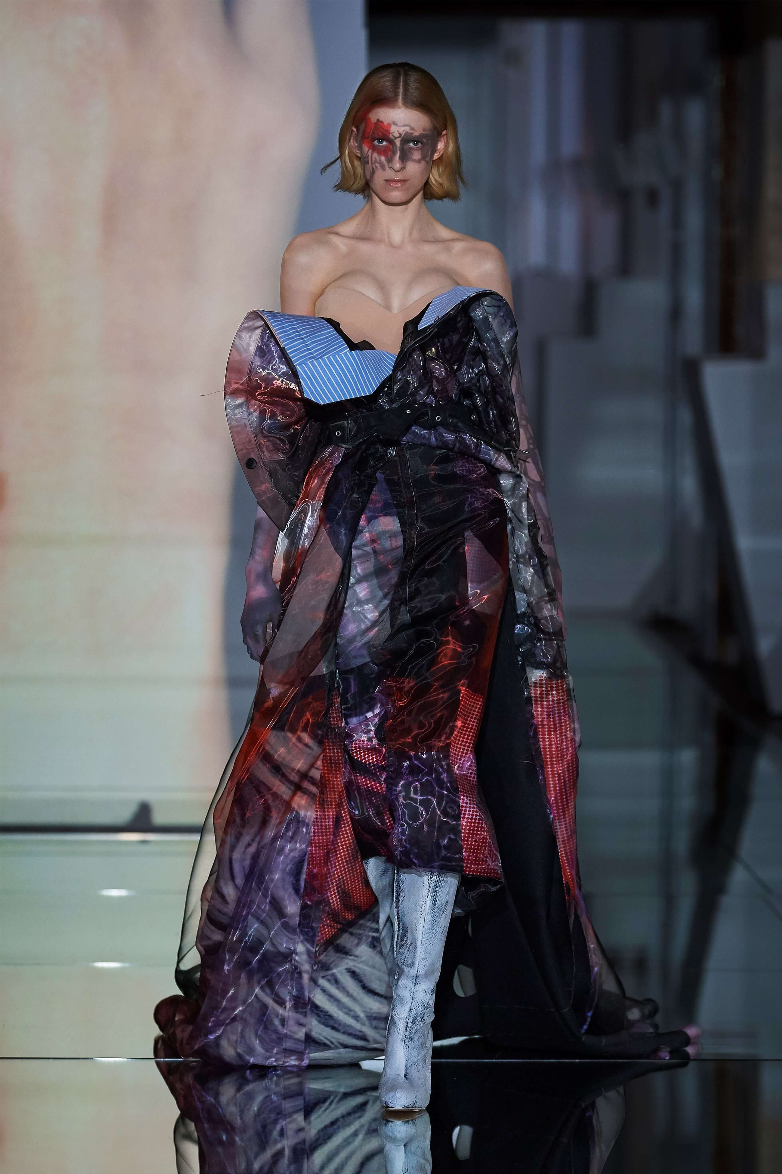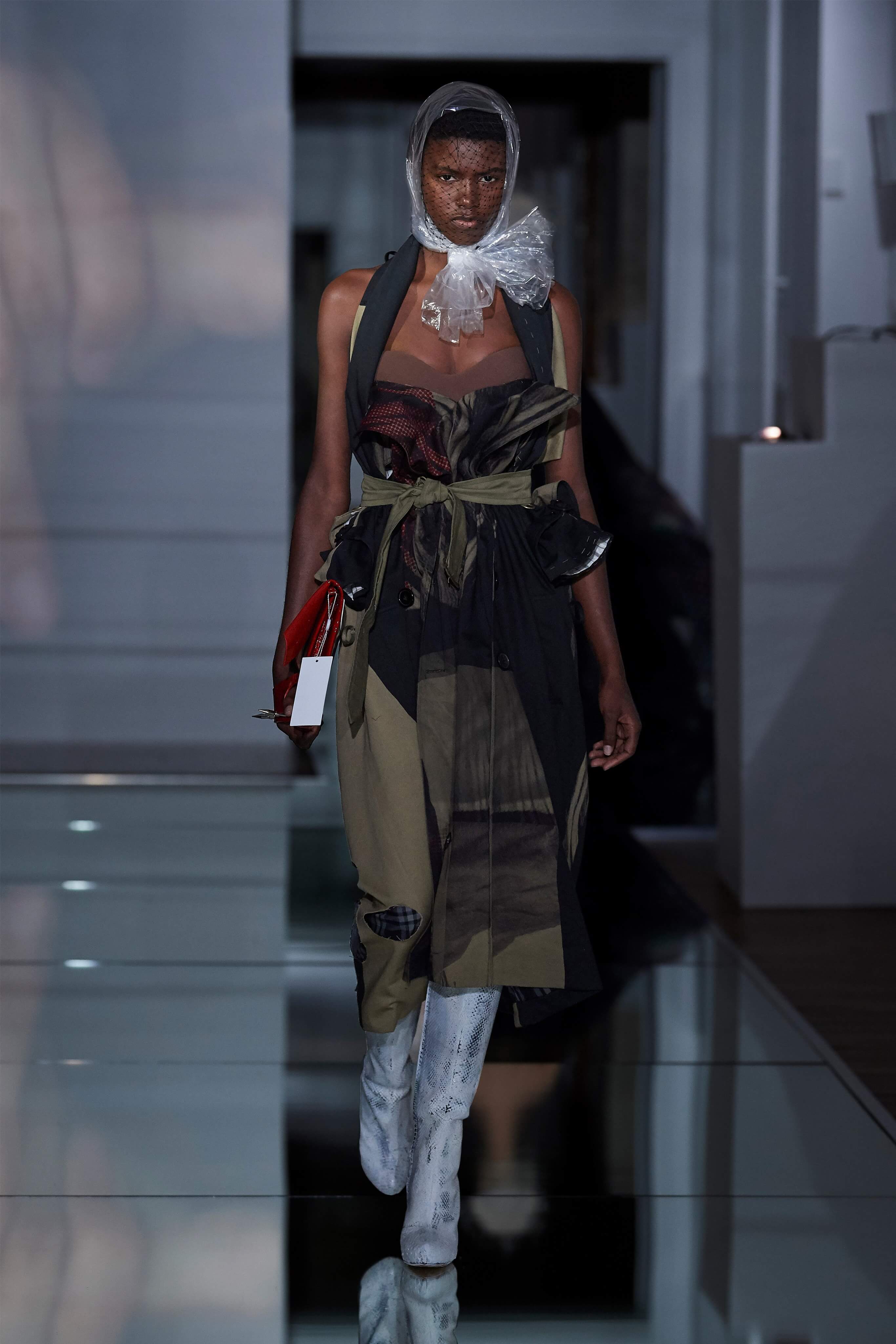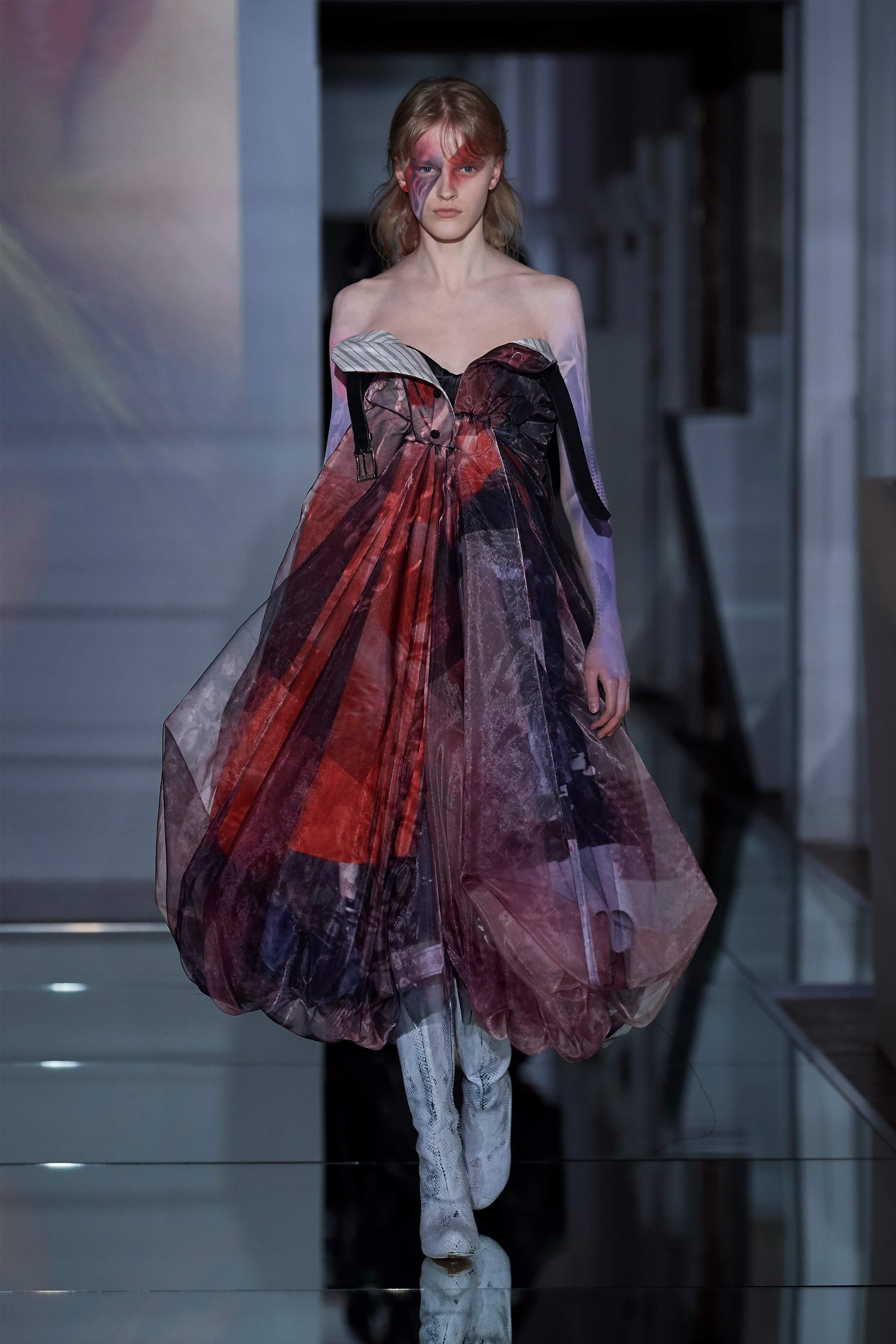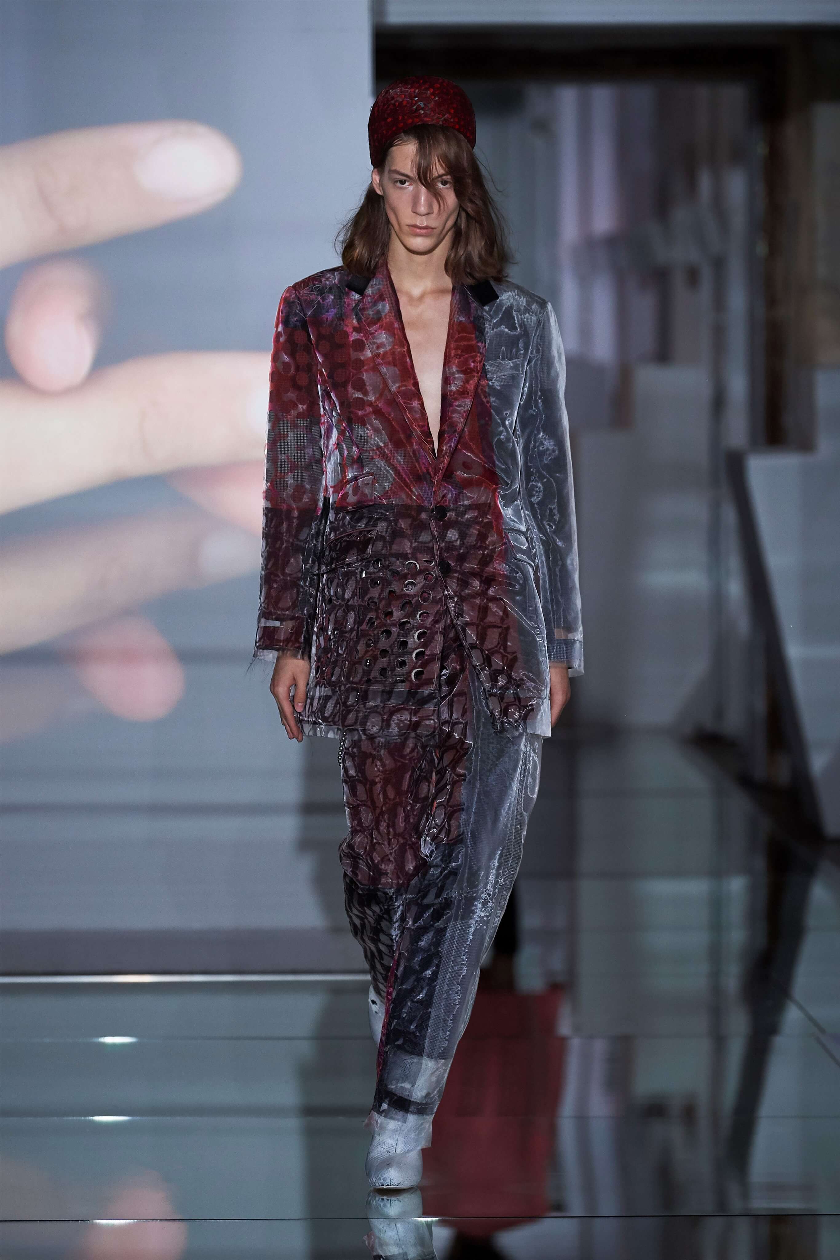 В прошлом сезоне Джон Гальяно представил на подиуме кутюрную коллекцию, посвященную вопросам внутренних тревог человека, воплотив переживания и поиски себя в гротескные и нарочито пёстрые образы. В этот раз декаданс также стал главным лейтмотивом коллекции, но теперь яркая палитра цветов сменилась возвышенной мрачностью и революционной эстетикой. Все устои перевёрнуты, а социальные структуры свергнуты, провозглашает Гальяно - и в подтверждение его слов одежда также подвергается трансформации: твидовые брюки превратились в бюстье, стянутые грубым ремнём под грудью, топы, пиджаки и тренчи стали юбками и поясными басками, а на отворотах пальто и жакетов, сшитых швами наружу, рдели алые шелковые платки - символы пламени человеческого сердца и революционного начала.
