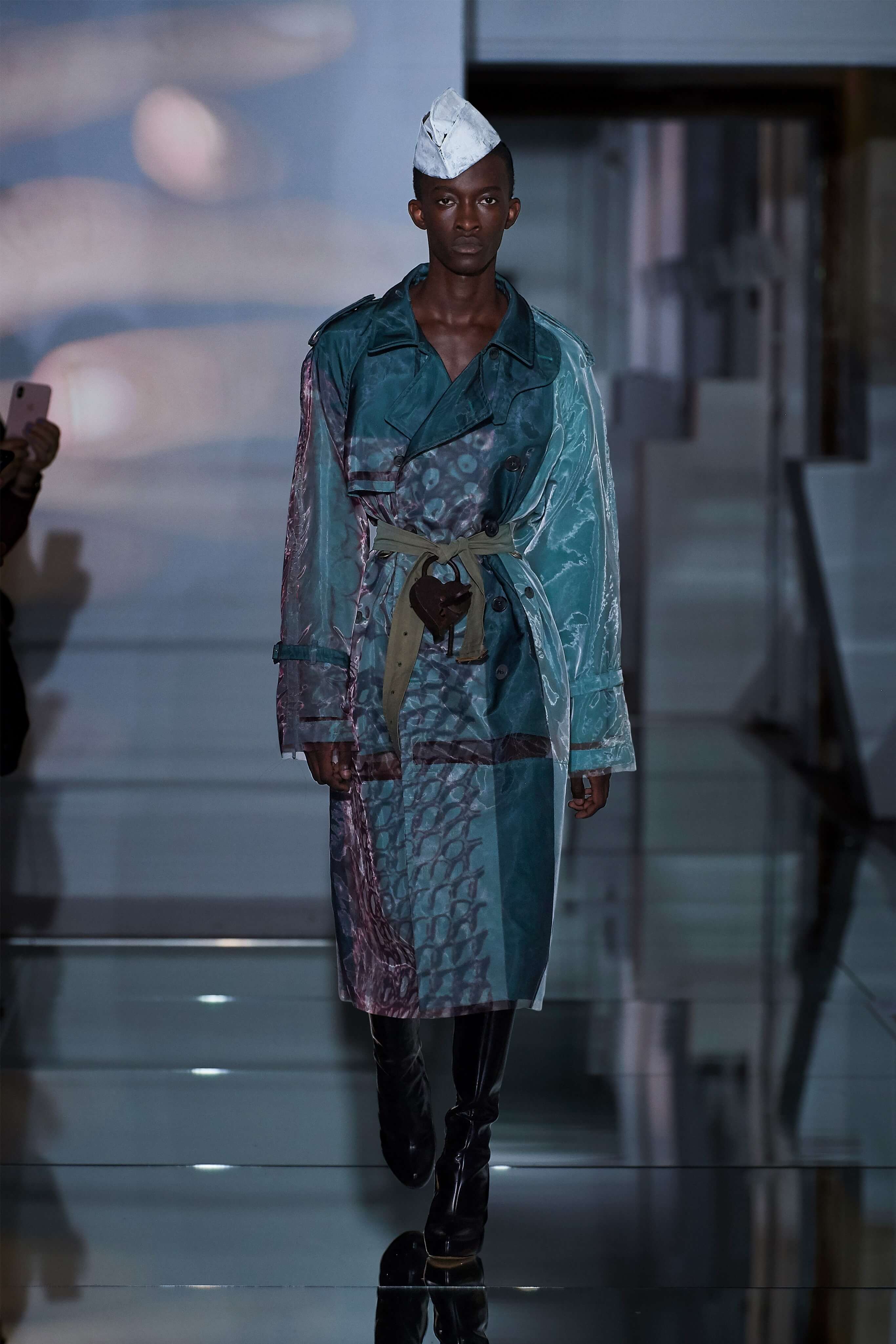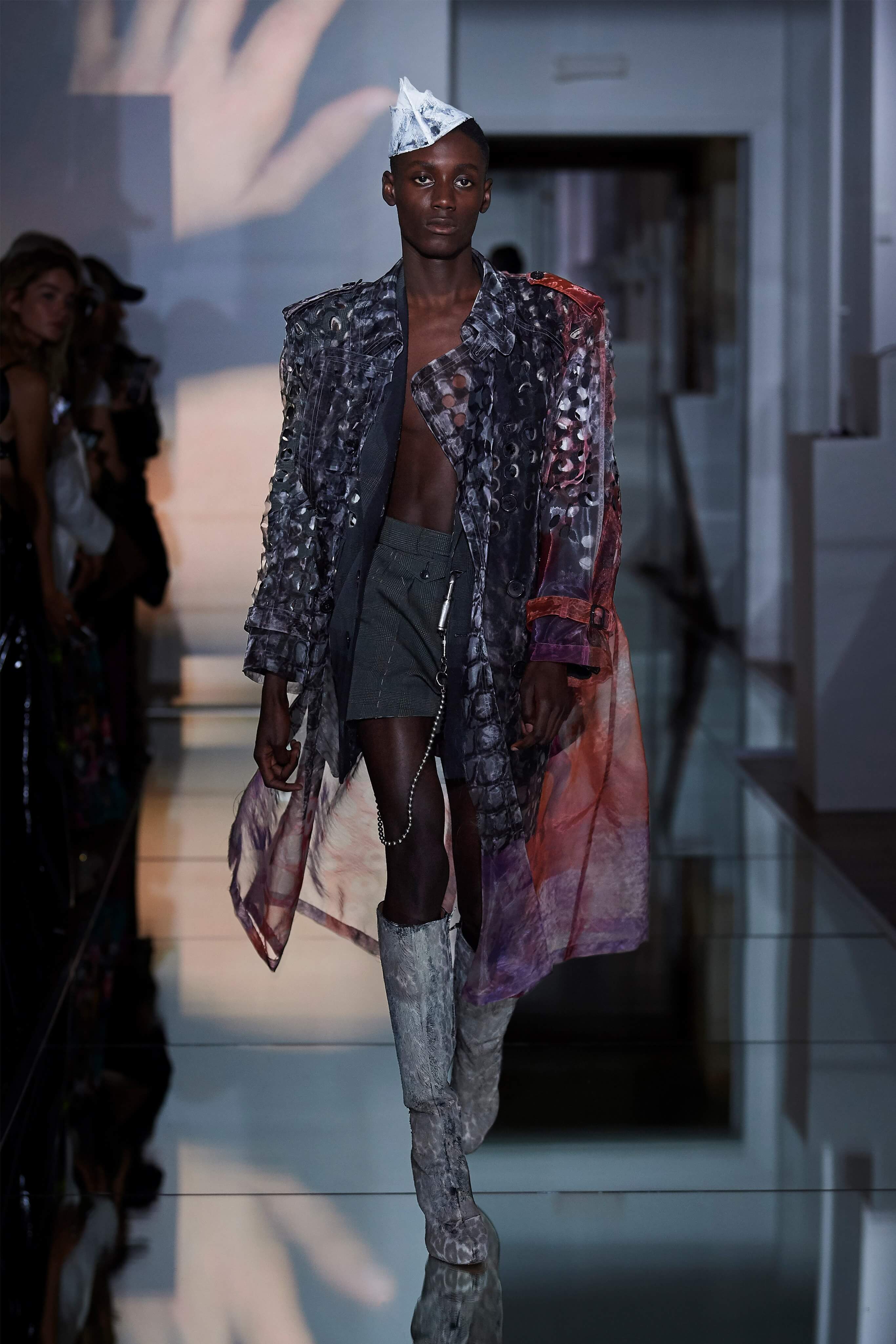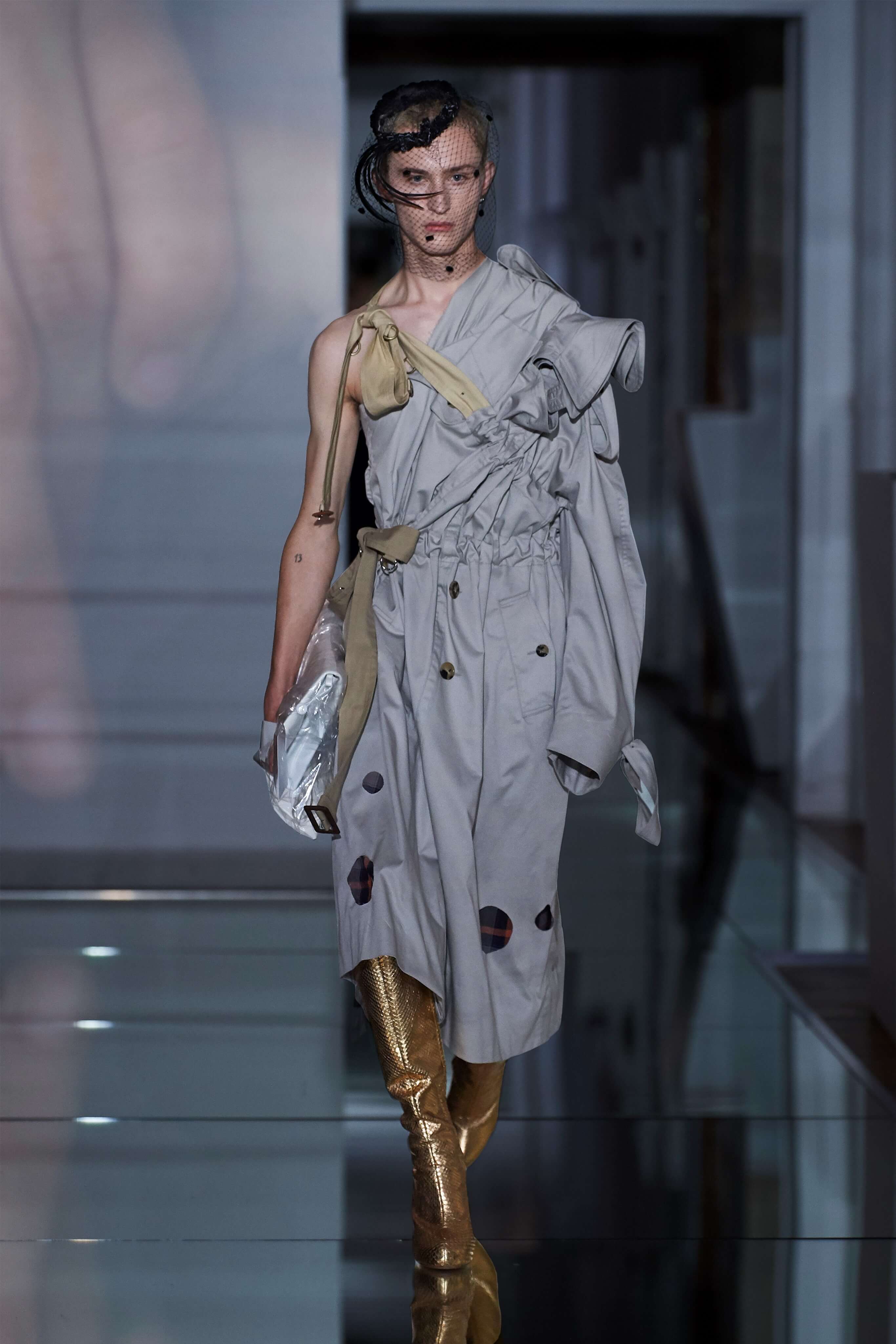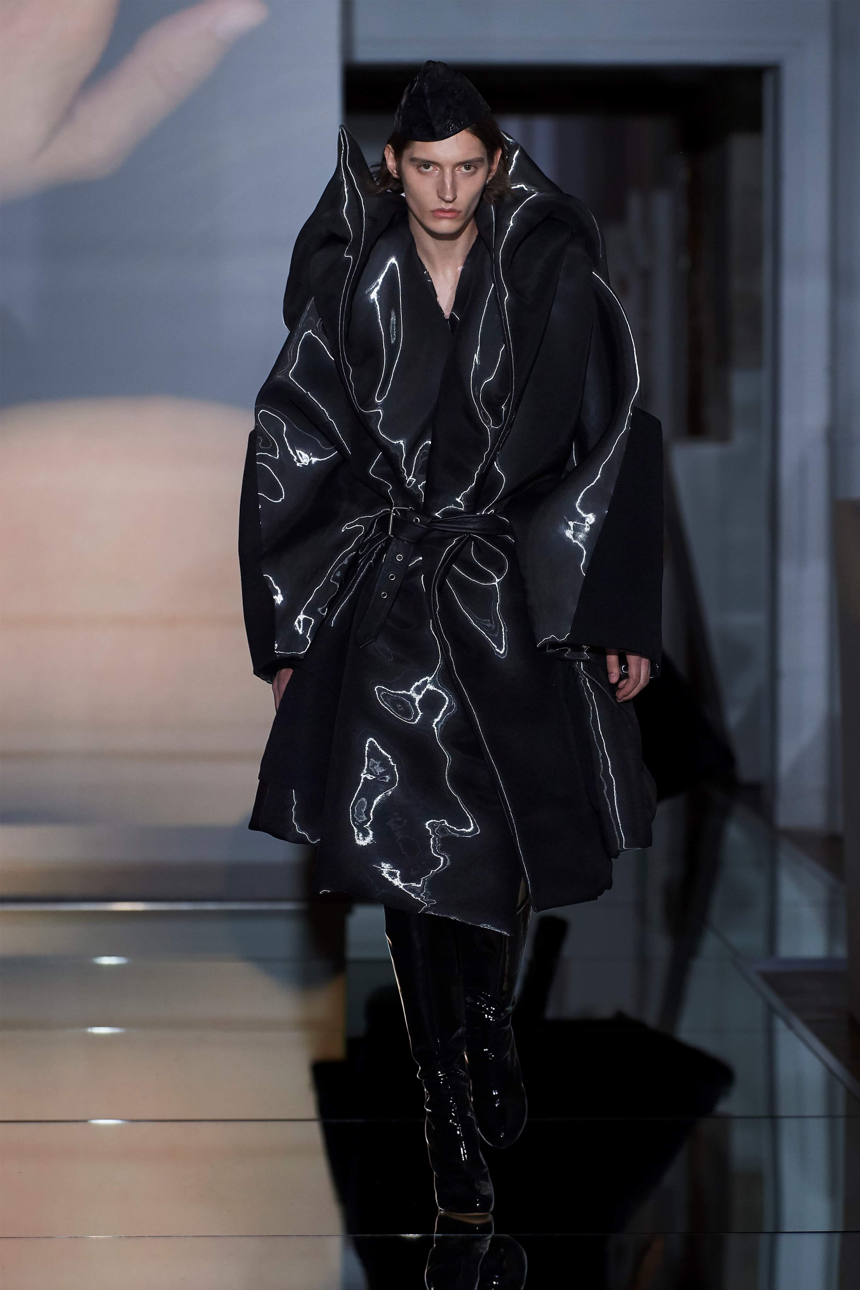 В прошлом сезоне Джон Гальяно представил на подиуме кутюрную коллекцию, посвященную вопросам внутренних тревог человека, воплотив переживания и поиски себя в гротескные и нарочито пёстрые образы. В этот раз декаданс также стал главным лейтмотивом коллекции, но теперь яркая палитра цветов сменилась возвышенной мрачностью и революционной эстетикой. Все устои перевёрнуты, а социальные структуры свергнуты, провозглашает Гальяно - и в подтверждение его слов одежда также подвергается трансформации: твидовые брюки превратились в бюстье, стянутые грубым ремнём под грудью, топы, пиджаки и тренчи стали юбками и поясными басками, а на отворотах пальто и жакетов, сшитых швами наружу, рдели алые шелковые платки - символы пламени человеческого сердца и революционного начала.