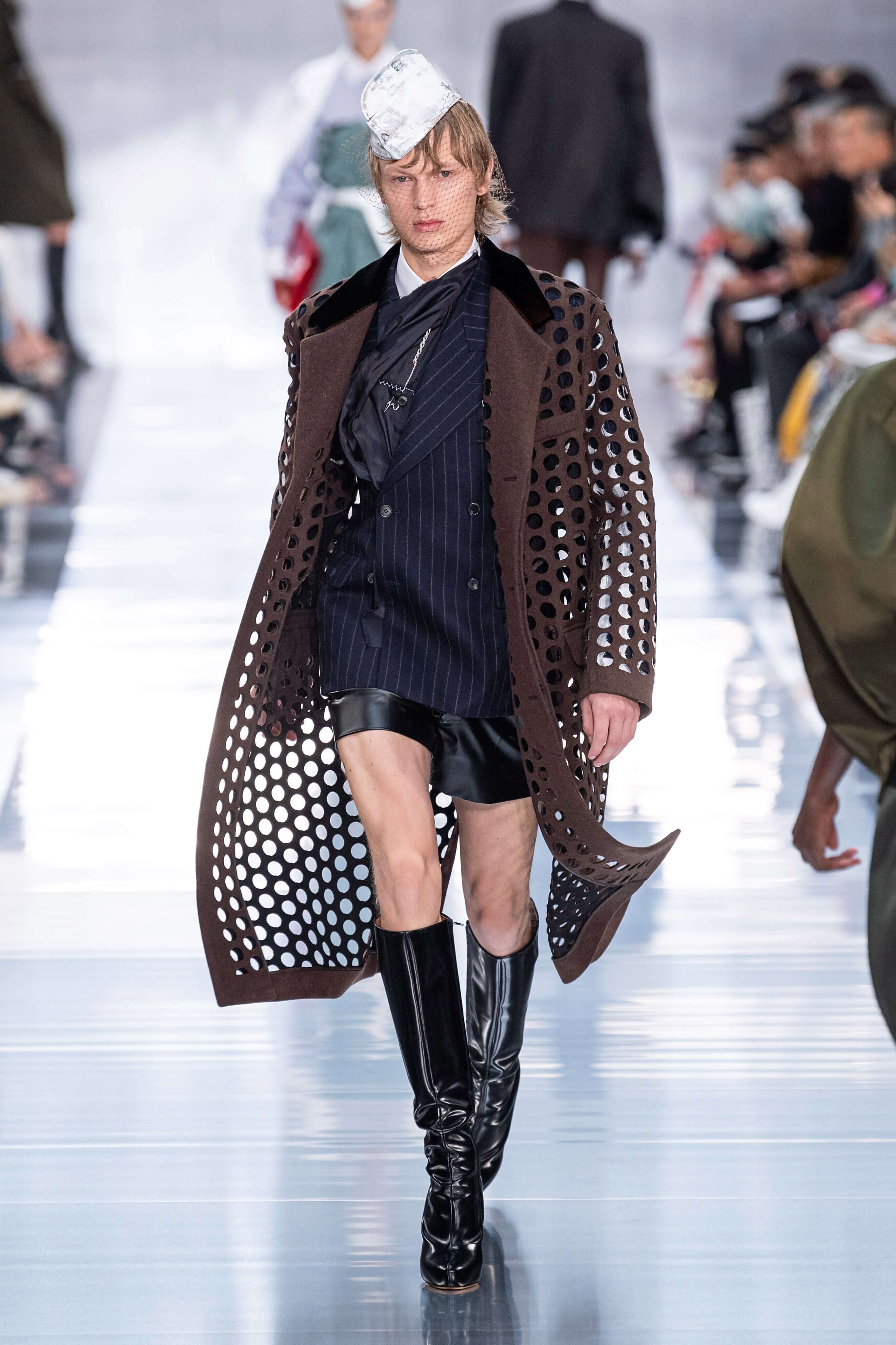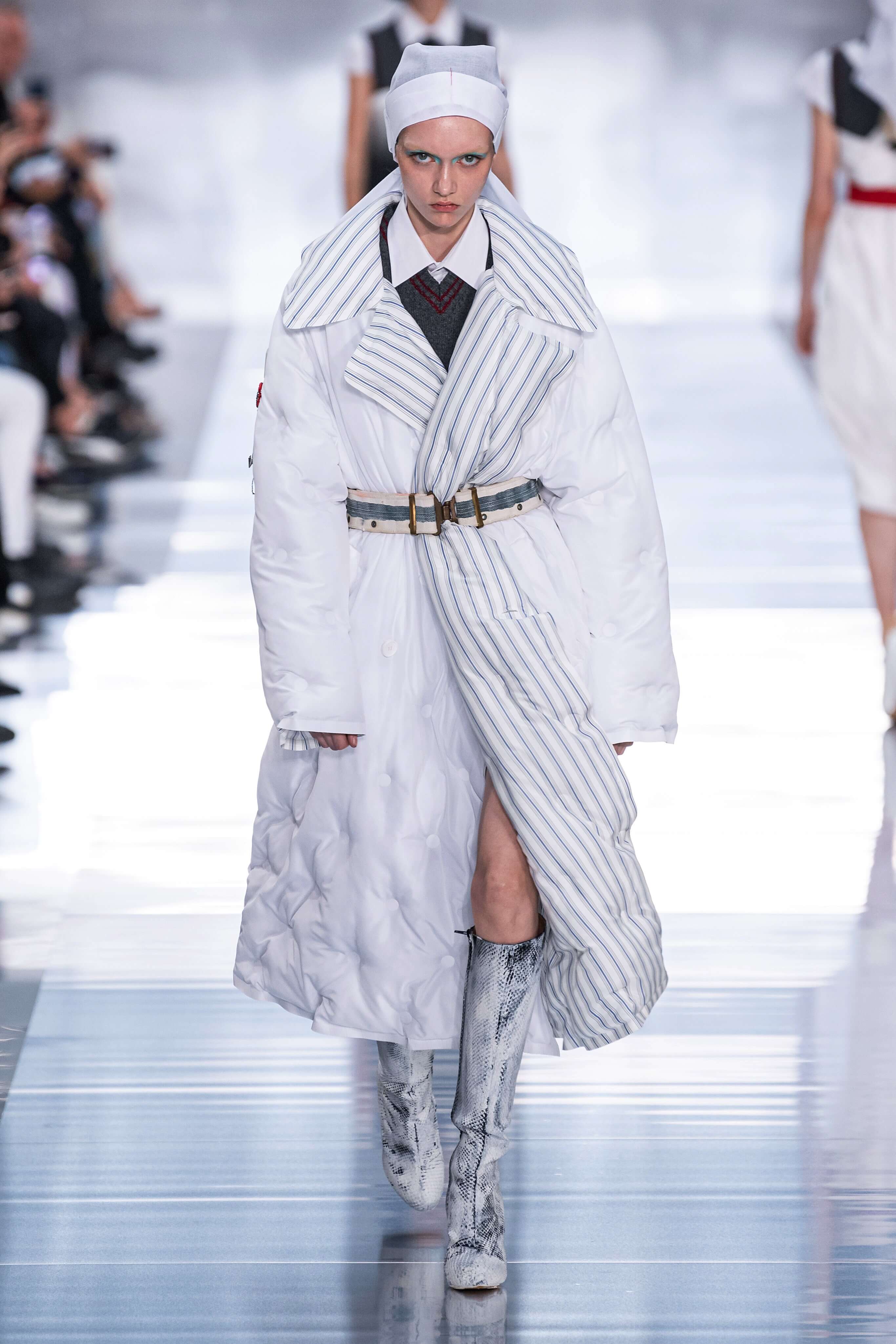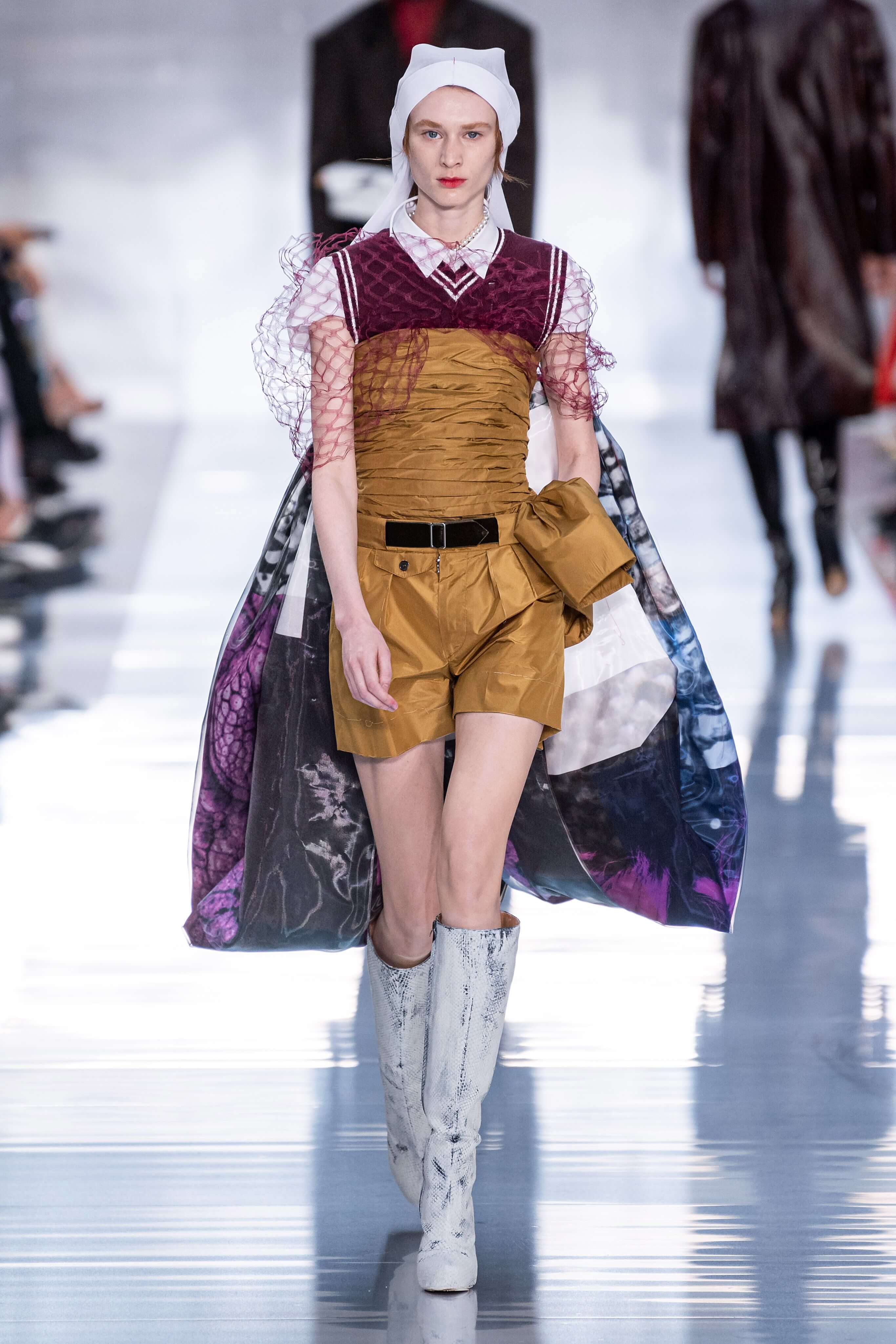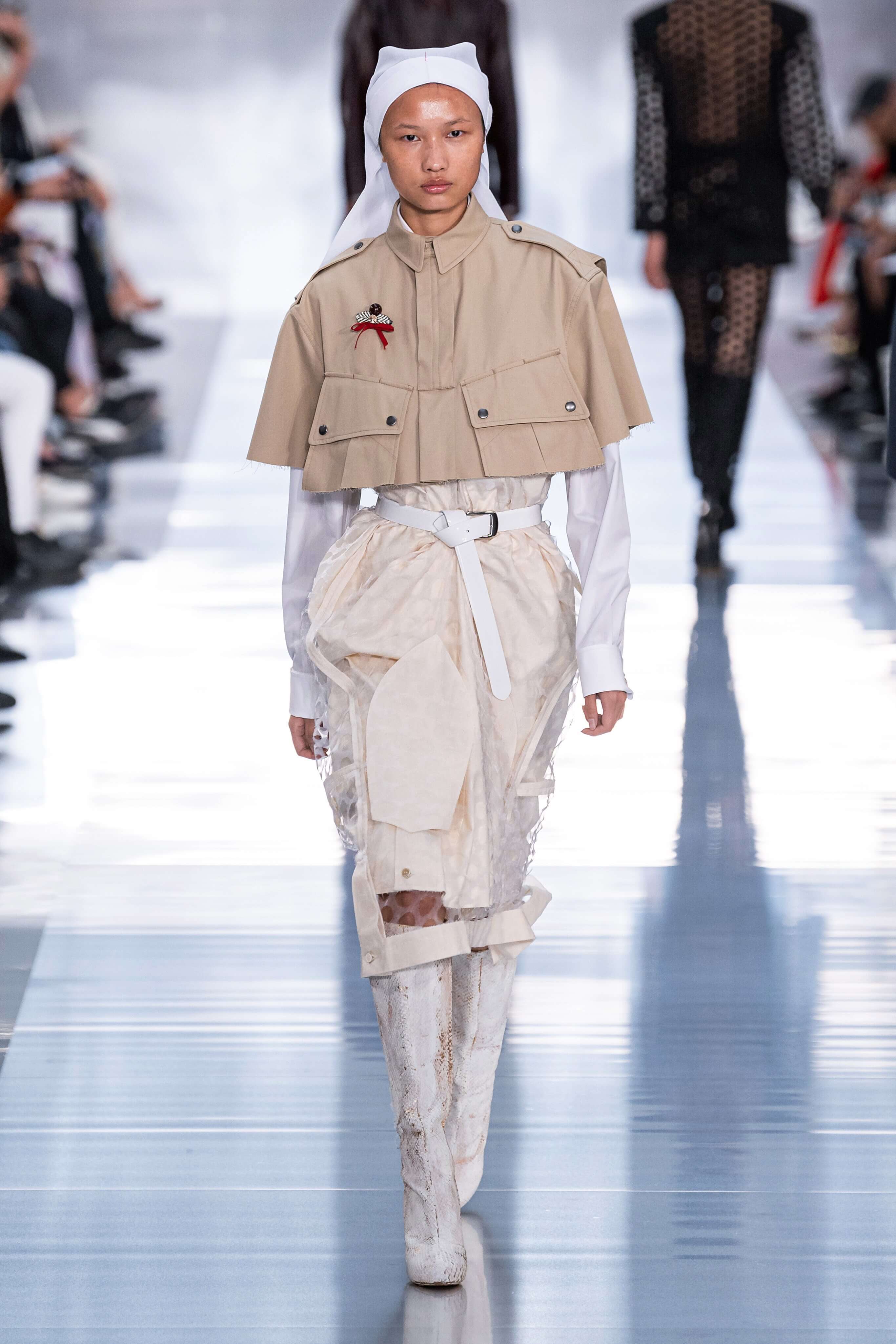 Мужчины и женщины выходили на подиум в перфорированных тренчах, накинутых поверх кокетливых костюмов, экстравагантных белоснежных платьях сестёр милосердия, стянутых на талии ремнями, на которых крепились связки ключей, необычной формы кейпах защитного цвета и тактических спецовках белого камуфляжа.