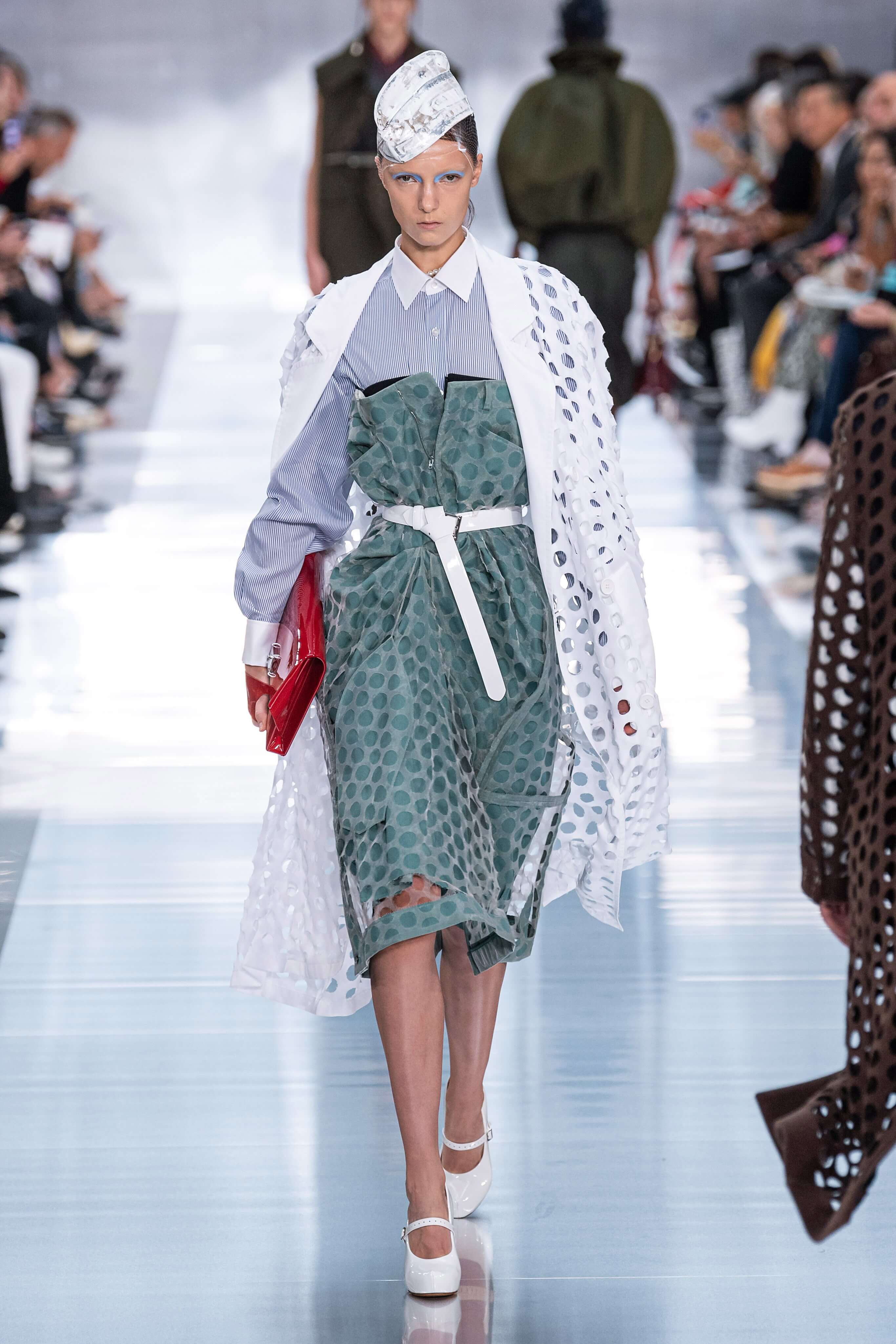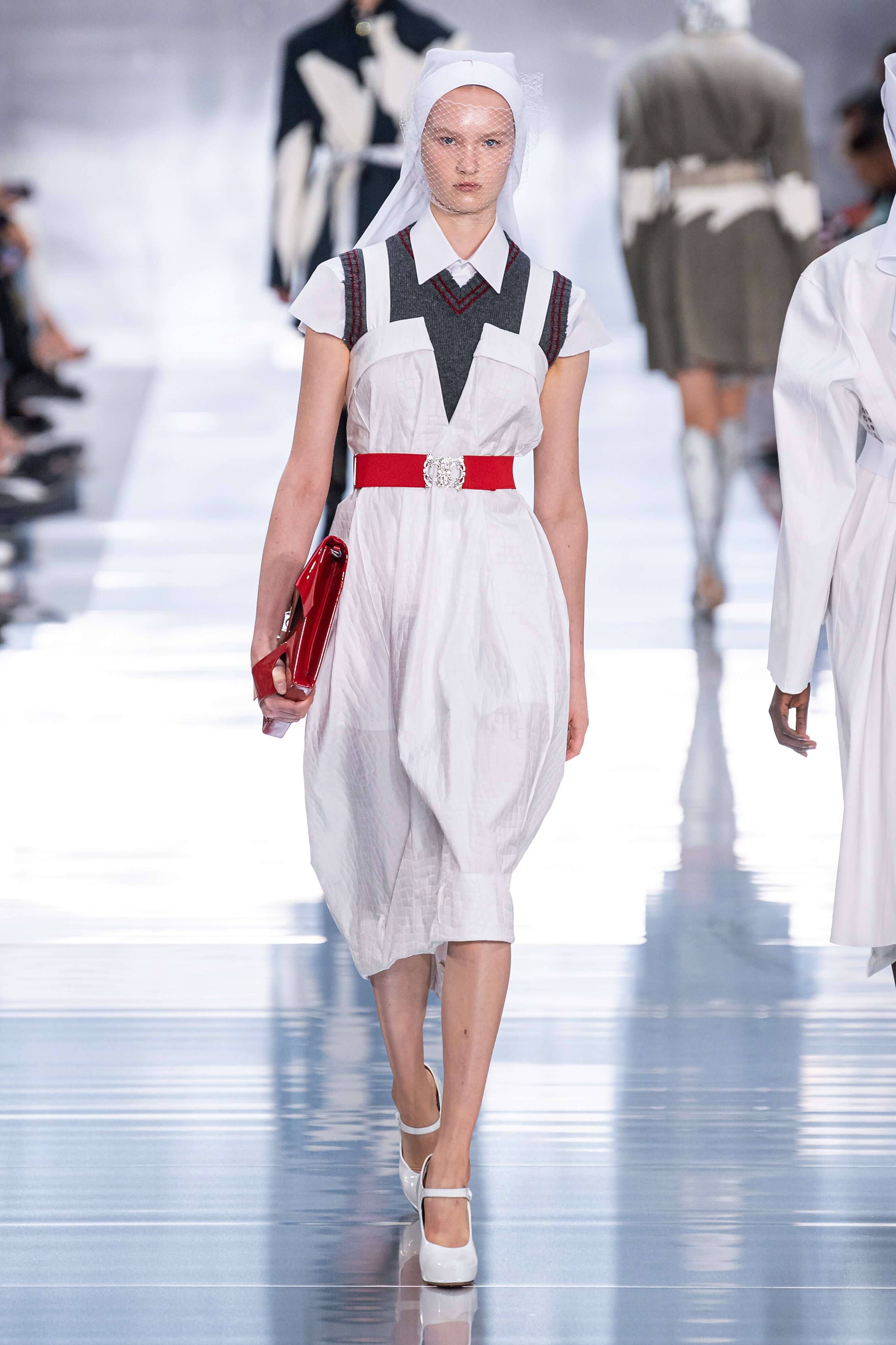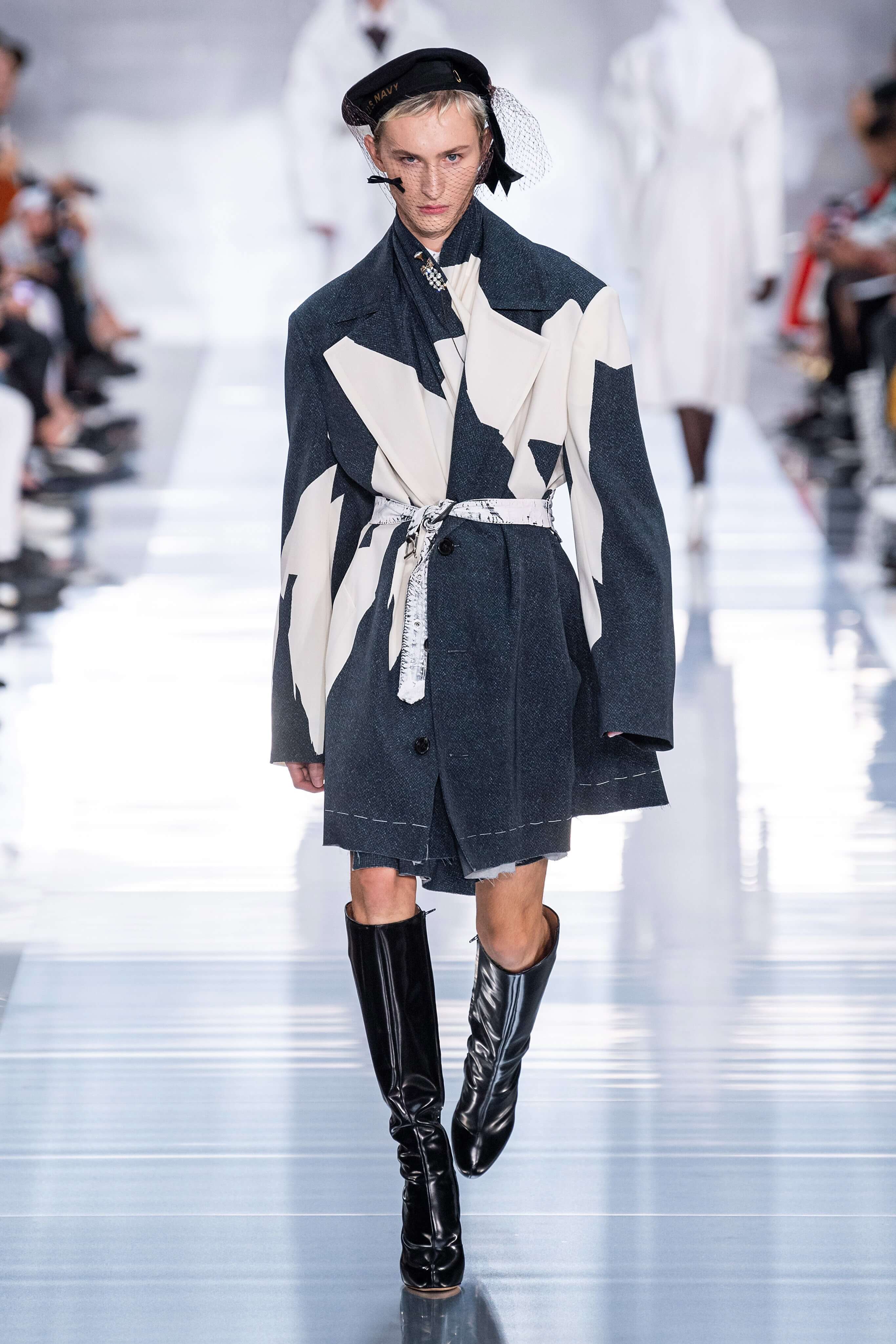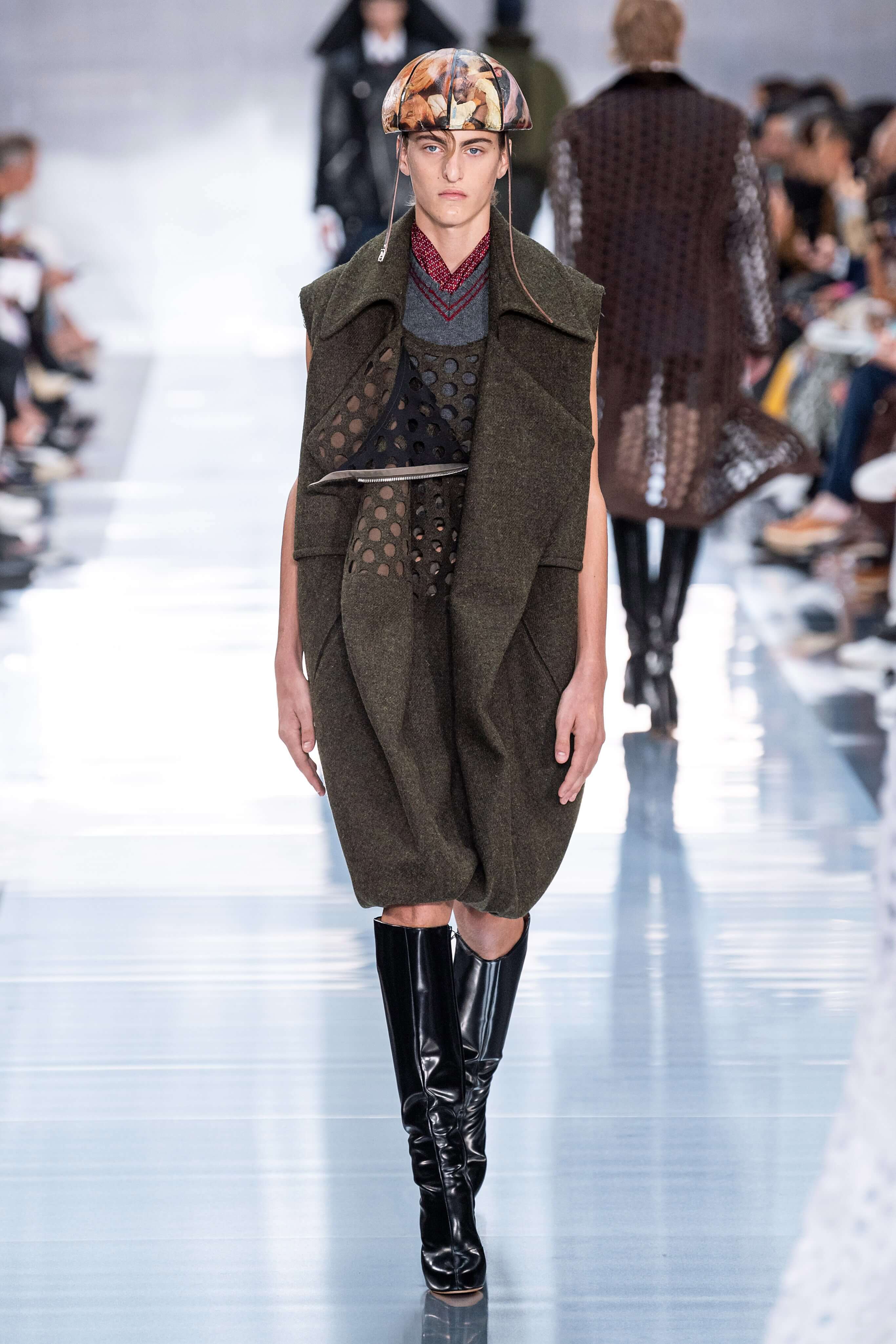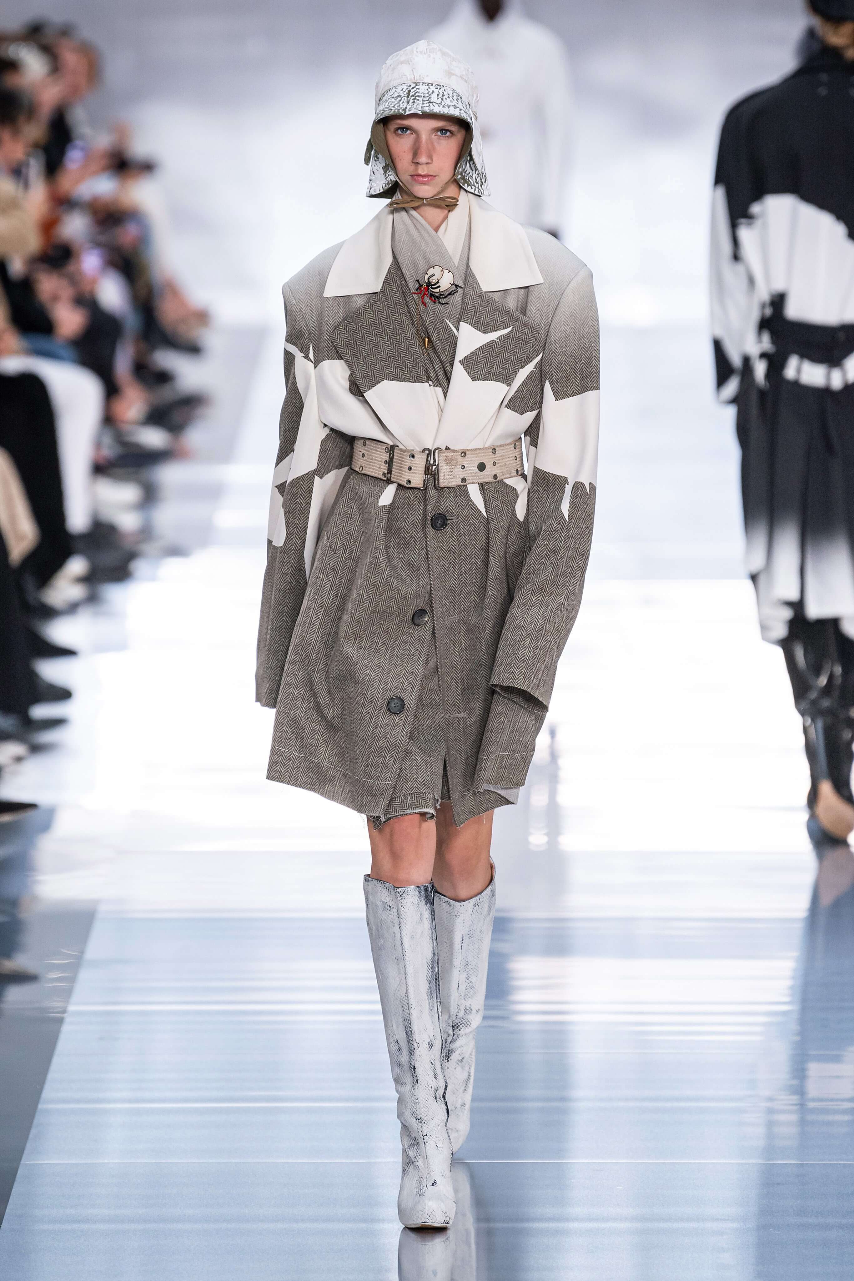 Мужчины и женщины выходили на подиум в перфорированных тренчах, накинутых поверх кокетливых костюмов, экстравагантных белоснежных платьях сестёр милосердия, стянутых на талии ремнями, на которых крепились связки ключей, необычной формы кейпах защитного цвета и тактических спецовках белого камуфляжа.