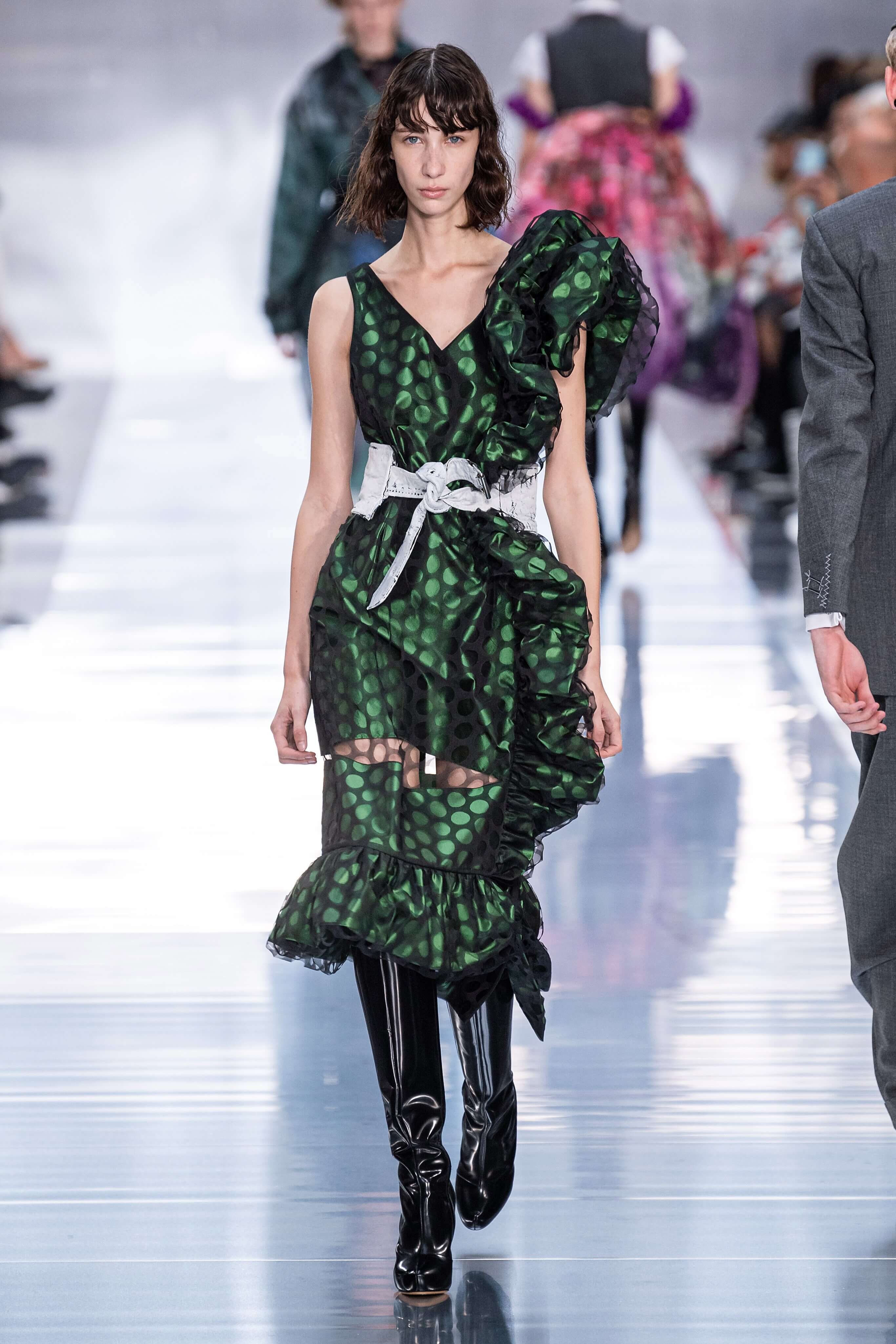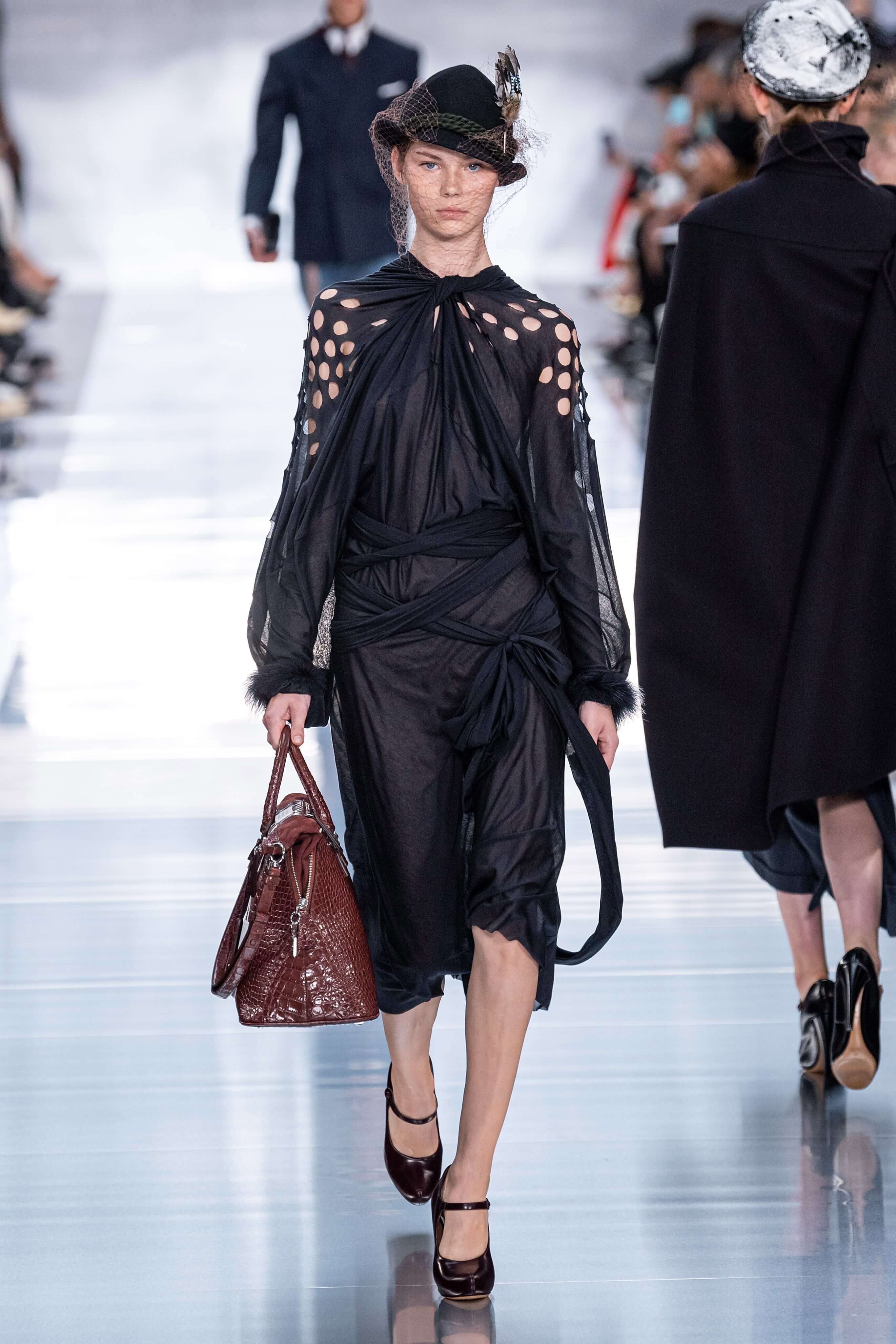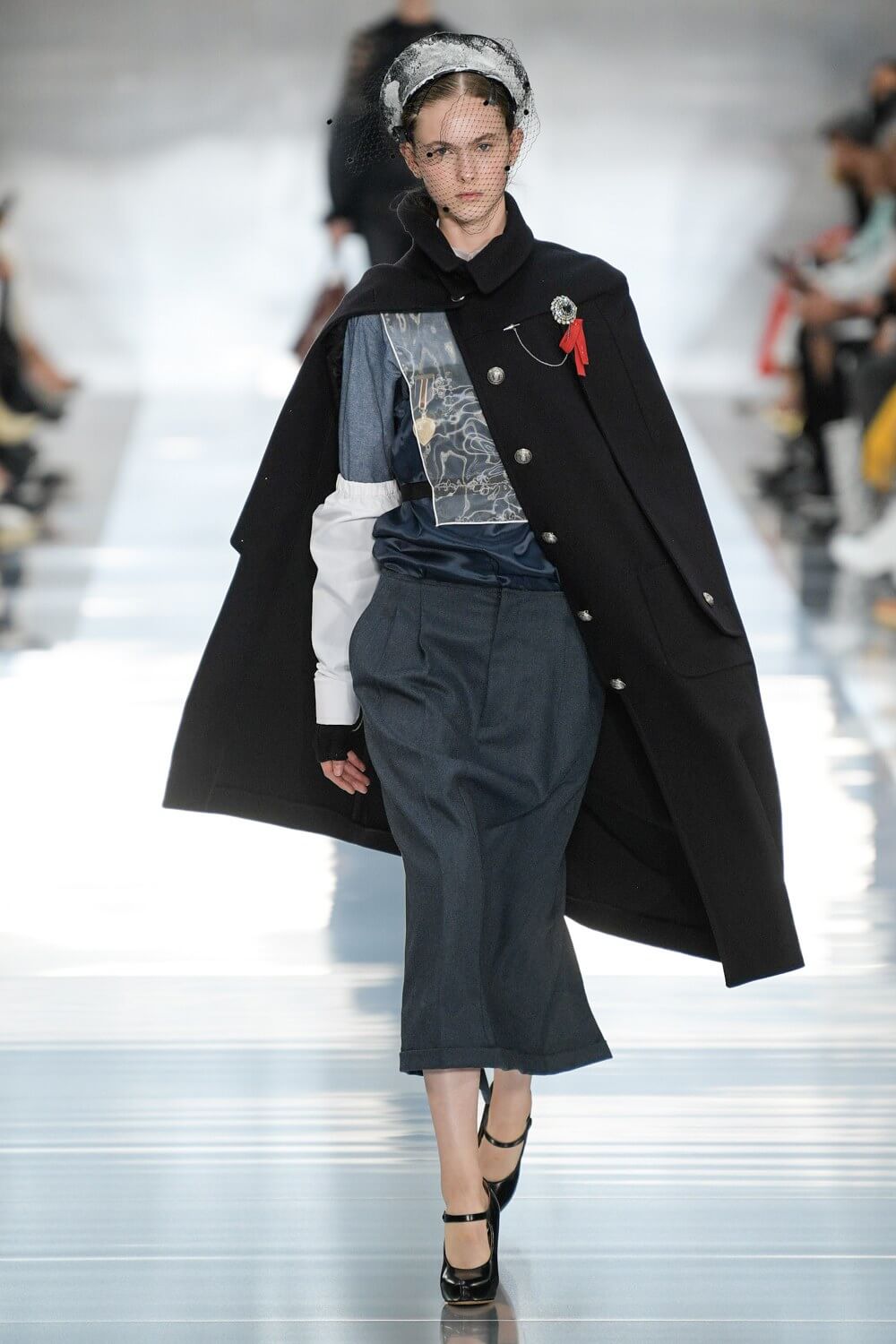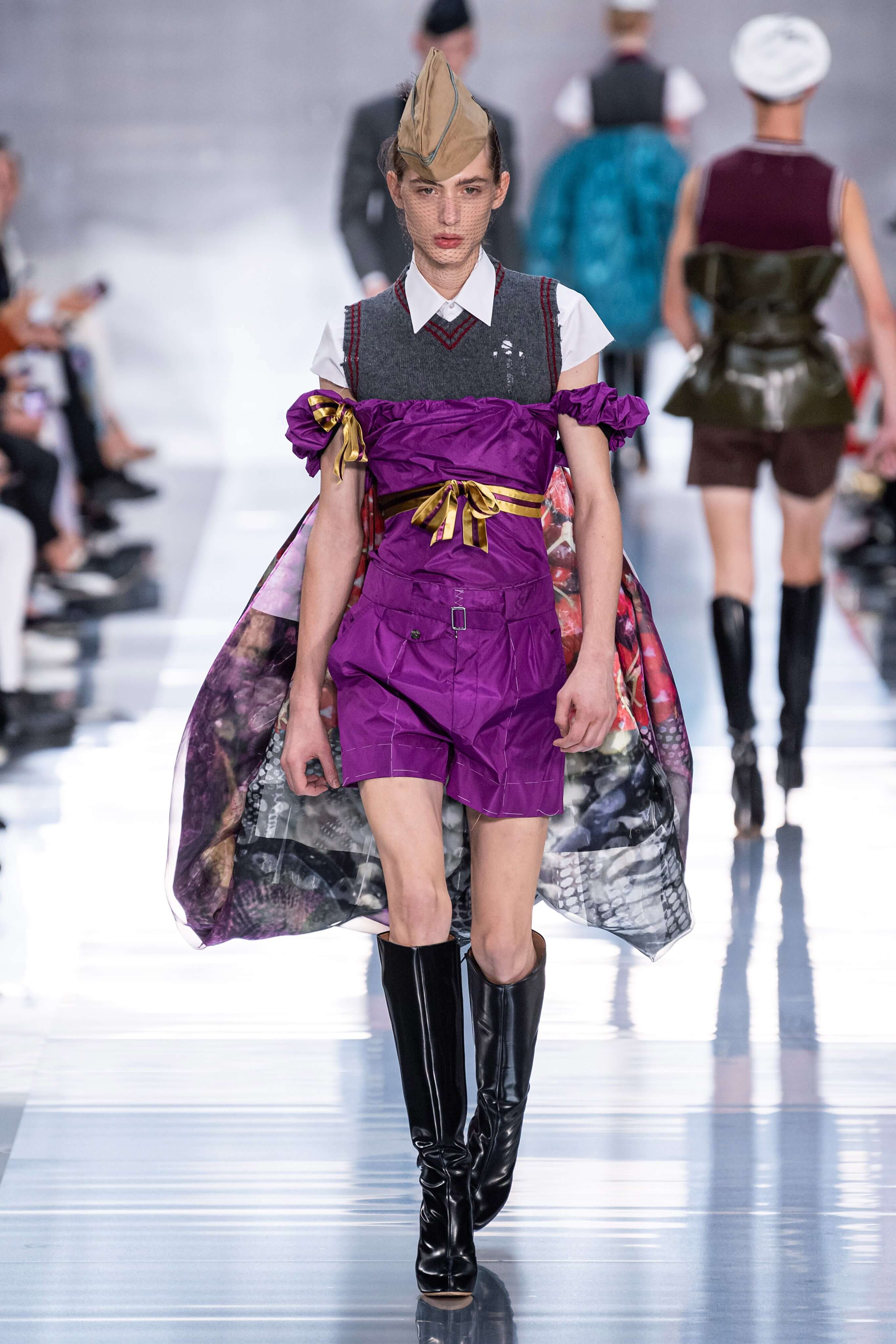 Период первой половины 40-х с их утилитарной эстетикой Джон Гальяно вписал в современную эстетику свободы и излишества — получилось сбалансированно и по-гальяновски гротескно: военные каски украшали перья и вуали, медсёстры ходили в черных кейпах-косухах и готических чепцах, пальто из одеяла повторяли силуэты военных шинелей, а на некоторых моделях можно было заметить узнаваемые платья-брюки с посадкой под грудью, в прямом смысле слова. Завершали зрелище блестящие крылья-шлейфы на платьях из органзы, будто обрезанная ножницами офицерская форма, лаковые зеленые корсеты, напоминающие боеголовки, и фетишистские аллюзии на морской флот с матросскими воротничками и кожаными комбинезонами.