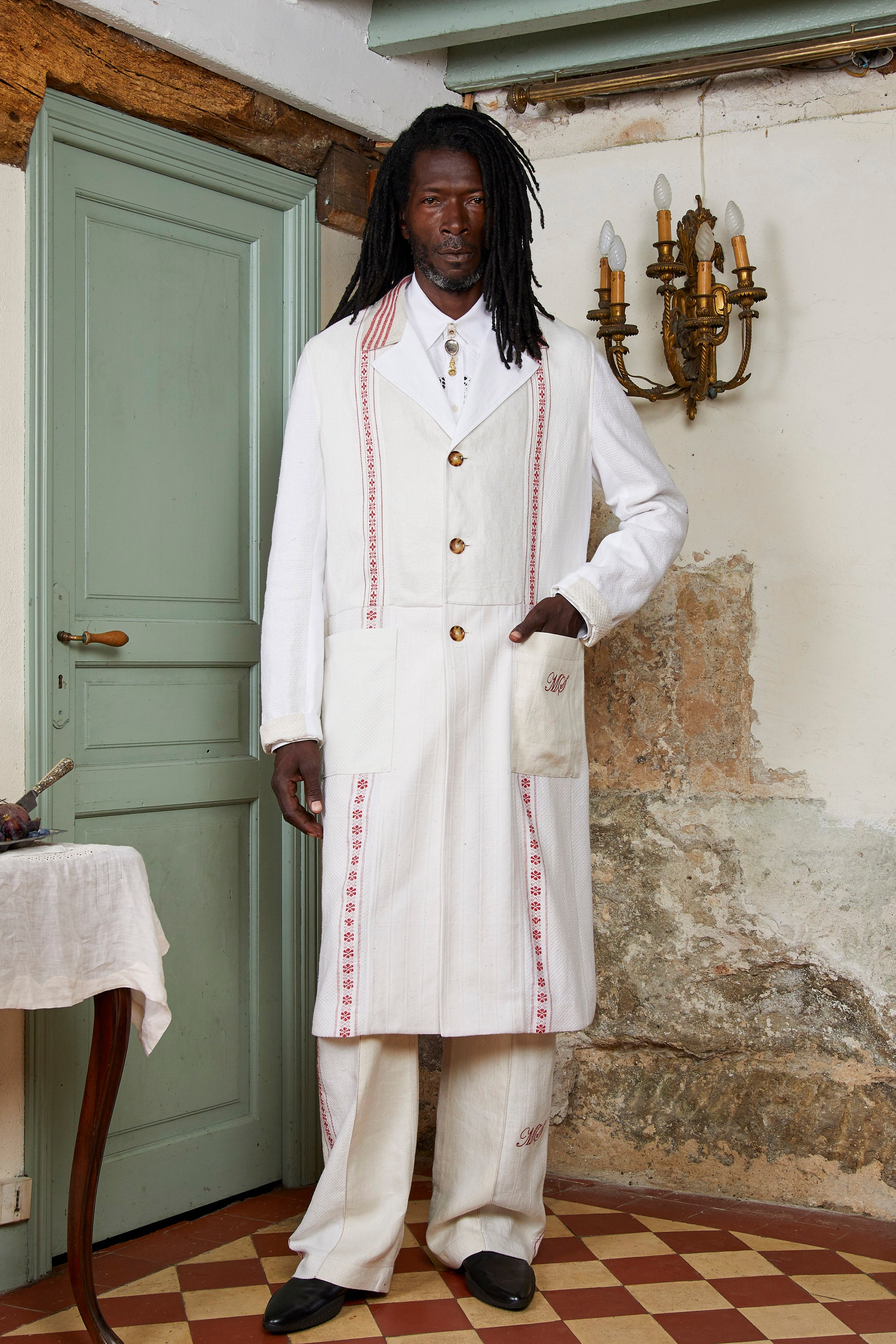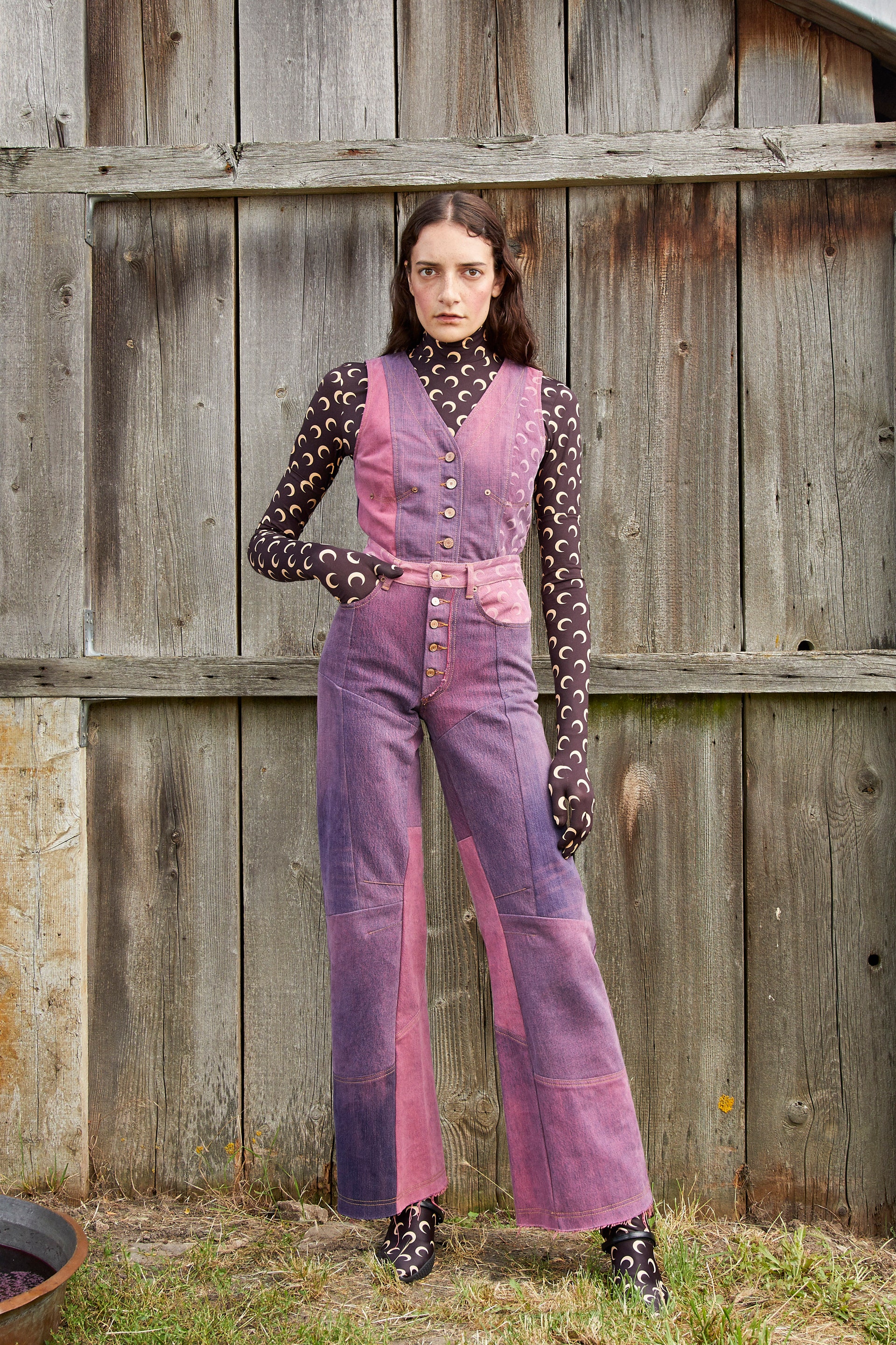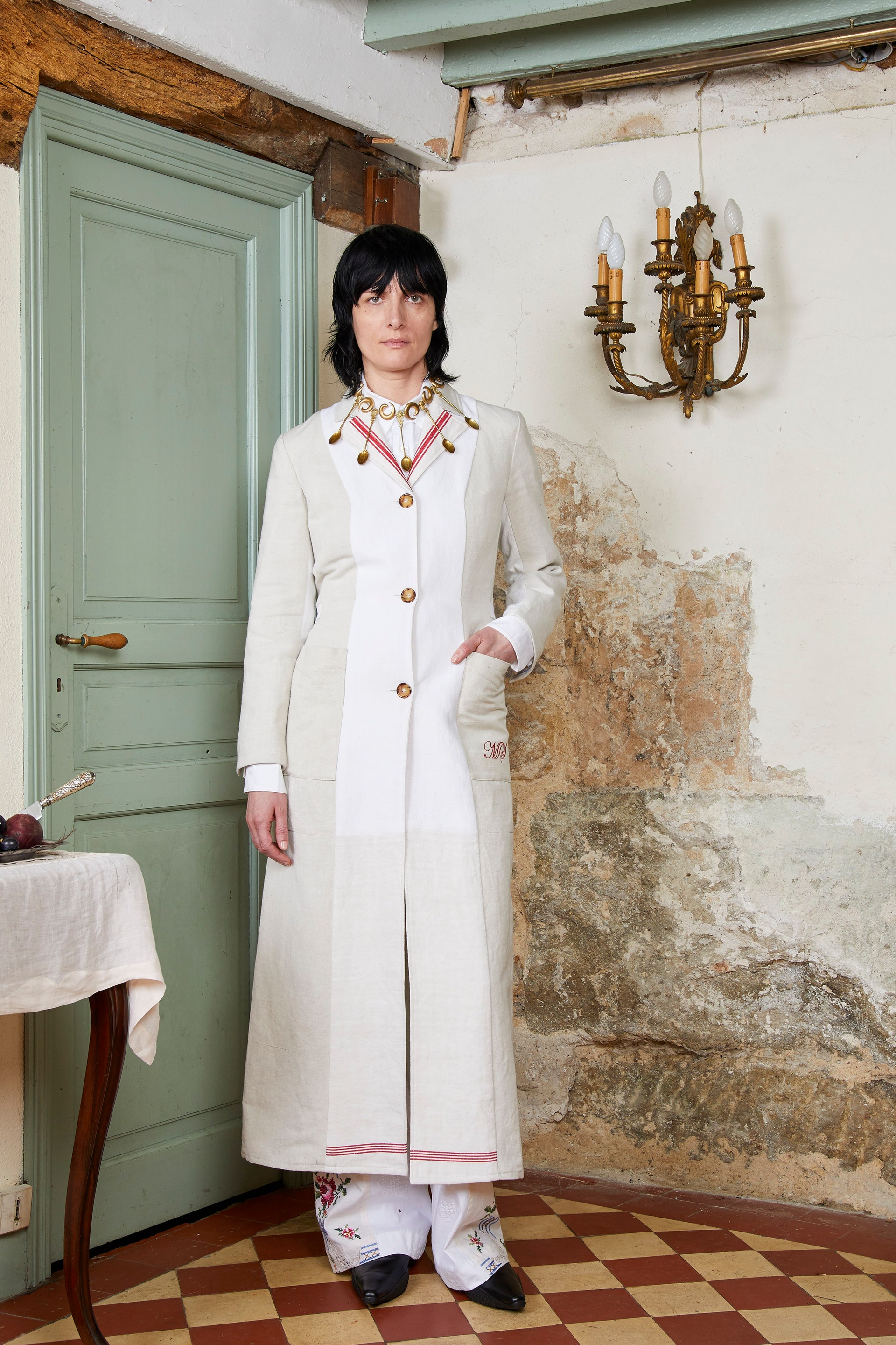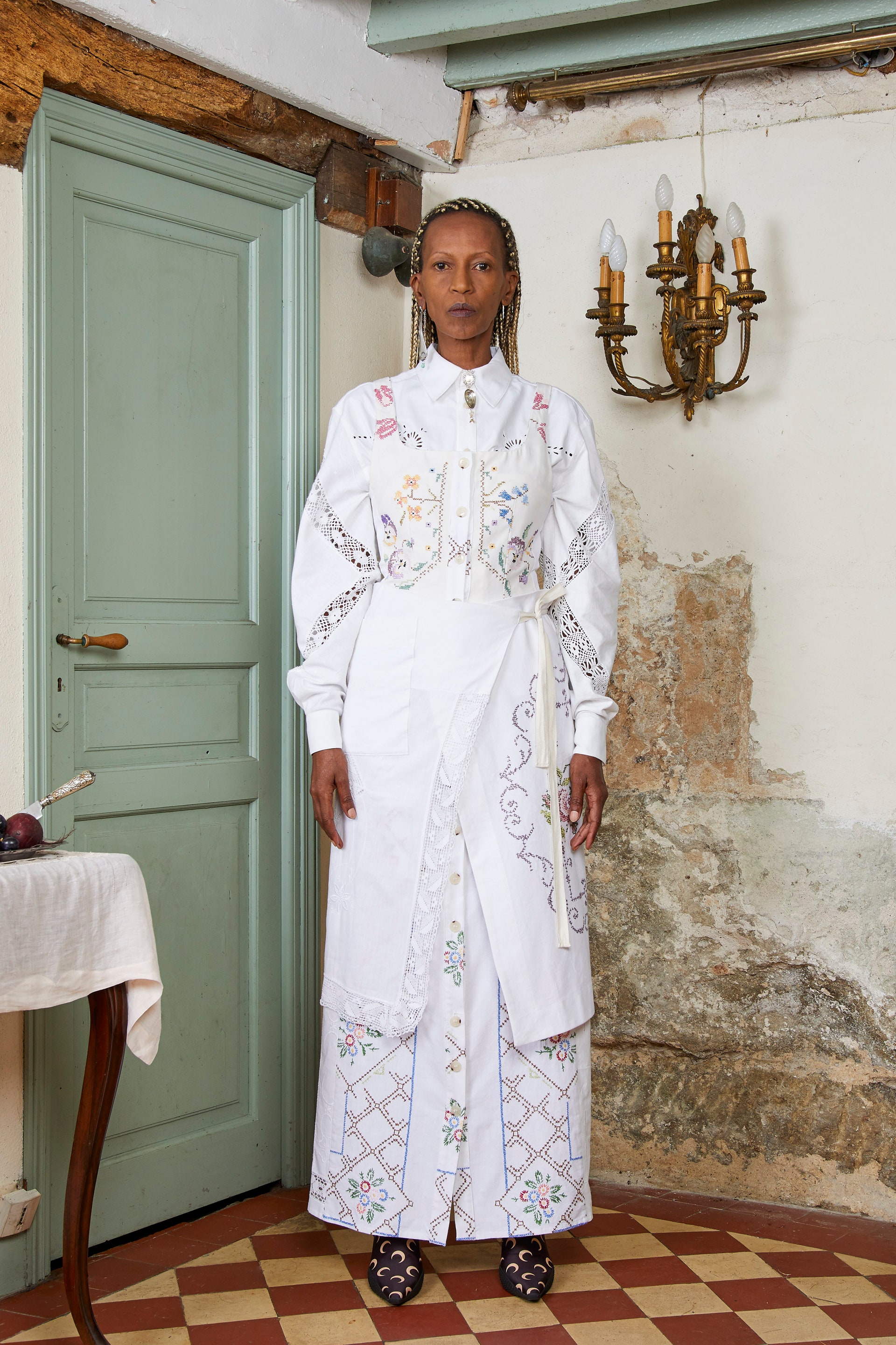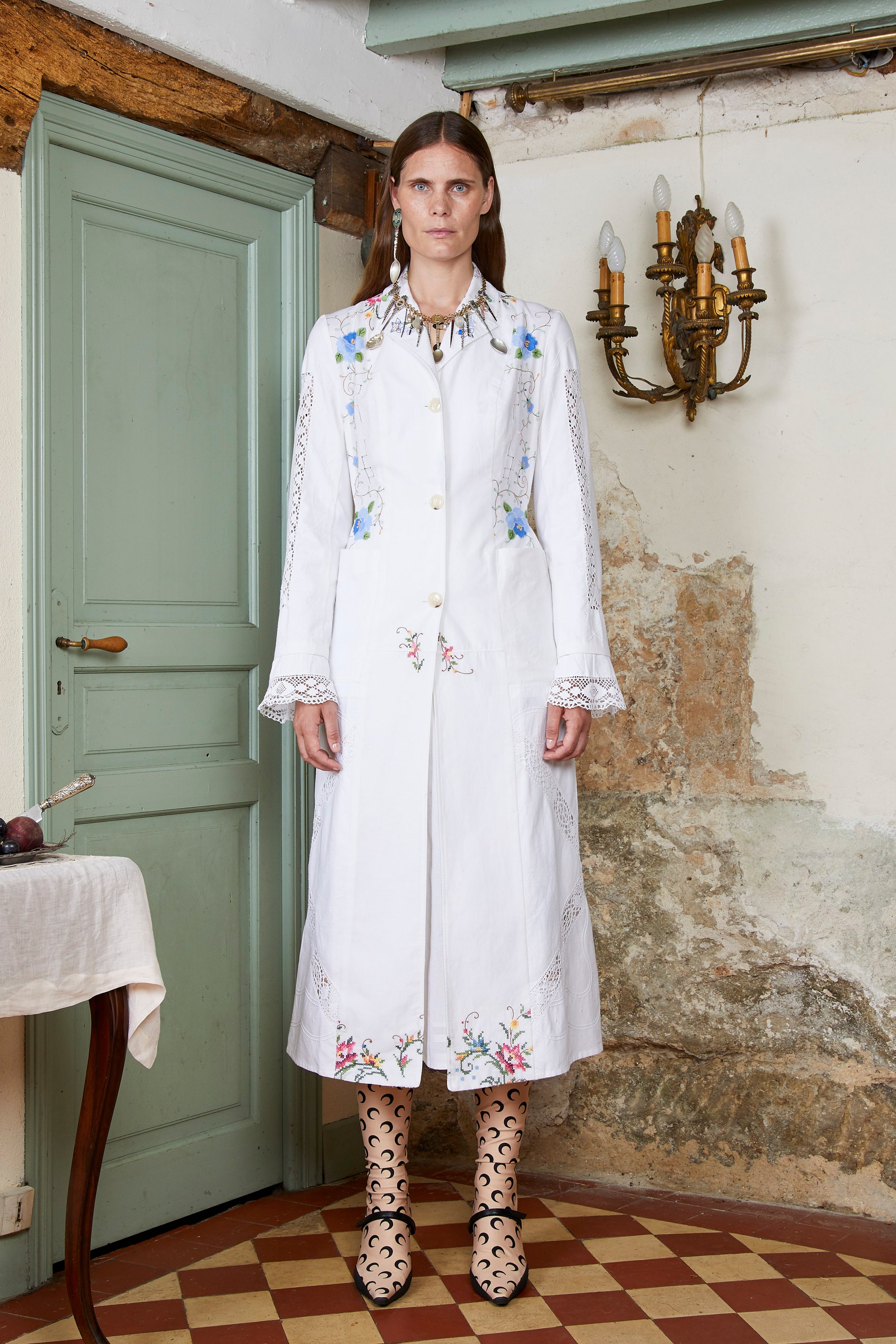 История, которую рассказывает Марин Серр, — это история о сообществе людей, чья жизнь протекает в старинных деревенских домах, наполненных ностальгией и признаками упадка индустриальной эпохи. Отсюда топы и платья в стиле "попкорн", пестрые и будто сшитые из разных лоскутков, связанные крючком пальто и сапоги, рубашки из белого льна и хлопка с вышивкой, списанной с винтажных скатертей и столовых дорожек. Манжеты и воротники будто скручены из салфеток, а мужские юбки, надетые поверх классических брюк, кажутся уютными фартуками. Из весеннего лукбука вот-вот запахнет домашним яблочным пирогом. Одежда дополнена удобными сумками-баулами и футуристичными саквояжами из гобелена.