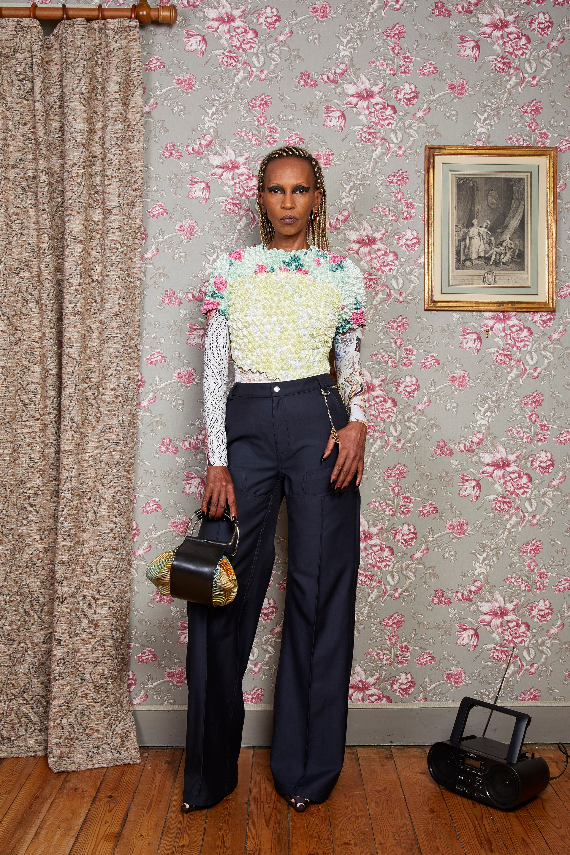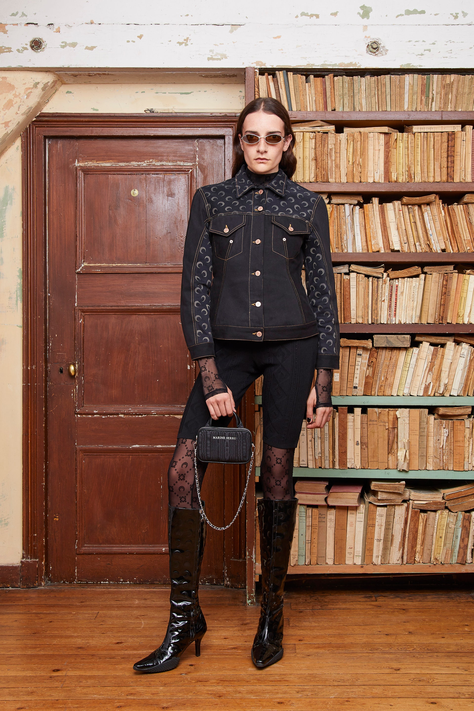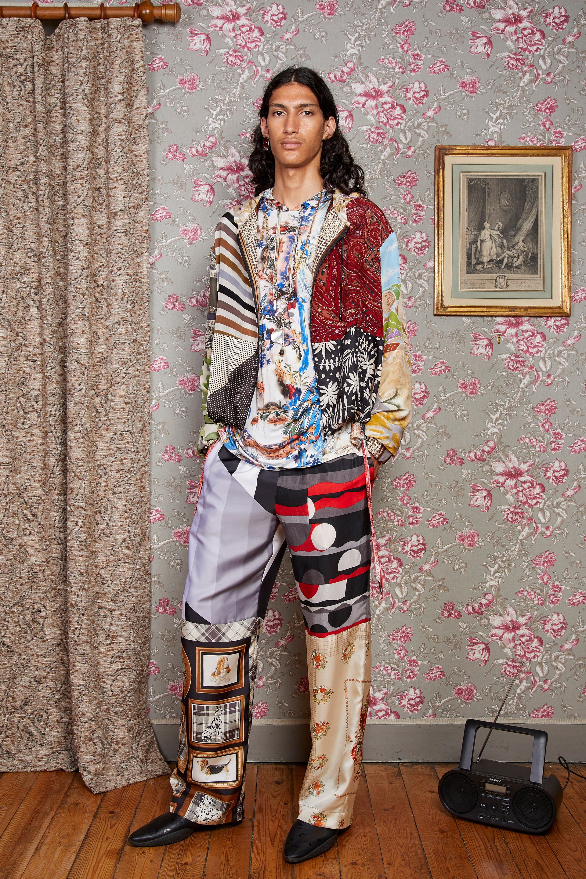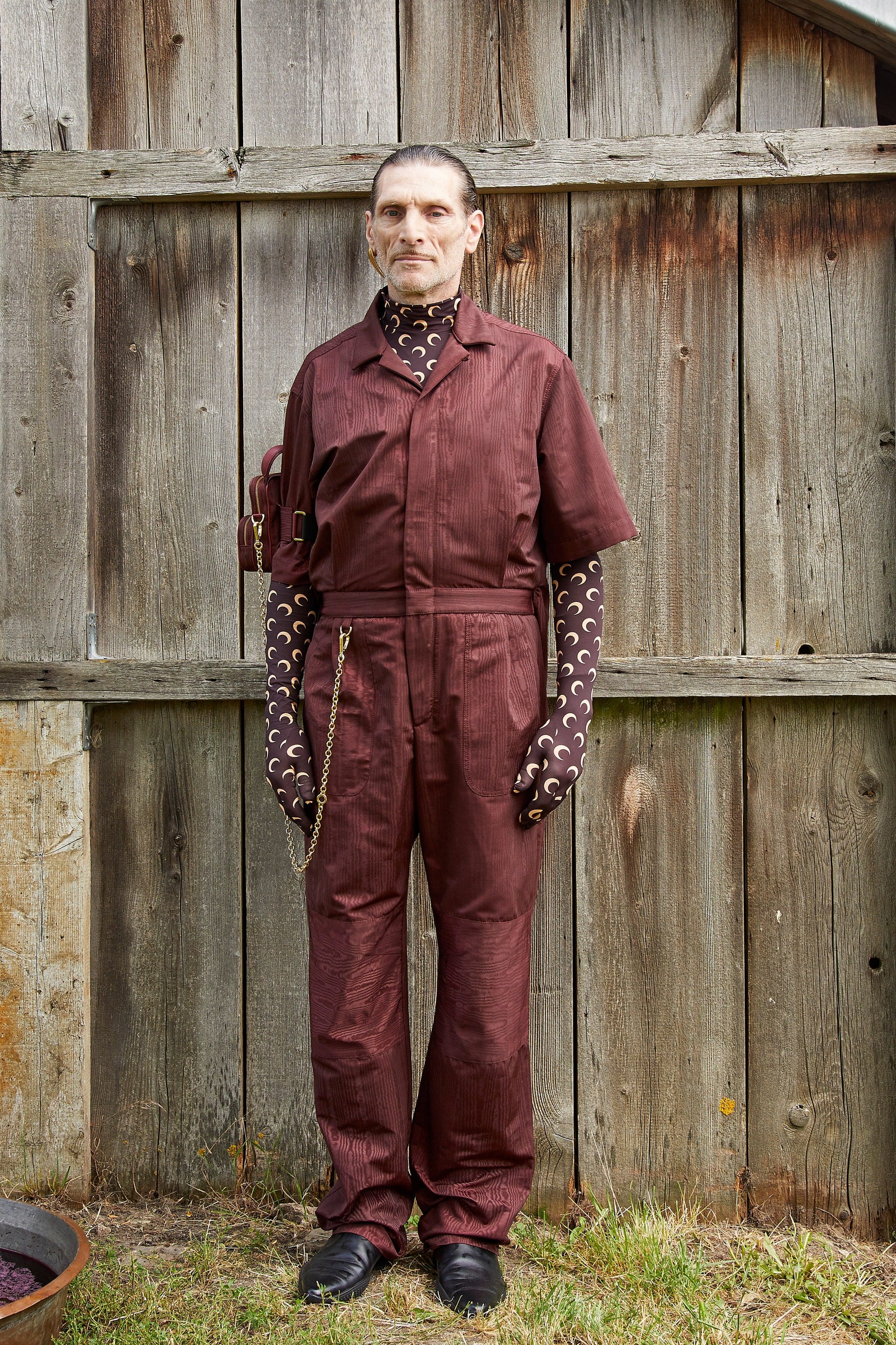 История, которую рассказывает Марин Серр, — это история о сообществе людей, чья жизнь протекает в старинных деревенских домах, наполненных ностальгией и признаками упадка индустриальной эпохи. Отсюда топы и платья в стиле "попкорн", пестрые и будто сшитые из разных лоскутков, связанные крючком пальто и сапоги, рубашки из белого льна и хлопка с вышивкой, списанной с винтажных скатертей и столовых дорожек. Манжеты и воротники будто скручены из салфеток, а мужские юбки, надетые поверх классических брюк, кажутся уютными фартуками. Из весеннего лукбука вот-вот запахнет домашним яблочным пирогом. Одежда дополнена удобными сумками-баулами и футуристичными саквояжами из гобелена.