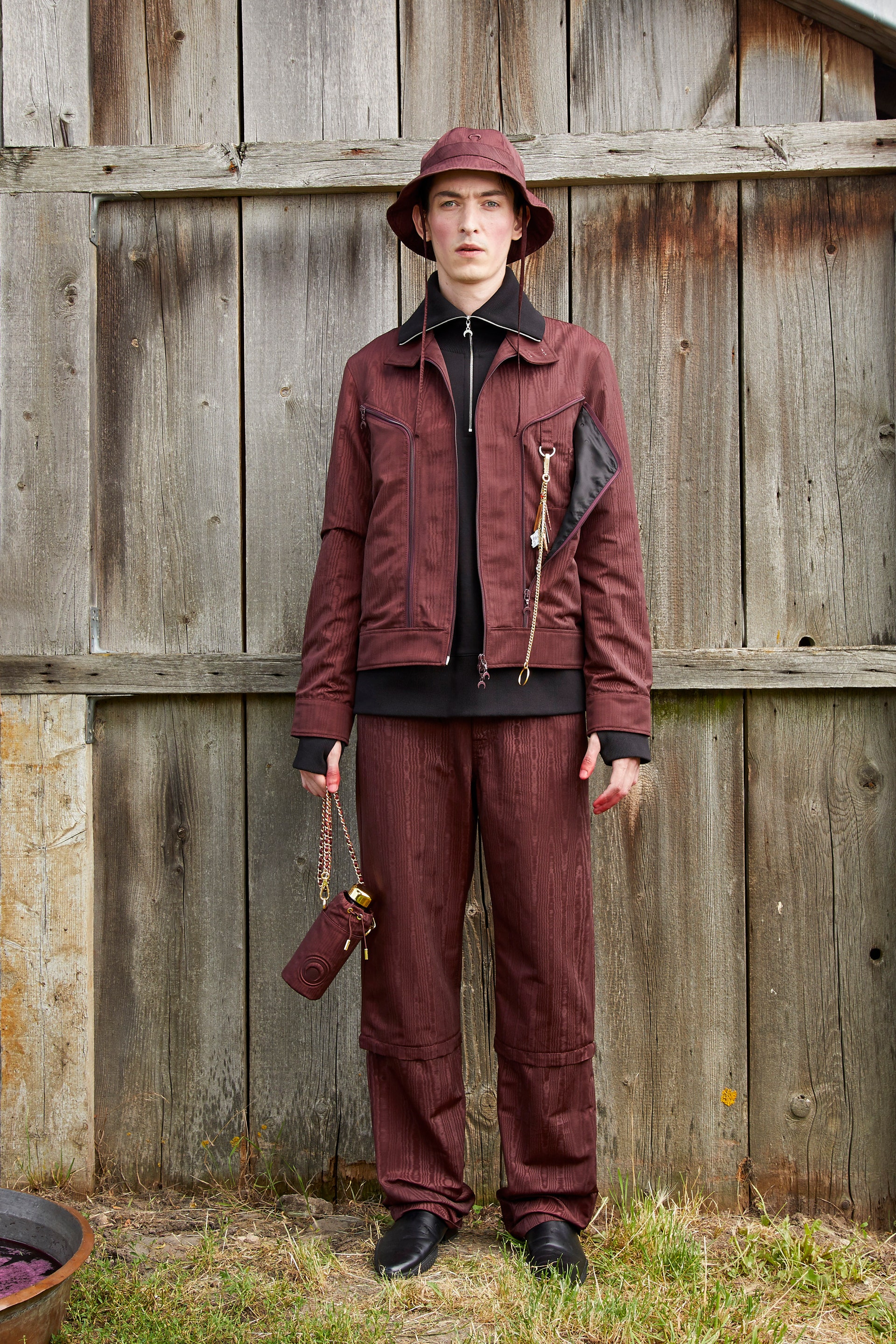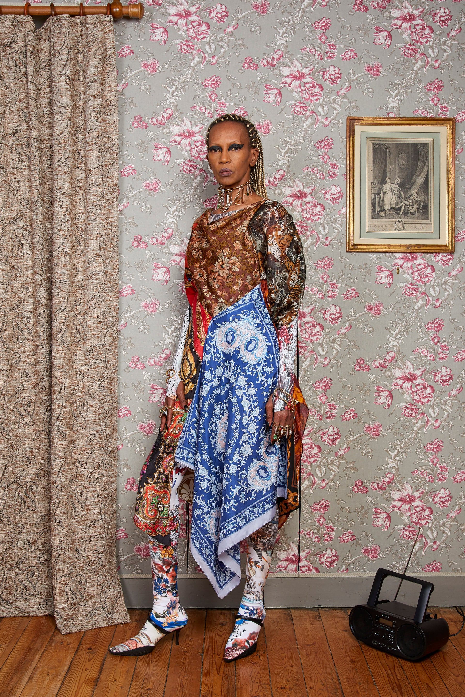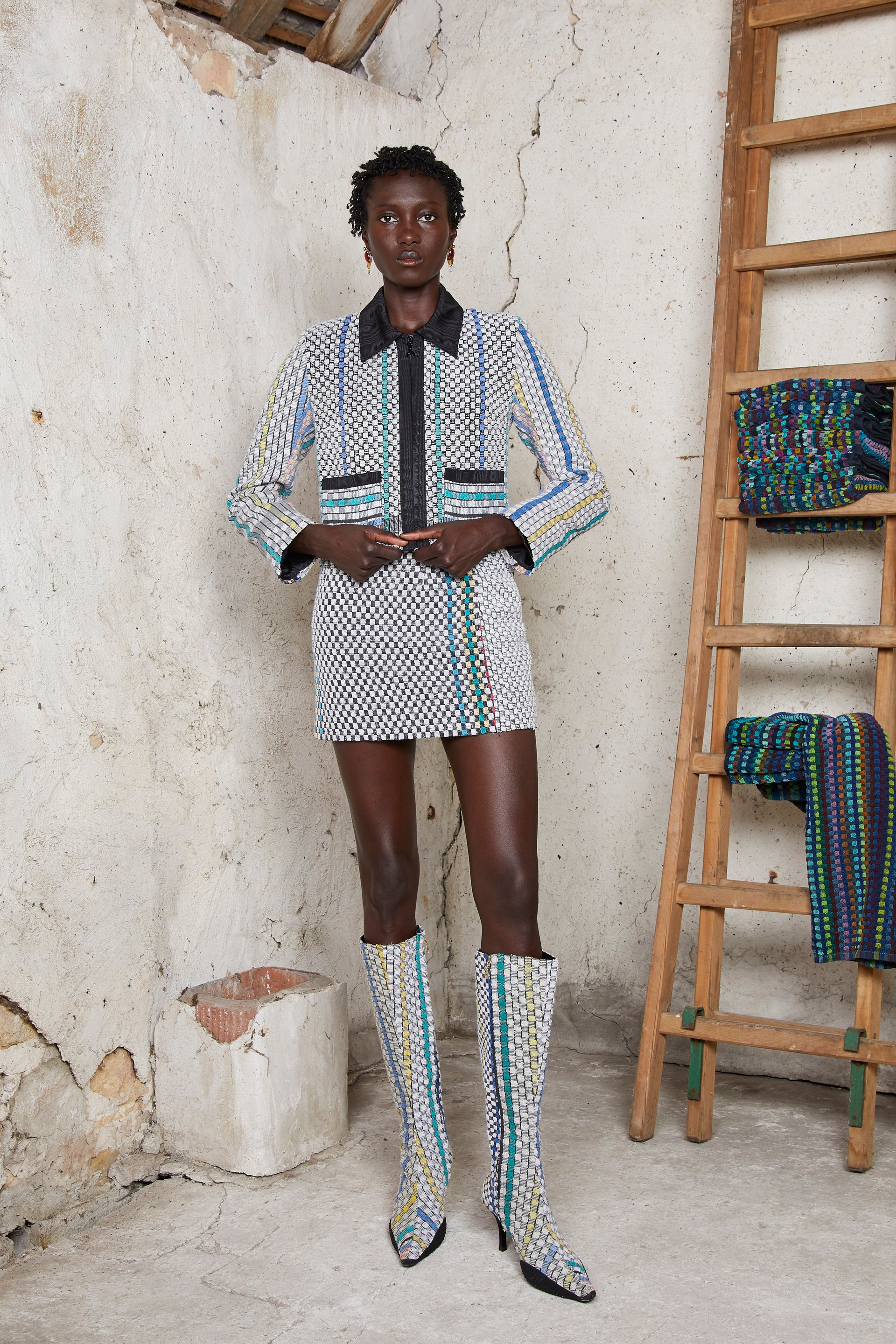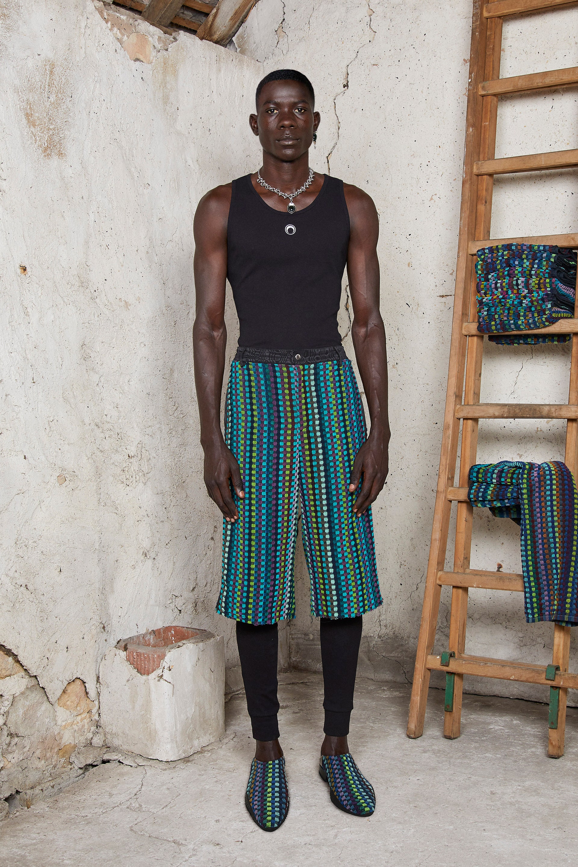 История, которую рассказывает Марин Серр, — это история о сообществе людей, чья жизнь протекает в старинных деревенских домах, наполненных ностальгией и признаками упадка индустриальной эпохи. Отсюда топы и платья в стиле "попкорн", пестрые и будто сшитые из разных лоскутков, связанные крючком пальто и сапоги, рубашки из белого льна и хлопка с вышивкой, списанной с винтажных скатертей и столовых дорожек. Манжеты и воротники будто скручены из салфеток, а мужские юбки, надетые поверх классических брюк, кажутся уютными фартуками. Из весеннего лукбука вот-вот запахнет домашним яблочным пирогом. Одежда дополнена удобными сумками-баулами и футуристичными саквояжами из гобелена.