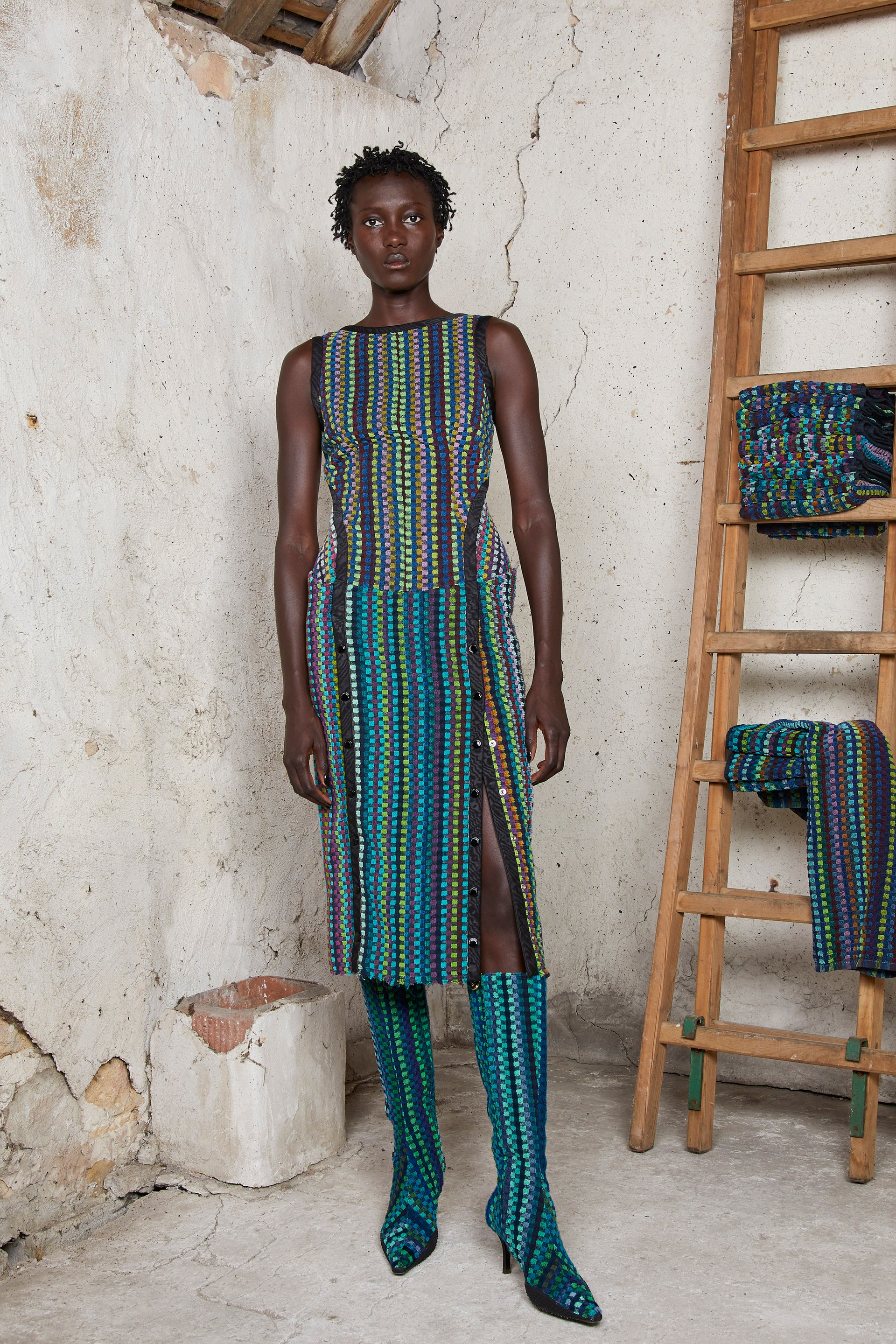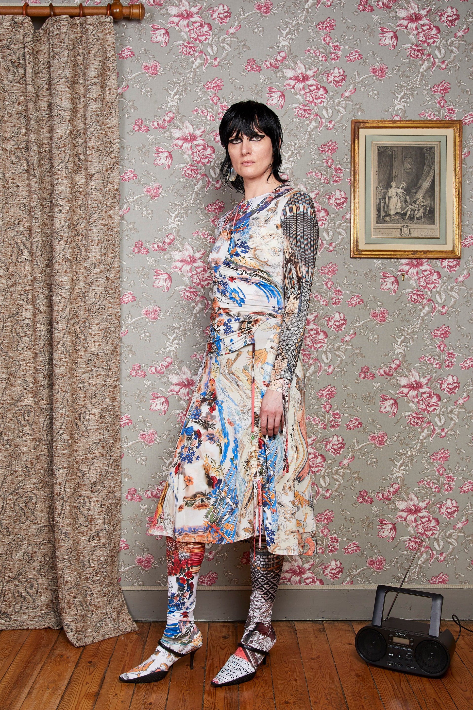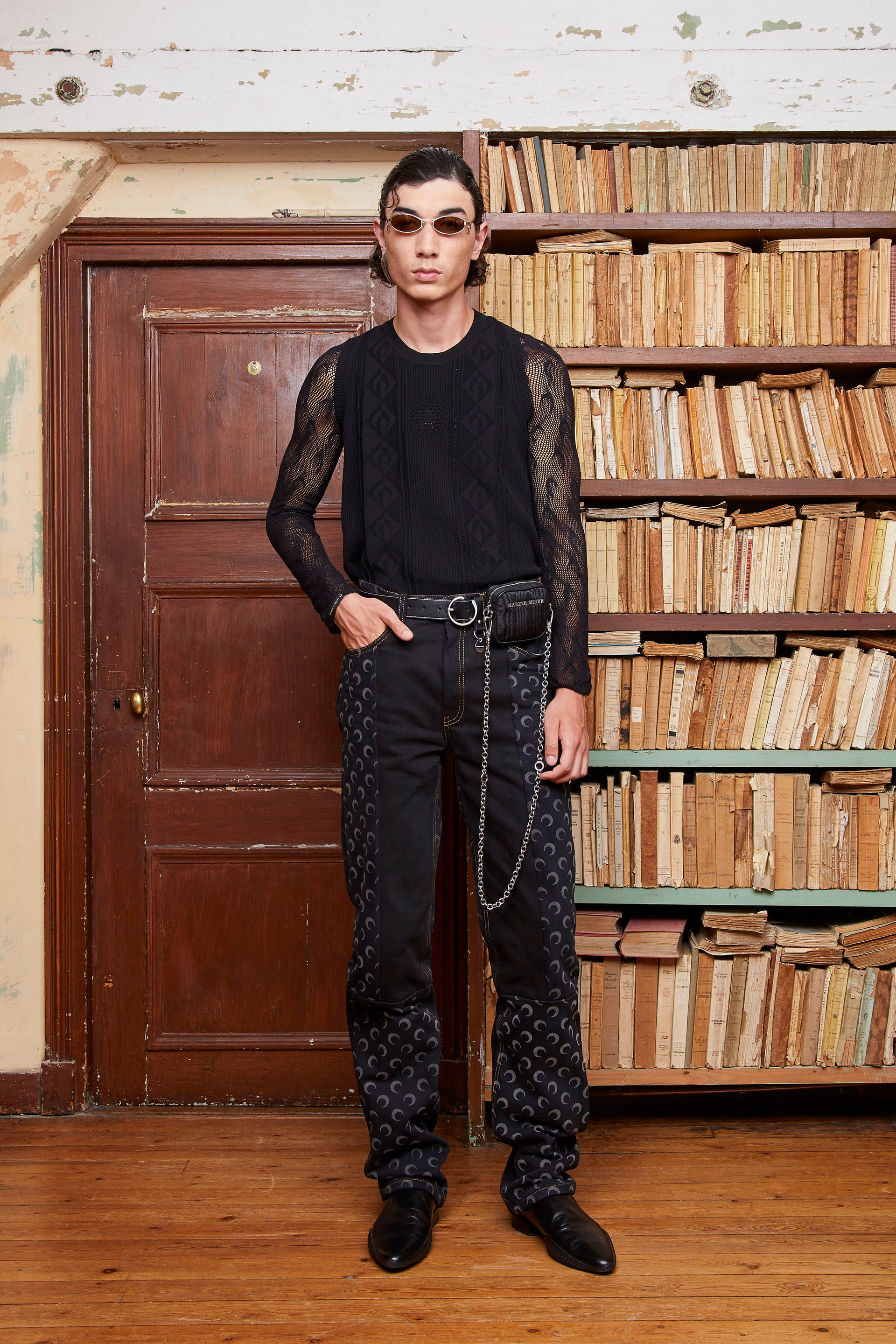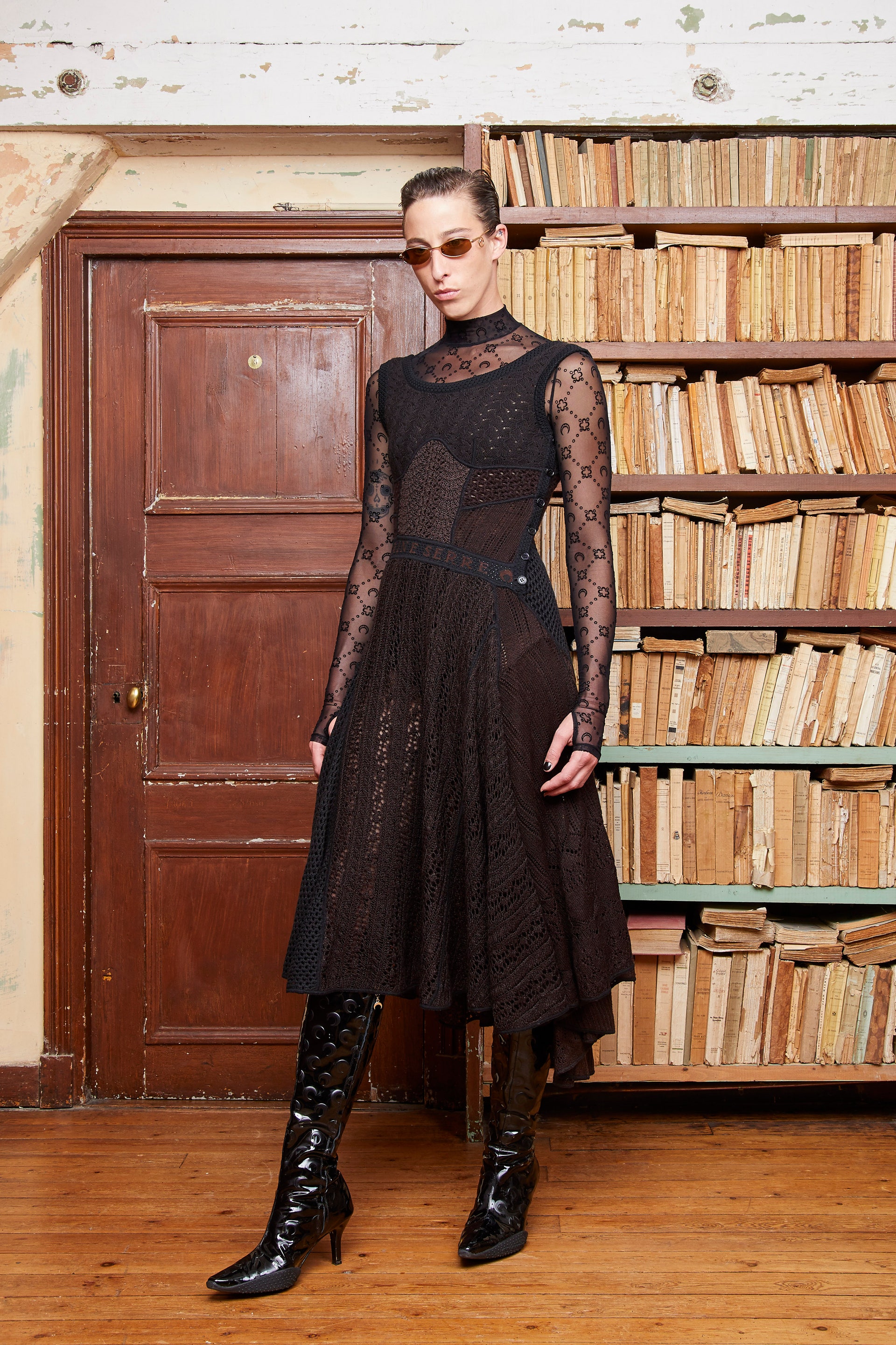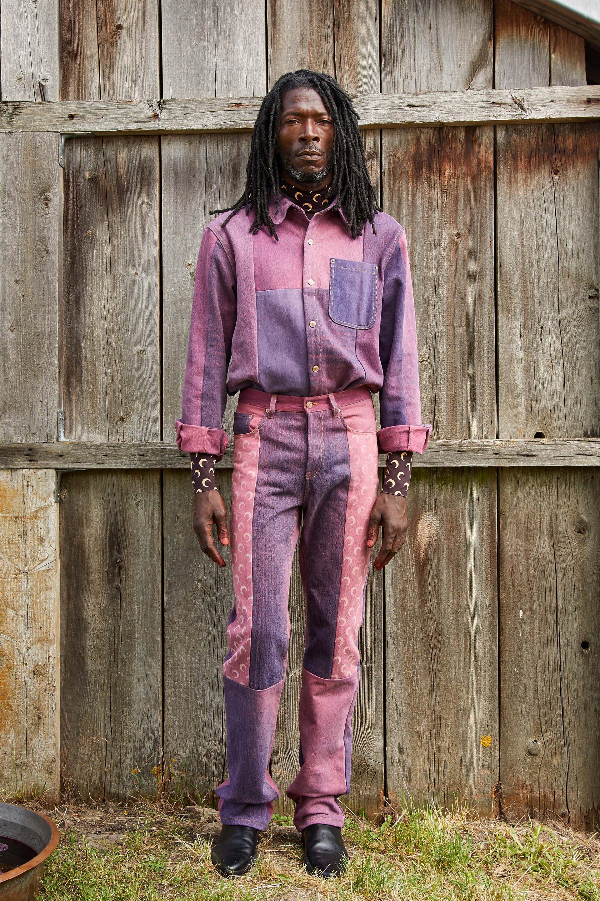 История, которую рассказывает Марин Серр, — это история о сообществе людей, чья жизнь протекает в старинных деревенских домах, наполненных ностальгией и признаками упадка индустриальной эпохи. Отсюда топы и платья в стиле "попкорн", пестрые и будто сшитые из разных лоскутков, связанные крючком пальто и сапоги, рубашки из белого льна и хлопка с вышивкой, списанной с винтажных скатертей и столовых дорожек. Манжеты и воротники будто скручены из салфеток, а мужские юбки, надетые поверх классических брюк, кажутся уютными фартуками. Из весеннего лукбука вот-вот запахнет домашним яблочным пирогом. Одежда дополнена удобными сумками-баулами и футуристичными саквояжами из гобелена.