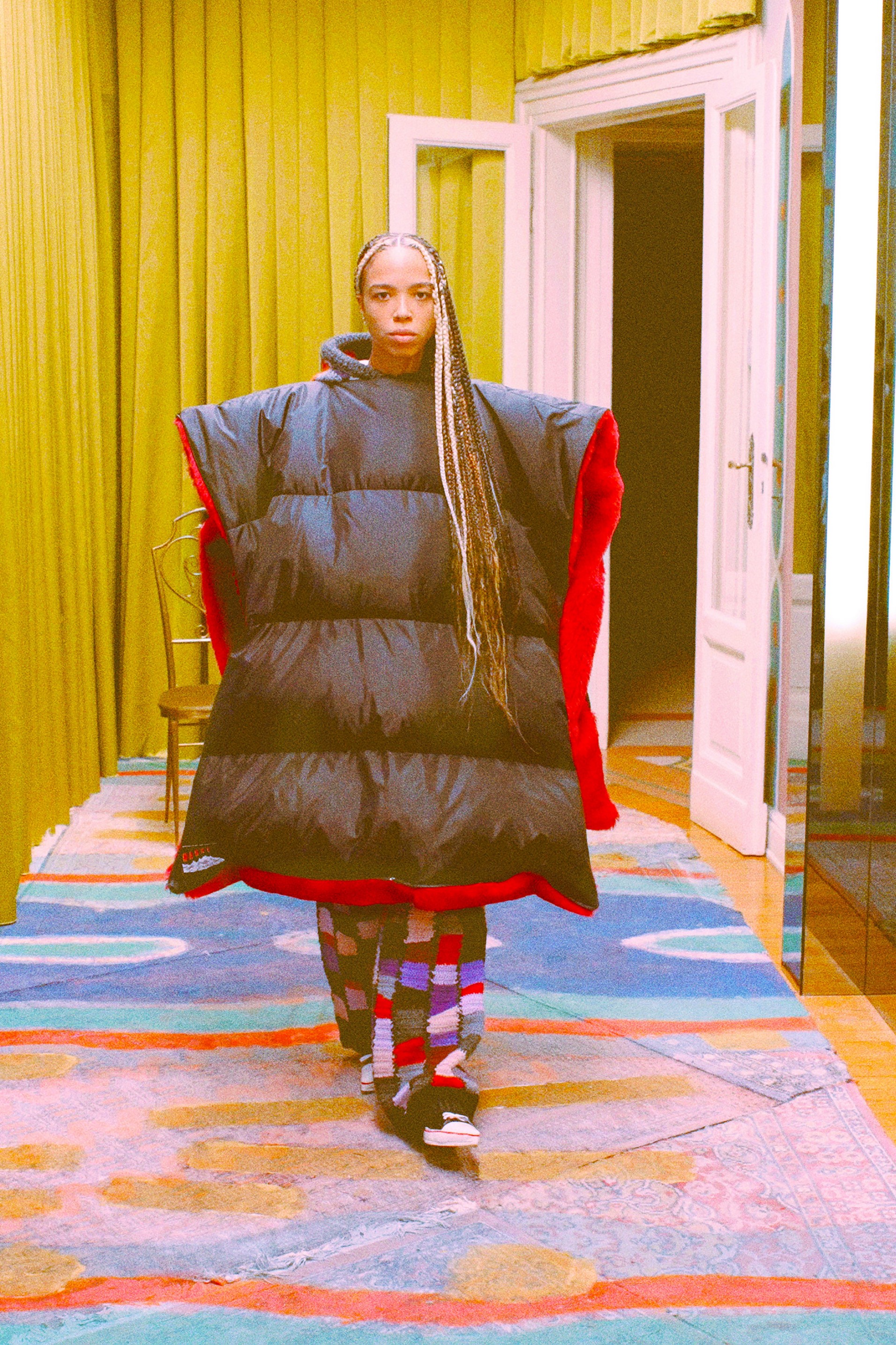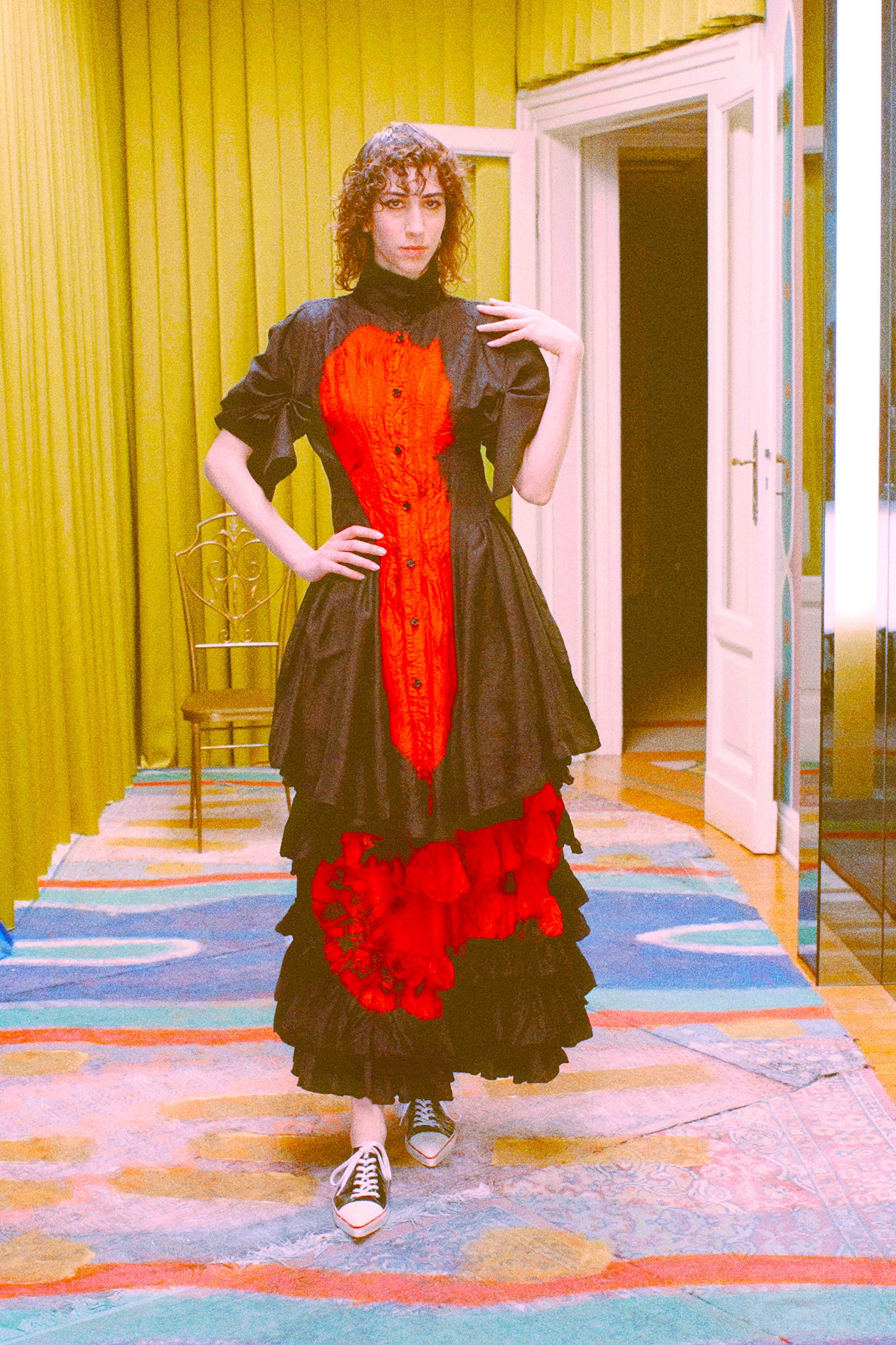 Дизайнер также привнес долю иронии в дизайн вещей будущего сезона. В квартире Риссо в Милане друзья дизайнера от души развлекались в платьях из жатого шелка, объемных пуховиках-пончо и юбках, напоминающих портьеры в старинных салонах, в ярких рубашках с жабо и воланами в духе gypsi и перчатках, напоминающих бытовые рукавицы для духовок. Насмешку Риссо выразил также в гигантских сумках, повторяющих культовую модель Birkin. Вся коллекция создавалась вручную, а материалы Франческо снова окрашивал сам — раскладывал во дворе на солнце, устилал цветами из сада и покрывал черной краской.