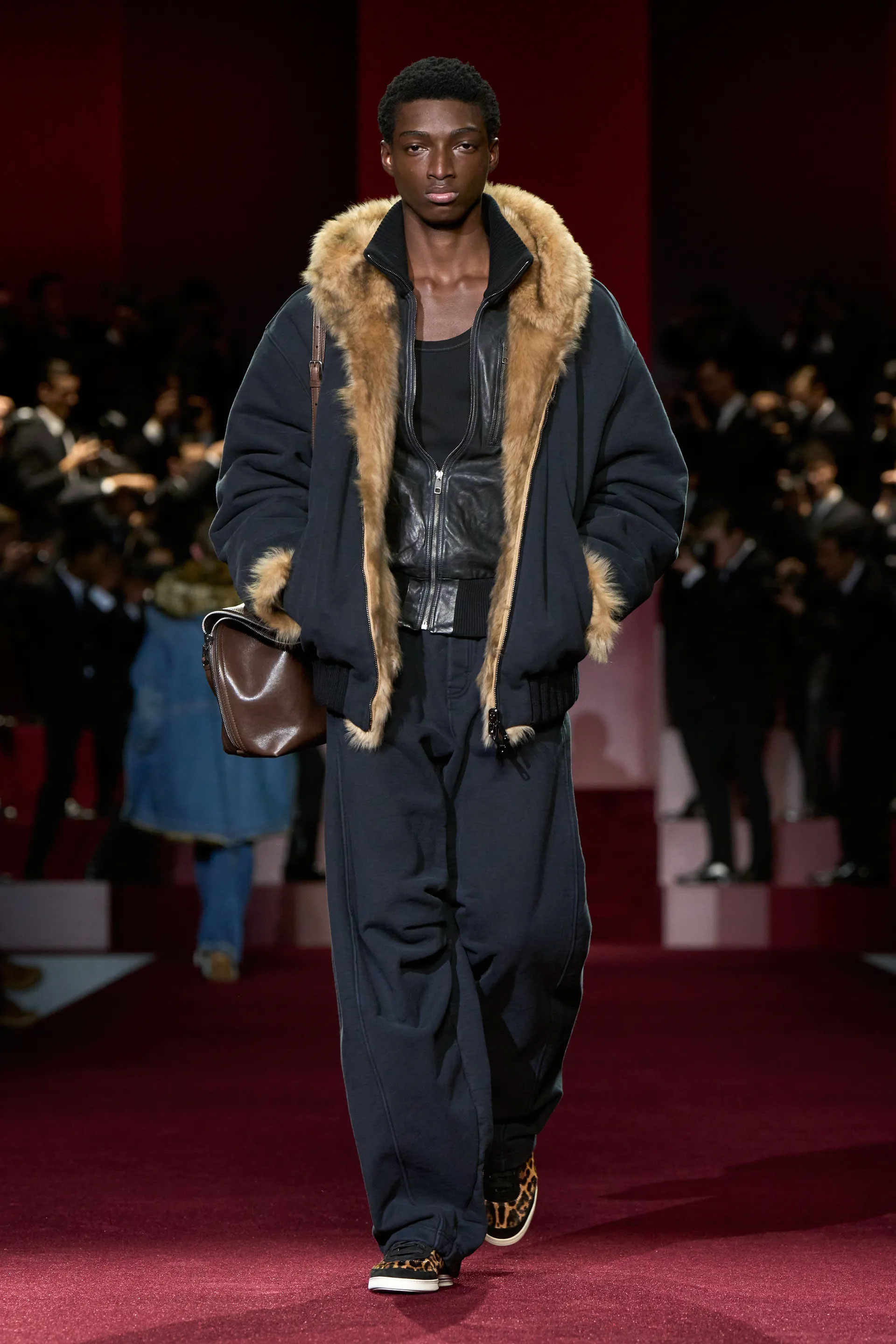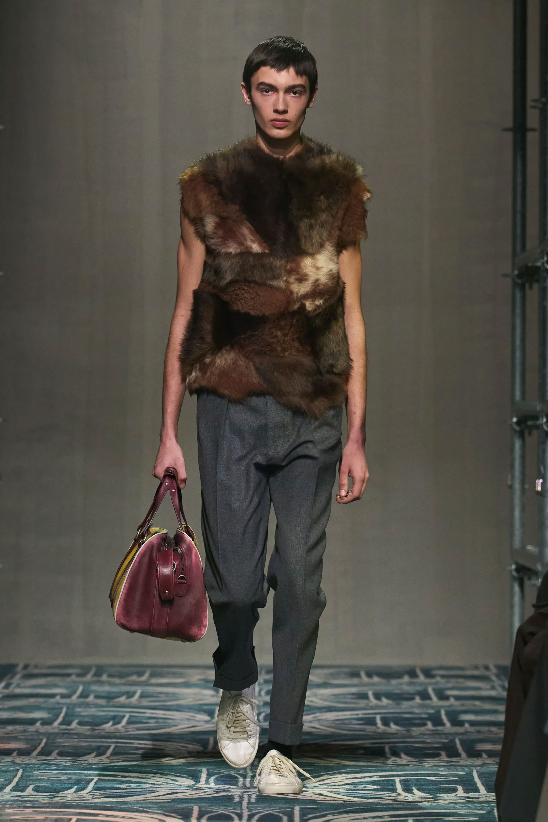 Місцем проведення нового показу Міуччі Пради та Рафа Сімонса став Fondazione Prada, який поєднав у собі сміливість берлінських нічних клубів і театралізованість бальних залів. Колекція натхненна базовими інстинктами та людською природою з її швидкими відповідями та непередбачуваними результатами. Усього на шоу дизайнери представили 56 образів, серед яких об’ємні пальта, частина з яких доповнювалася хутряними шарфами, топи з квітковими мотивами, яскраві брюки та класичні костюми.