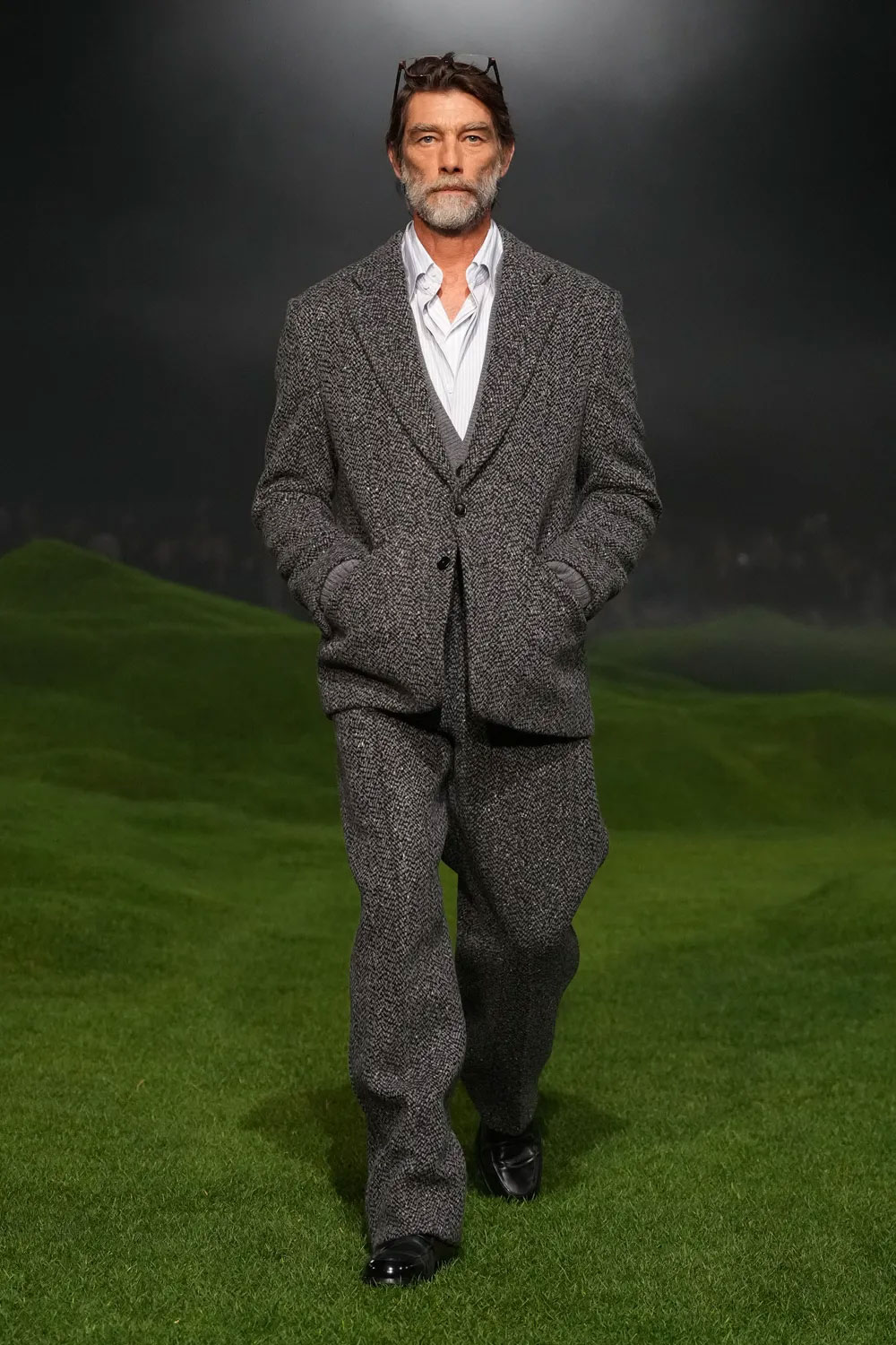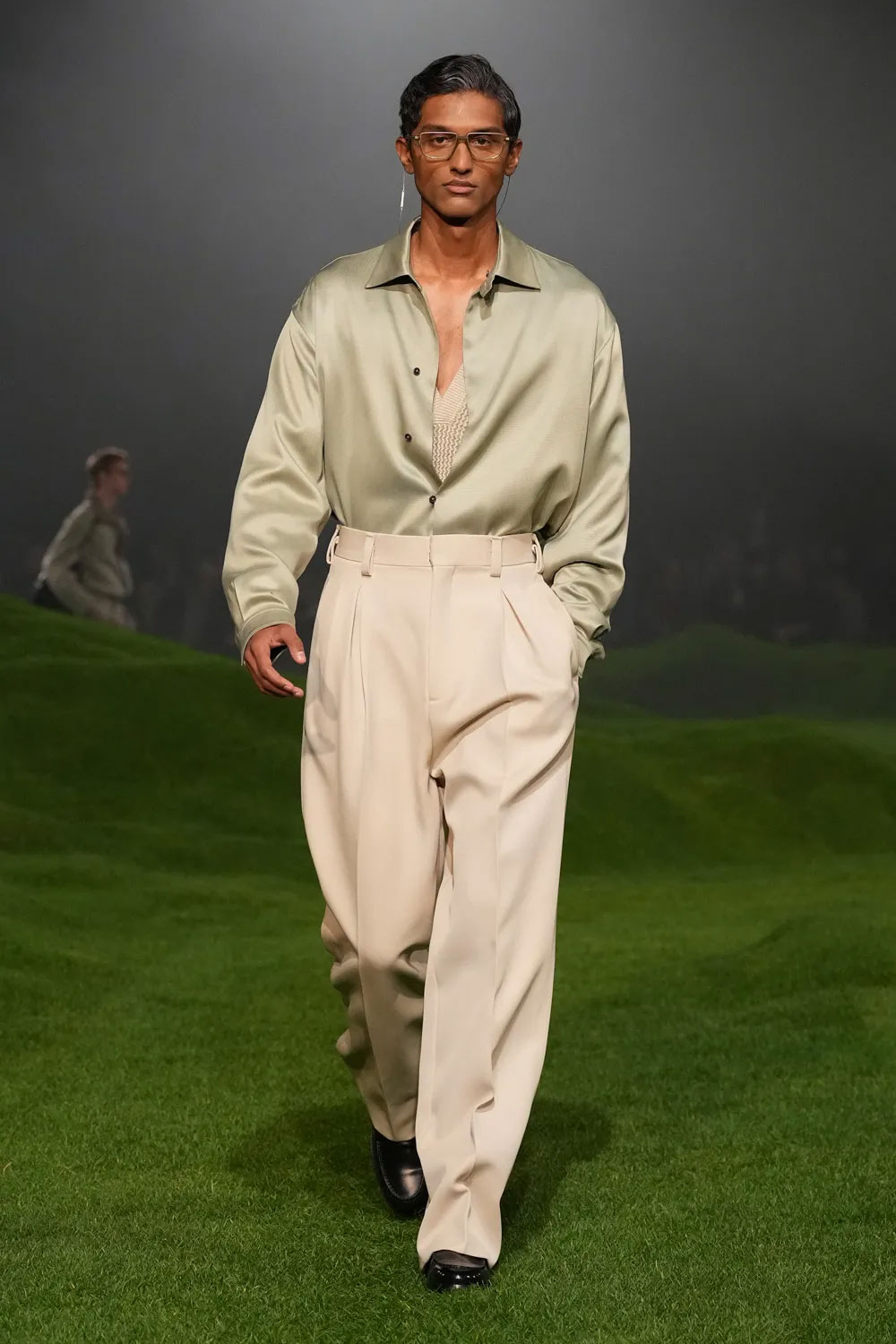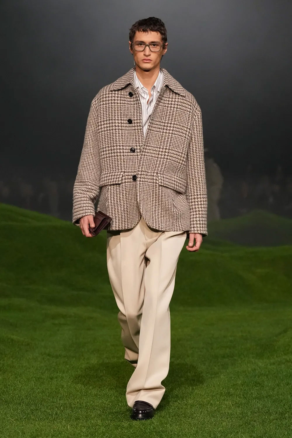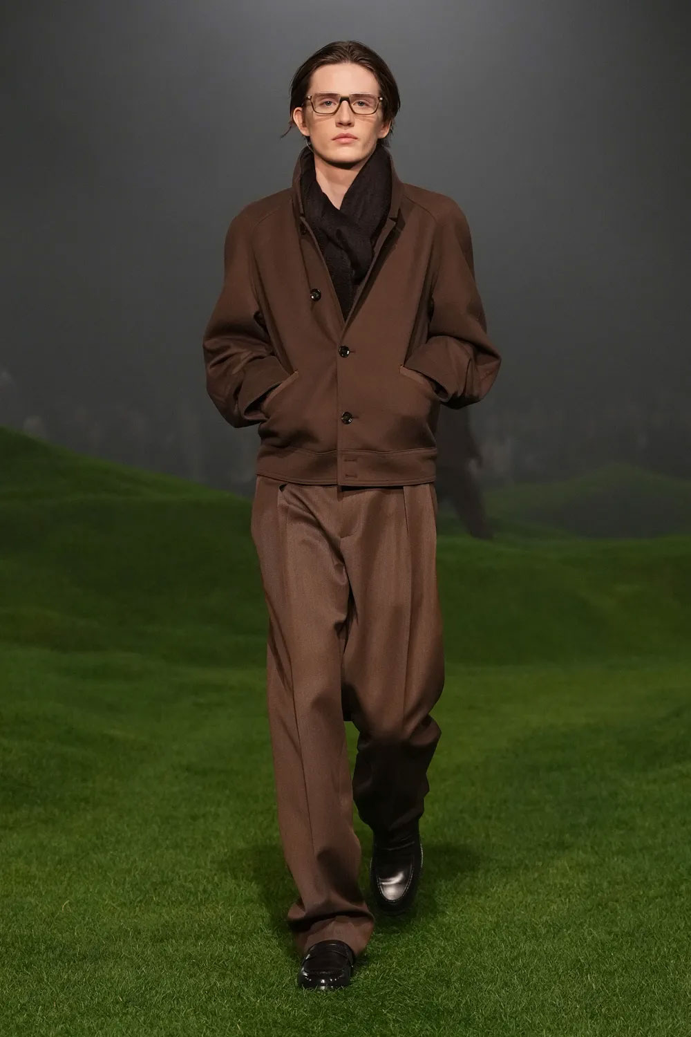 Колекція Zegna будувалася довкола відтінків базових кольорів. На контрастному подіумі з зеленим газоном з’явилися пальта, жилети, костюми та трикотаж — усі, забарвлені дизайнером Алессандро Сарторі в позачасові коричневий, бежевий, чорний і сірий.