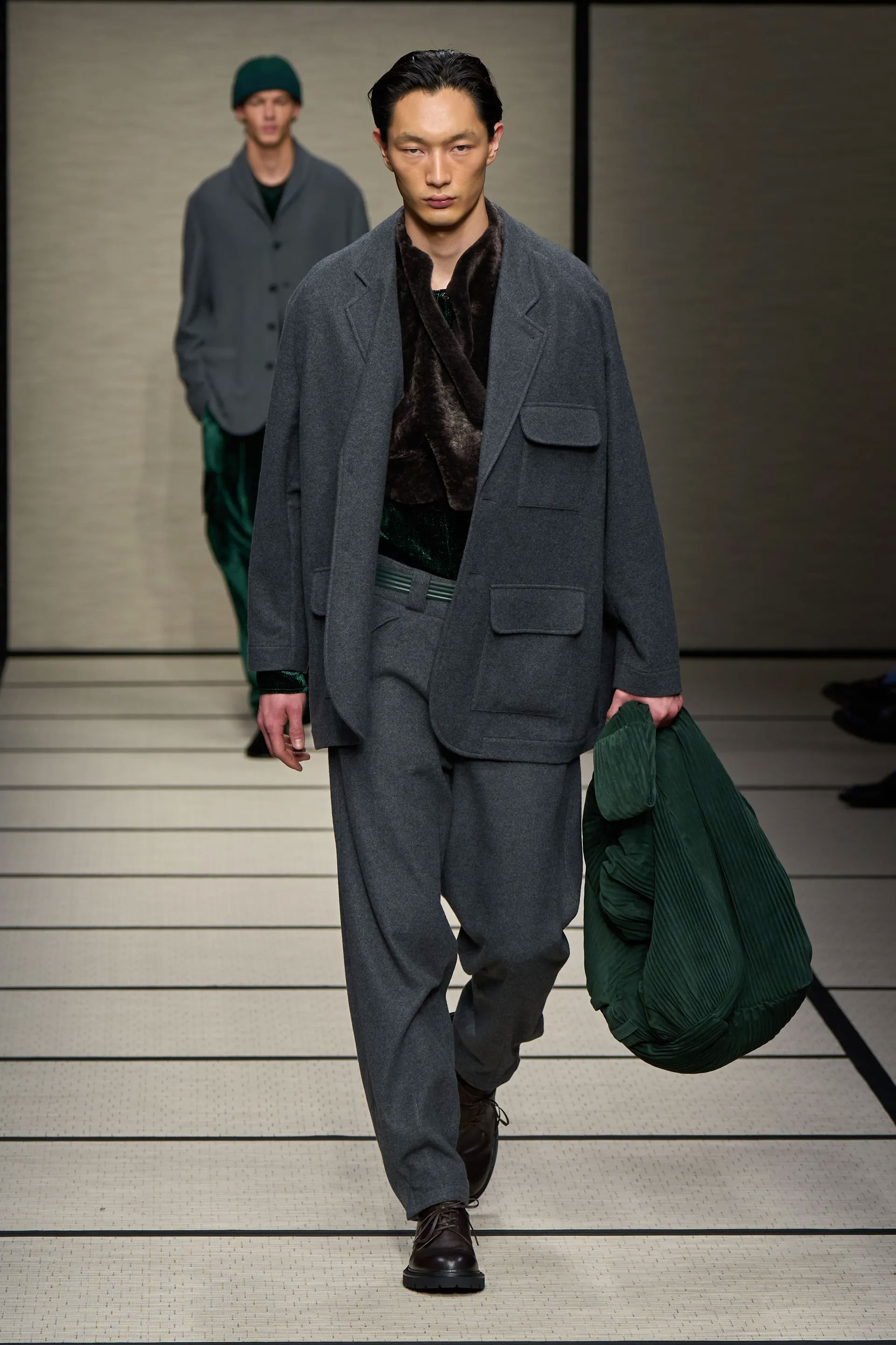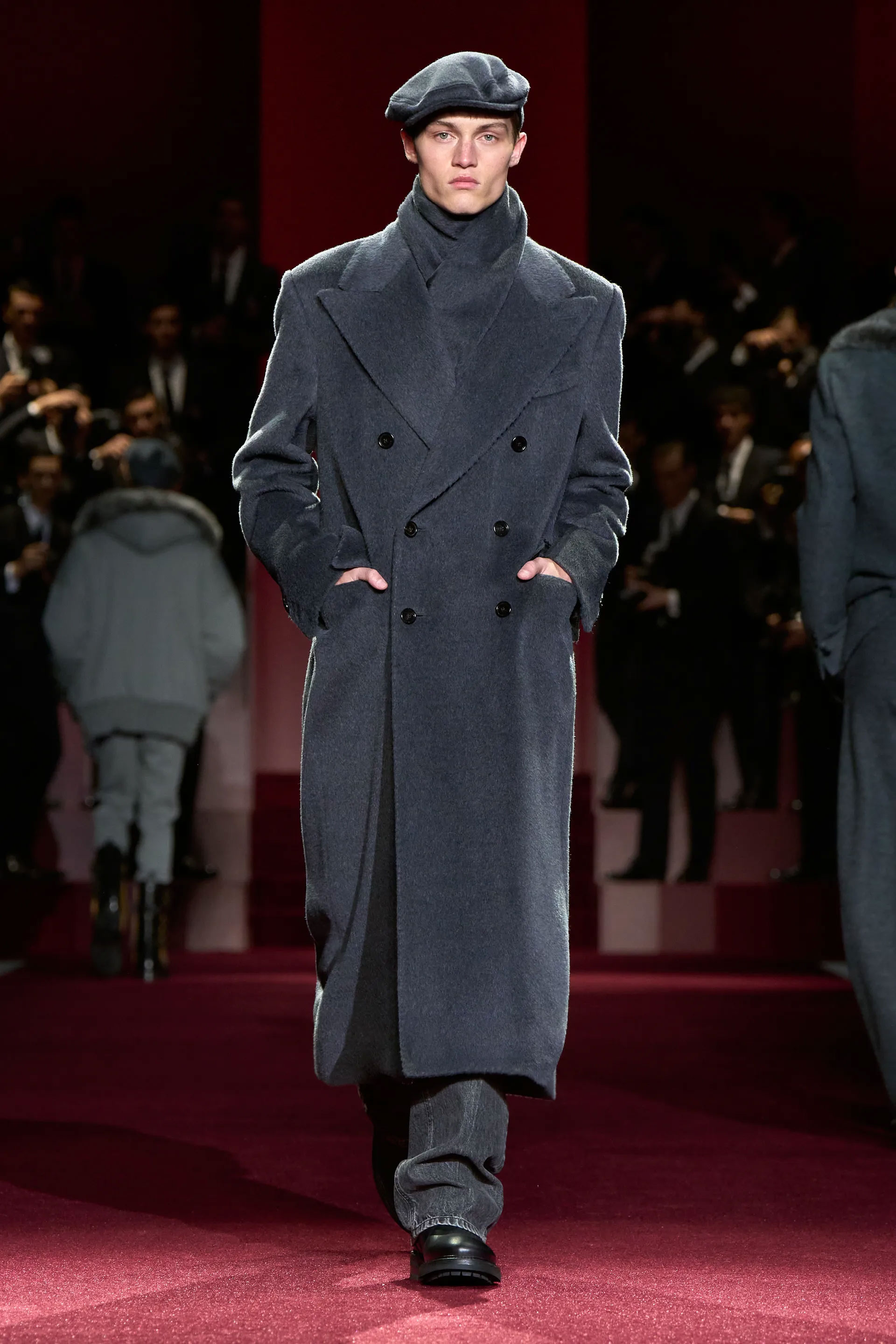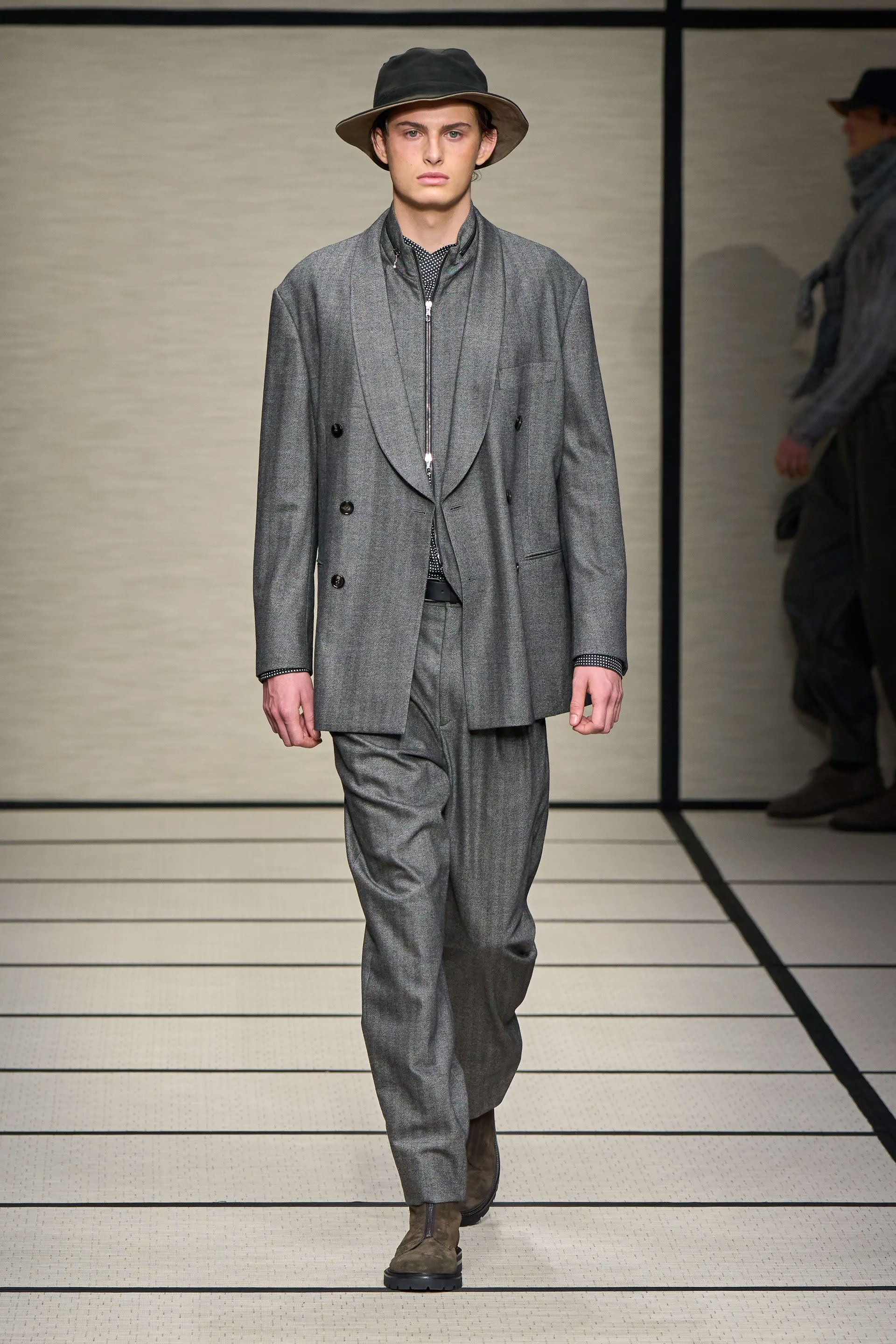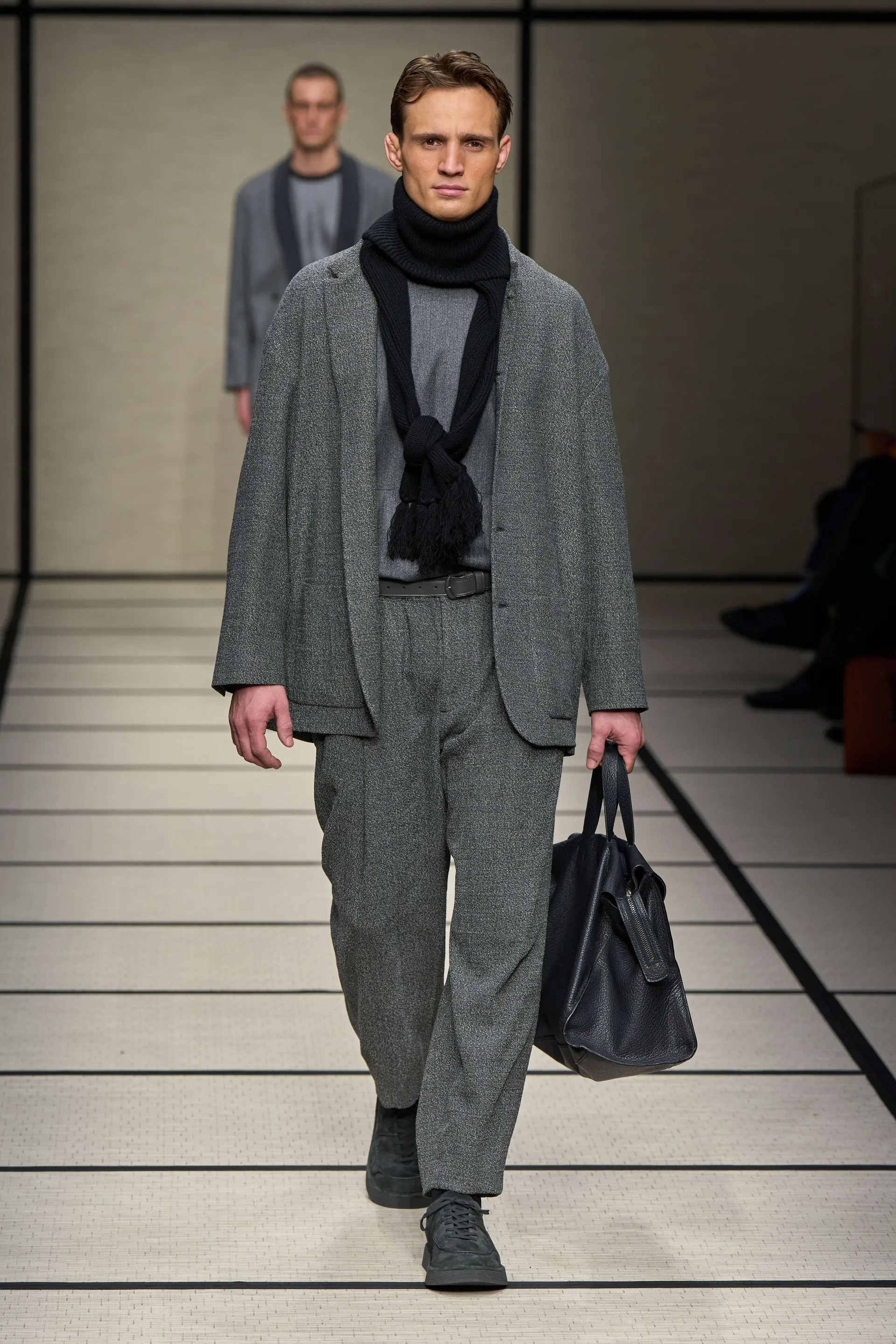 Колекція Zegna будувалася довкола відтінків базових кольорів. На контрастному подіумі з зеленим газоном з’явилися пальта, жилети, костюми та трикотаж — усі, забарвлені дизайнером Алессандро Сарторі в позачасові коричневий, бежевий, чорний і сірий.