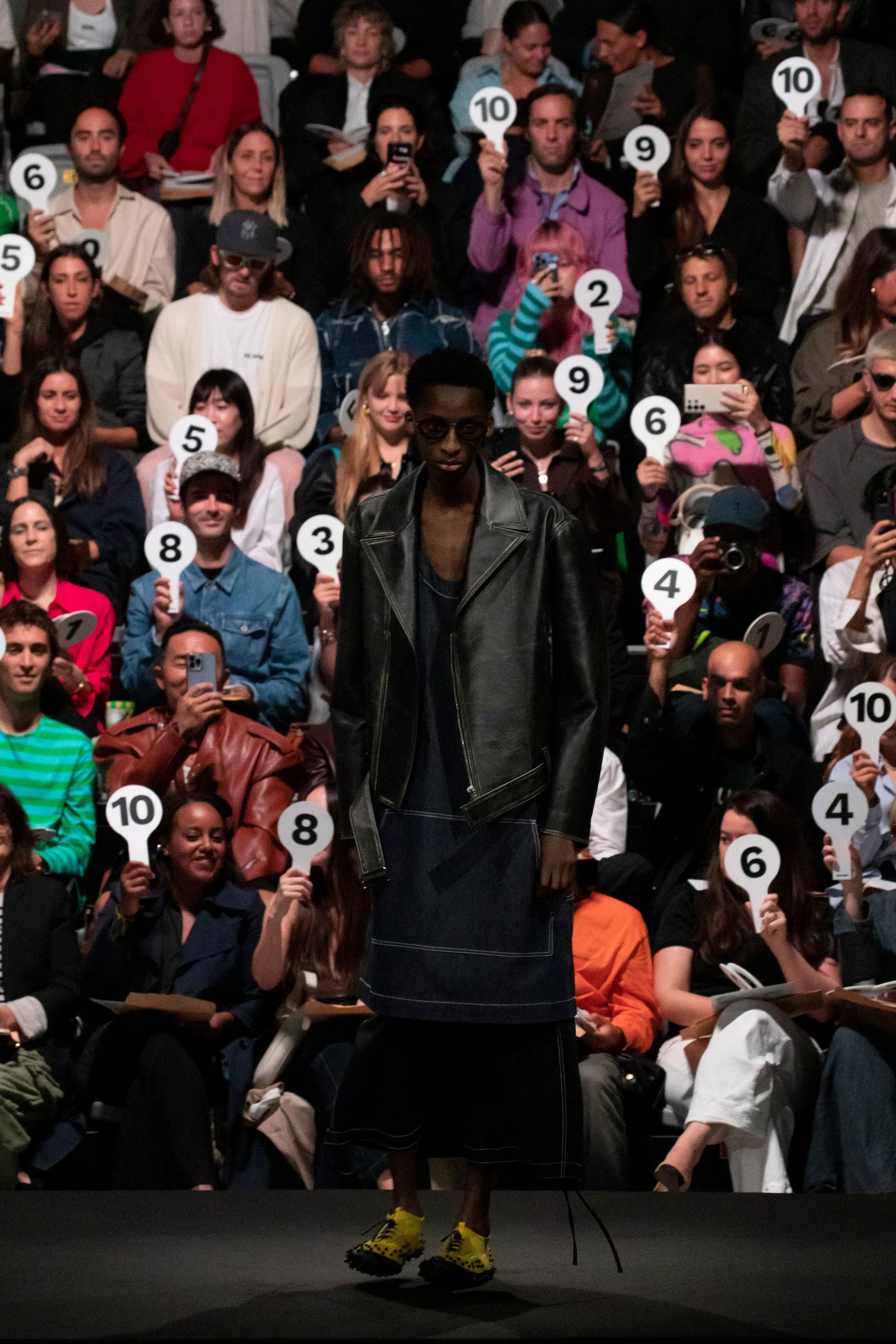 Наскільки репрезентативною є рецензія критика? Бренд Sunnei вирішив, що глядачі самі повинні винести вирок новій колекцію. Кожен гість отримав десять лопаток, якими міг висловити свою реакцію. Від 1 до 10 — колекція отримала високі оцінки. У новому сезоні Sunnei дивували аудиторію мотокуртками, ансамблями з переробленого деніму та геометричними топами. Смугасті комплекти й оверсайз-образи доповнювалися дутими сумками, а також взуттям на великій платформі.