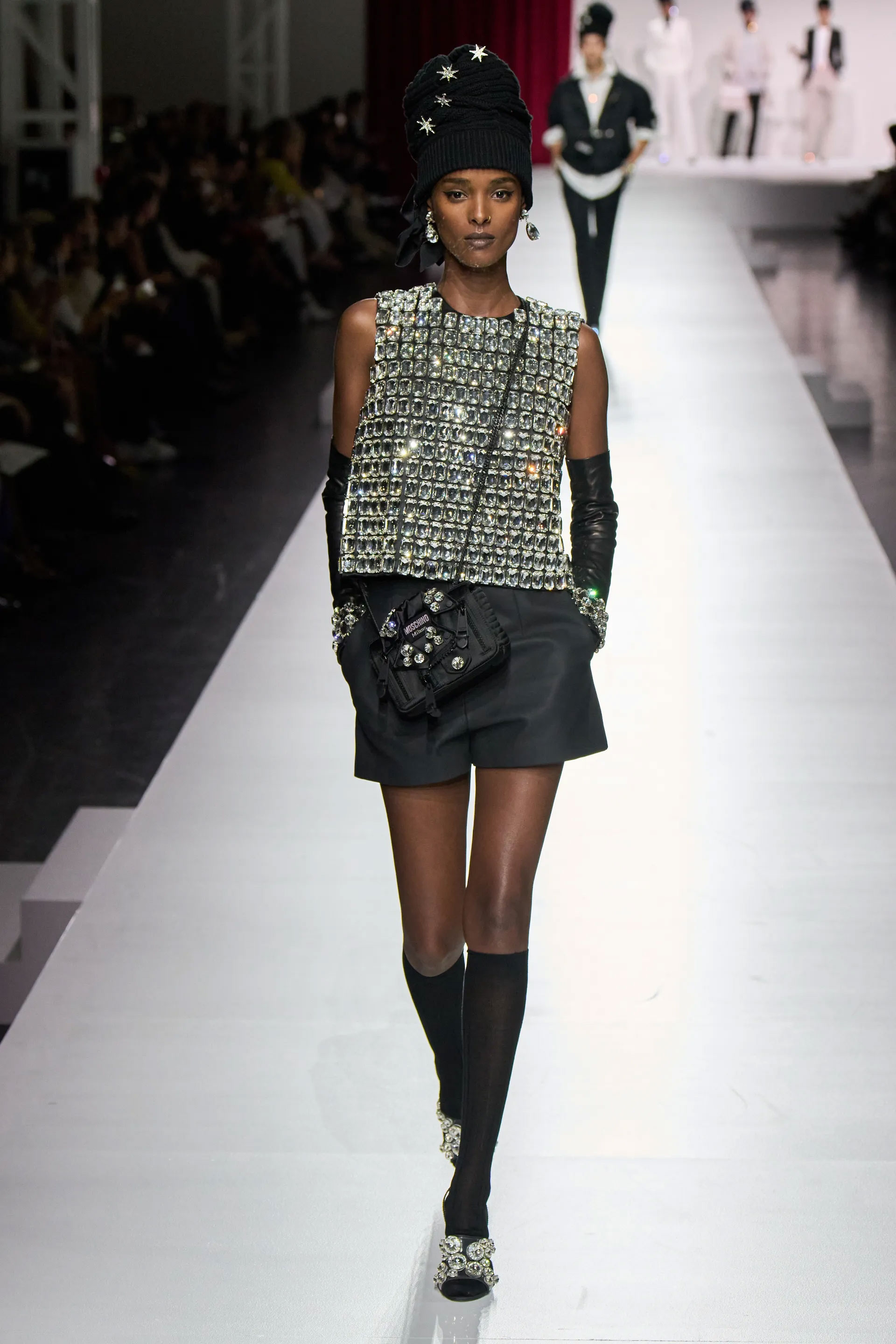 Цього року Moschino святкує своє 40-річчя або, як кажуть у бренді, «40 років любові». Коли бренд покинув Джеремі Скотт, Moshino запросив чотирьох стилістів для створення нової колекції. Четвірка представила епатажні коди бренду в різних інтерпретаціях. Карлін Серф де Дюдзель презентувала класичні силуети часів засновника Франко Москіно. Габріела Карефа-Джонсон створила айтеми під назвою NOWstalgia, натхненні модою 90-х. Люція Лу працювала в концептуальному форматі, а Кеті Гранд дослідила розкіш буквально через мегафон. Вона представила айтеми з надписами LOUD LUXURY.