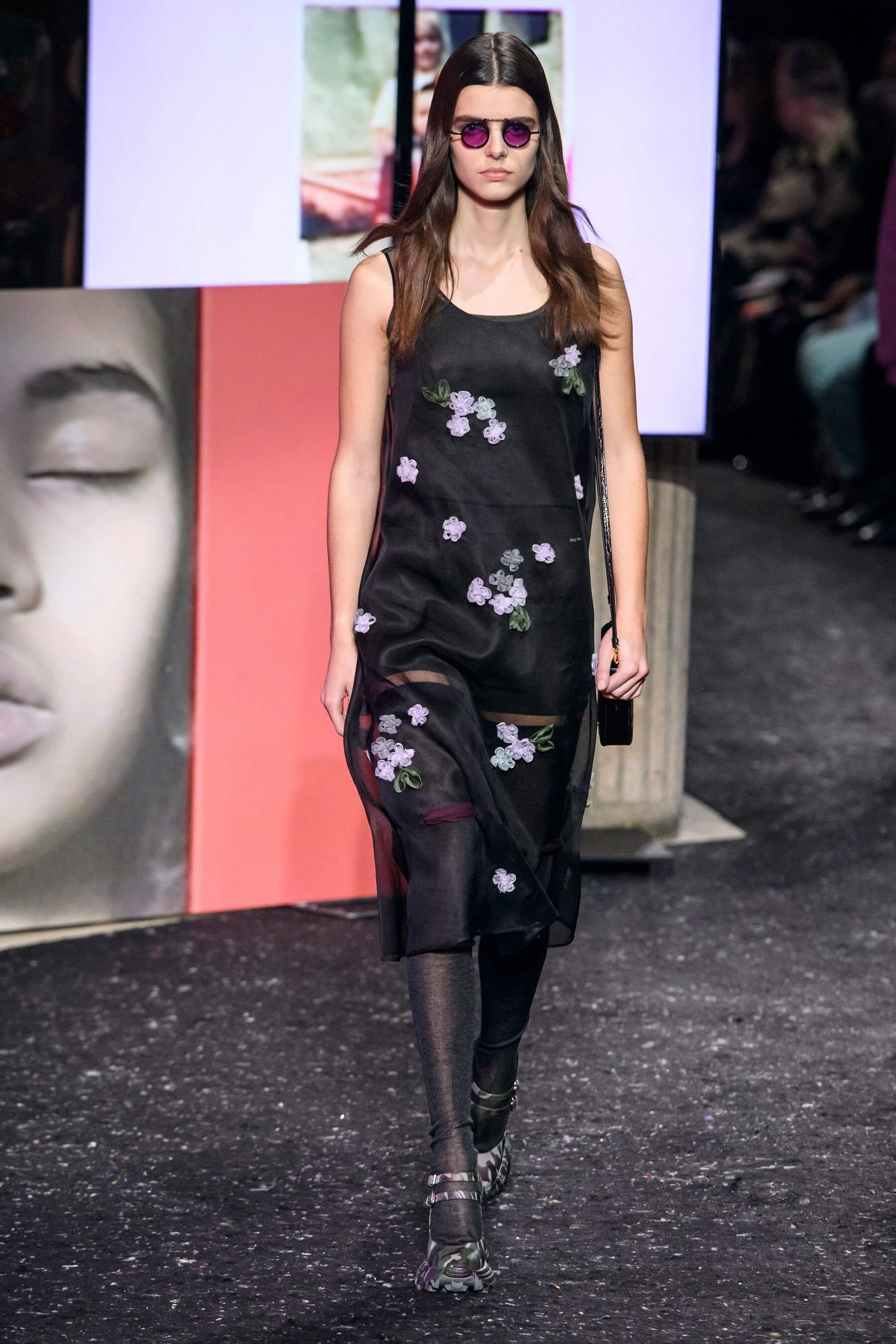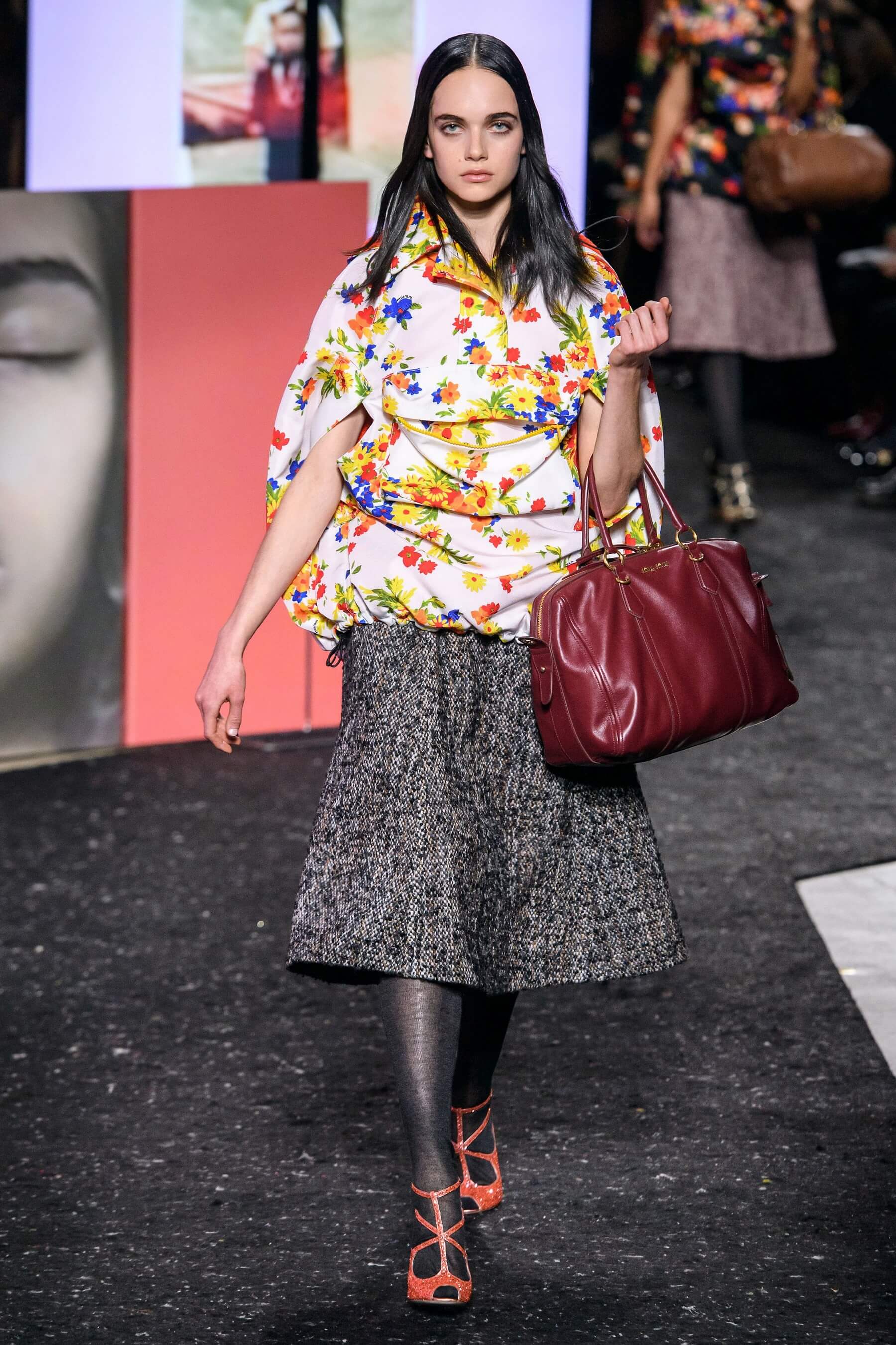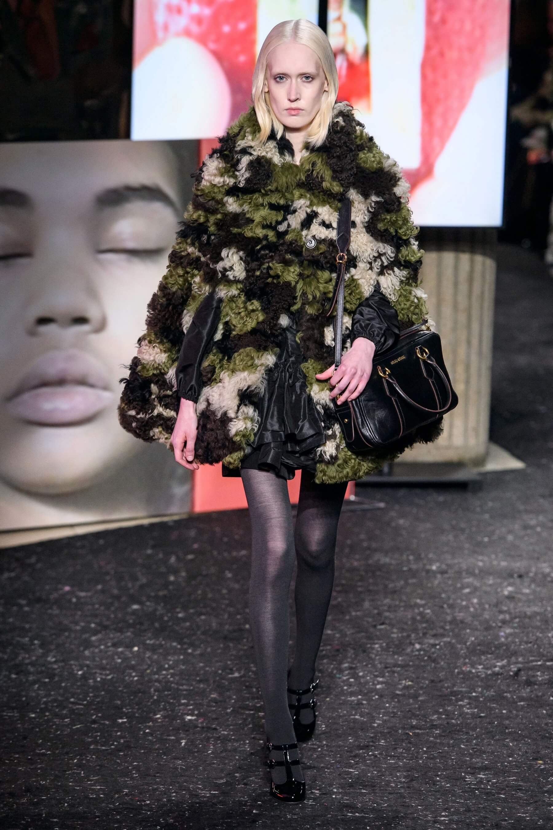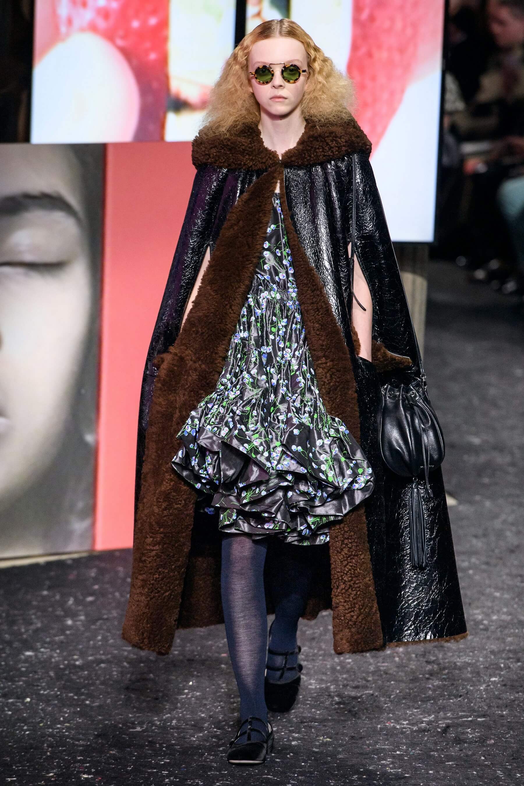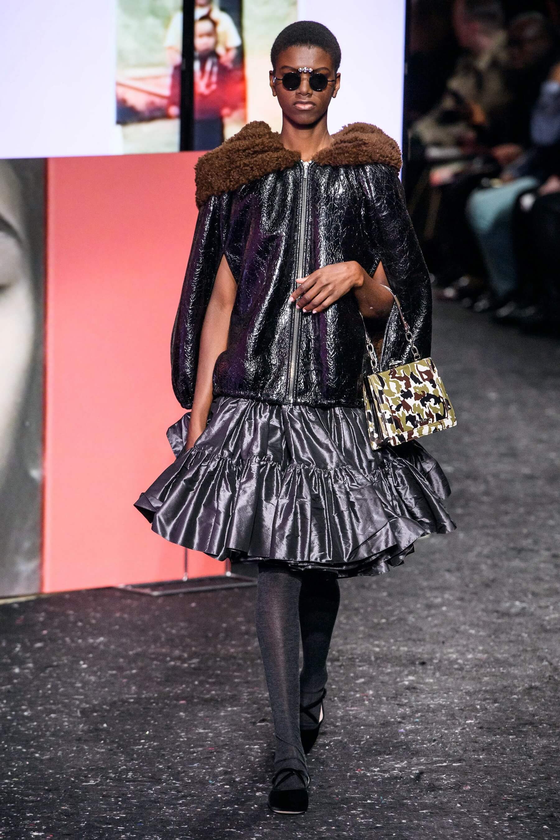 Осеннюю коллекцию Миучча Прада так же посвятила ностальгии - сет-дизайн показа создавала новозеландская художница Шарна Озборн: модели проходили по подиуму среди светящихся экранов винтажных телевизоров и плакатов, на которых были изображения диснеевских игрушек, авангардных скульптур, певицы Долли Партон и деталей самой коллекции.