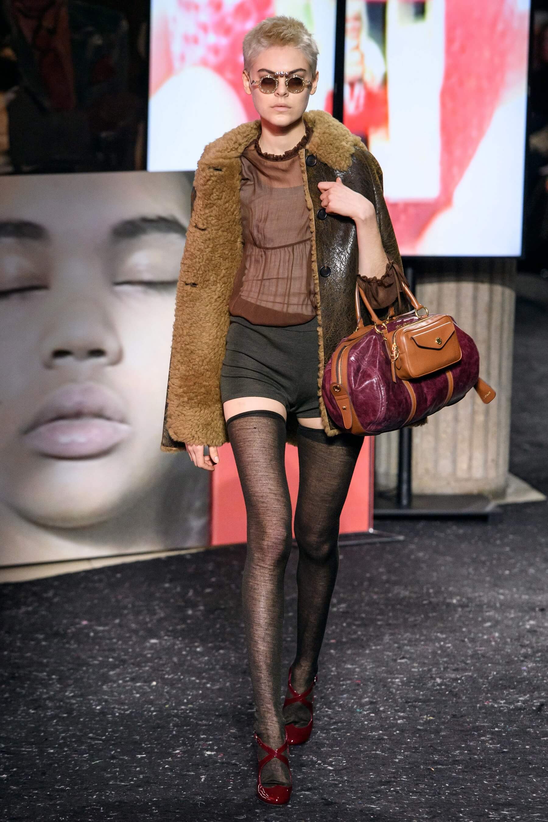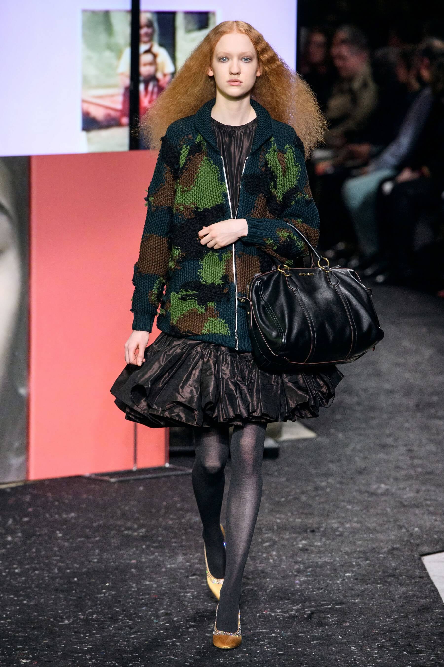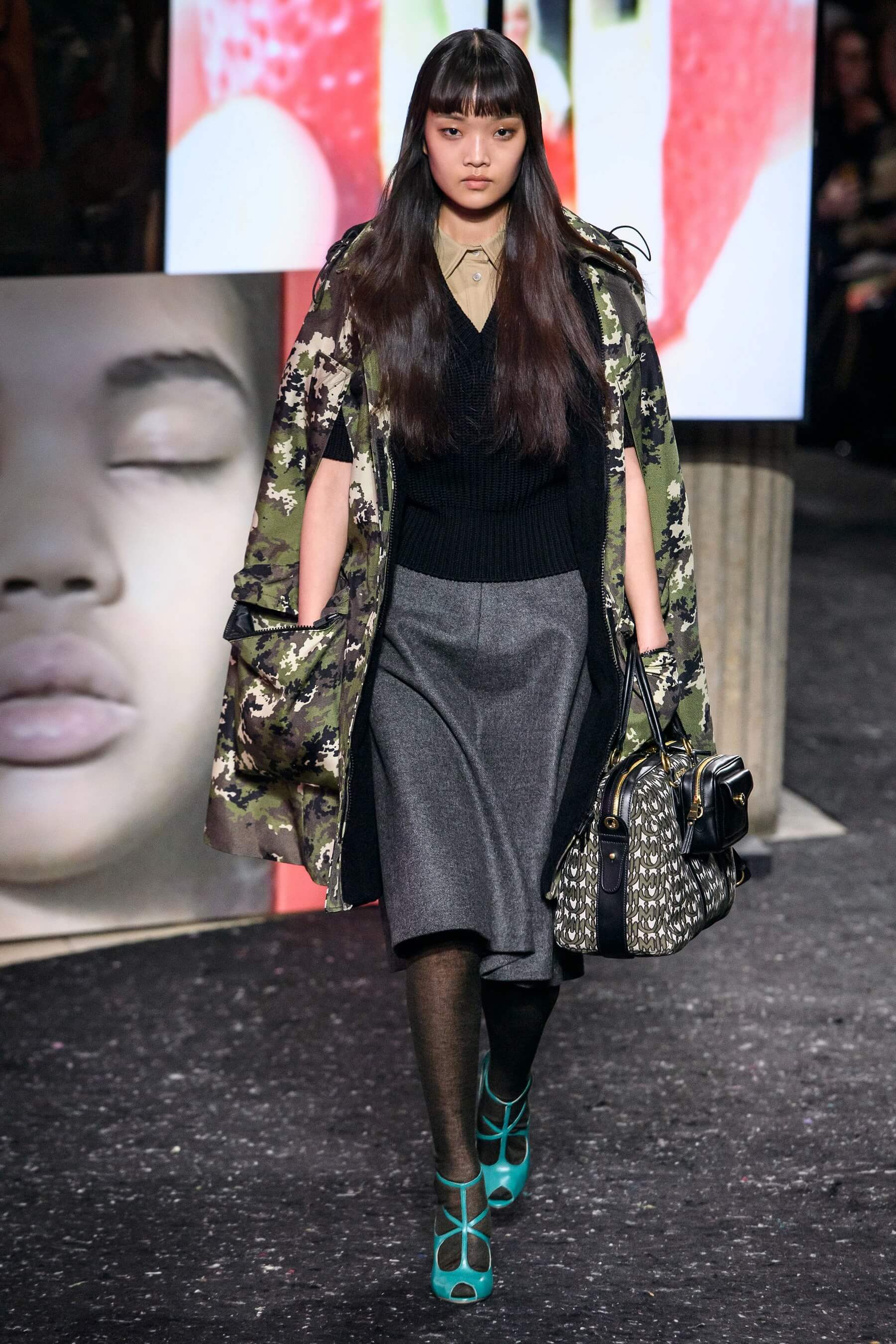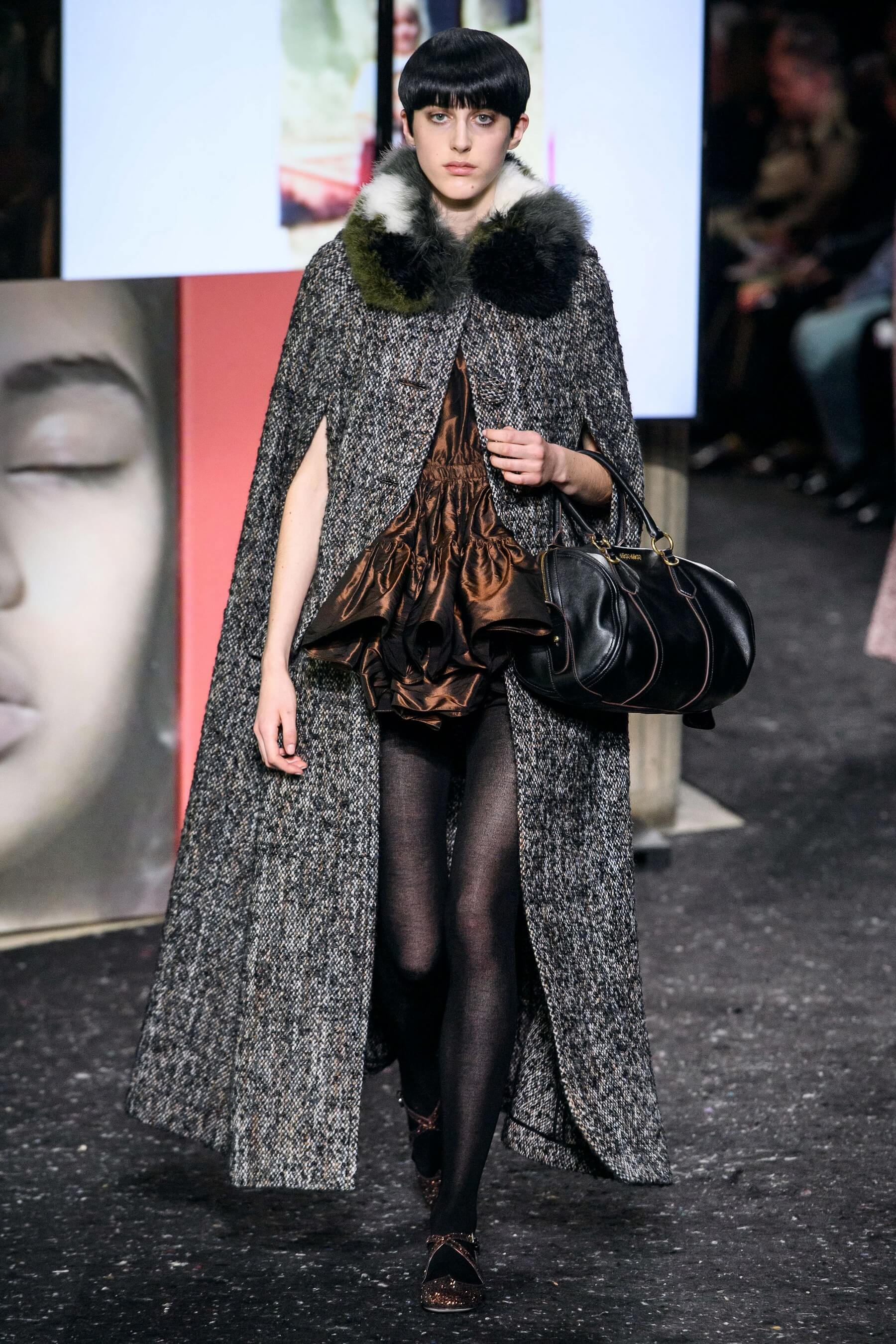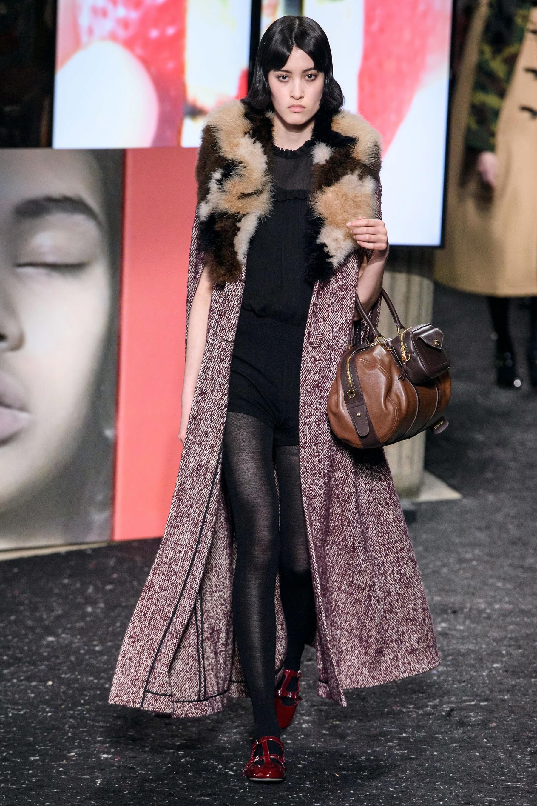 Осеннюю коллекцию Миучча Прада так же посвятила ностальгии - сет-дизайн показа создавала новозеландская художница Шарна Озборн: модели проходили по подиуму среди светящихся экранов винтажных телевизоров и плакатов, на которых были изображения диснеевских игрушек, авангардных скульптур, певицы Долли Партон и деталей самой коллекции.