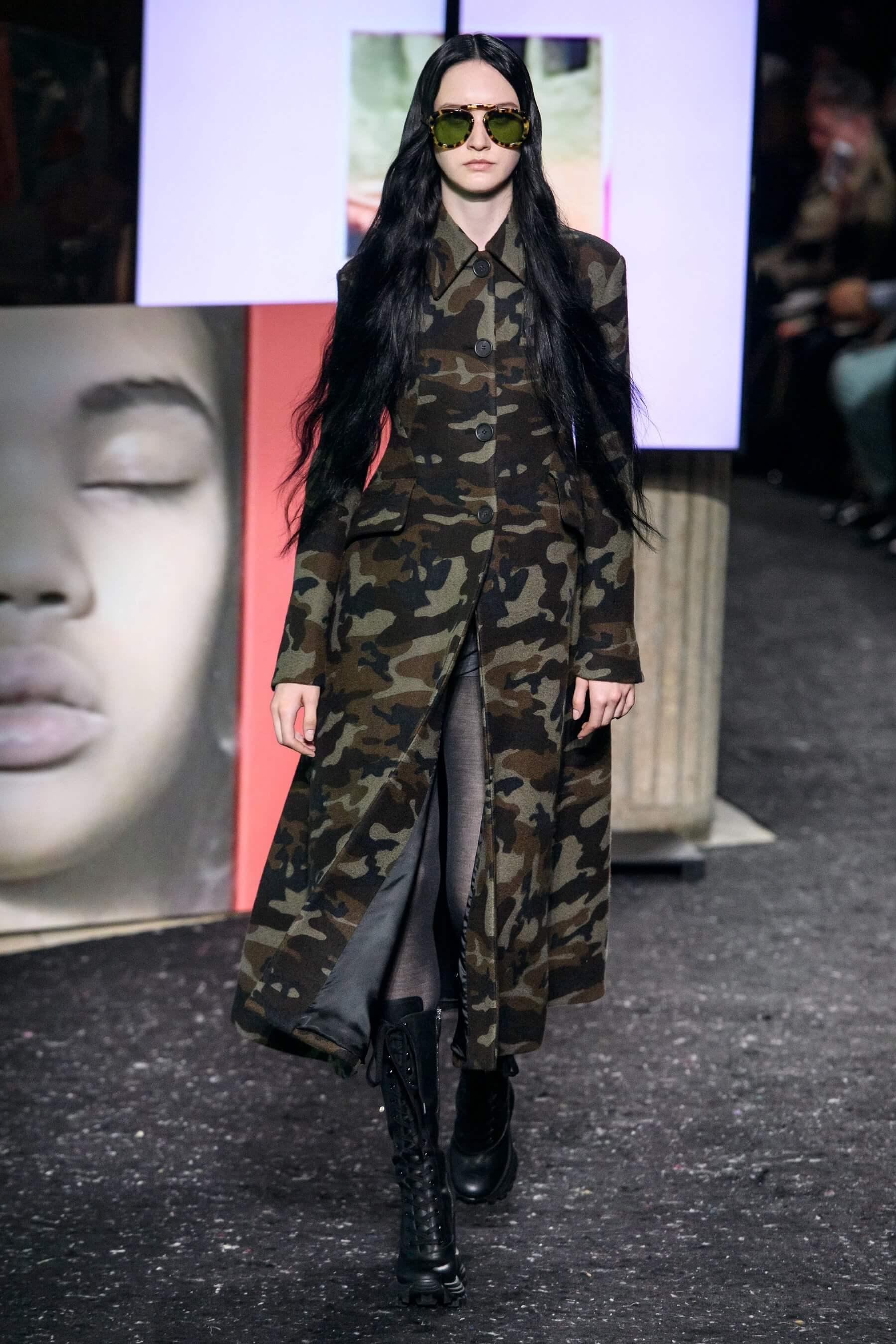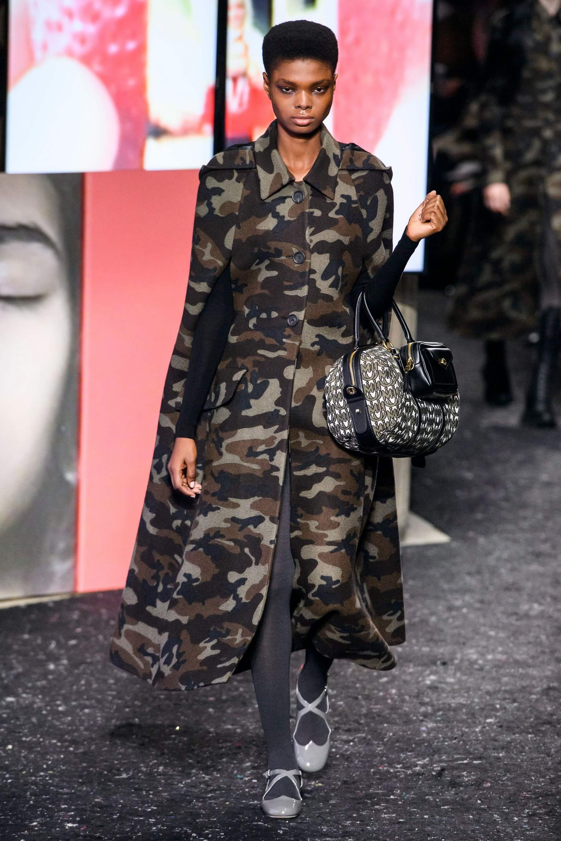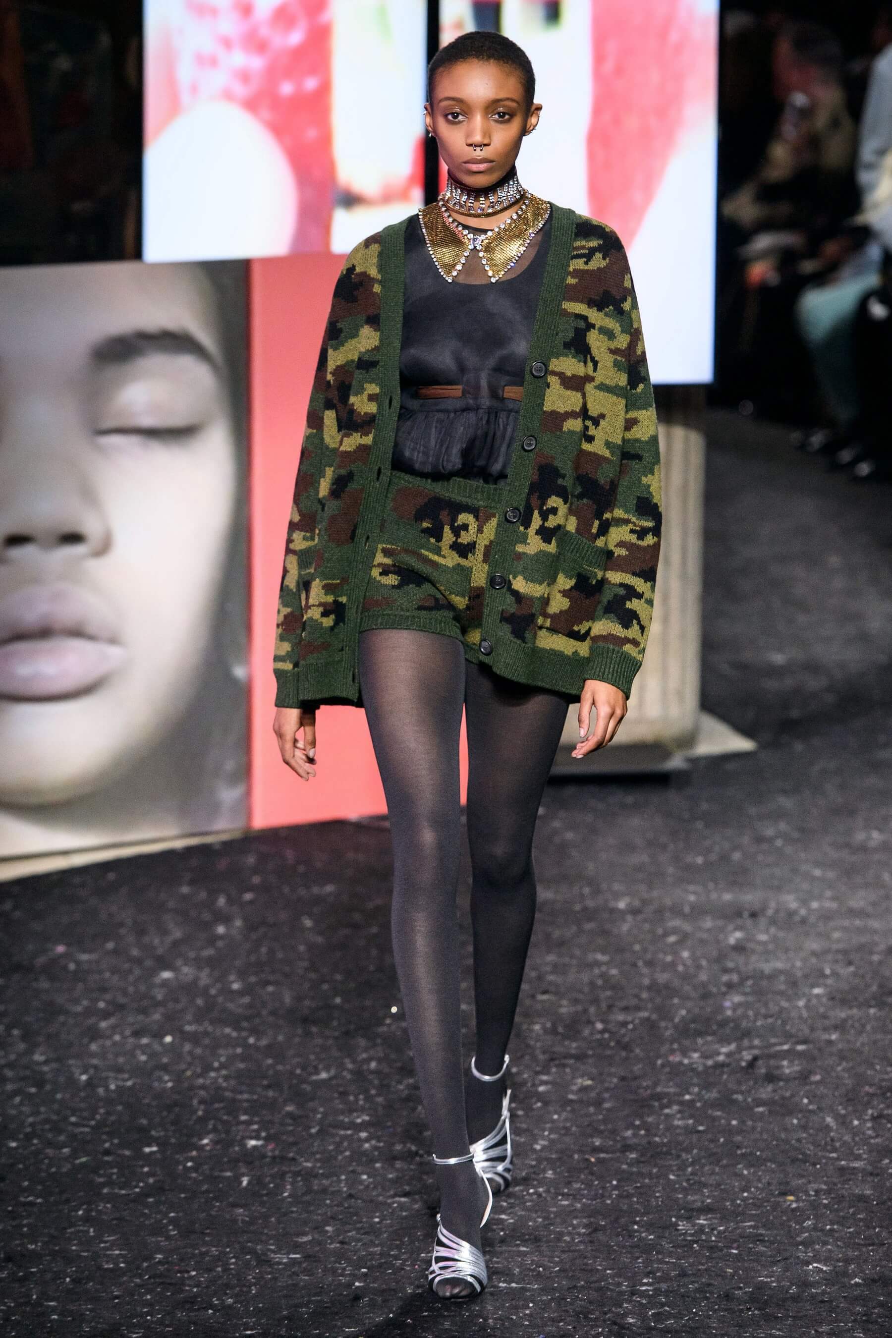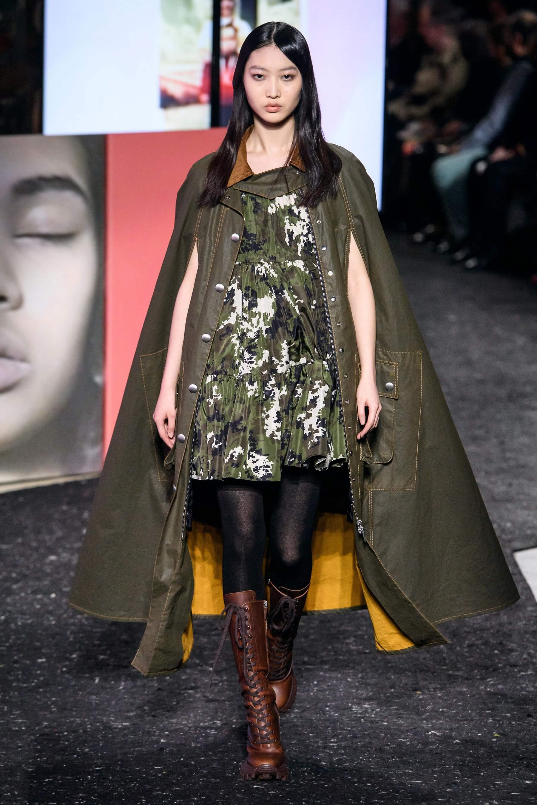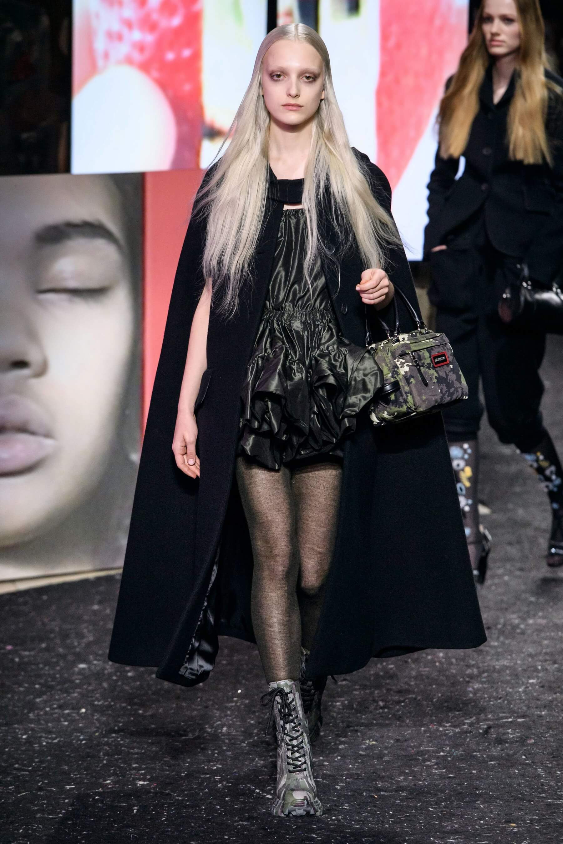 Главным предметом одежды, с которым дизайнер работала в этот раз стал кейп - его вариации от классических суконных и бархатных до вязанных, камуфлированных и даже в форме плащ-палаток, дополняли нежные платья из органзы с цветочной вышивкой и продетыми в горловины шифоновыми шарфами, кольчужные ожерелья и юбки-миди.