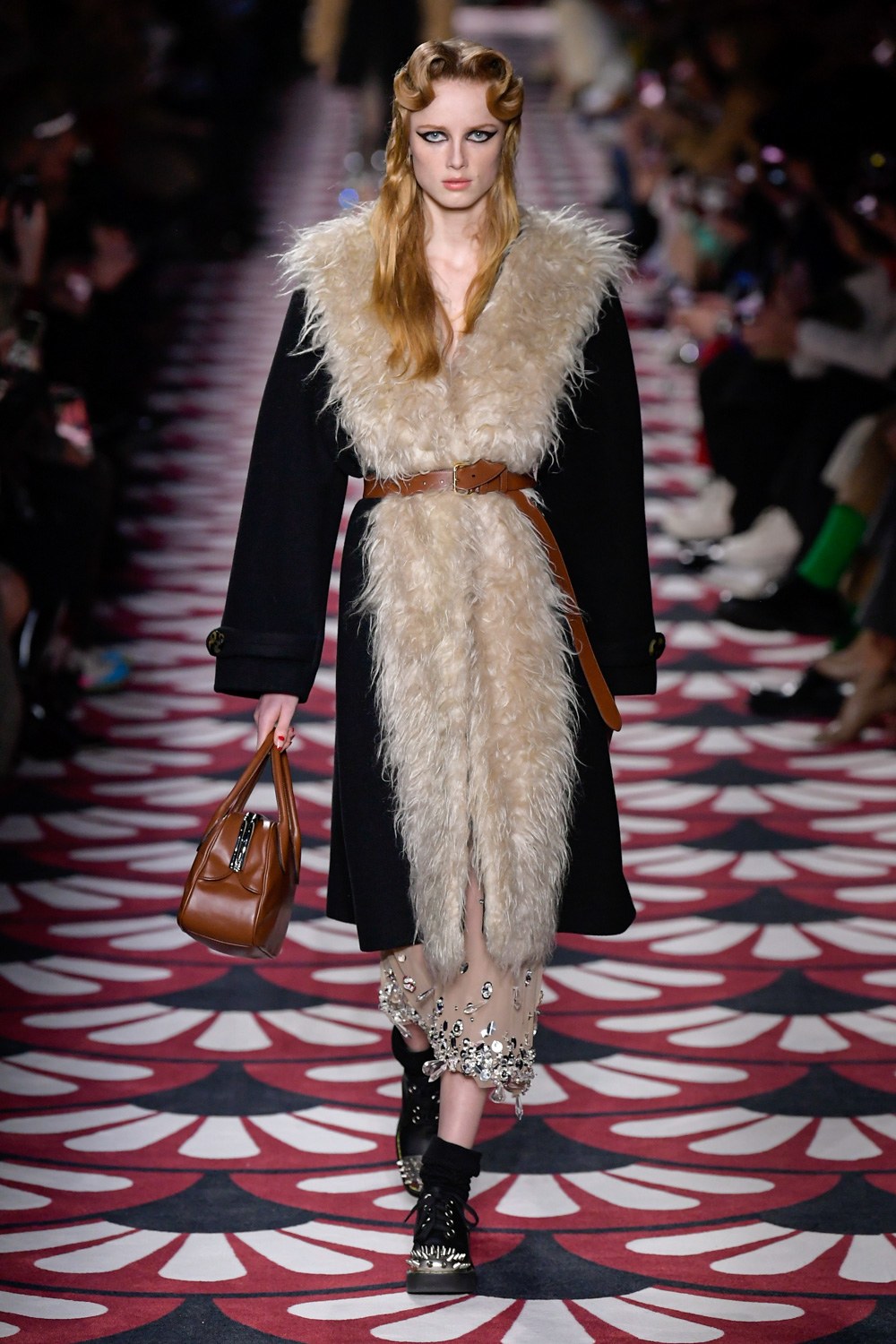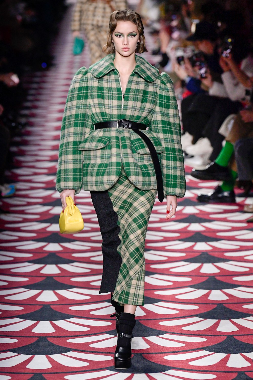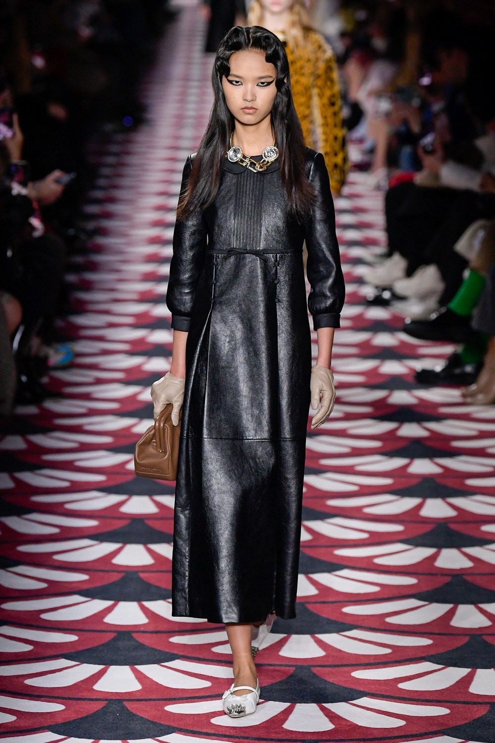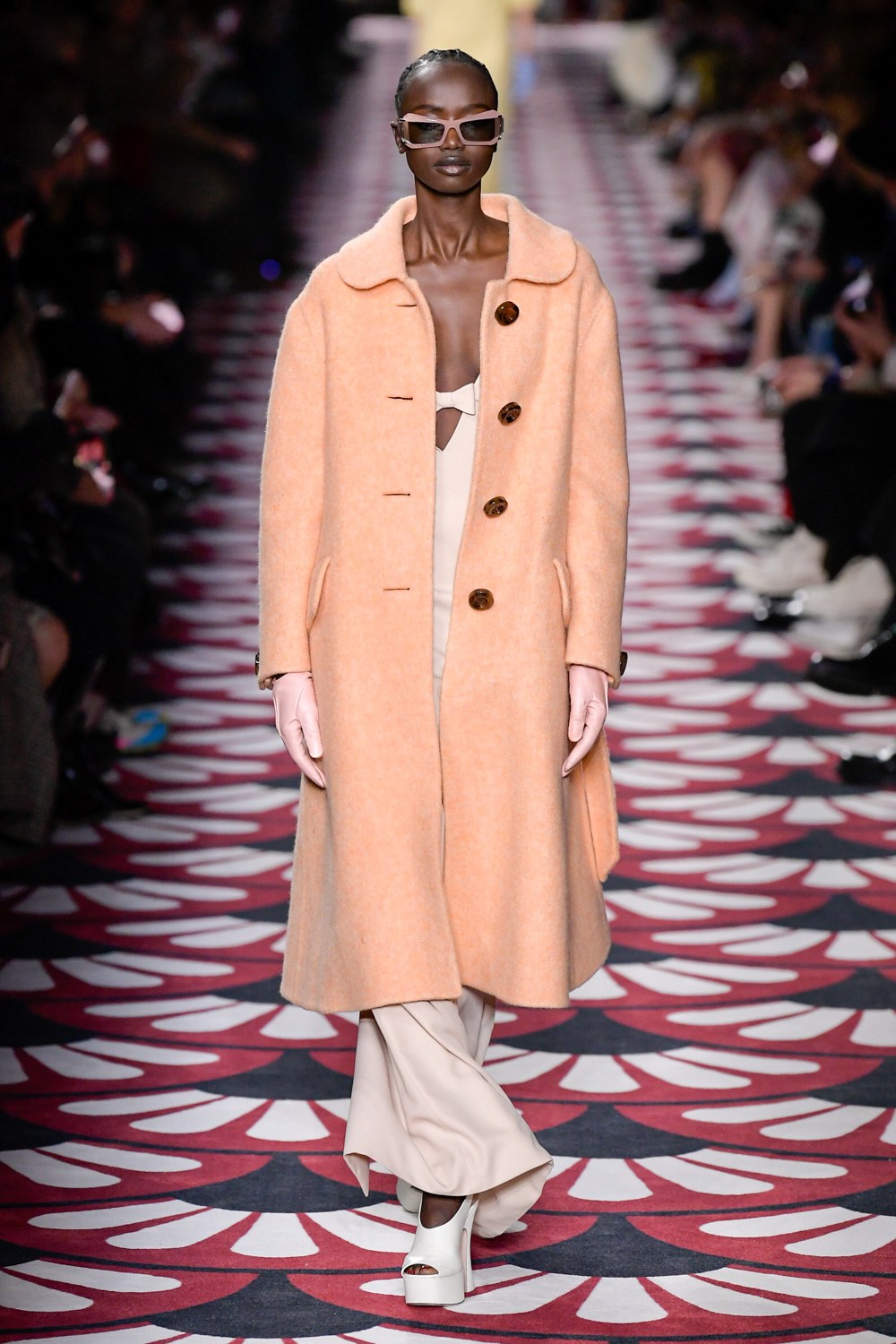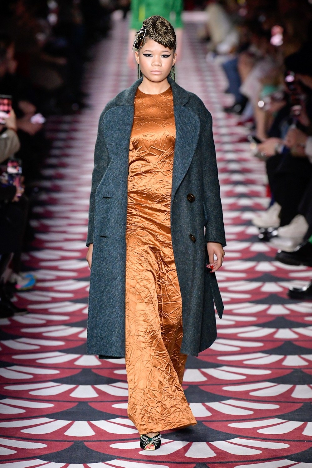 16-летняя звезда сериала "Эйфория" Сторм Рейд открыла показ в платье медного оттенка и суровом сером пальто, а певица Рита Ора появилась в пальто, напоминающем военный мундир периода Первой мировой войны. Однако общий нарратив осенней коллекции Миуччи Прады вовсе не такой тревожный. Несмотря на то что дизайнер обратилась к предвоенной моде 40-х, образы, представленные на показе в Париже, были по-девичьи нежными, чувственными и даже жизнерадостными. Обилие силуэтных костюмов в клетку сменялось леопардовыми пальто и юбками, а одежда из кожи - вещами пастельных оттенков.