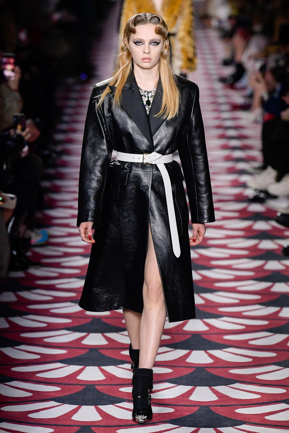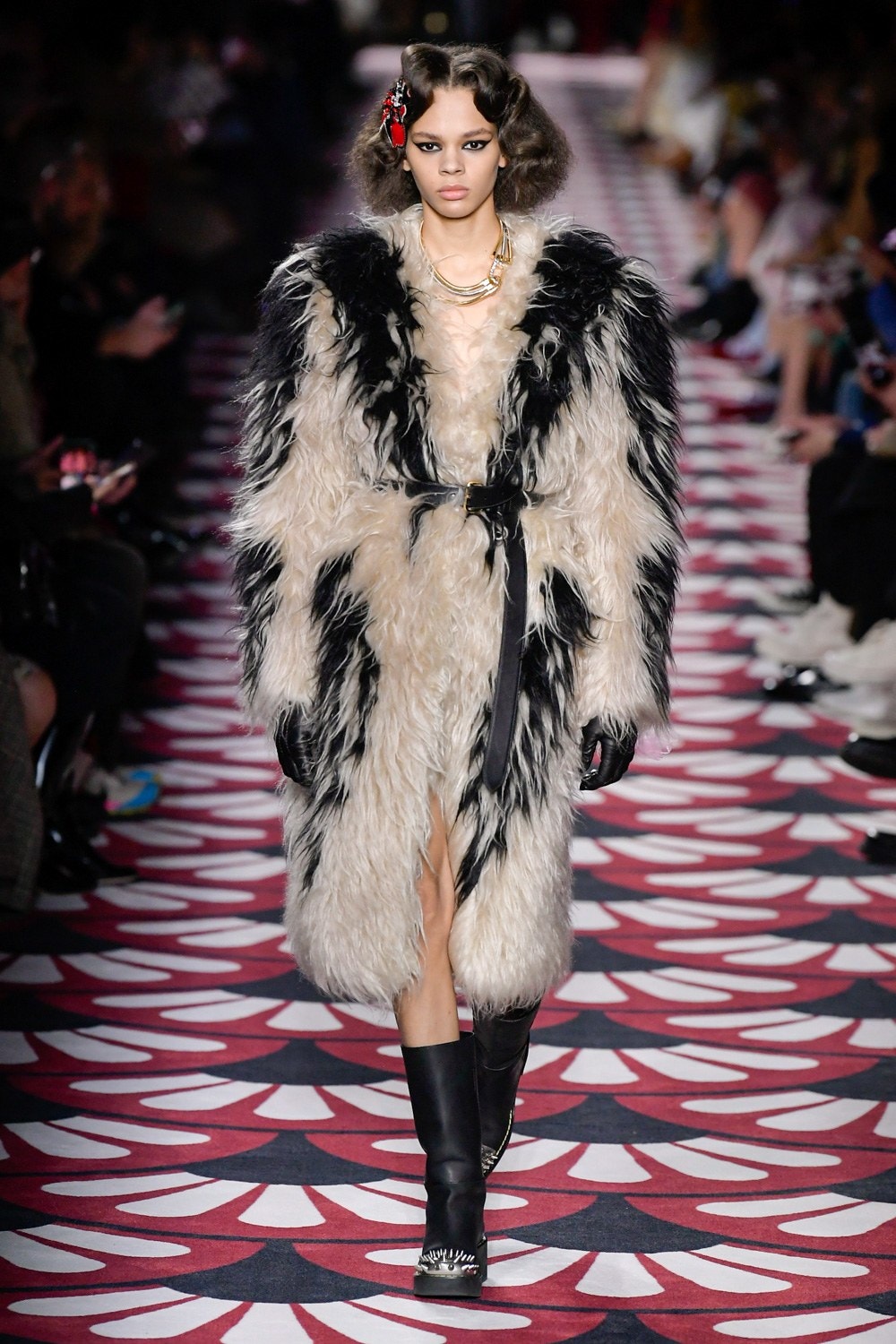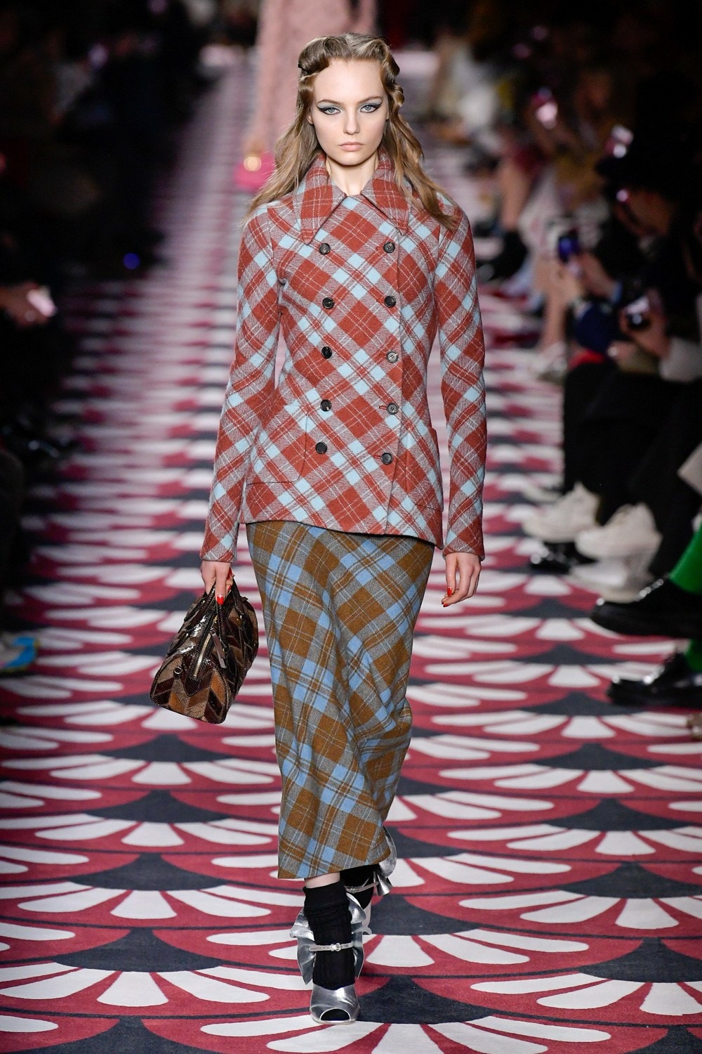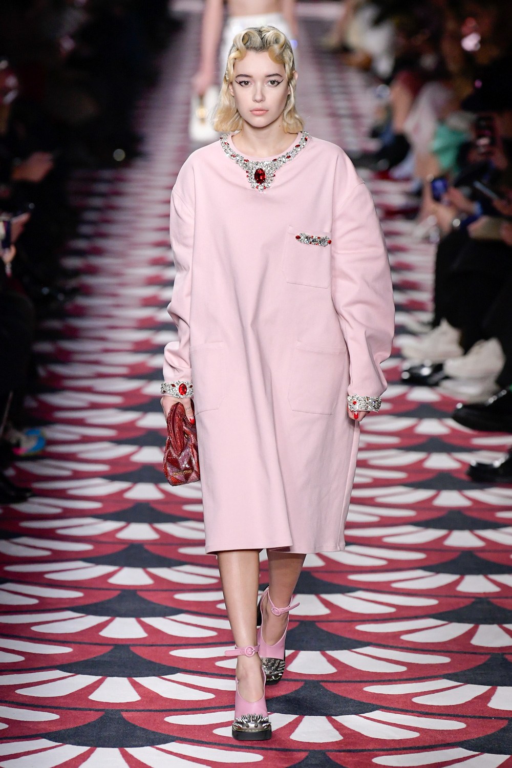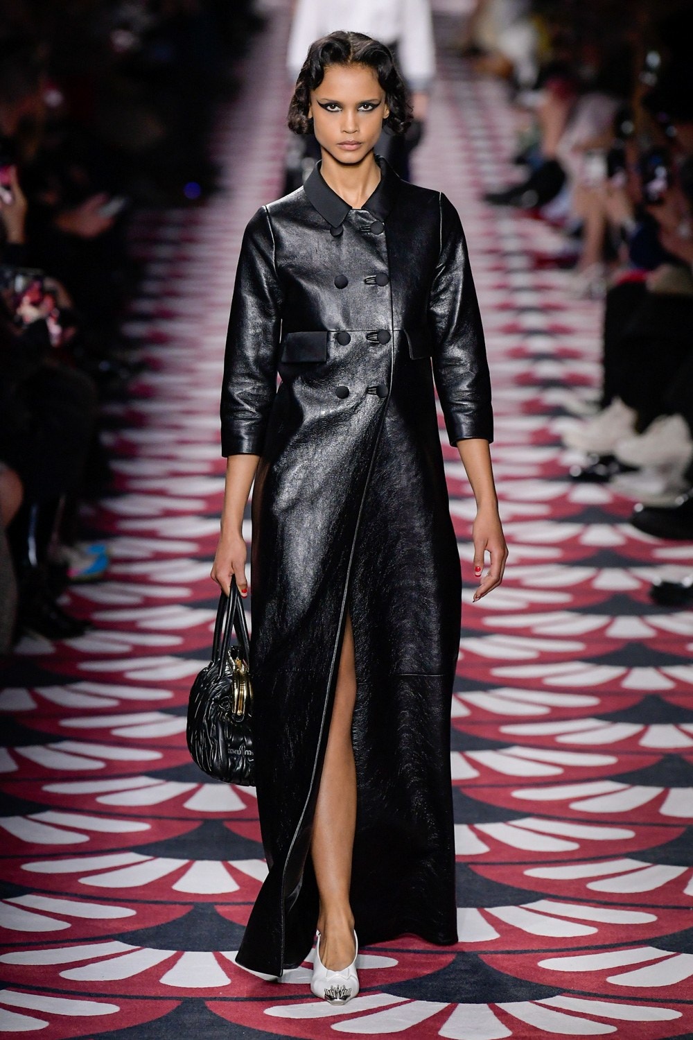 16-летняя звезда сериала "Эйфория" Сторм Рейд открыла показ в платье медного оттенка и суровом сером пальто, а певица Рита Ора появилась в пальто, напоминающем военный мундир периода Первой мировой войны. Однако общий нарратив осенней коллекции Миуччи Прады вовсе не такой тревожный. Несмотря на то что дизайнер обратилась к предвоенной моде 40-х, образы, представленные на показе в Париже, были по-девичьи нежными, чувственными и даже жизнерадостными. Обилие силуэтных костюмов в клетку сменялось леопардовыми пальто и юбками, а одежда из кожи - вещами пастельных оттенков.