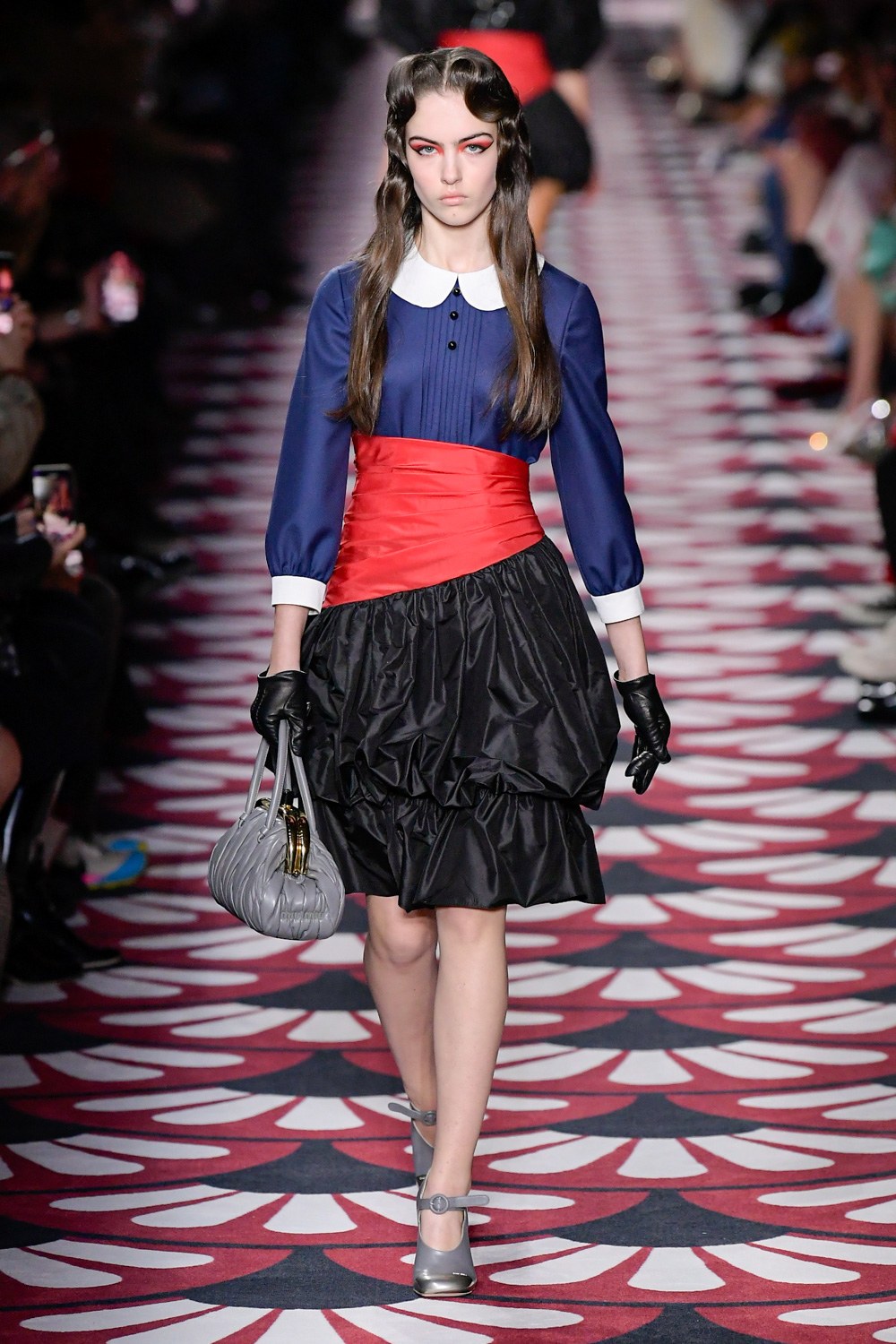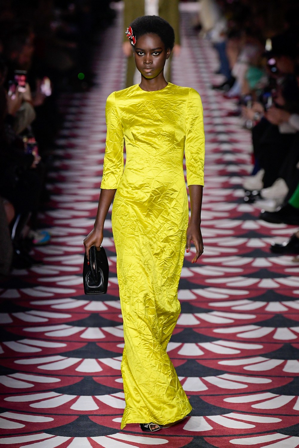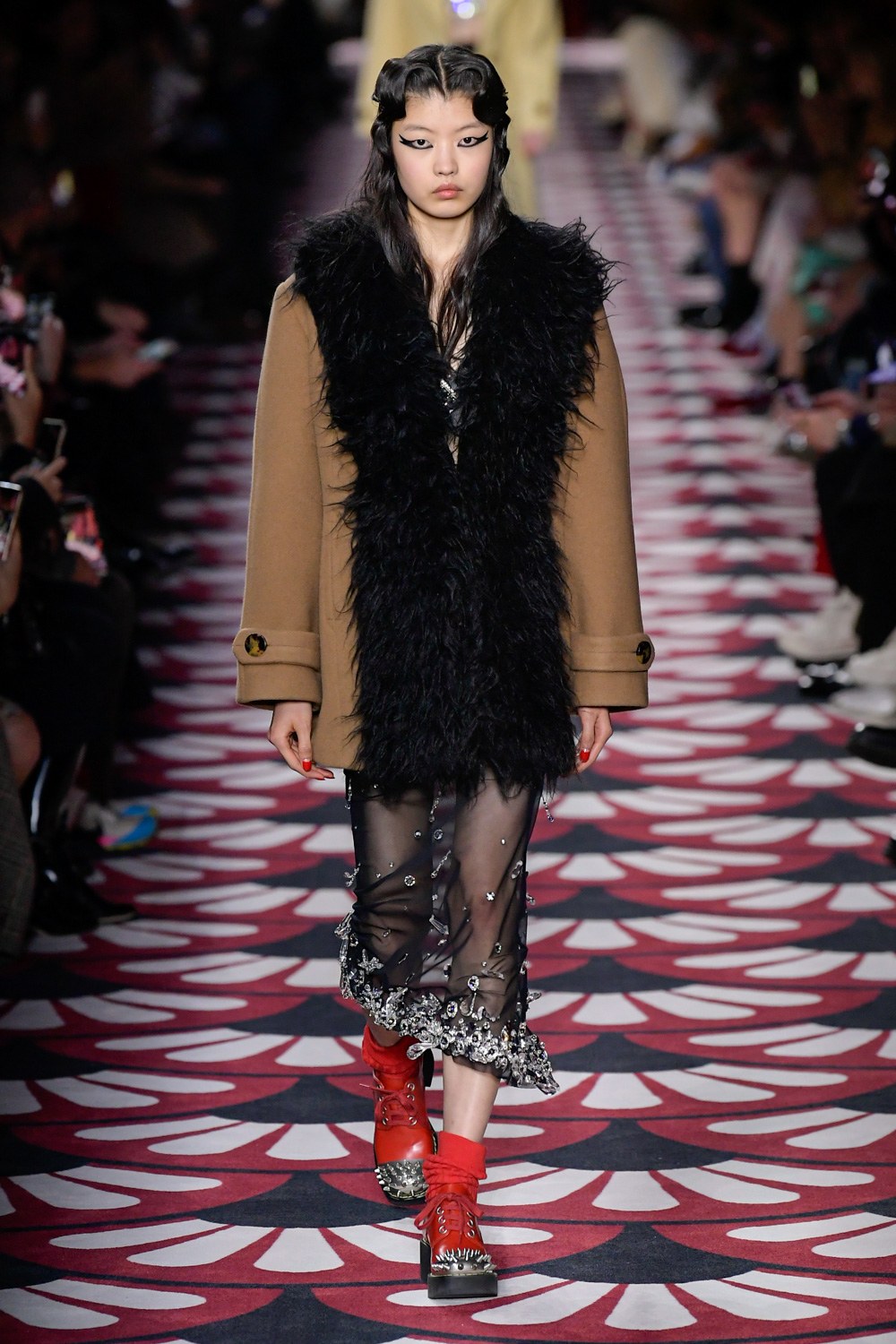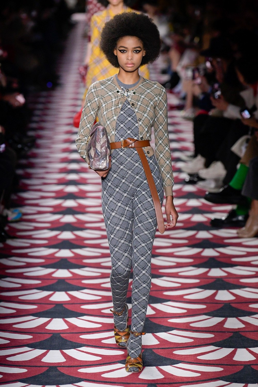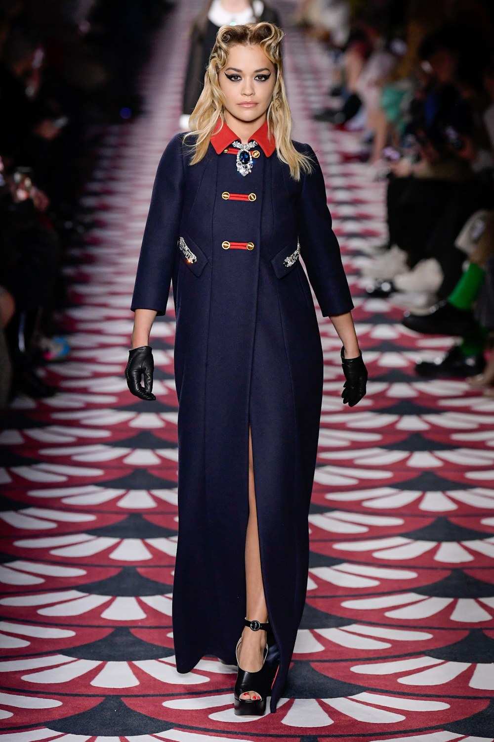 16-летняя звезда сериала "Эйфория" Сторм Рейд открыла показ в платье медного оттенка и суровом сером пальто, а певица Рита Ора появилась в пальто, напоминающем военный мундир периода Первой мировой войны. Однако общий нарратив осенней коллекции Миуччи Прады вовсе не такой тревожный. Несмотря на то что дизайнер обратилась к предвоенной моде 40-х, образы, представленные на показе в Париже, были по-девичьи нежными, чувственными и даже жизнерадостными. Обилие силуэтных костюмов в клетку сменялось леопардовыми пальто и юбками, а одежда из кожи - вещами пастельных оттенков.