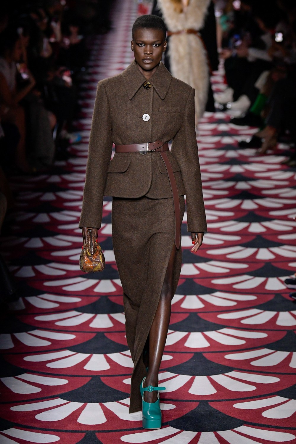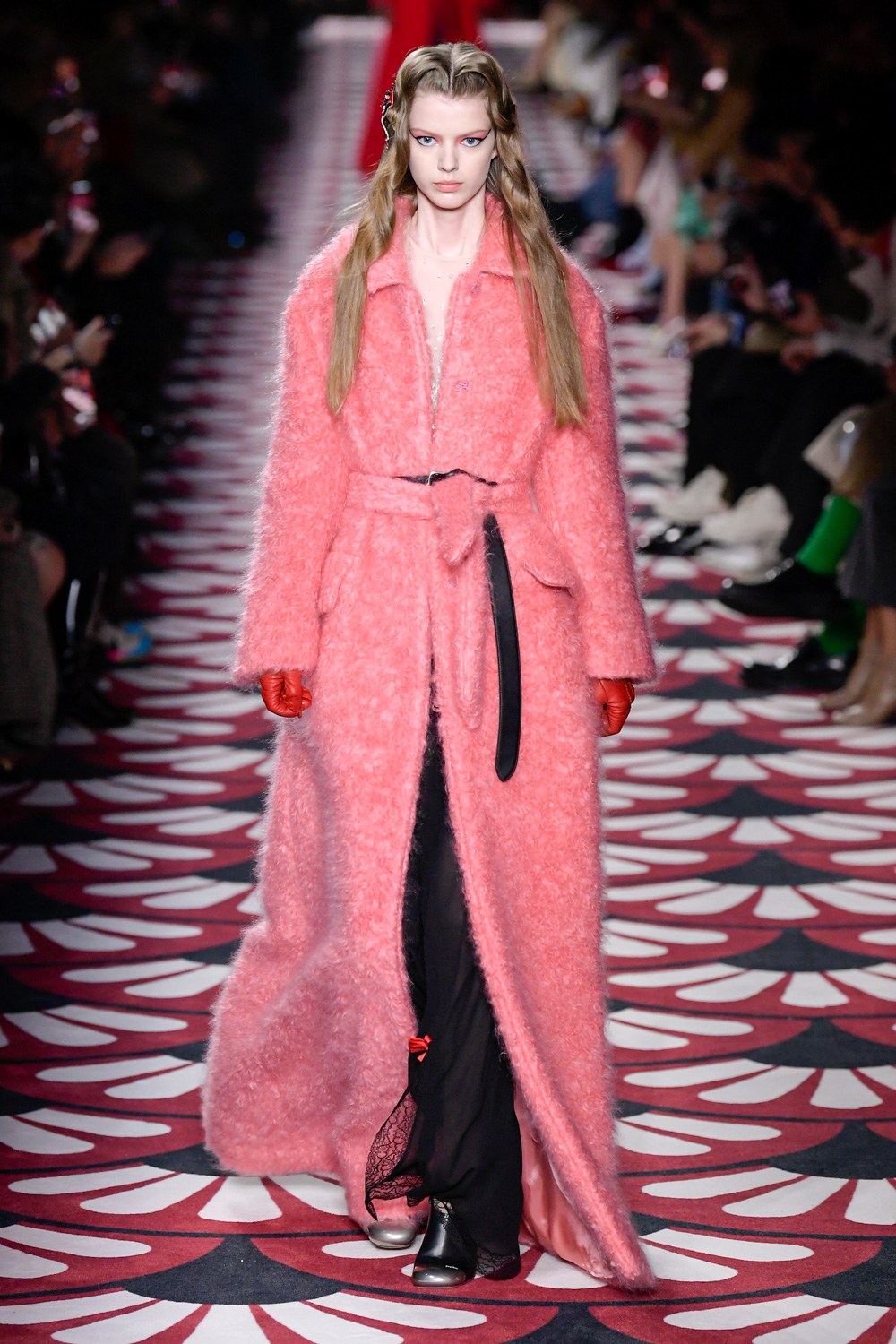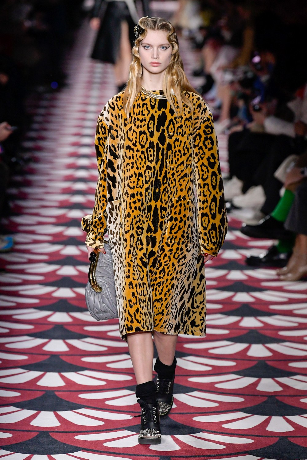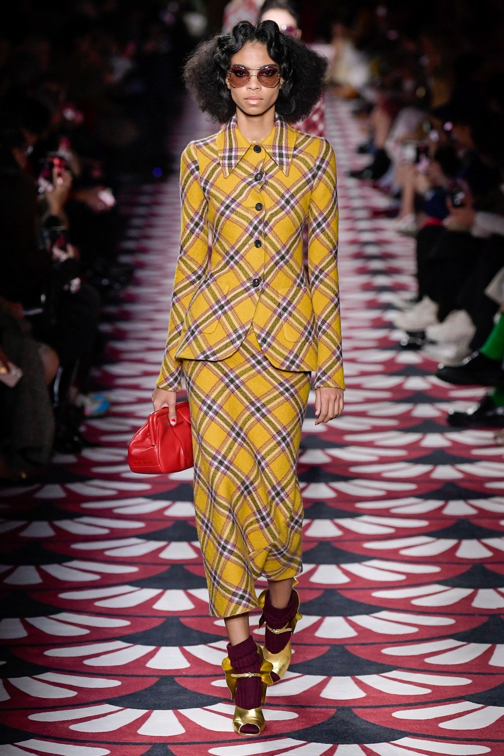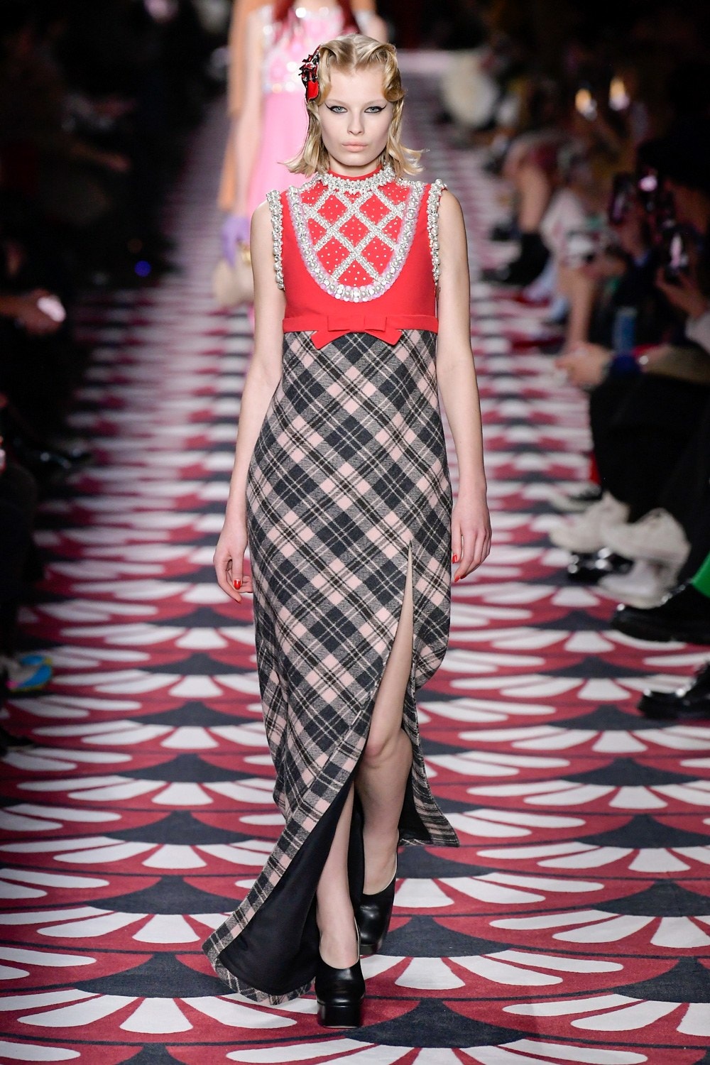 16-летняя звезда сериала "Эйфория" Сторм Рейд открыла показ в платье медного оттенка и суровом сером пальто, а певица Рита Ора появилась в пальто, напоминающем военный мундир периода Первой мировой войны. Однако общий нарратив осенней коллекции Миуччи Прады вовсе не такой тревожный. Несмотря на то что дизайнер обратилась к предвоенной моде 40-х, образы, представленные на показе в Париже, были по-девичьи нежными, чувственными и даже жизнерадостными. Обилие силуэтных костюмов в клетку сменялось леопардовыми пальто и юбками, а одежда из кожи - вещами пастельных оттенков.