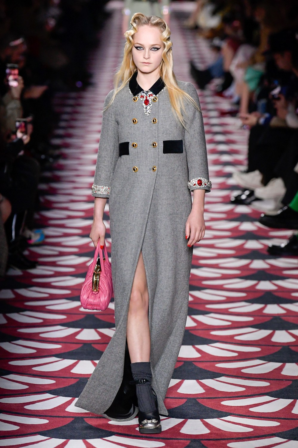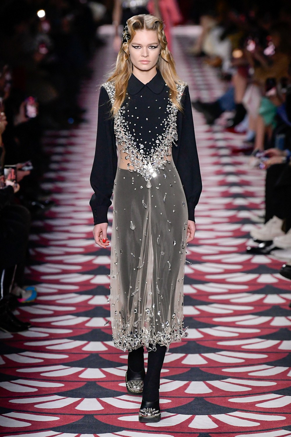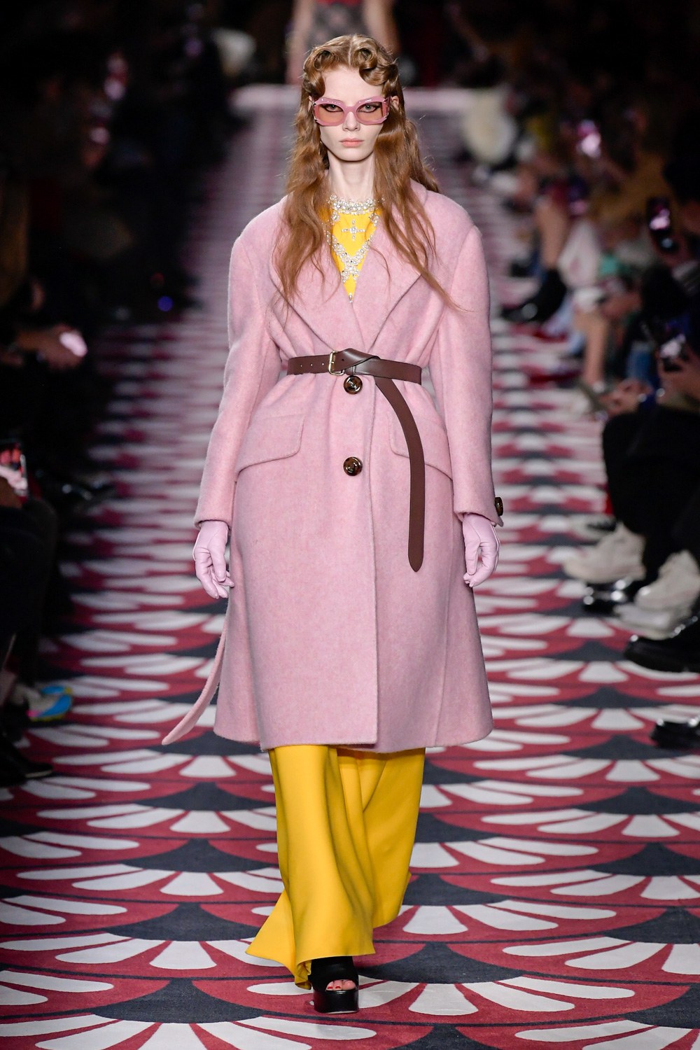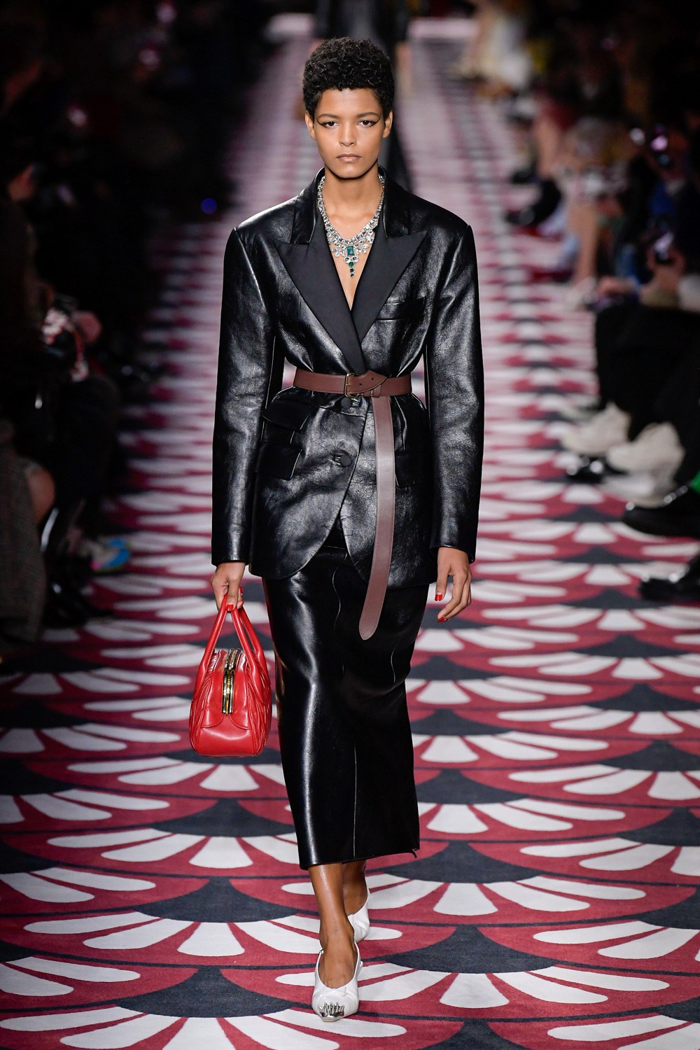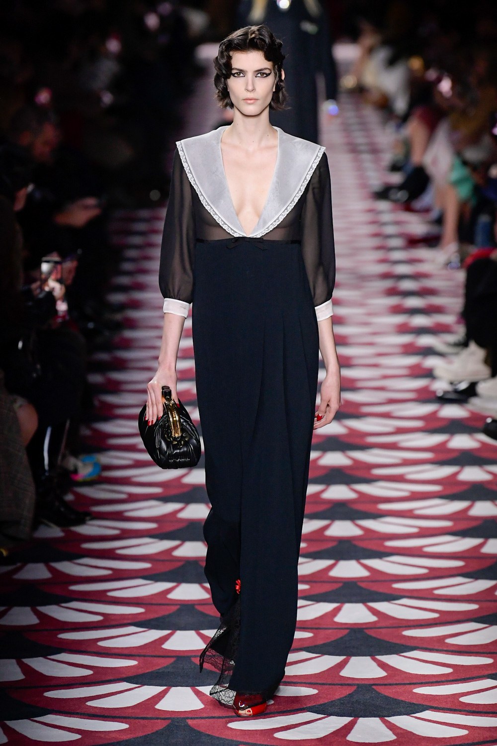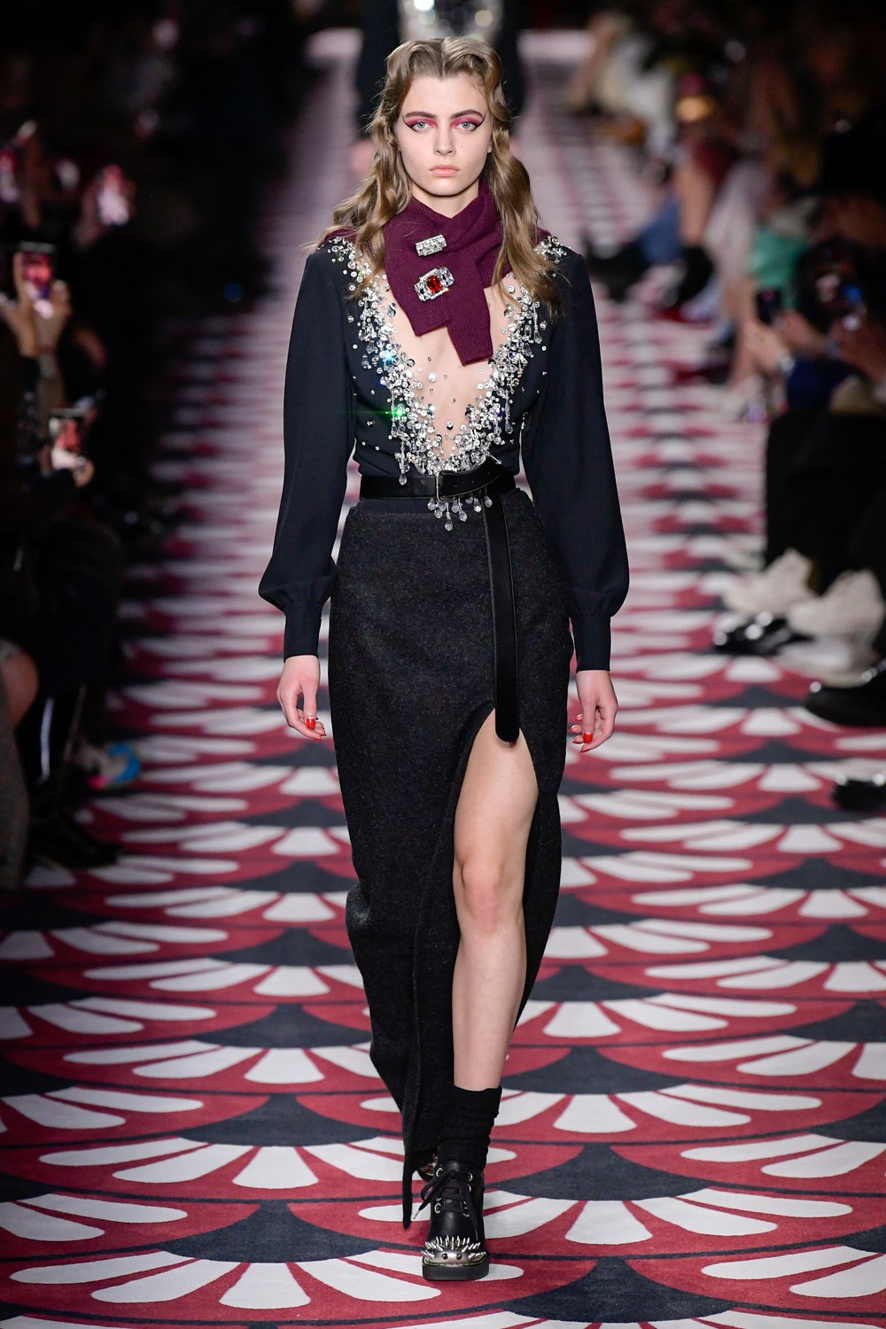 16-летняя звезда сериала "Эйфория" Сторм Рейд открыла показ в платье медного оттенка и суровом сером пальто, а певица Рита Ора появилась в пальто, напоминающем военный мундир периода Первой мировой войны. Однако общий нарратив осенней коллекции Миуччи Прады вовсе не такой тревожный. Несмотря на то что дизайнер обратилась к предвоенной моде 40-х, образы, представленные на показе в Париже, были по-девичьи нежными, чувственными и даже жизнерадостными. Обилие силуэтных костюмов в клетку сменялось леопардовыми пальто и юбками, а одежда из кожи - вещами пастельных оттенков.