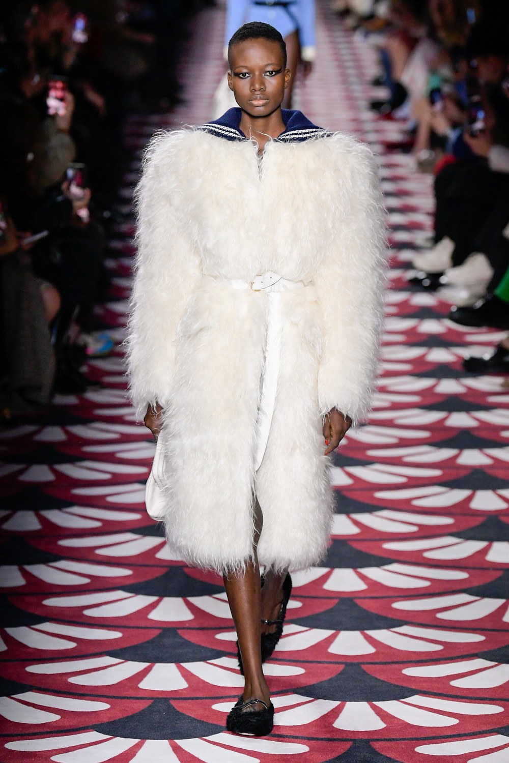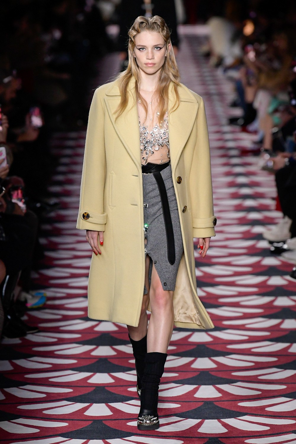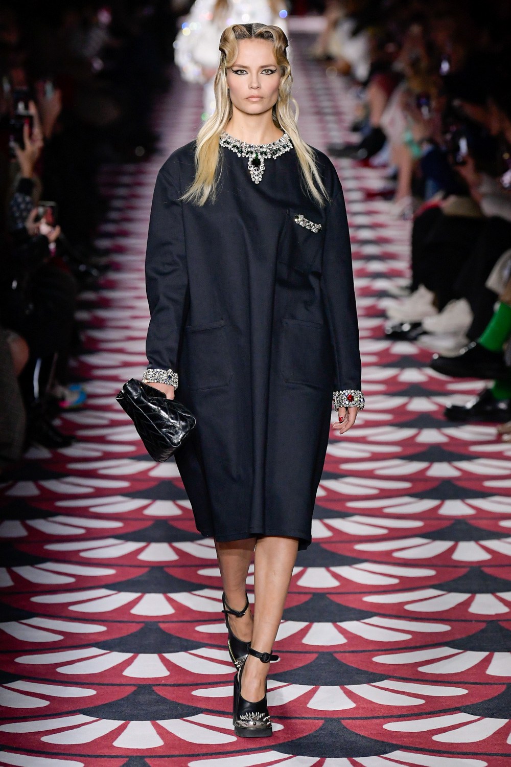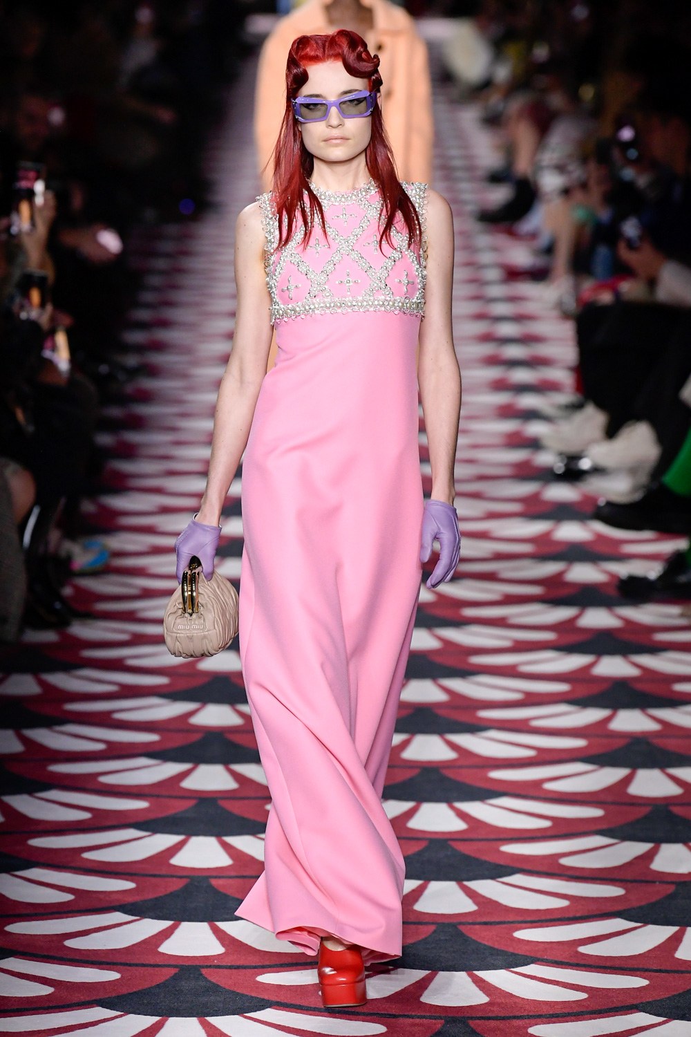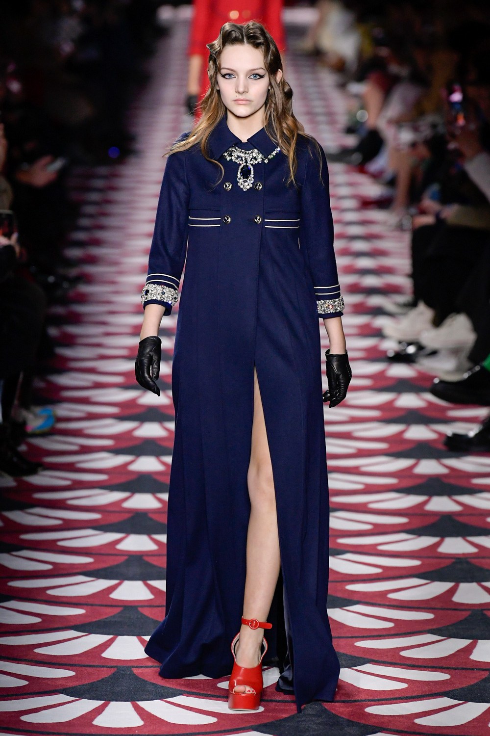 16-летняя звезда сериала "Эйфория" Сторм Рейд открыла показ в платье медного оттенка и суровом сером пальто, а певица Рита Ора появилась в пальто, напоминающем военный мундир периода Первой мировой войны. Однако общий нарратив осенней коллекции Миуччи Прады вовсе не такой тревожный. Несмотря на то что дизайнер обратилась к предвоенной моде 40-х, образы, представленные на показе в Париже, были по-девичьи нежными, чувственными и даже жизнерадостными. Обилие силуэтных костюмов в клетку сменялось леопардовыми пальто и юбками, а одежда из кожи - вещами пастельных оттенков.