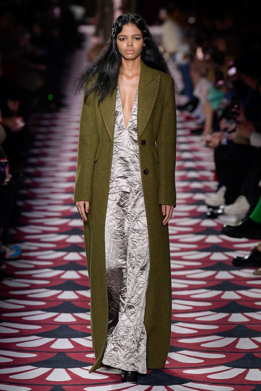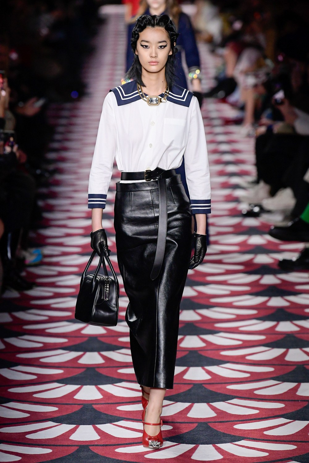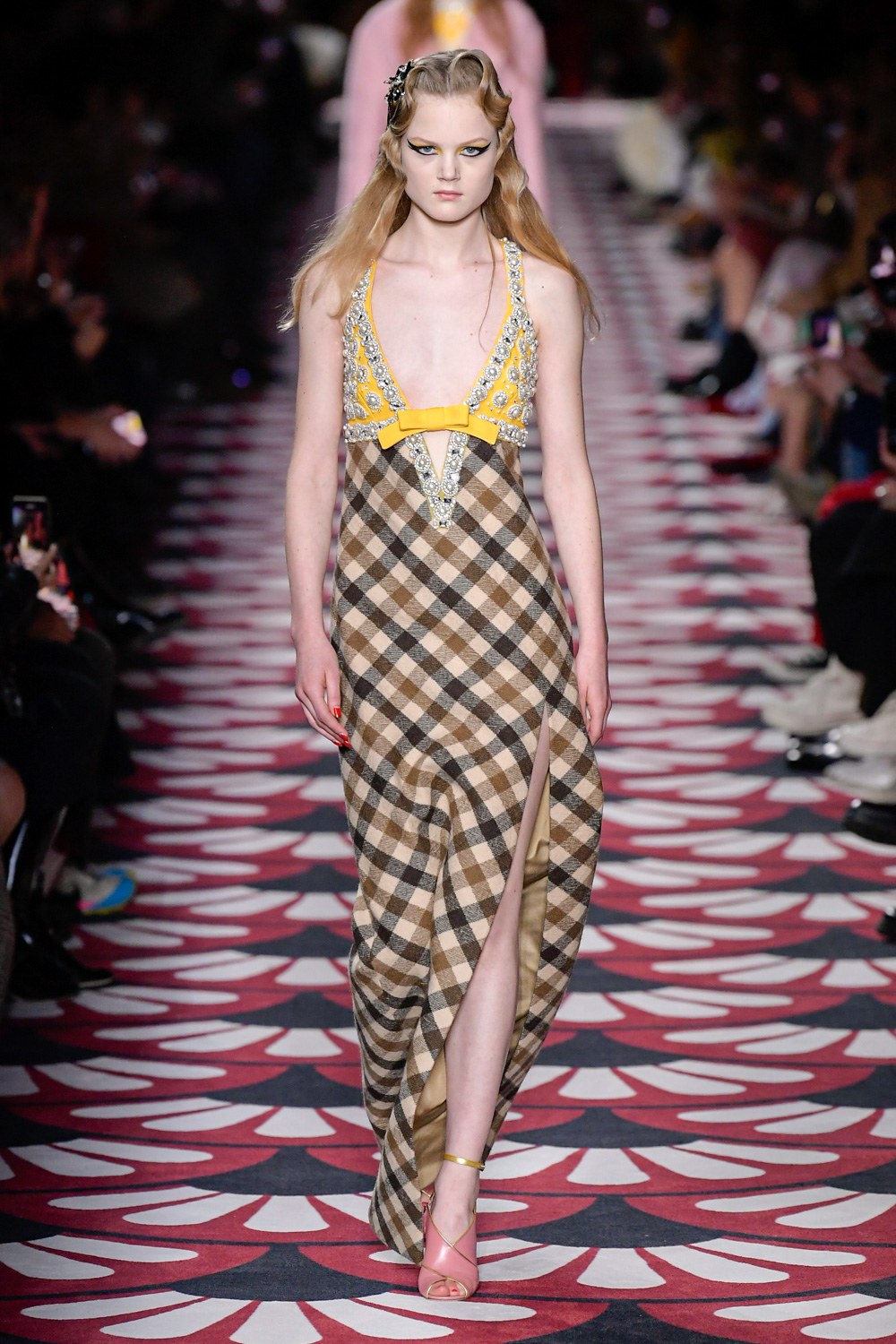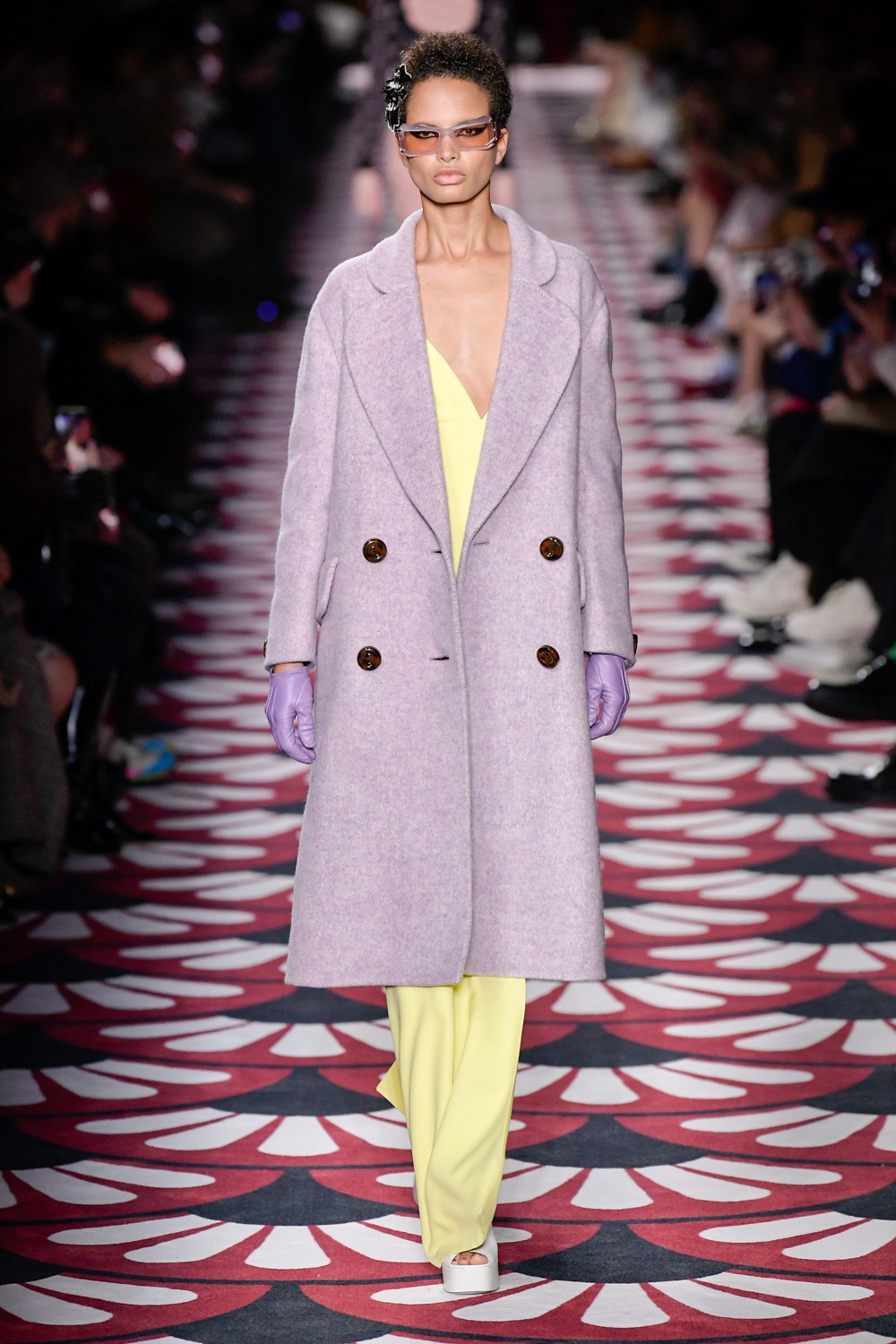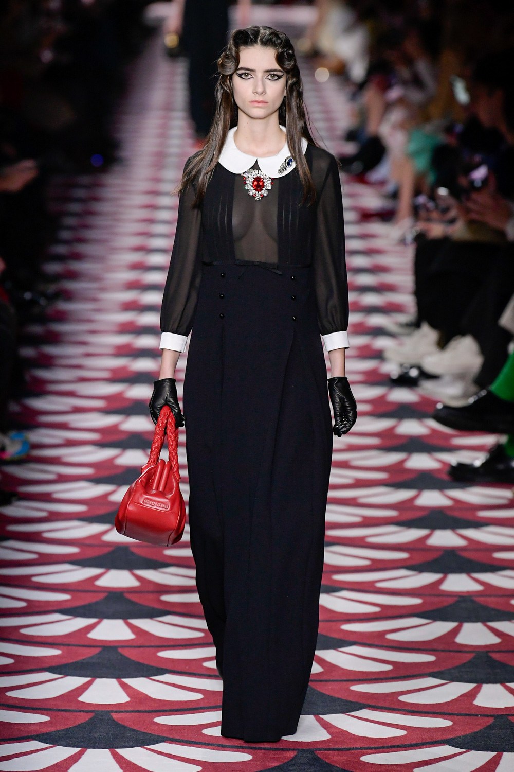 16-летняя звезда сериала "Эйфория" Сторм Рейд открыла показ в платье медного оттенка и суровом сером пальто, а певица Рита Ора появилась в пальто, напоминающем военный мундир периода Первой мировой войны. Однако общий нарратив осенней коллекции Миуччи Прады вовсе не такой тревожный. Несмотря на то что дизайнер обратилась к предвоенной моде 40-х, образы, представленные на показе в Париже, были по-девичьи нежными, чувственными и даже жизнерадостными. Обилие силуэтных костюмов в клетку сменялось леопардовыми пальто и юбками, а одежда из кожи - вещами пастельных оттенков.