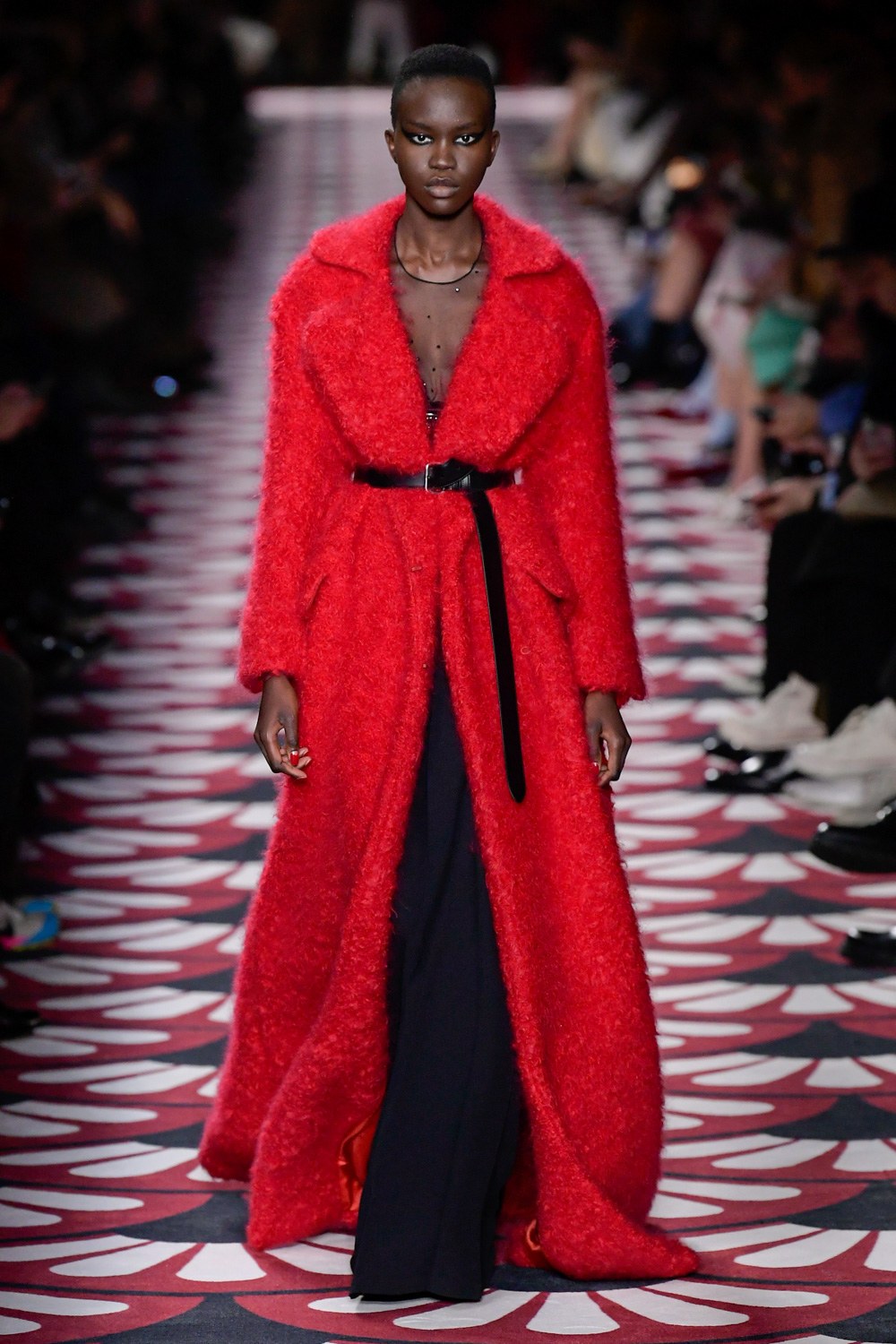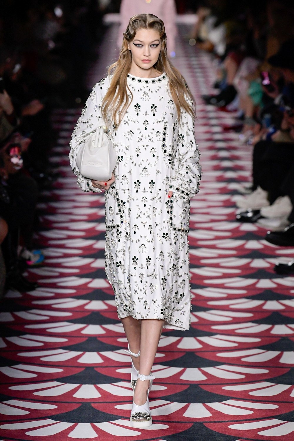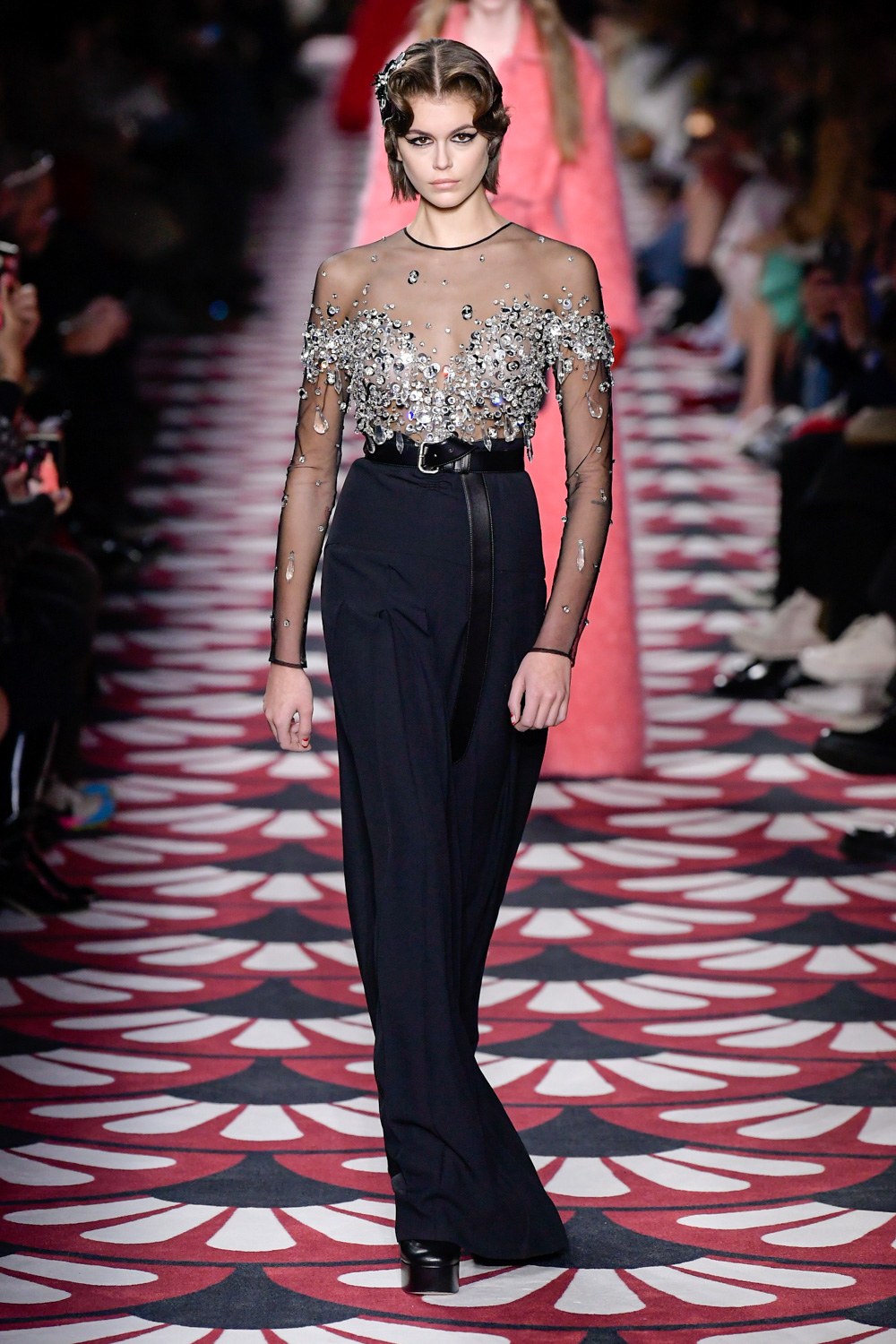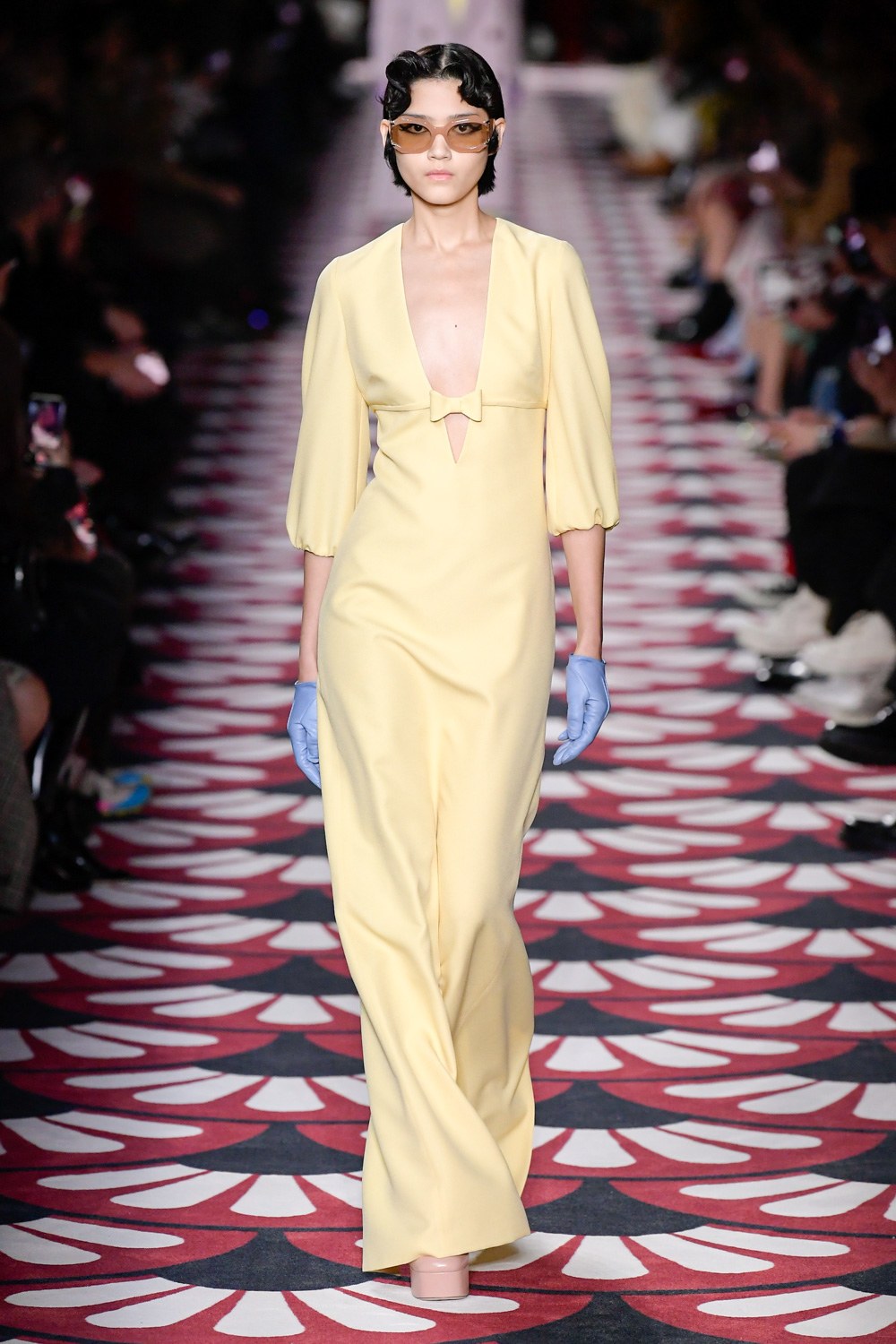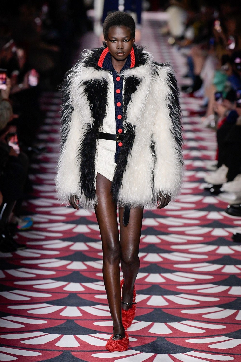 16-летняя звезда сериала "Эйфория" Сторм Рейд открыла показ в платье медного оттенка и суровом сером пальто, а певица Рита Ора появилась в пальто, напоминающем военный мундир периода Первой мировой войны. Однако общий нарратив осенней коллекции Миуччи Прады вовсе не такой тревожный. Несмотря на то что дизайнер обратилась к предвоенной моде 40-х, образы, представленные на показе в Париже, были по-девичьи нежными, чувственными и даже жизнерадостными. Обилие силуэтных костюмов в клетку сменялось леопардовыми пальто и юбками, а одежда из кожи - вещами пастельных оттенков.