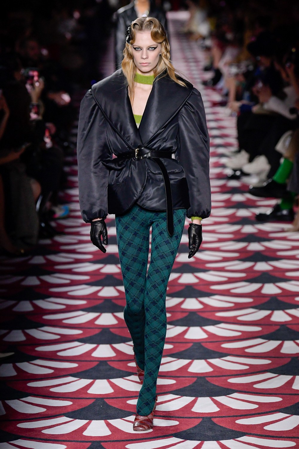Ключевые моменты: дутые пуховики и узкие пальто в клетку, платья и юбки-карандаши из кожи, блузы с "матросскими" воротами, вечерние платья с контрастными вставками и вышивкой камнями, платья из тафты с рукавами-буфами, спортивные свитеры-боди.