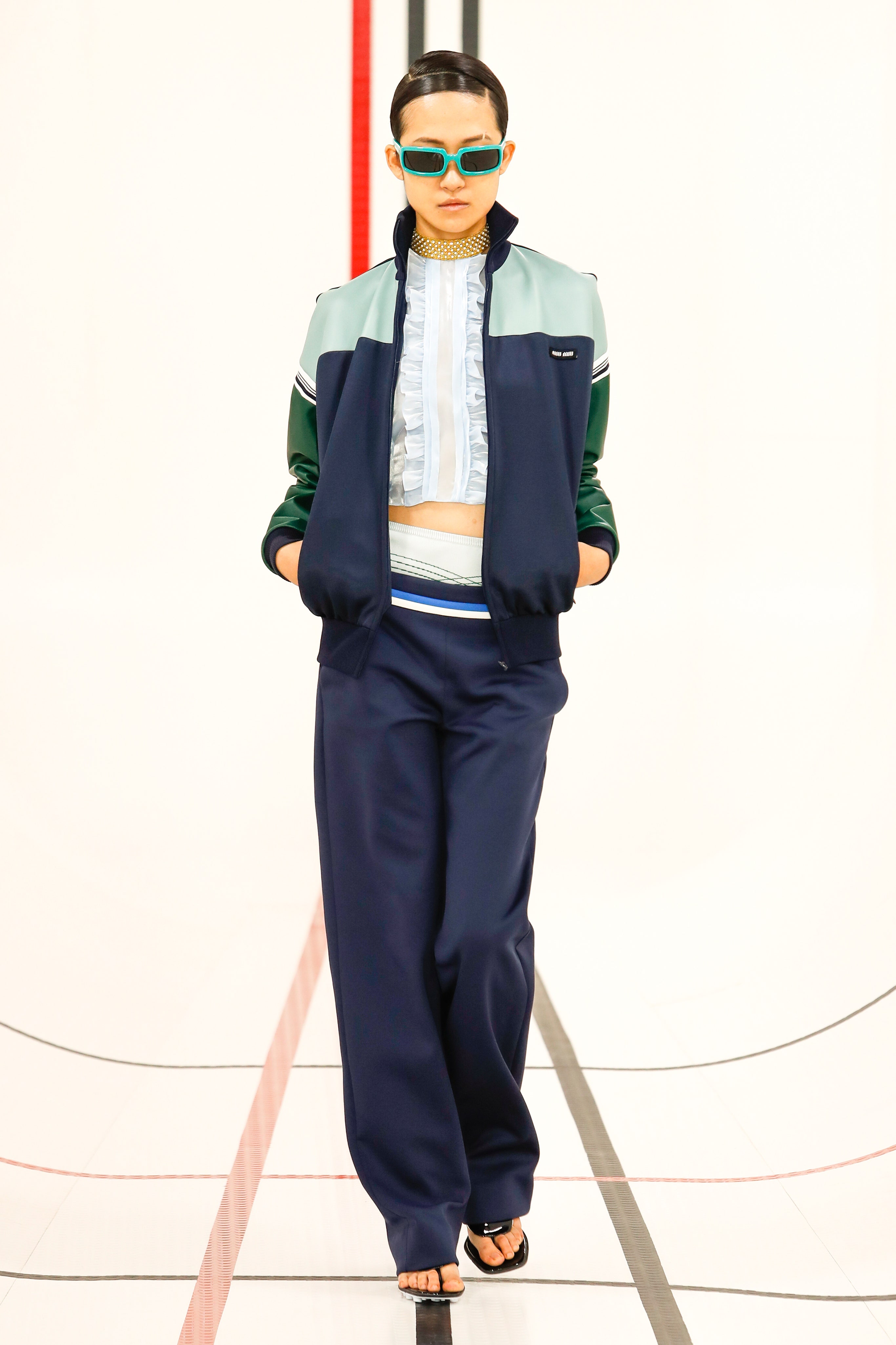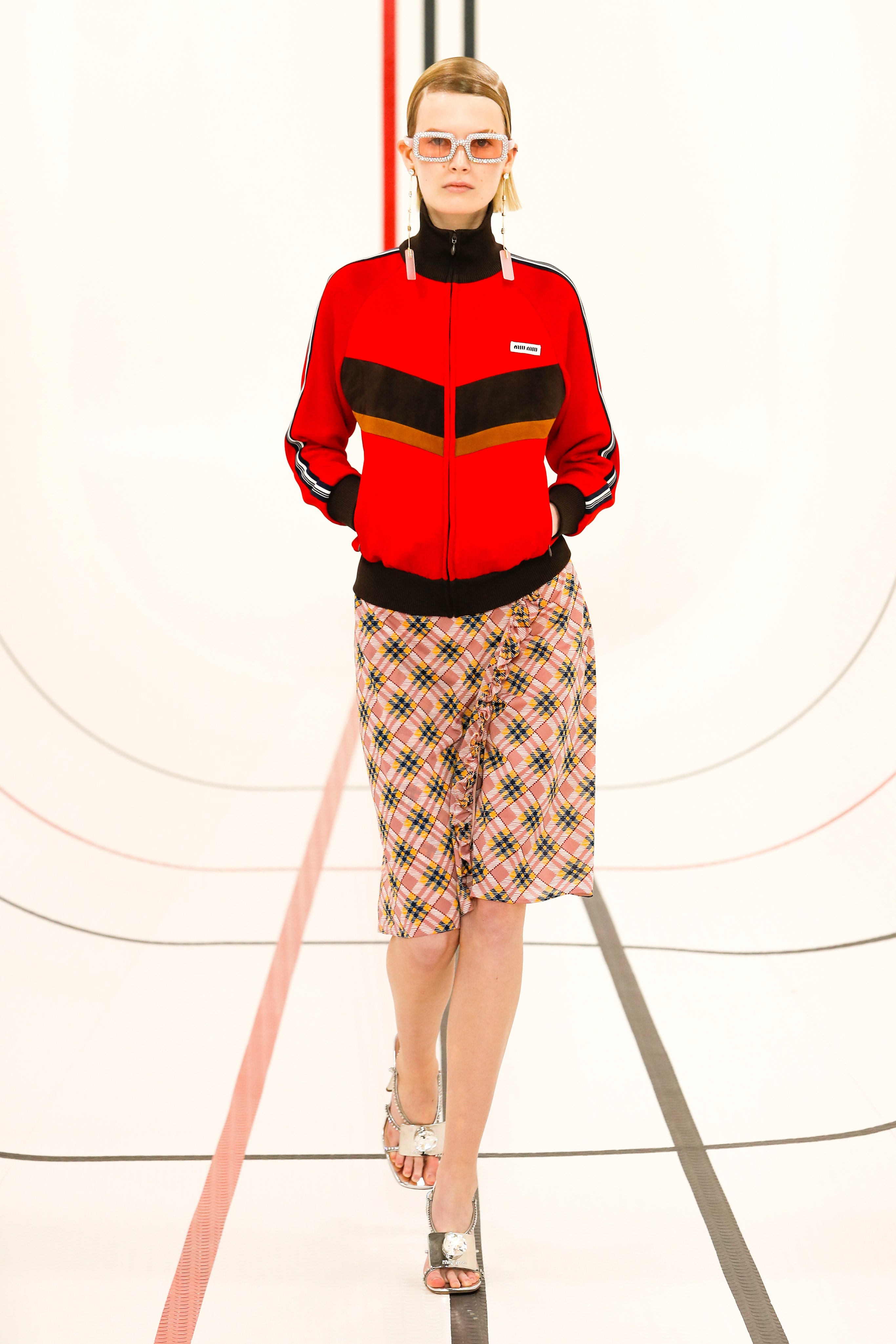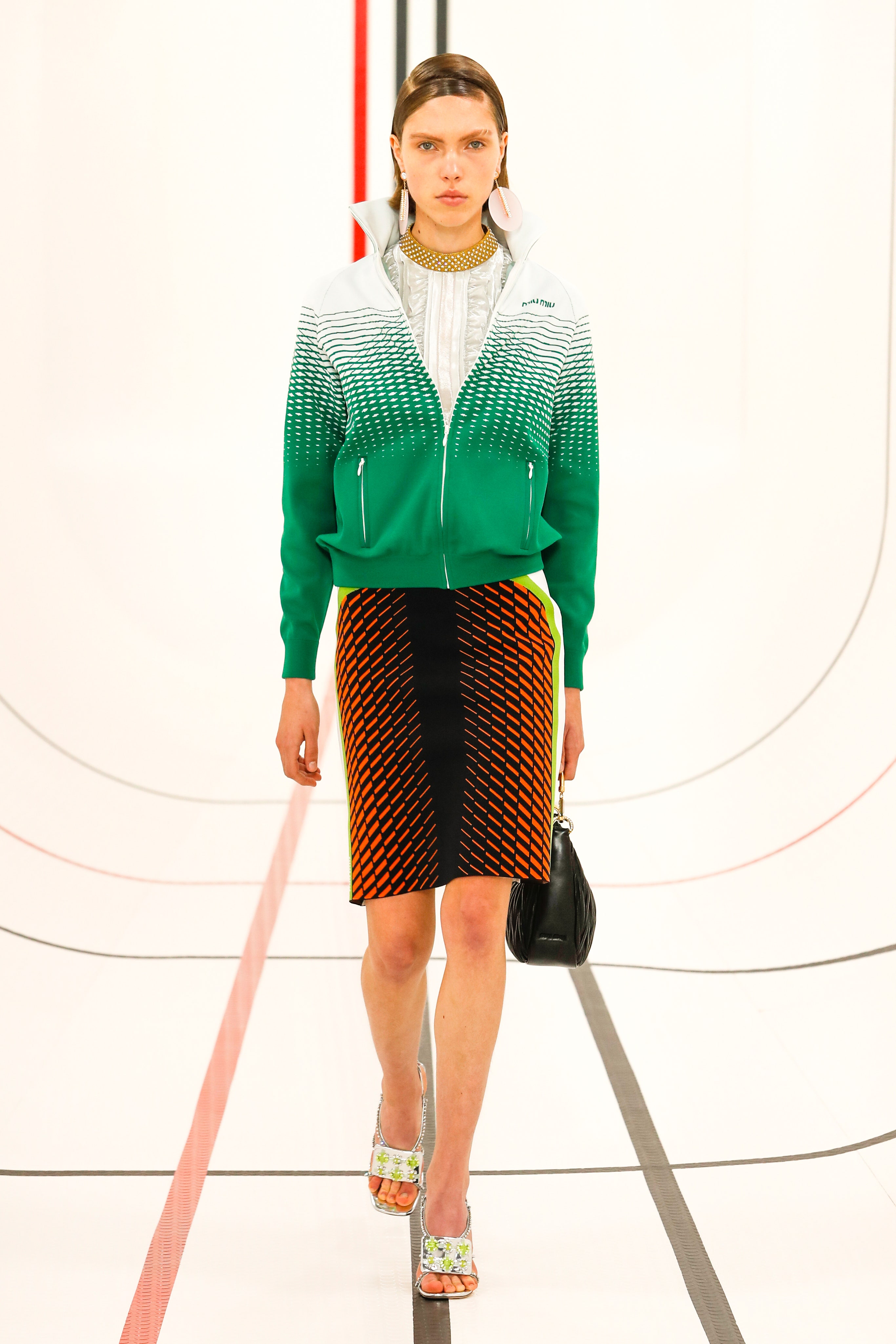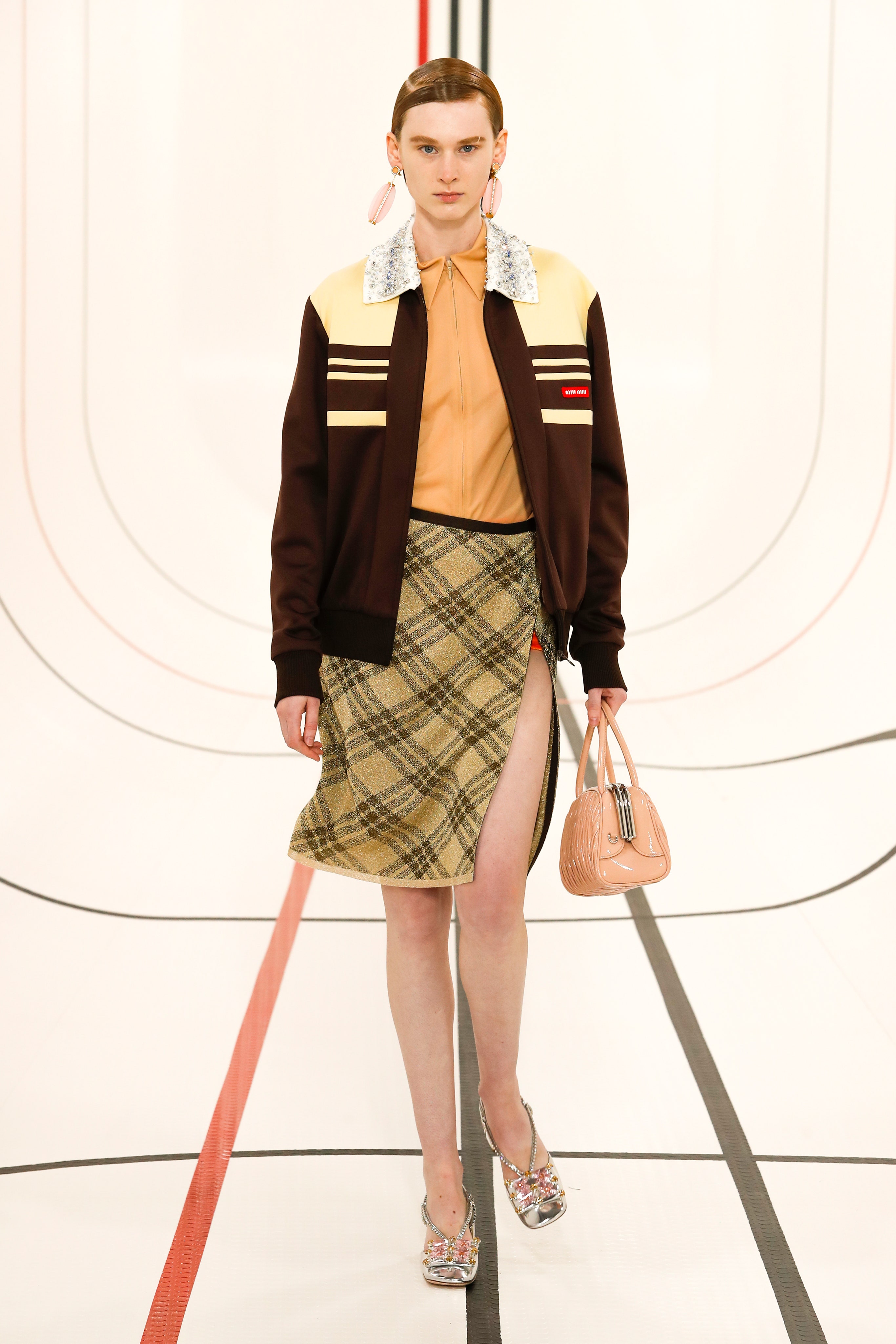 В коллекции есть блейзеры с контрастными кокетками, пальто строгого кроя с отложными воротничками в лучших традициях бренда, но дополненные спортивными полосами, платья-майки и трикотажные топы, будто созданные для активных тренировок. Спортивные олимпийки Прада предлагает носить с юбками миди, невесомые блузы в рюшах — вместе с тренировочными брюками, да и вообще, вместо классического брючного костюма — носить элегантный спортивный, надевая под него белоснежный топ с манишкой. Аккуратные рубашки в клетку, куртки для боулинга и строгие воротники навевают мысли о школьной форме и спортивных командах престижных колледжей.