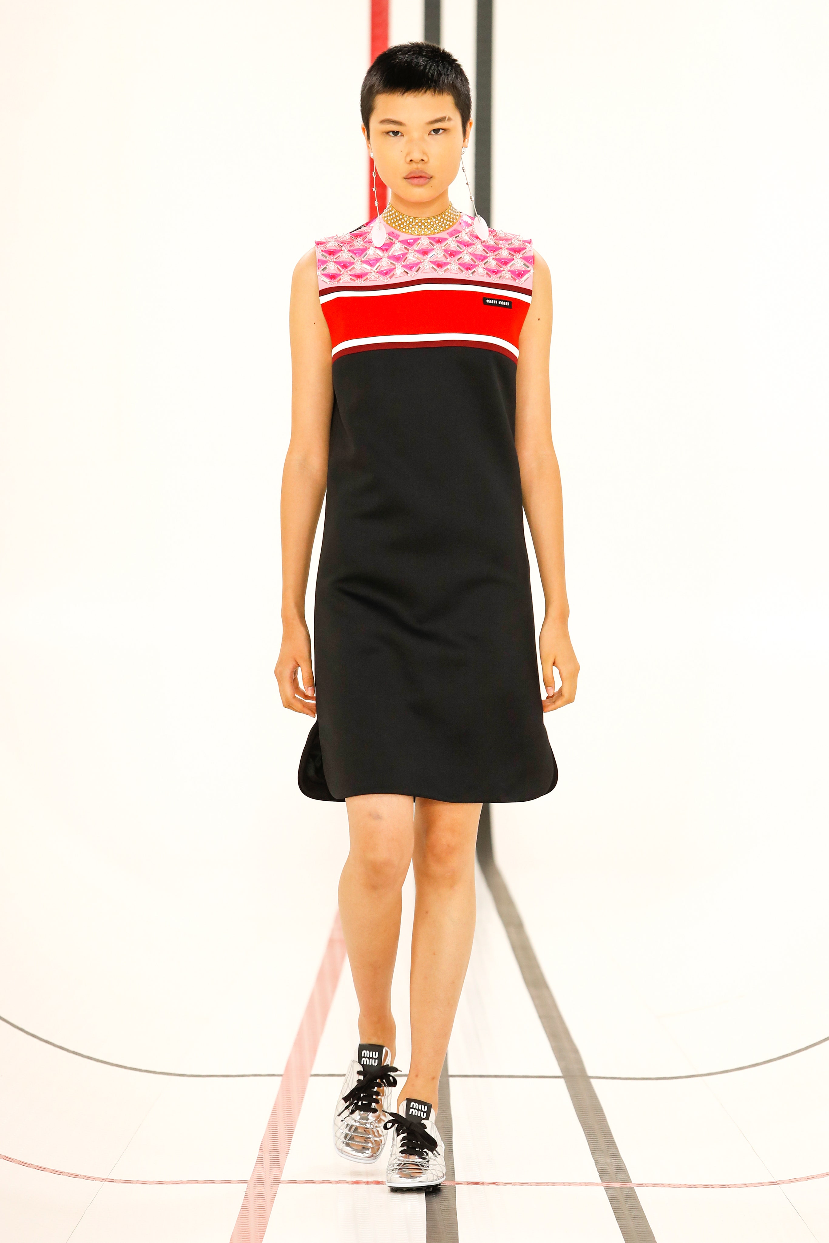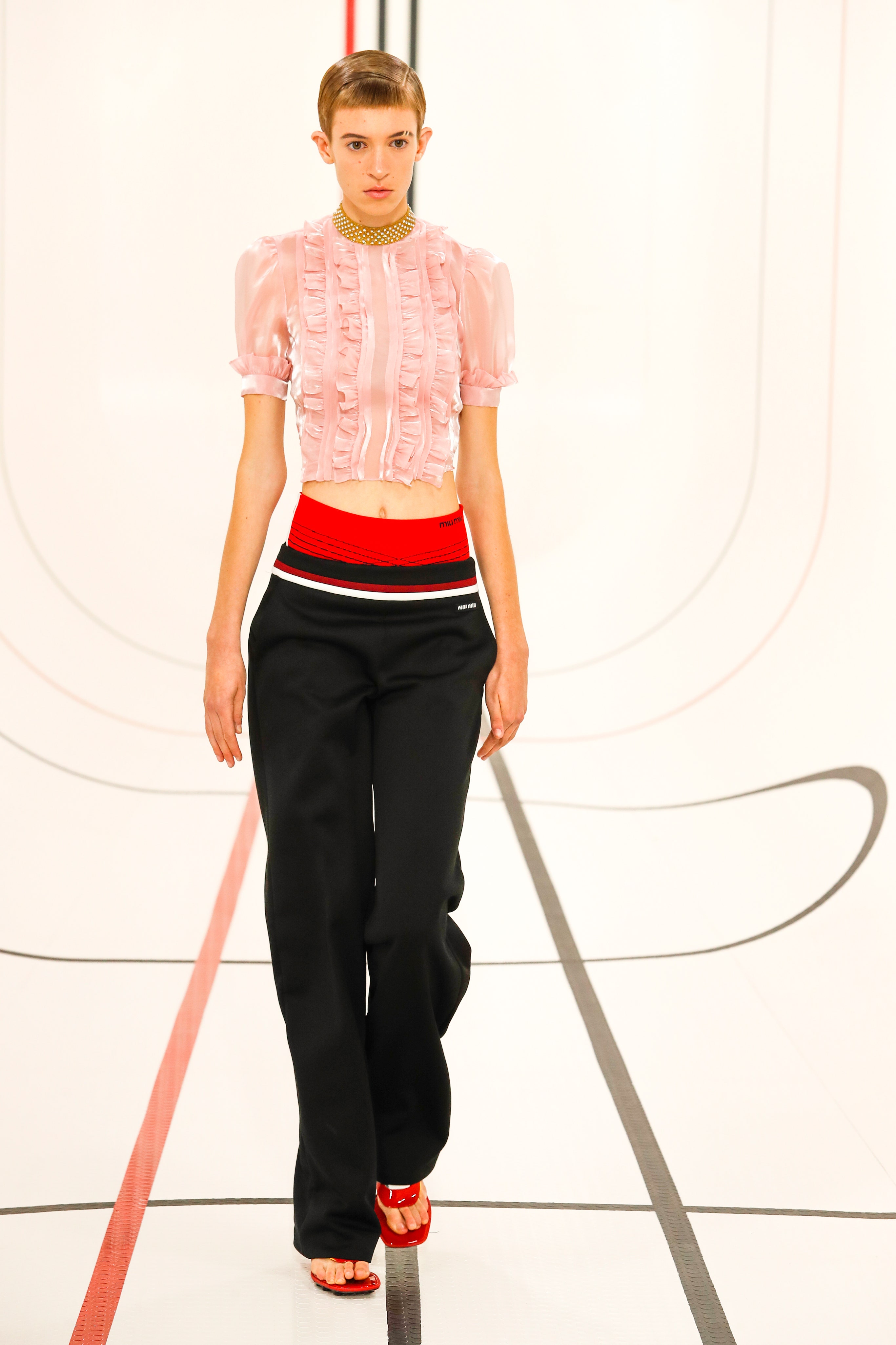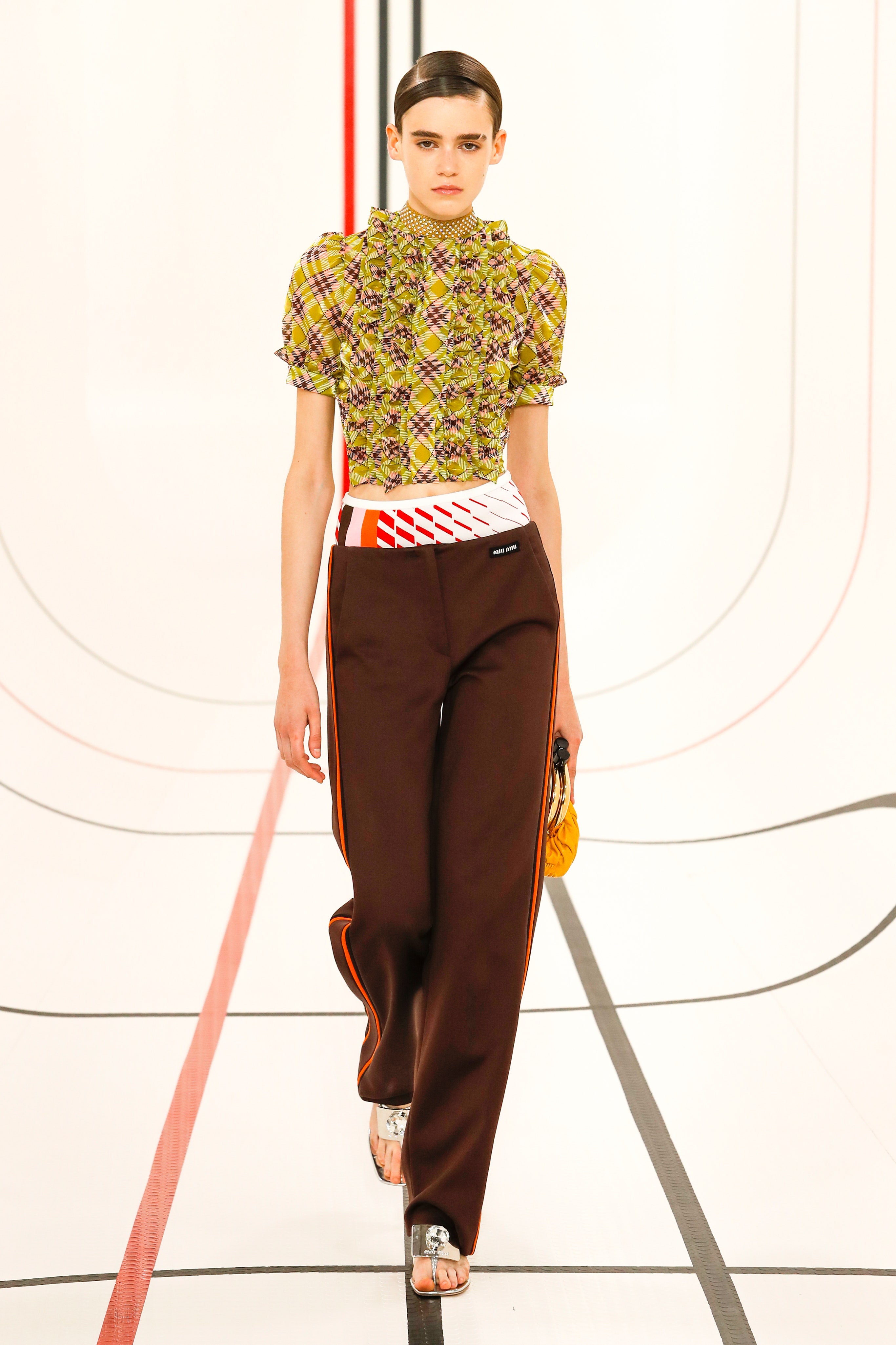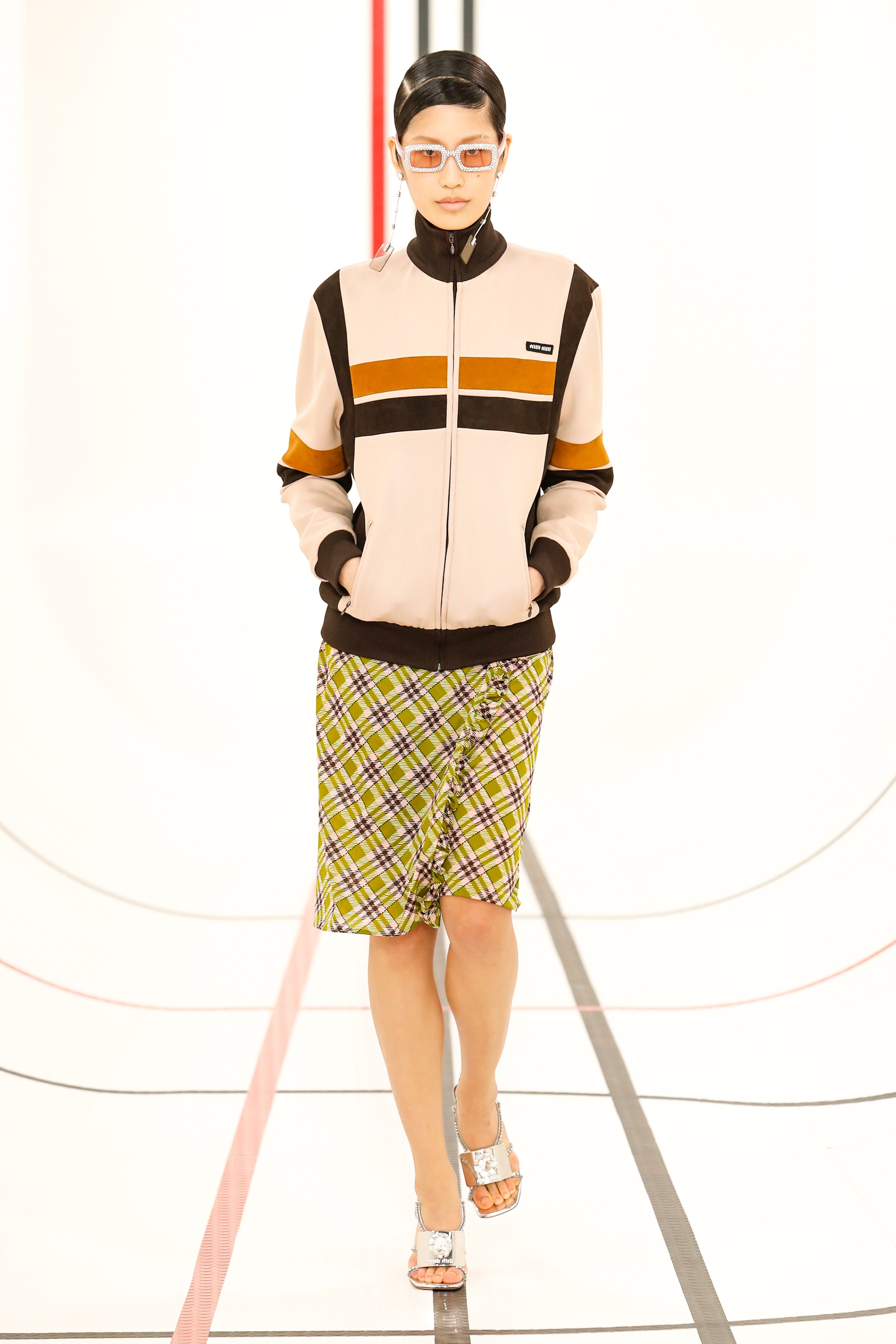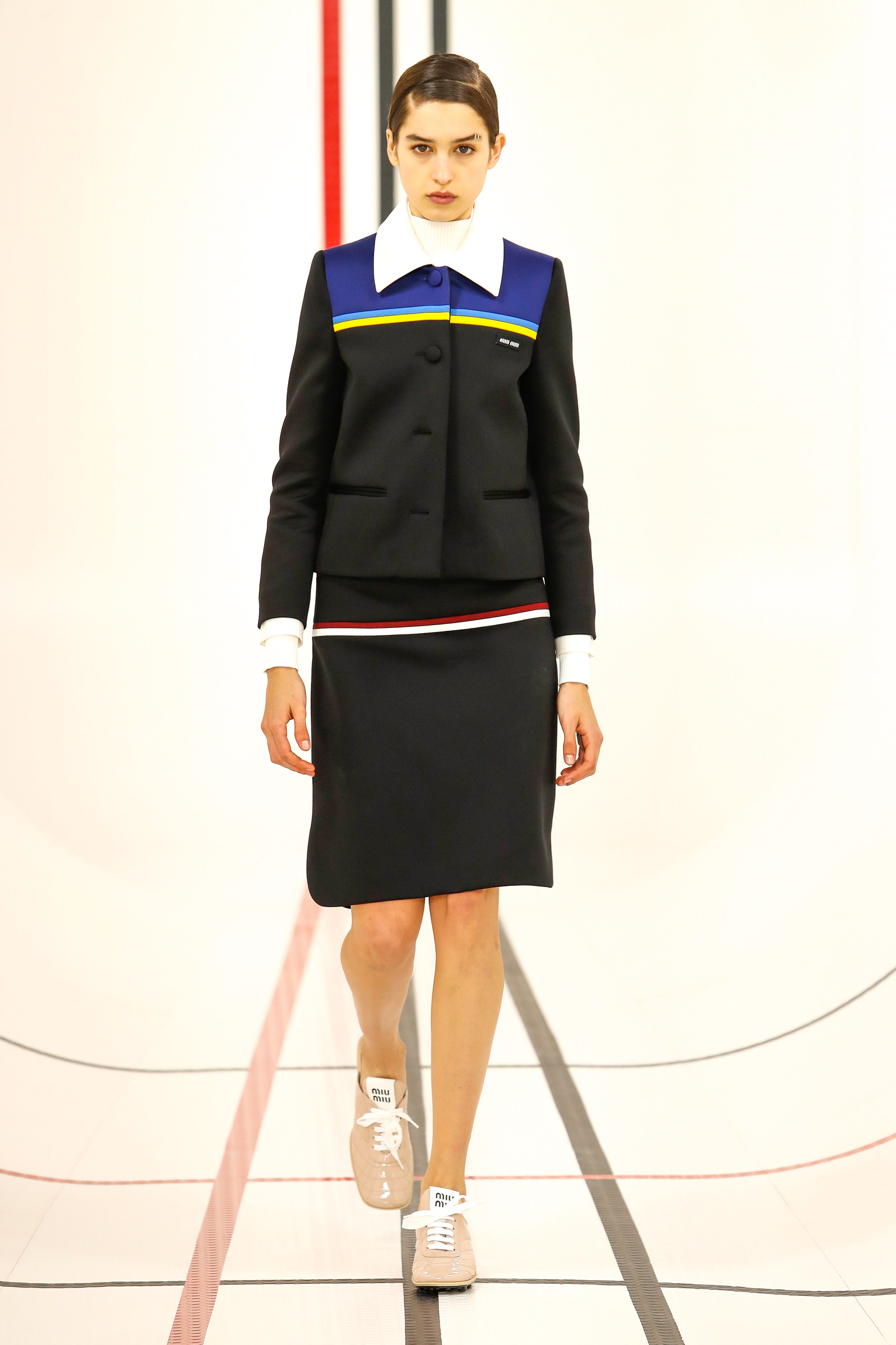 В коллекции есть блейзеры с контрастными кокетками, пальто строгого кроя с отложными воротничками в лучших традициях бренда, но дополненные спортивными полосами, платья-майки и трикотажные топы, будто созданные для активных тренировок. Спортивные олимпийки Прада предлагает носить с юбками миди, невесомые блузы в рюшах — вместе с тренировочными брюками, да и вообще, вместо классического брючного костюма — носить элегантный спортивный, надевая под него белоснежный топ с манишкой. Аккуратные рубашки в клетку, куртки для боулинга и строгие воротники навевают мысли о школьной форме и спортивных командах престижных колледжей.