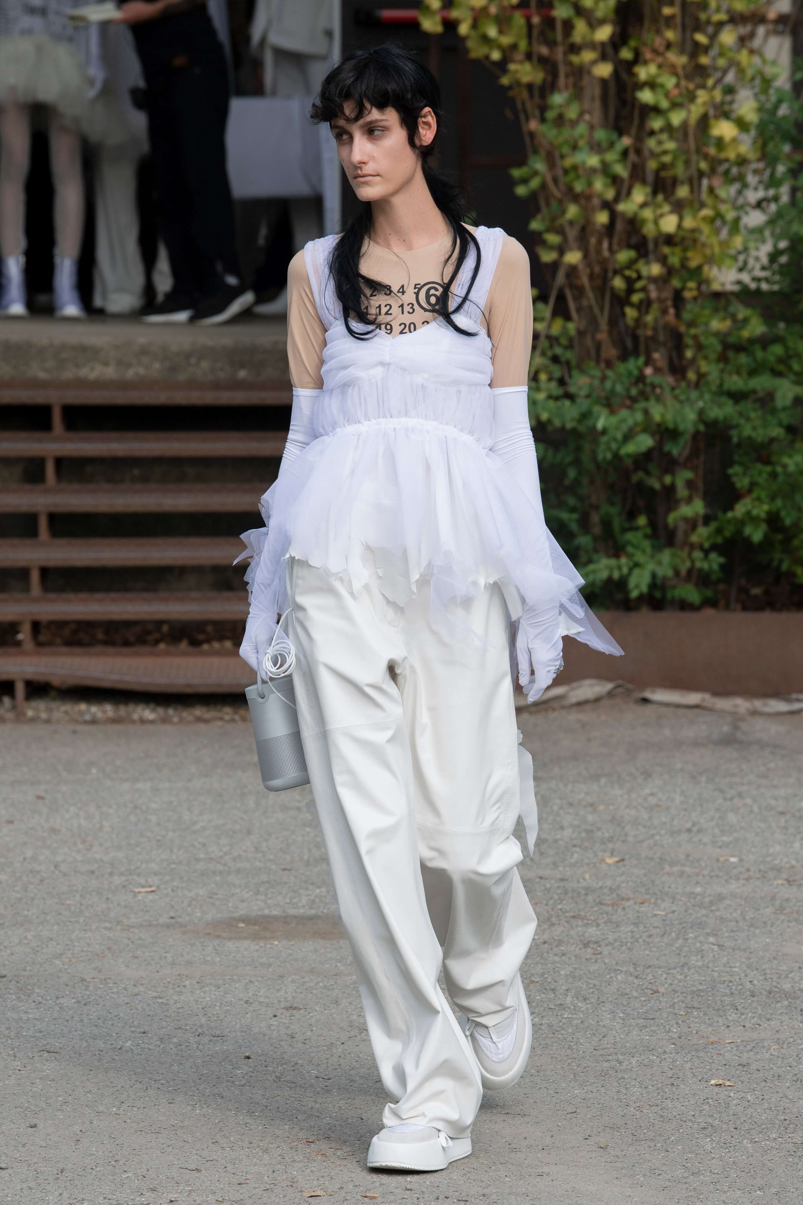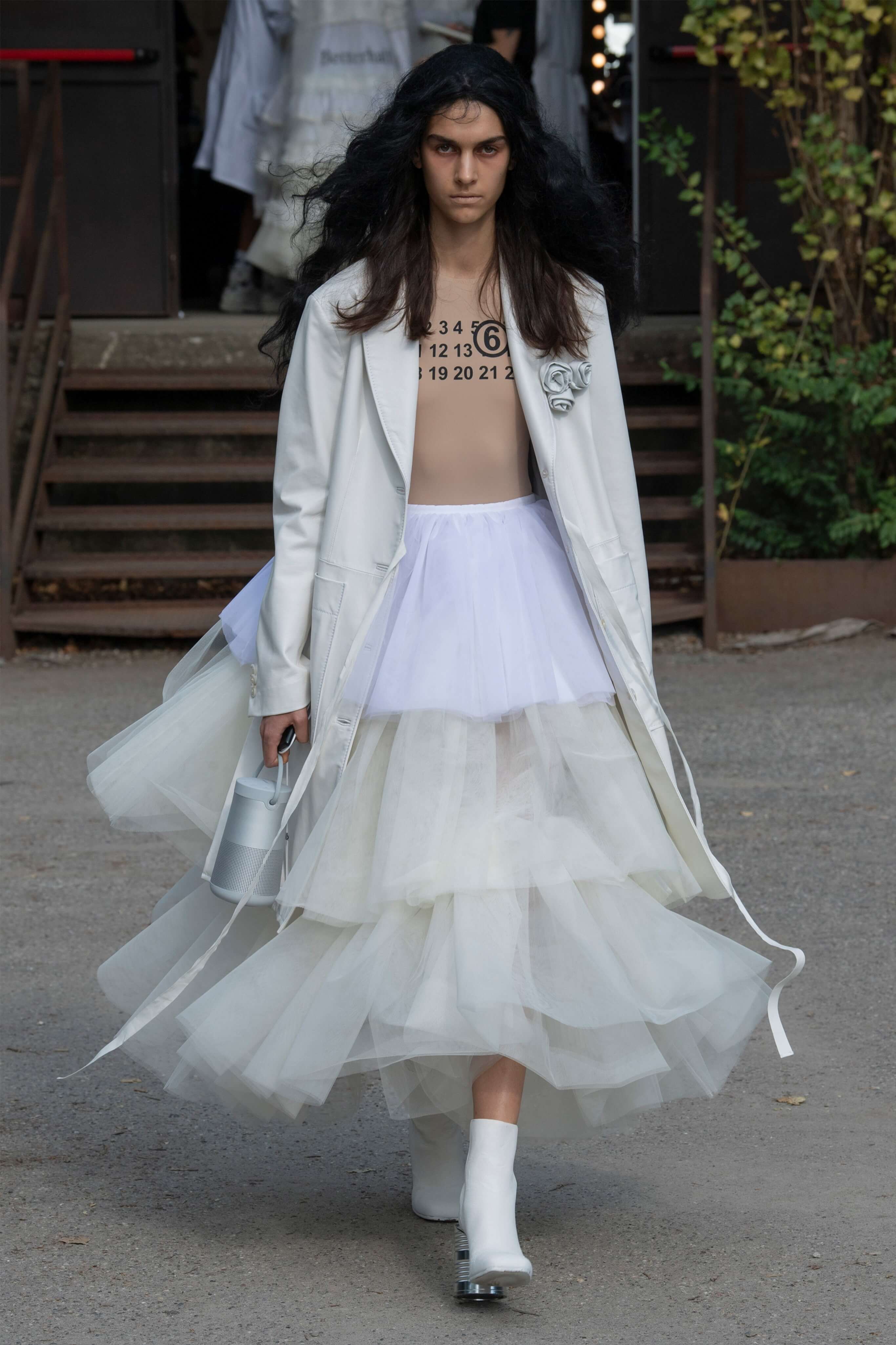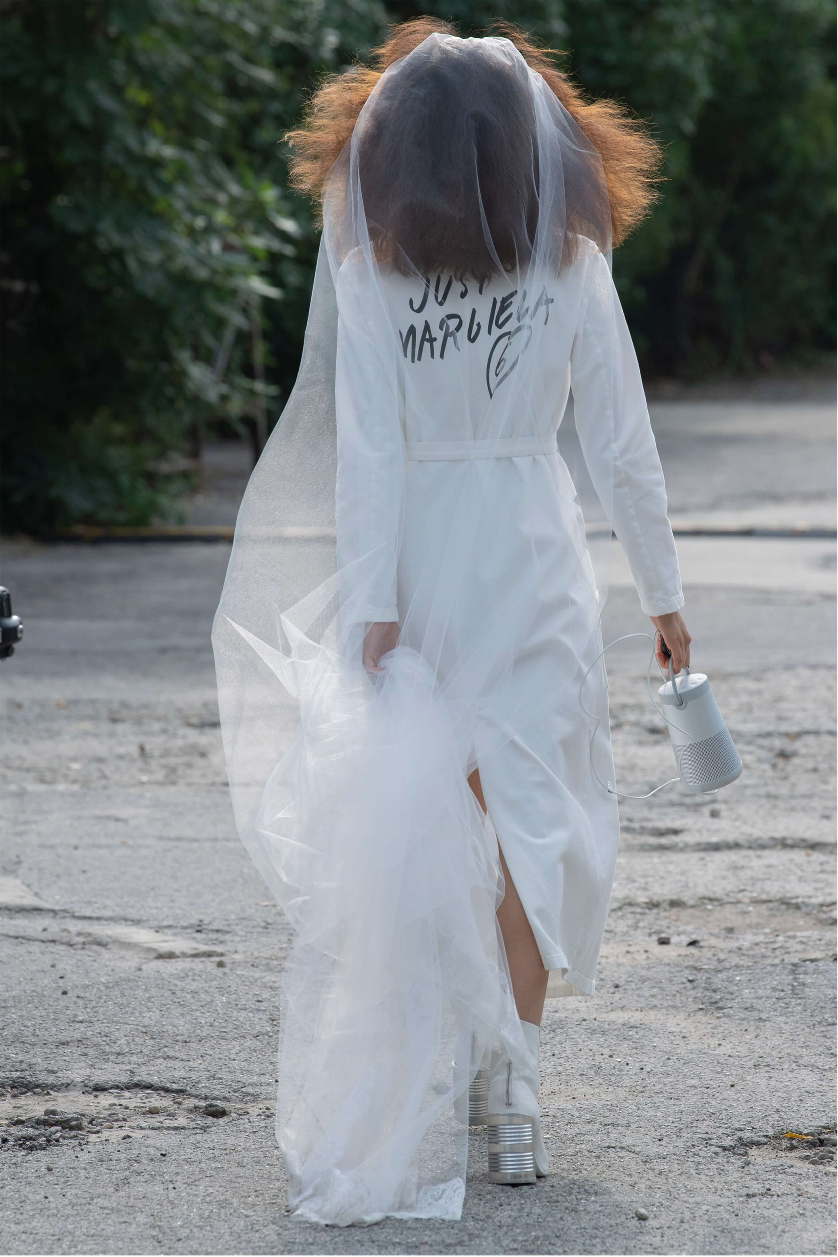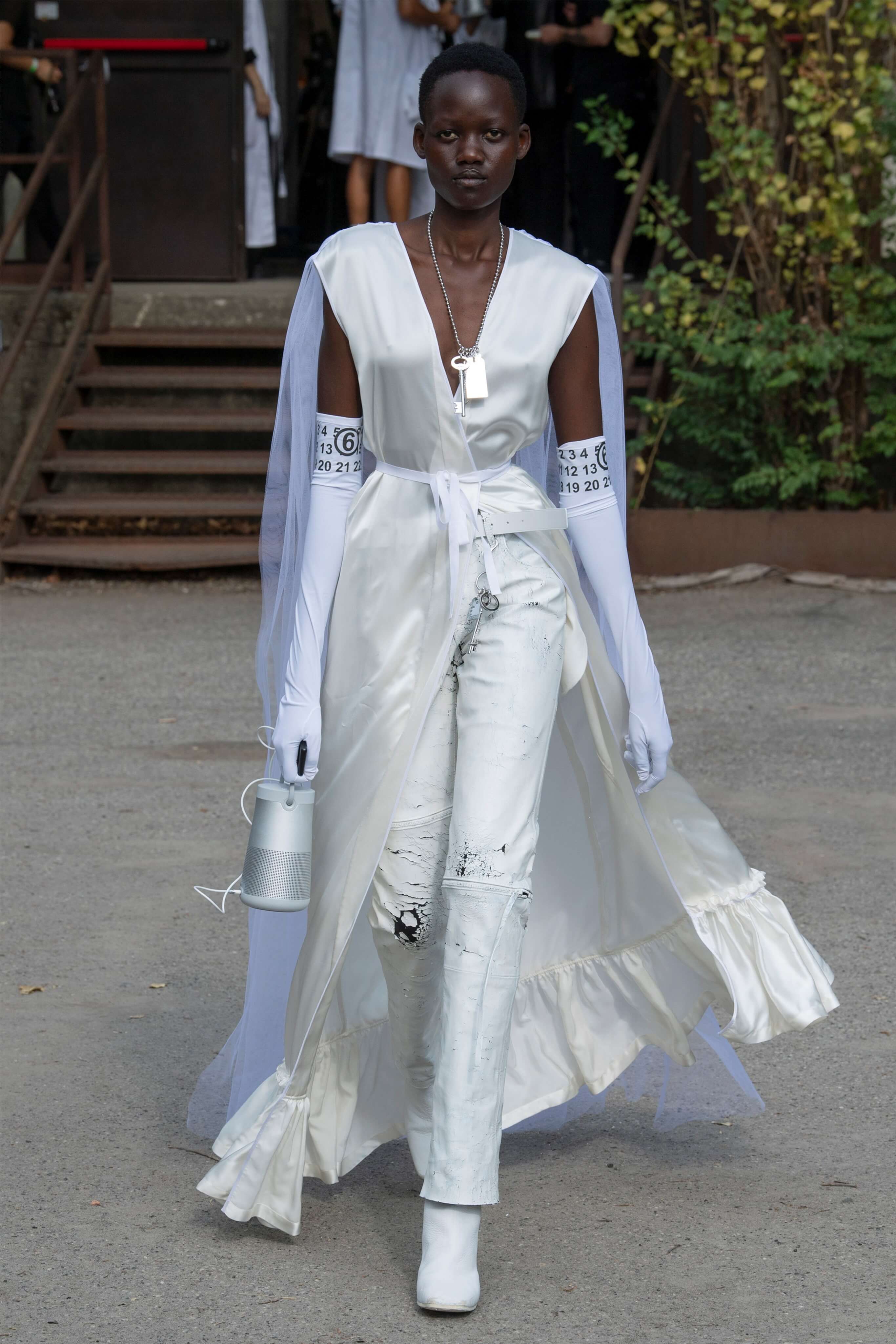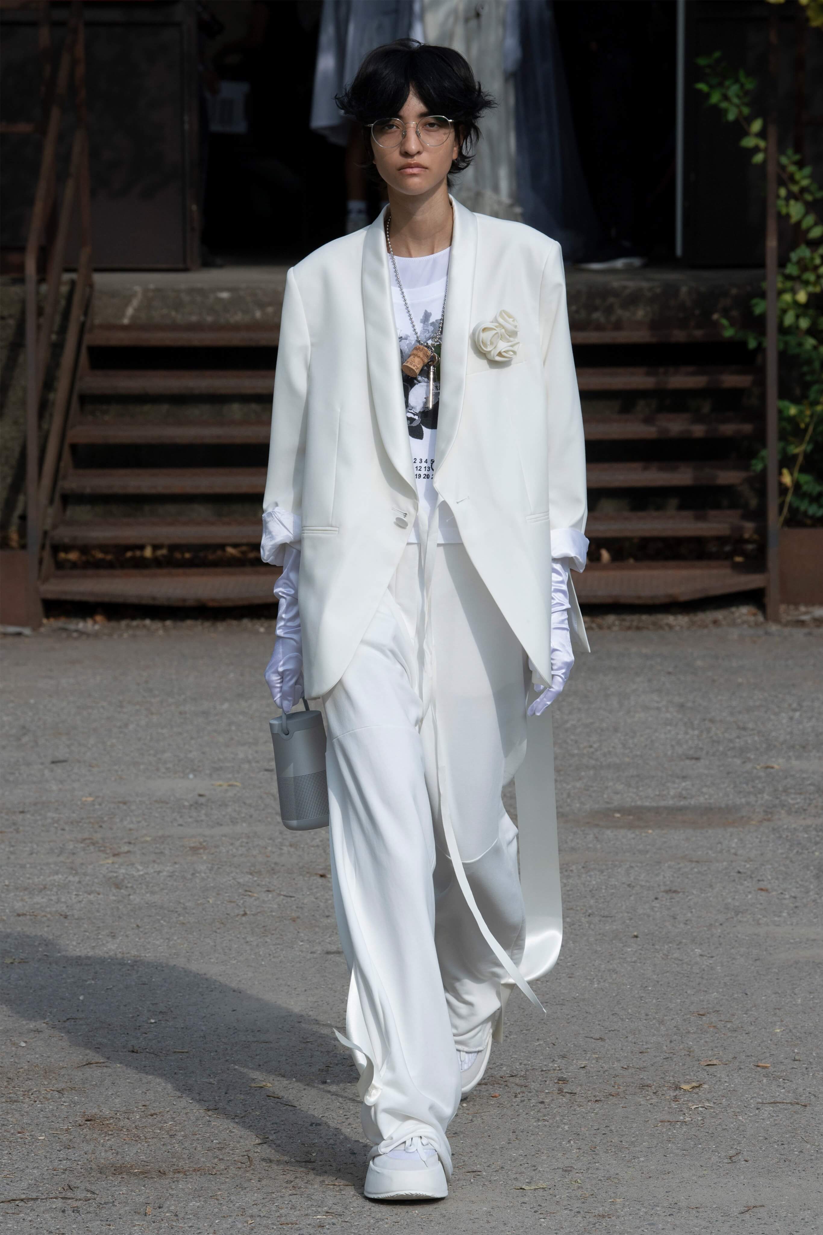 Новую коллекцию MM6 Margiela дизайн-команда посвятила идее счастливой свадьбы со всеми её атрибутами, а в качестве примера для вдохновения выбрала Джона Леннона и Йоко Оно — ведь через их образы говорить об искренних чувствах вне рамок, романтичном бунтарстве и крепком взаимном уважении получается наглядно и выразительно. Большие очки в пол-лица, белоснежные фраки с розами на лацканах, платья-жилеты из перламутрового шелка с фатой, накинутой на плечи, и нежные платья-трапеции сменялись выходами в черных кожаных пиджаках, надетых поверх водолазок, деконструированными костюмами из денима и "перекрученными" пиджаками, как будто позаимствованными из мужского смокинга, надетыми поверх пышных тюлевых платьев. Вся коллекция выглядит так, будто гардероб молодых Леннона и Йоко Оно разобрали на составляющие и распределили между моделями, не ориентируясь на гендерные рамки. Одно из платьев украшал фотопринт с изображением букета белых роз — его стягивала атласная лента на поясе модели, а в качестве аксессуаров были представлены шлепанцы, напоминающие свадебный торт или подвязки невесты, сумочки в виде смятых жестяных банок и ручные ридикюли на манер классических подвенечных.
