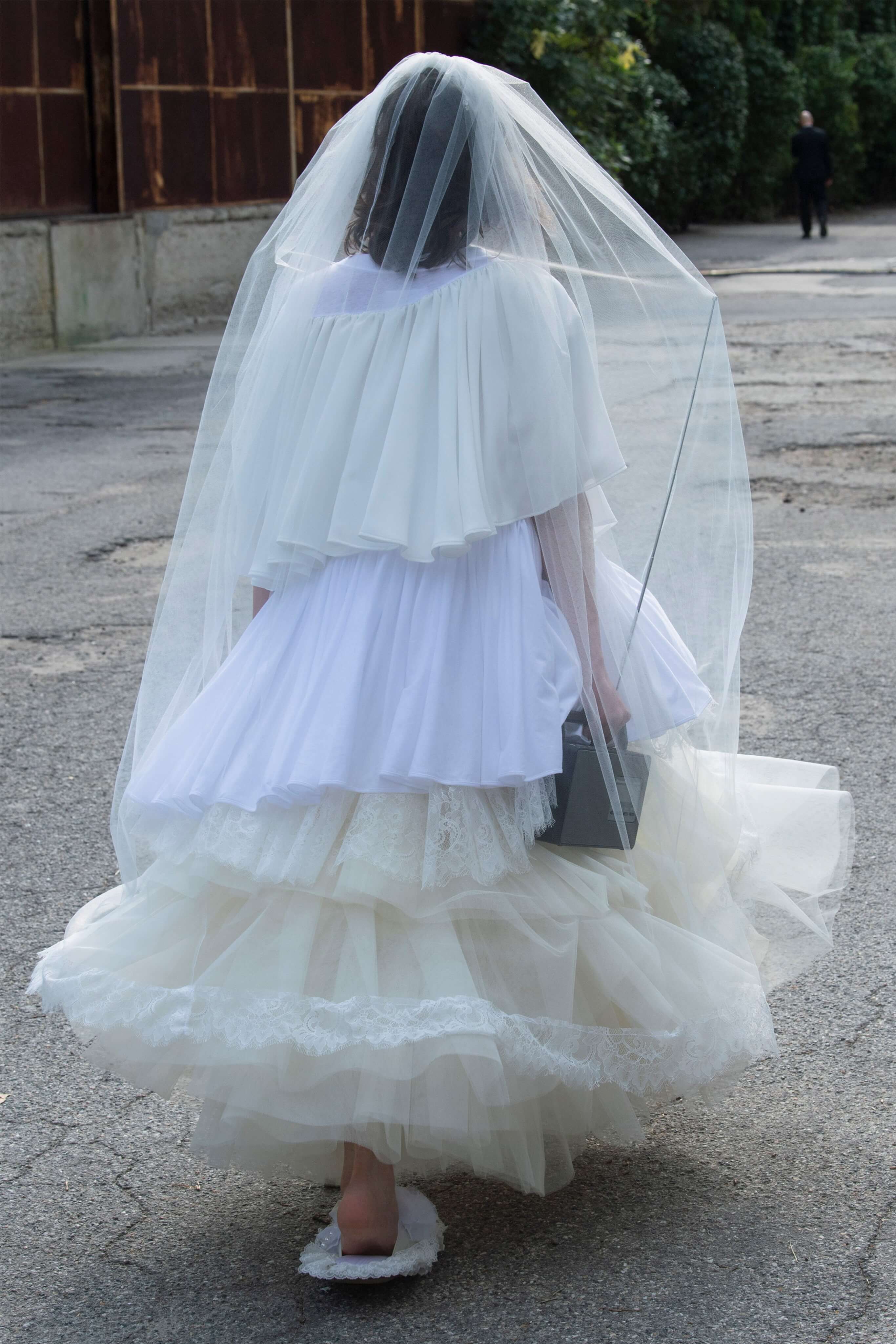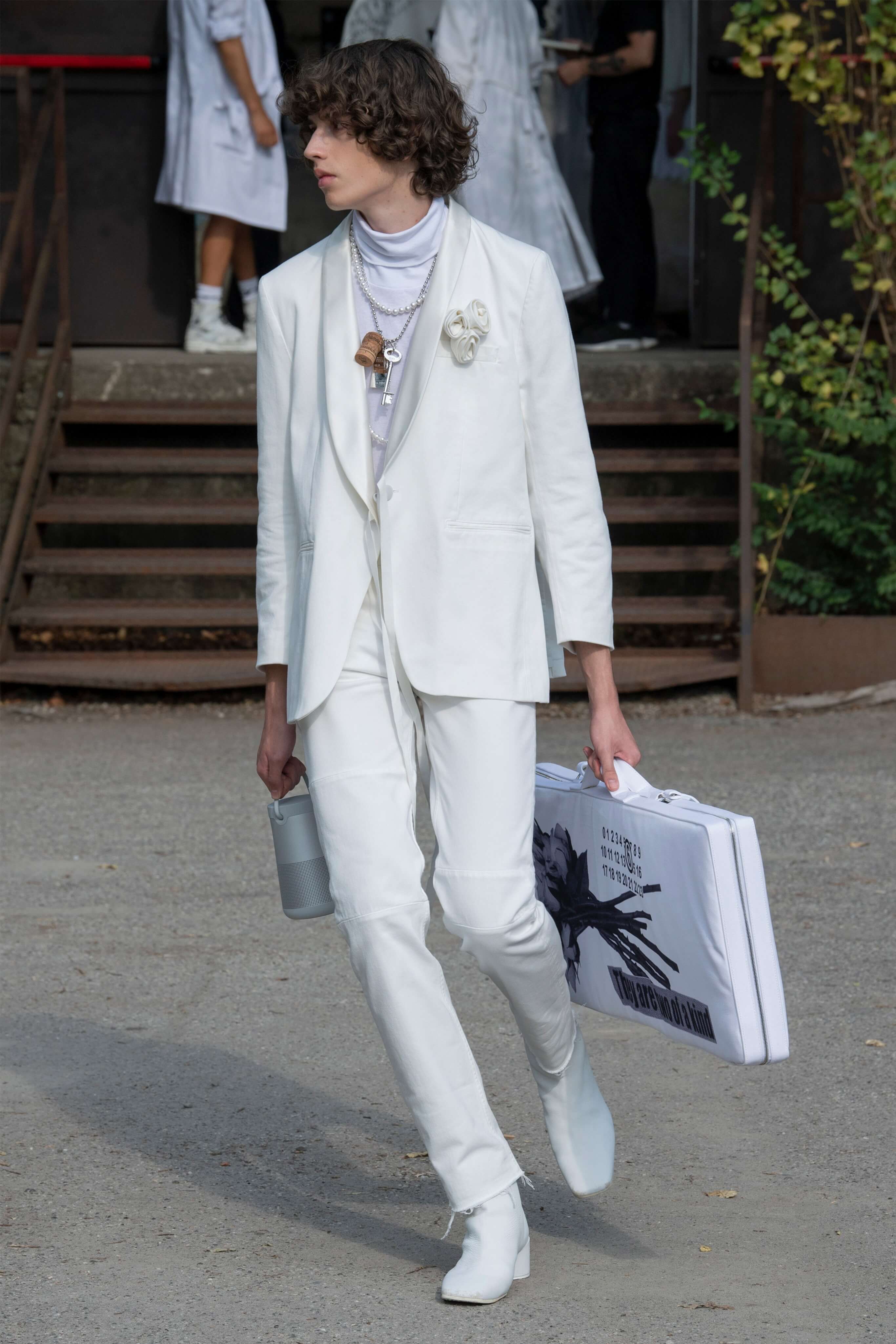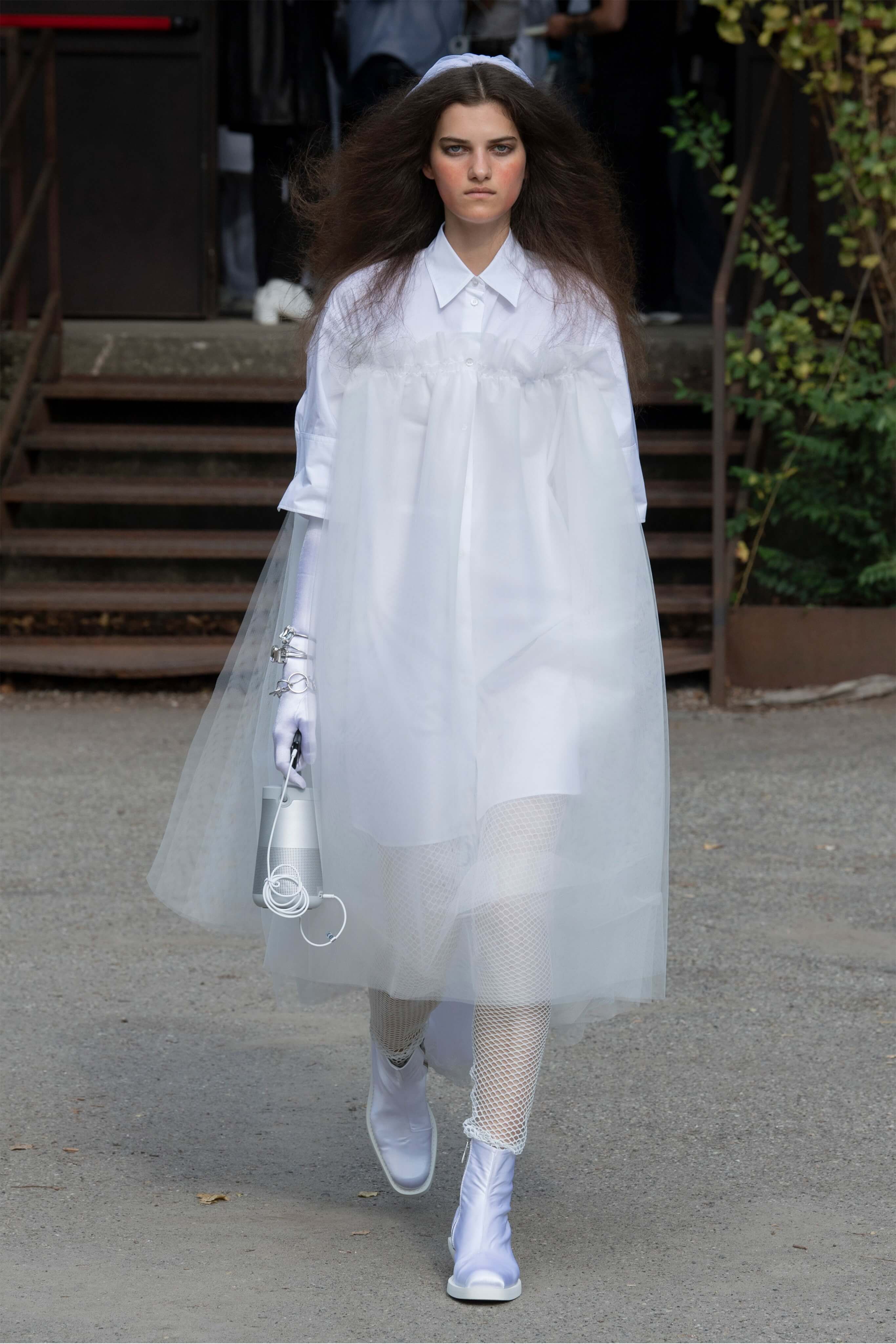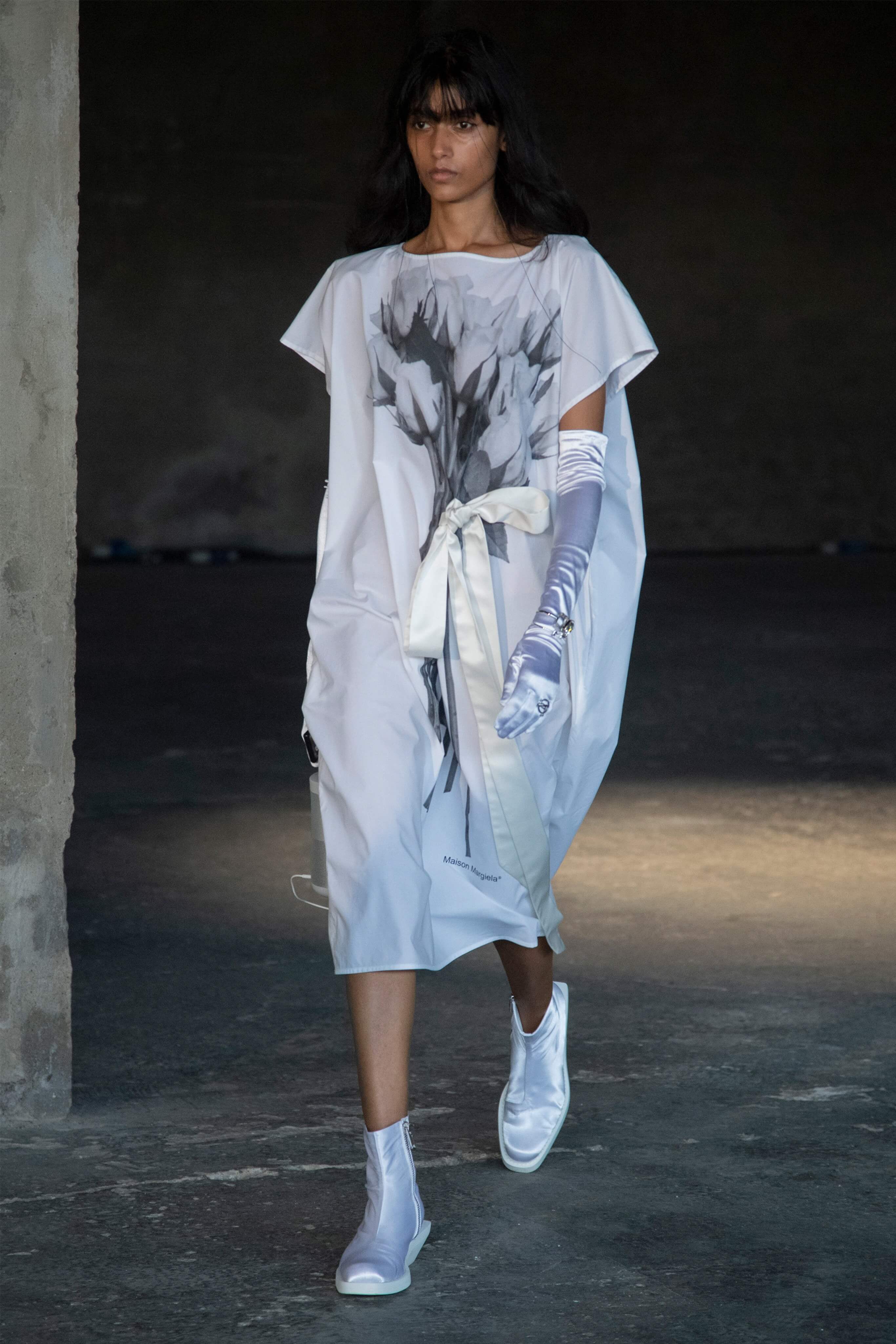 Новую коллекцию MM6 Margiela дизайн-команда посвятила идее счастливой свадьбы со всеми её атрибутами, а в качестве примера для вдохновения выбрала Джона Леннона и Йоко Оно — ведь через их образы говорить об искренних чувствах вне рамок, романтичном бунтарстве и крепком взаимном уважении получается наглядно и выразительно. Большие очки в пол-лица, белоснежные фраки с розами на лацканах, платья-жилеты из перламутрового шелка с фатой, накинутой на плечи, и нежные платья-трапеции сменялись выходами в черных кожаных пиджаках, надетых поверх водолазок, деконструированными костюмами из денима и "перекрученными" пиджаками, как будто позаимствованными из мужского смокинга, надетыми поверх пышных тюлевых платьев. Вся коллекция выглядит так, будто гардероб молодых Леннона и Йоко Оно разобрали на составляющие и распределили между моделями, не ориентируясь на гендерные рамки. Одно из платьев украшал фотопринт с изображением букета белых роз — его стягивала атласная лента на поясе модели, а в качестве аксессуаров были представлены шлепанцы, напоминающие свадебный торт или подвязки невесты, сумочки в виде смятых жестяных банок и ручные ридикюли на манер классических подвенечных.
