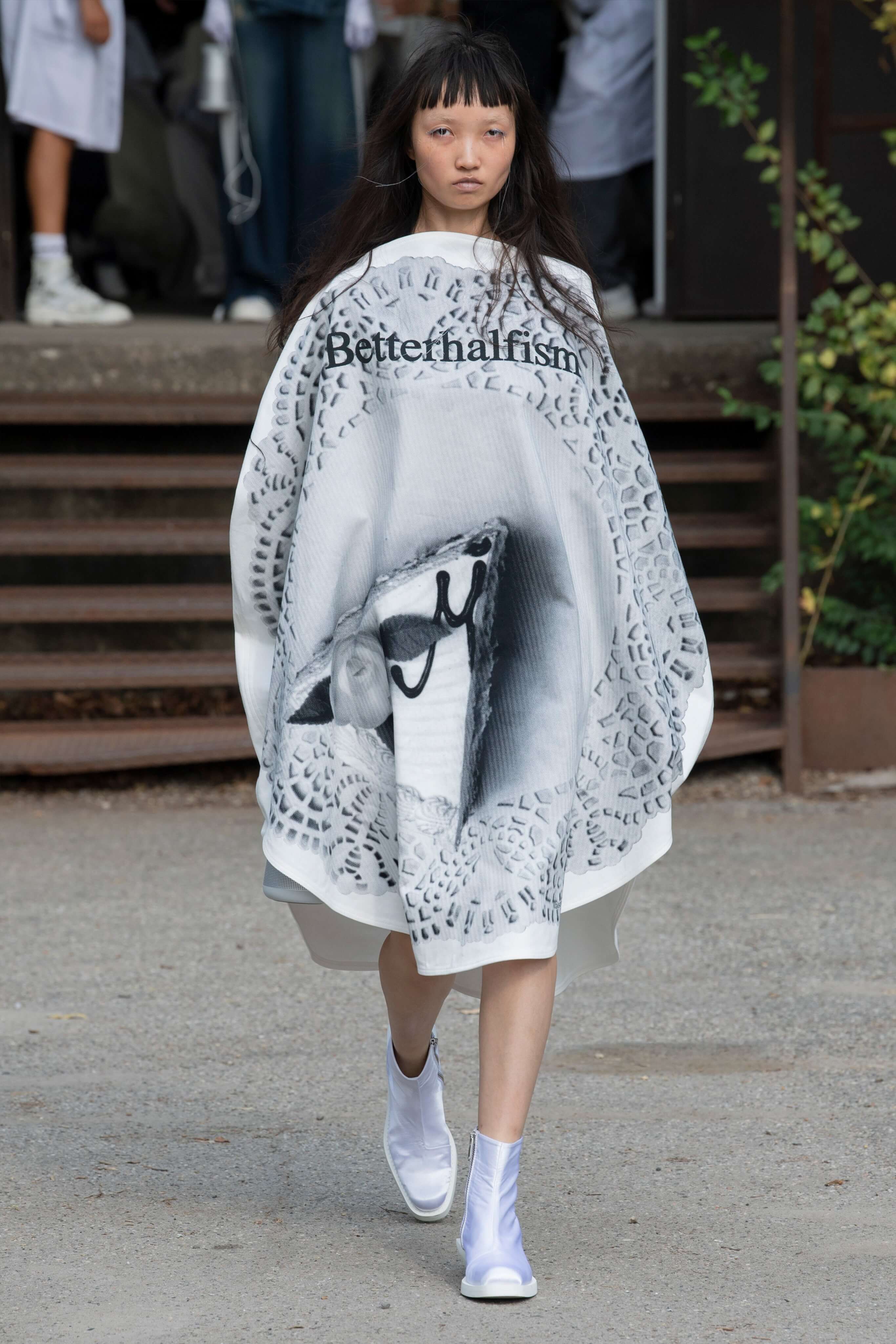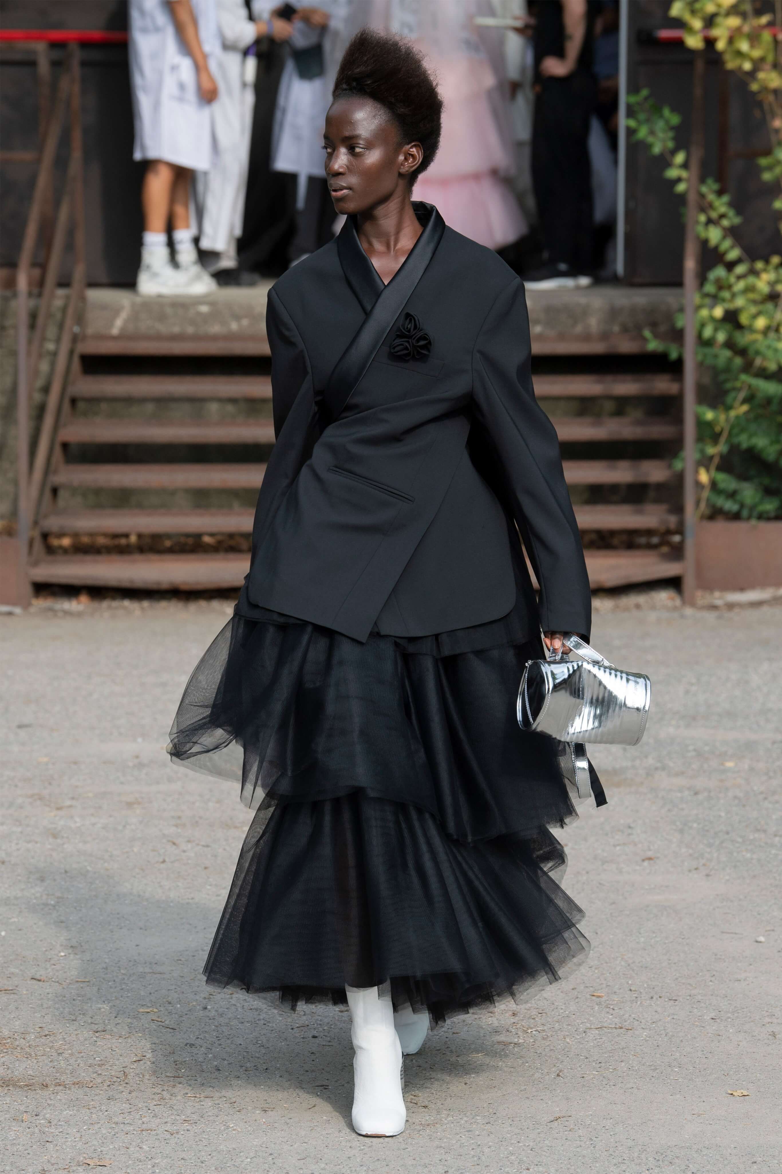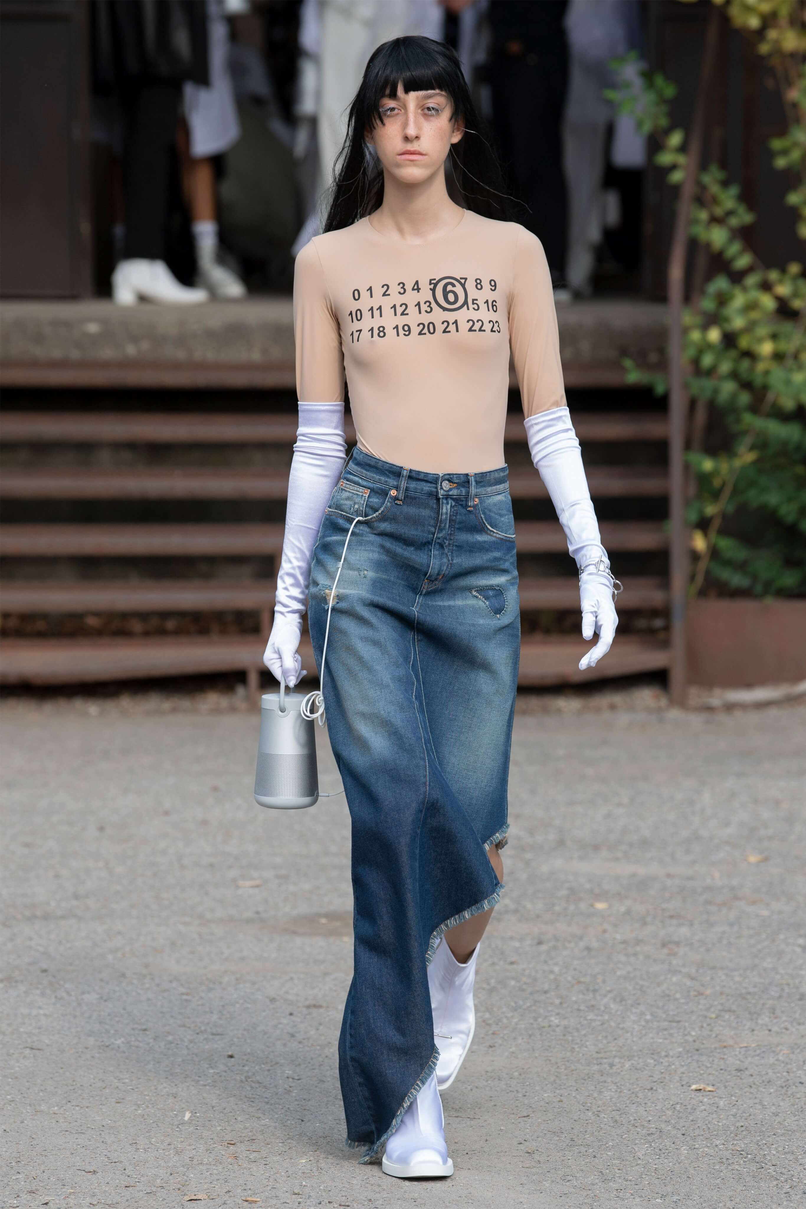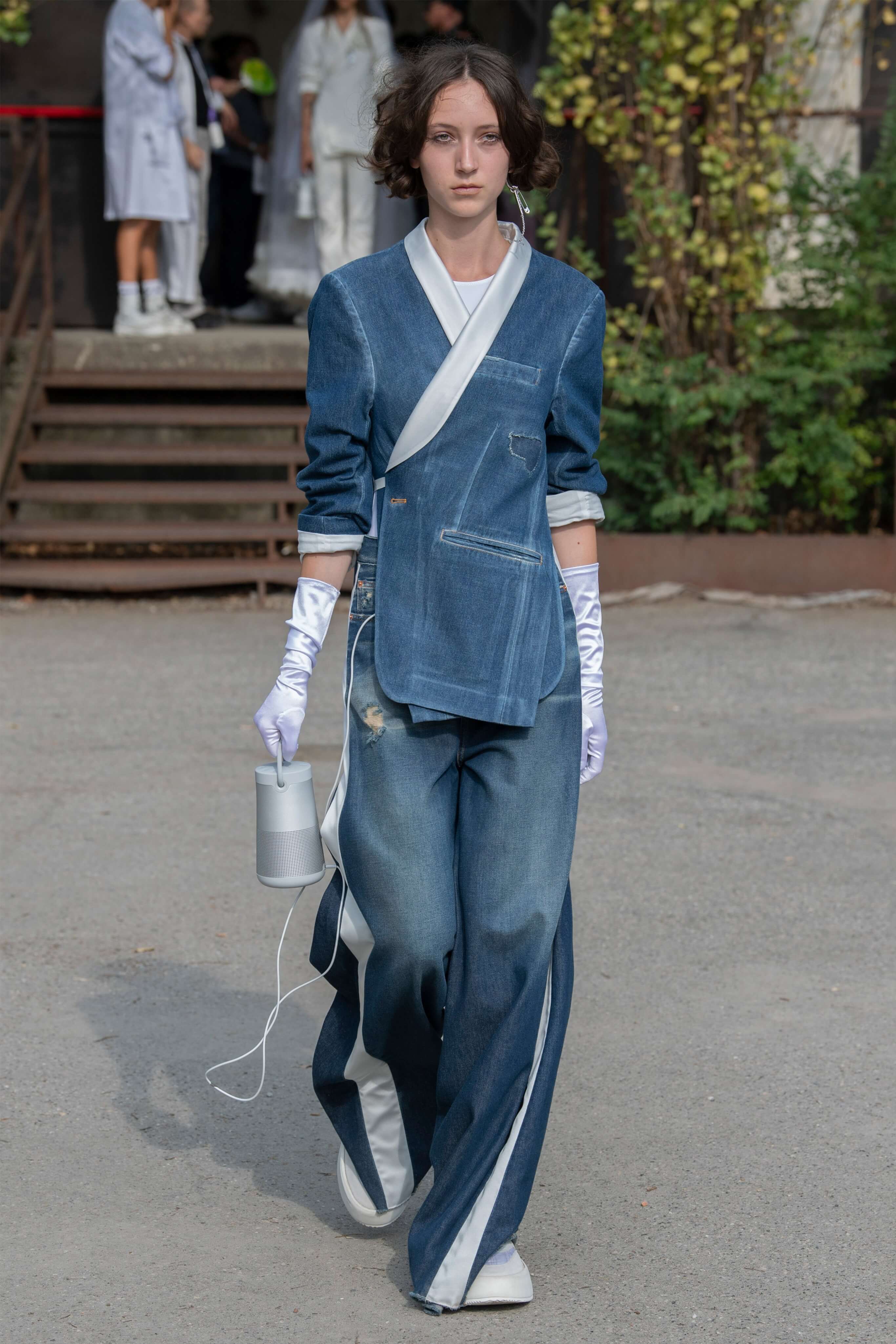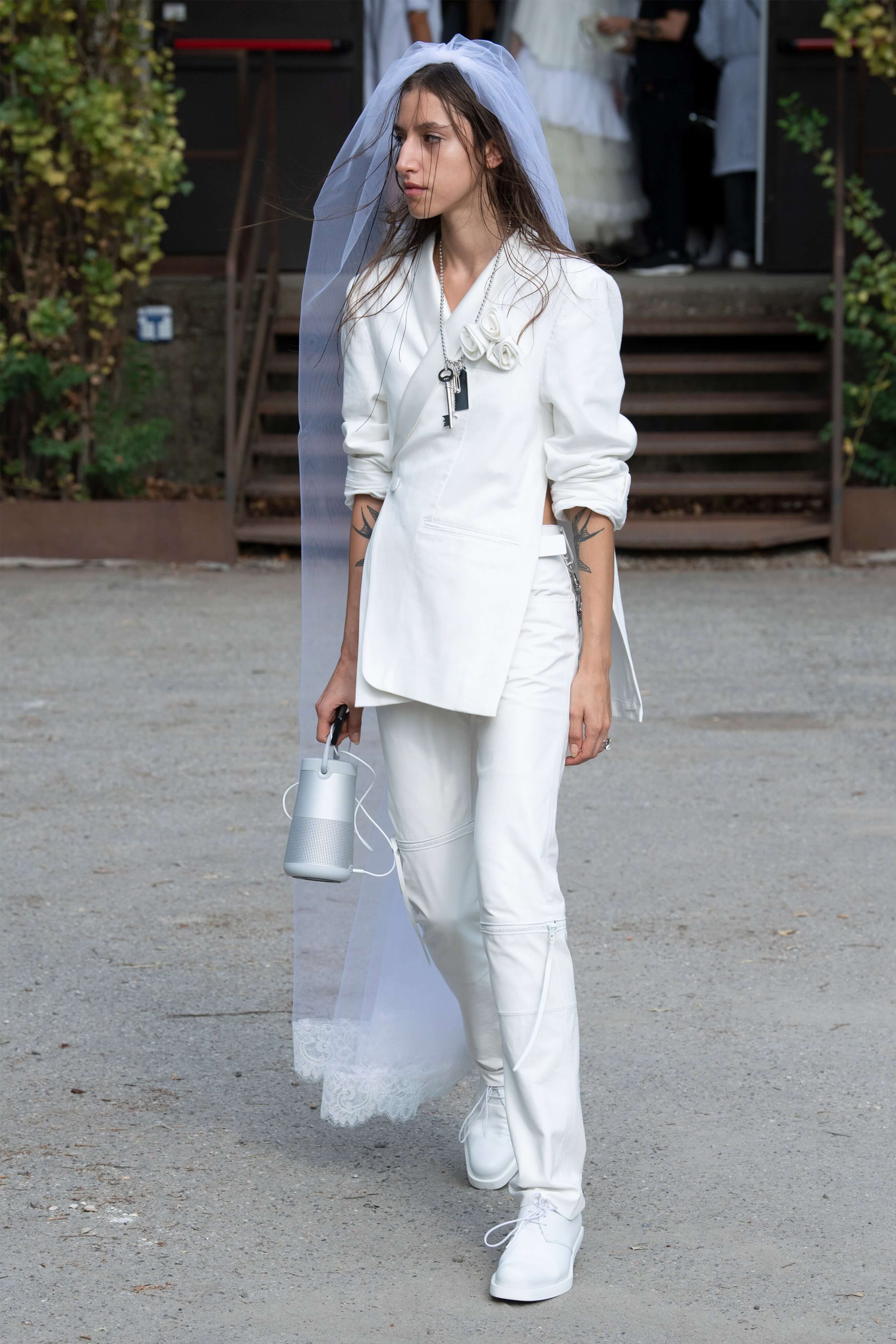 Новую коллекцию MM6 Margiela дизайн-команда посвятила идее счастливой свадьбы со всеми её атрибутами, а в качестве примера для вдохновения выбрала Джона Леннона и Йоко Оно — ведь через их образы говорить об искренних чувствах вне рамок, романтичном бунтарстве и крепком взаимном уважении получается наглядно и выразительно. Большие очки в пол-лица, белоснежные фраки с розами на лацканах, платья-жилеты из перламутрового шелка с фатой, накинутой на плечи, и нежные платья-трапеции сменялись выходами в черных кожаных пиджаках, надетых поверх водолазок, деконструированными костюмами из денима и "перекрученными" пиджаками, как будто позаимствованными из мужского смокинга, надетыми поверх пышных тюлевых платьев. Вся коллекция выглядит так, будто гардероб молодых Леннона и Йоко Оно разобрали на составляющие и распределили между моделями, не ориентируясь на гендерные рамки. Одно из платьев украшал фотопринт с изображением букета белых роз — его стягивала атласная лента на поясе модели, а в качестве аксессуаров были представлены шлепанцы, напоминающие свадебный торт или подвязки невесты, сумочки в виде смятых жестяных банок и ручные ридикюли на манер классических подвенечных.