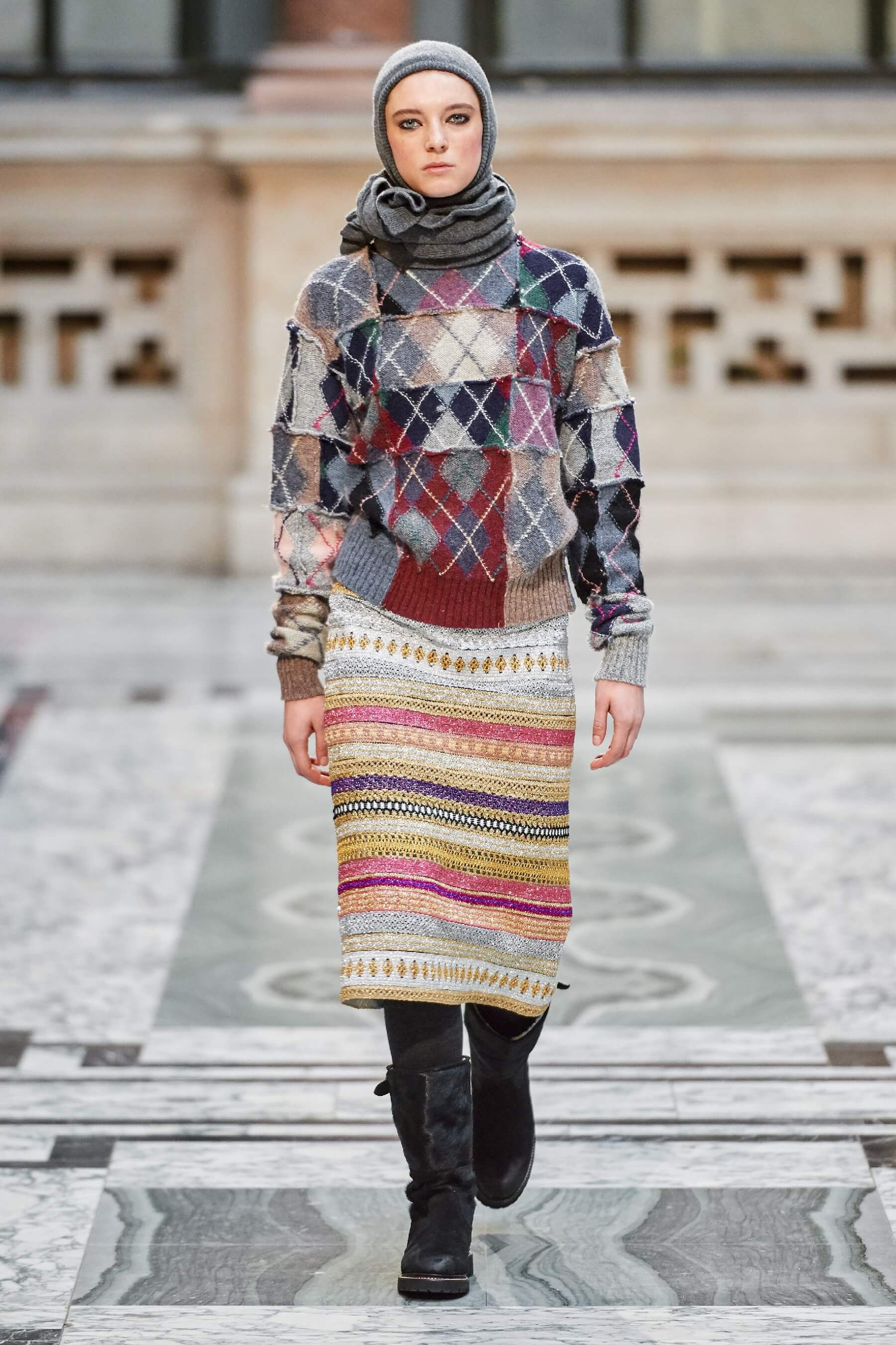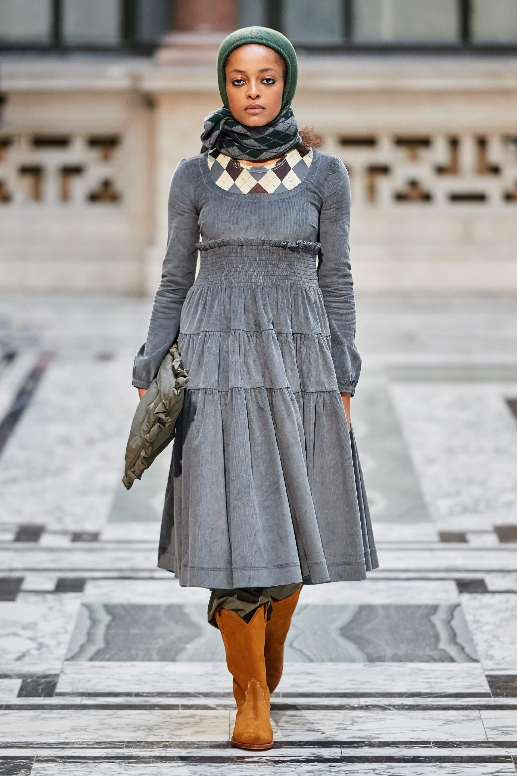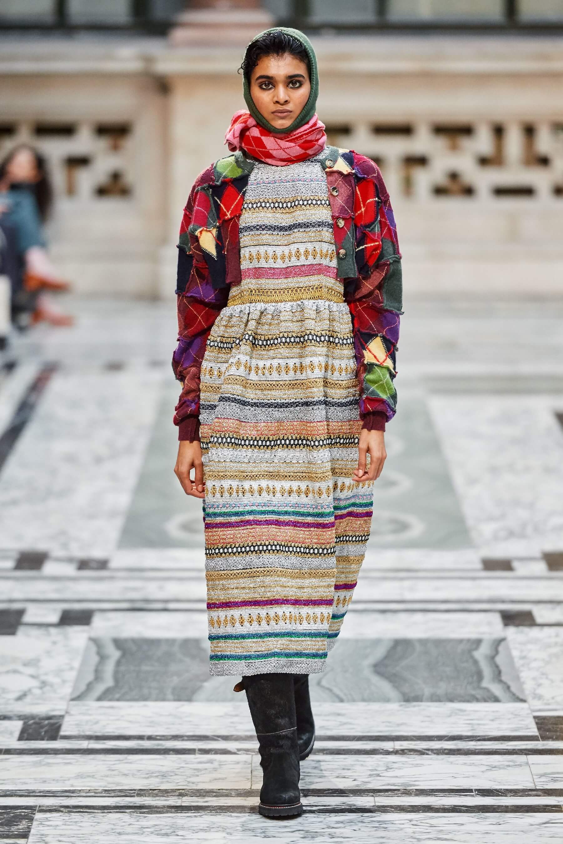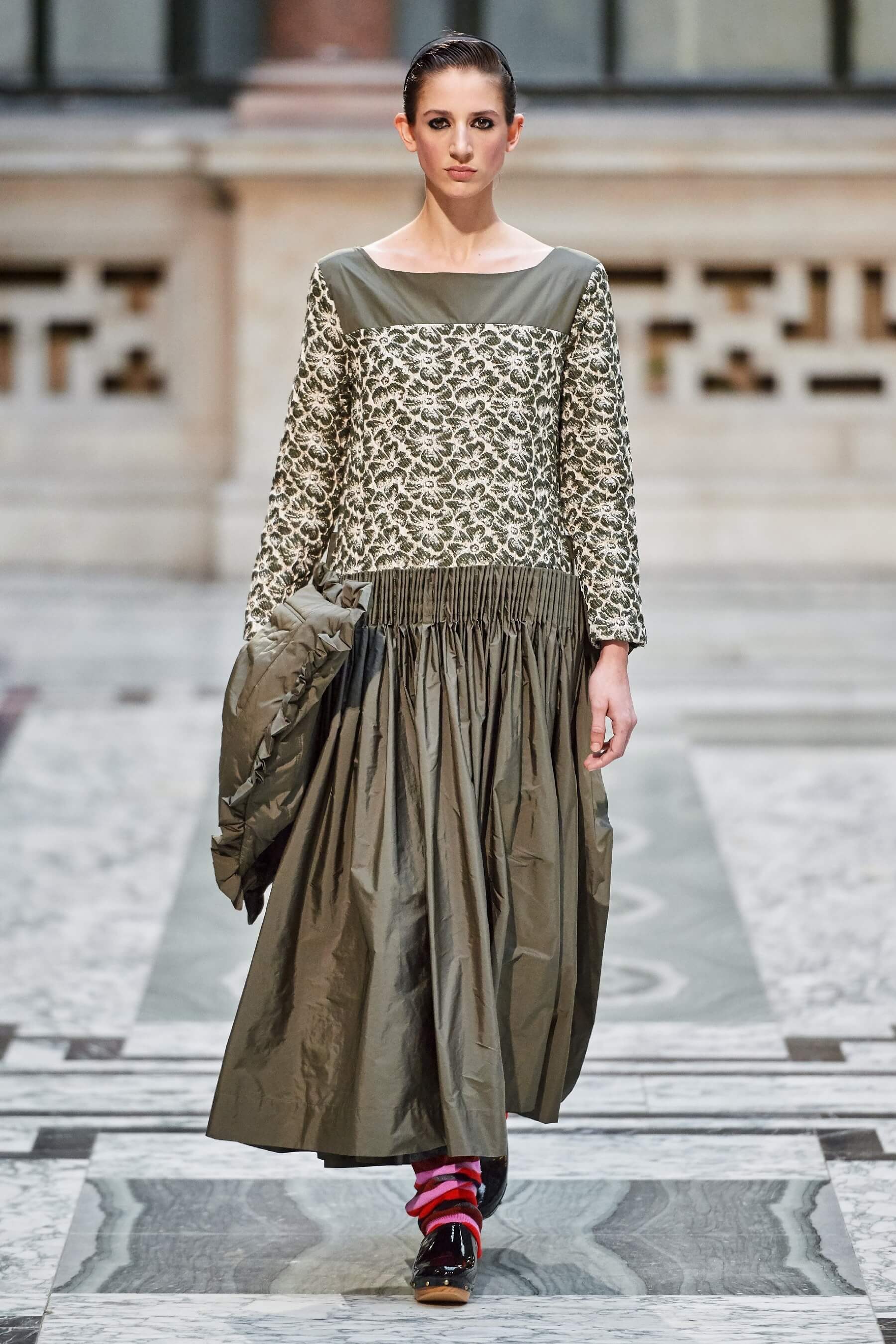 Винтажная стилистика также отразилась на вязаных платьях и укороченных кардиганах, выполненных в лоскутной технике пэчворк. Ряд игривых платьев дополнен деловым брючным костюмом графитового оттенка в полоску. Дизайнер отметила, что её цель — создавать вещи, которые будут дарить ощущение стабильности в непростые времена.
