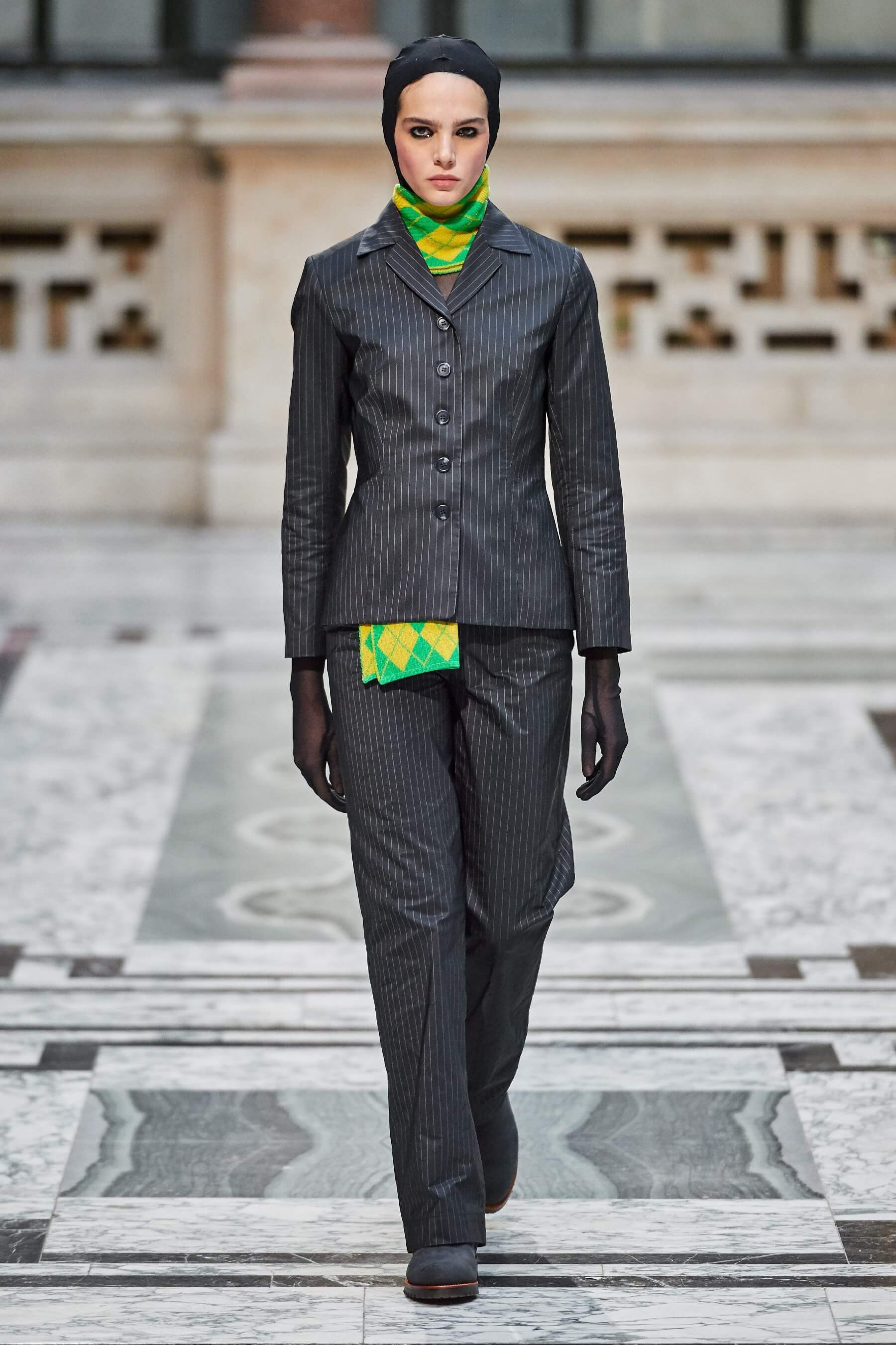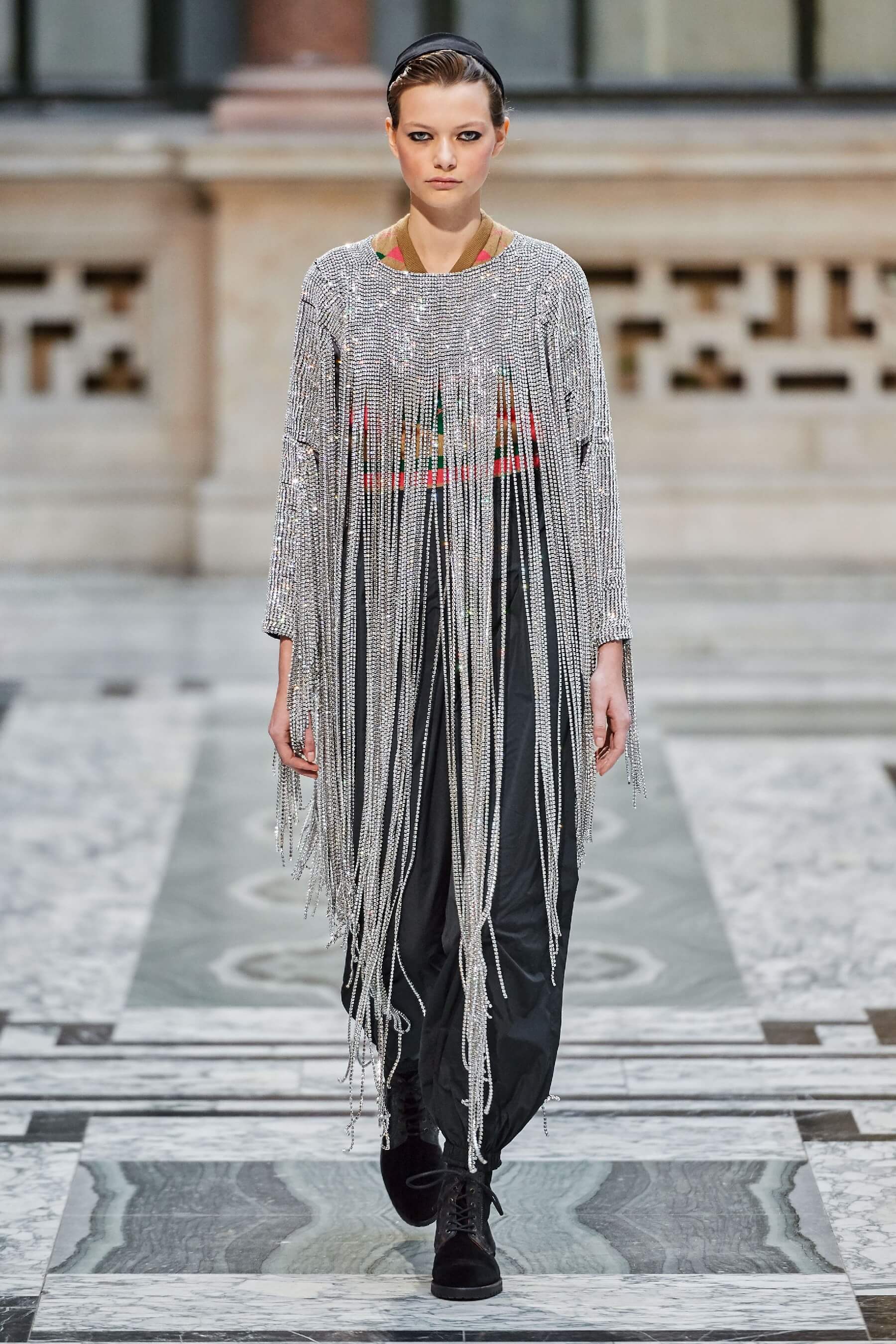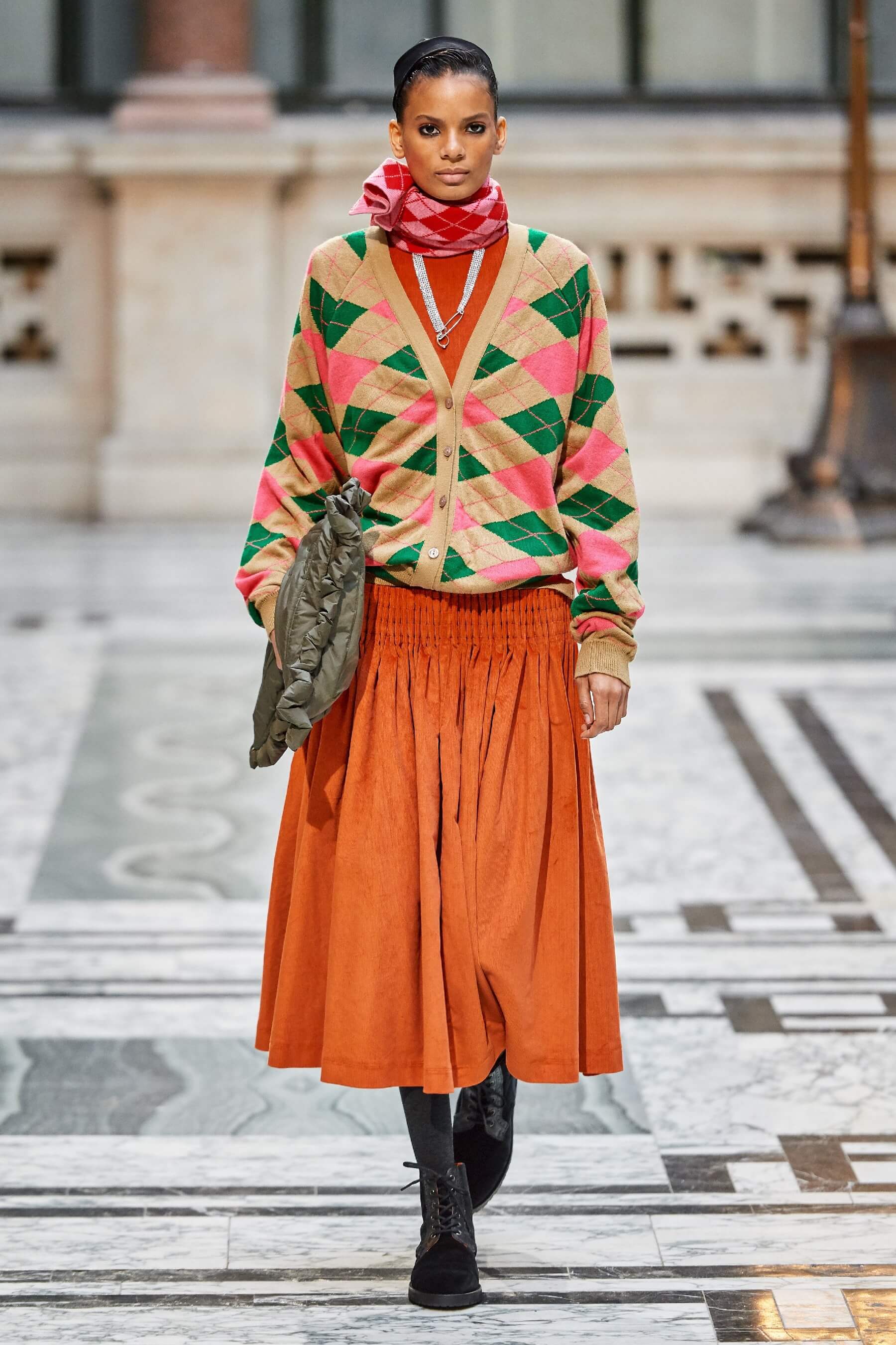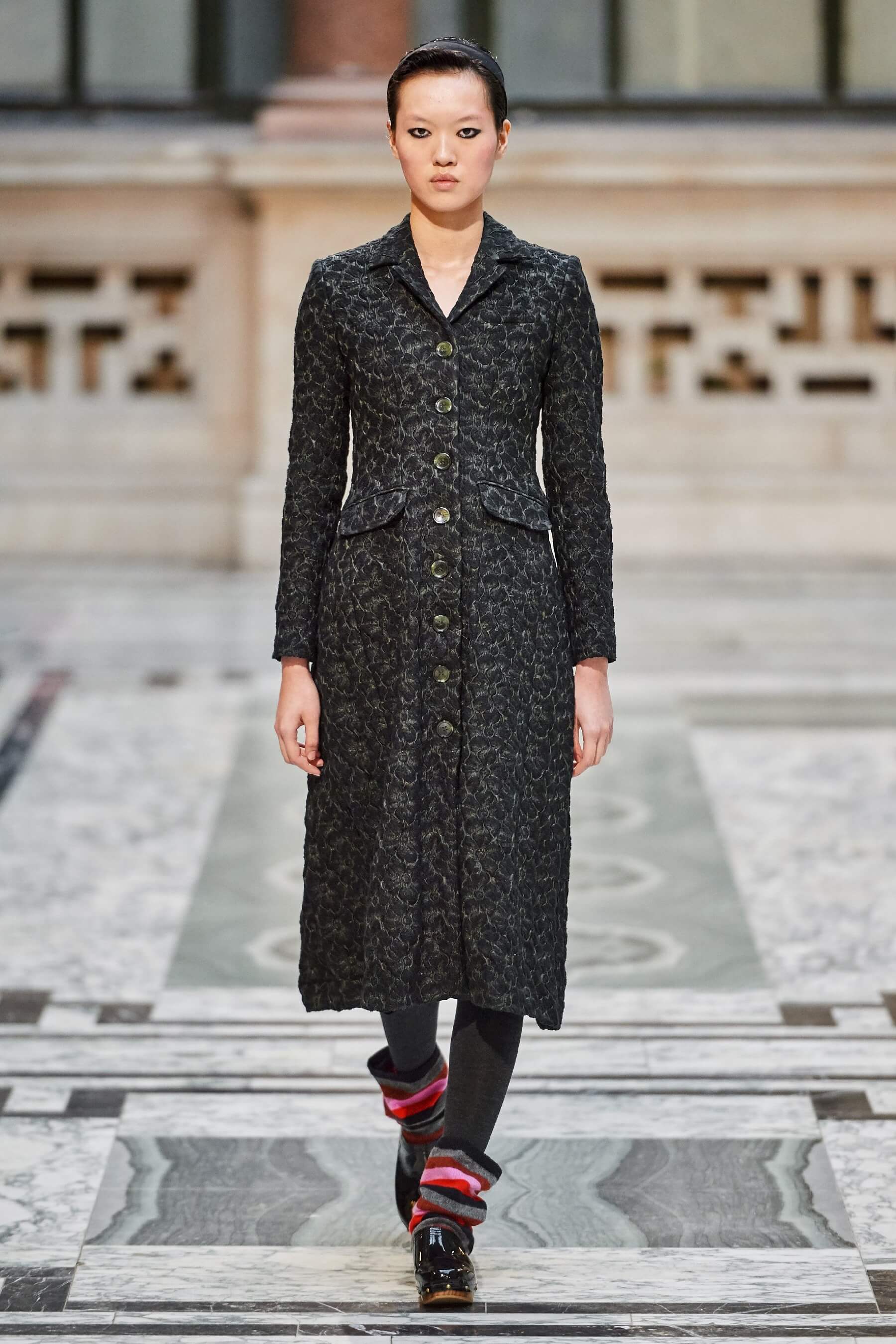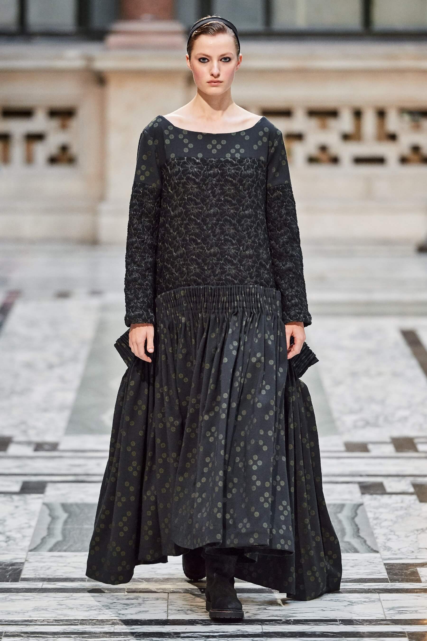 Винтажная стилистика также отразилась на вязаных платьях и укороченных кардиганах, выполненных в лоскутной технике пэчворк. Ряд игривых платьев дополнен деловым брючным костюмом графитового оттенка в полоску. Дизайнер отметила, что её цель — создавать вещи, которые будут дарить ощущение стабильности в непростые времена.
