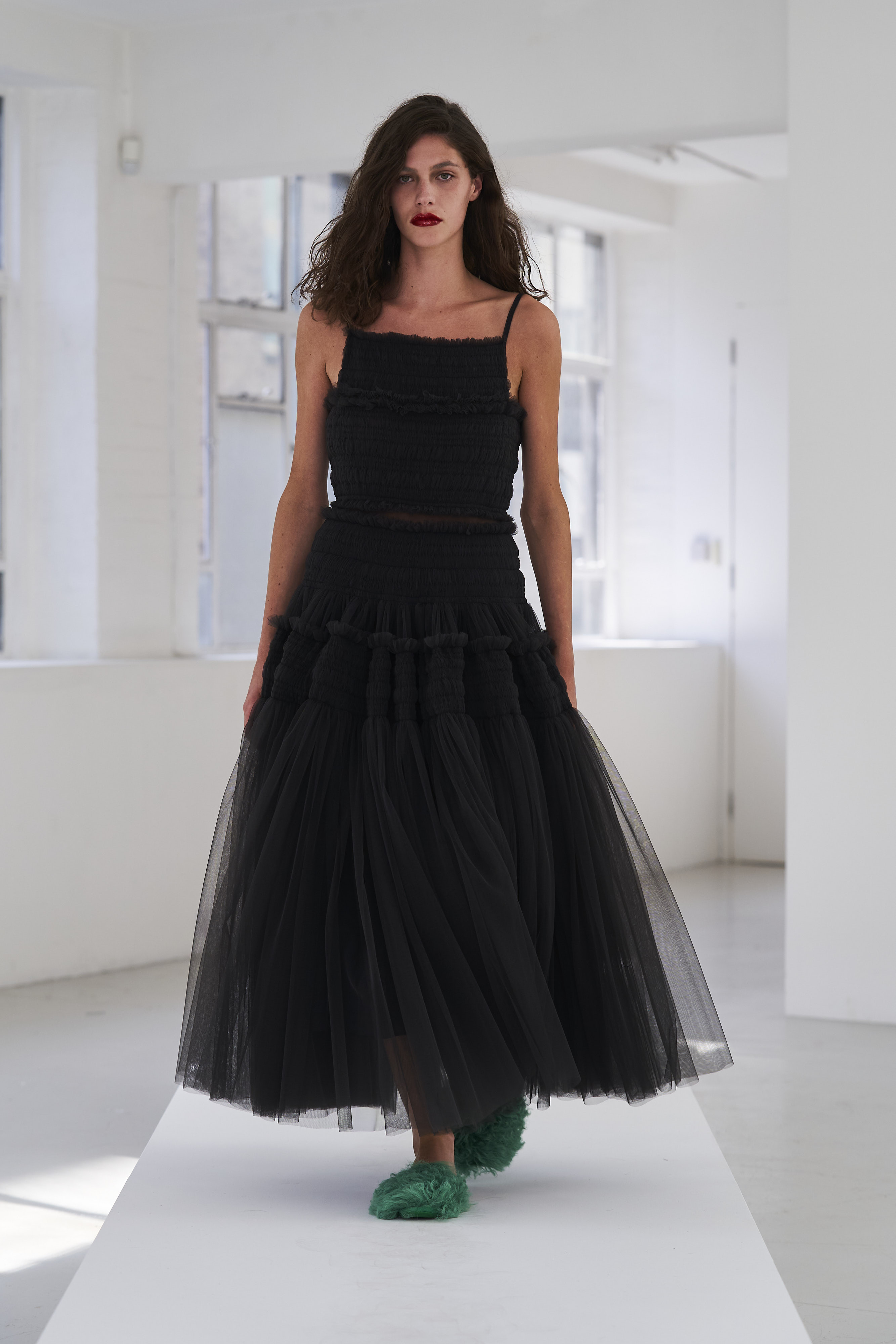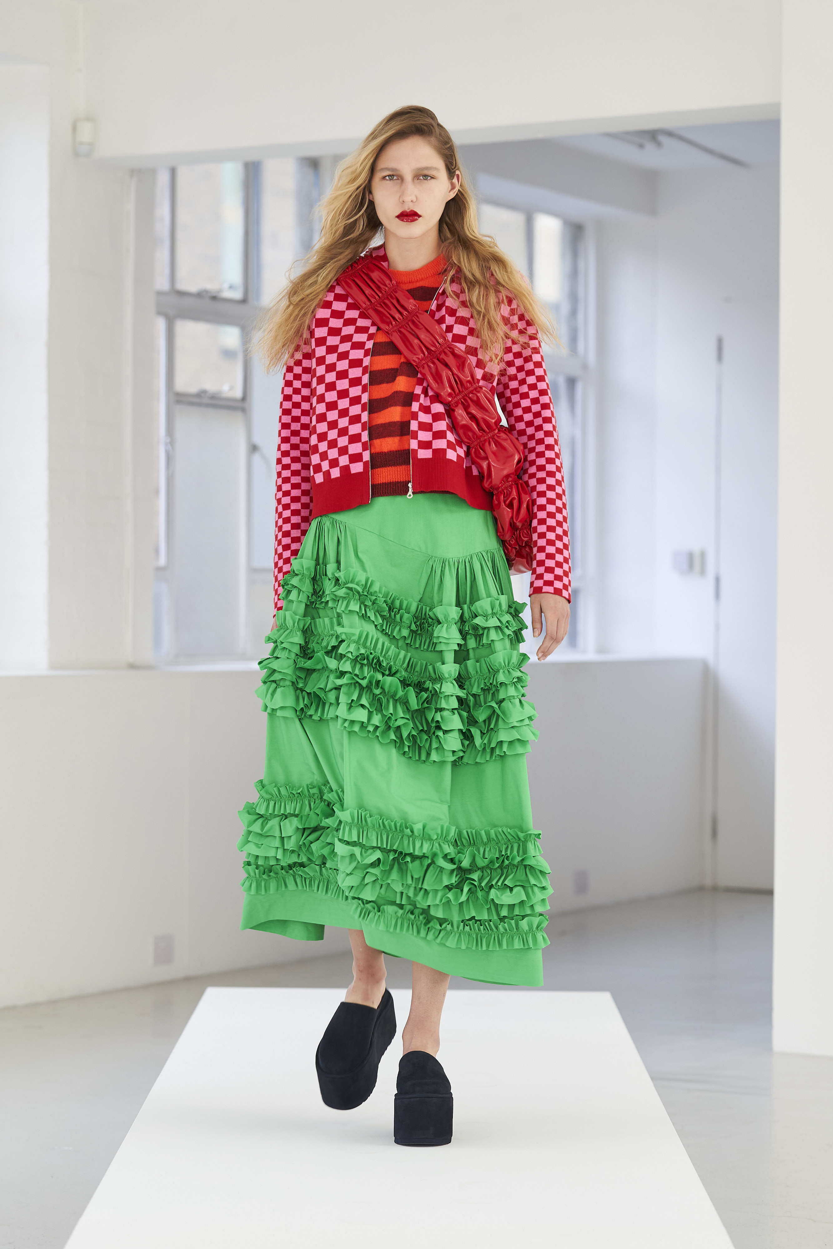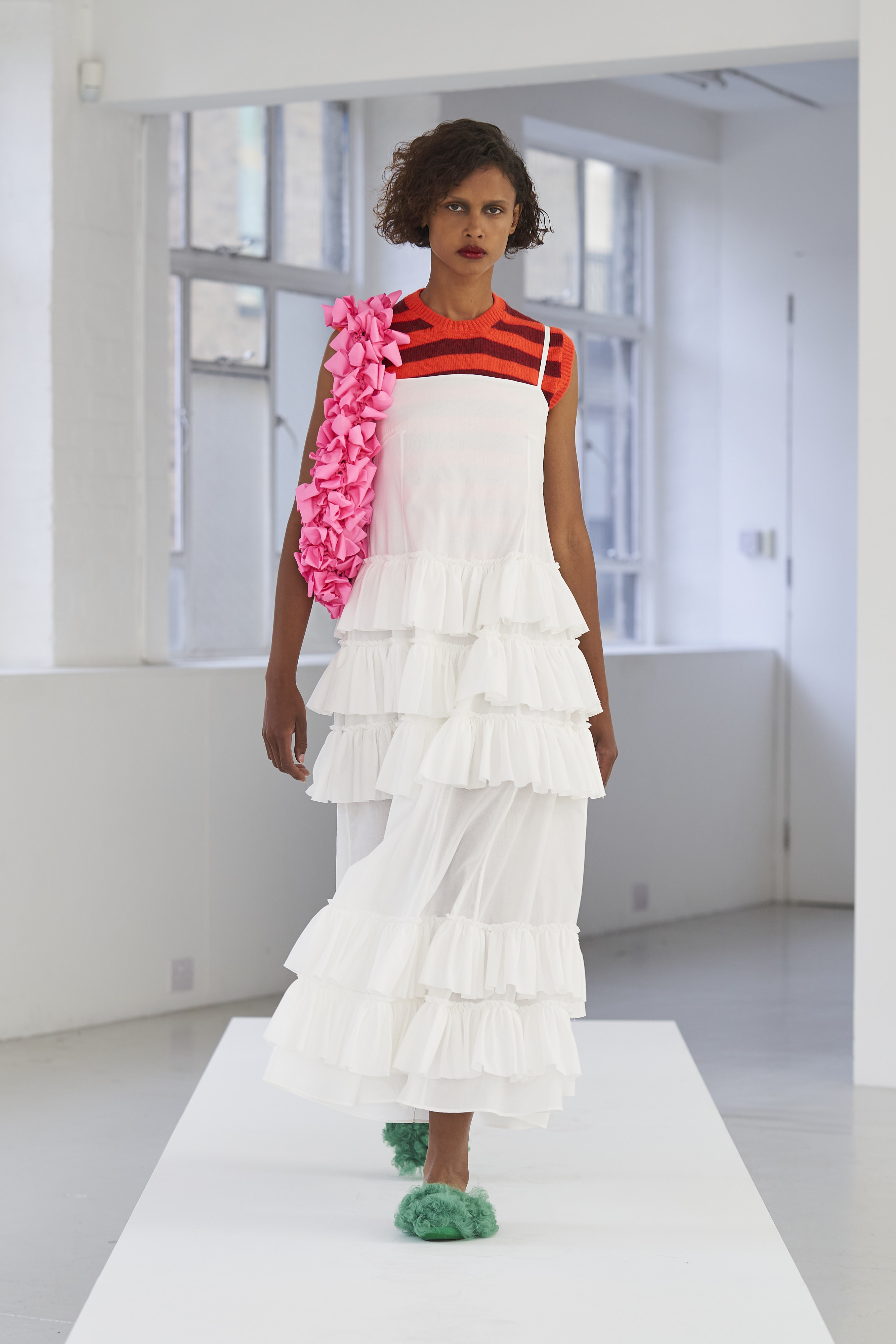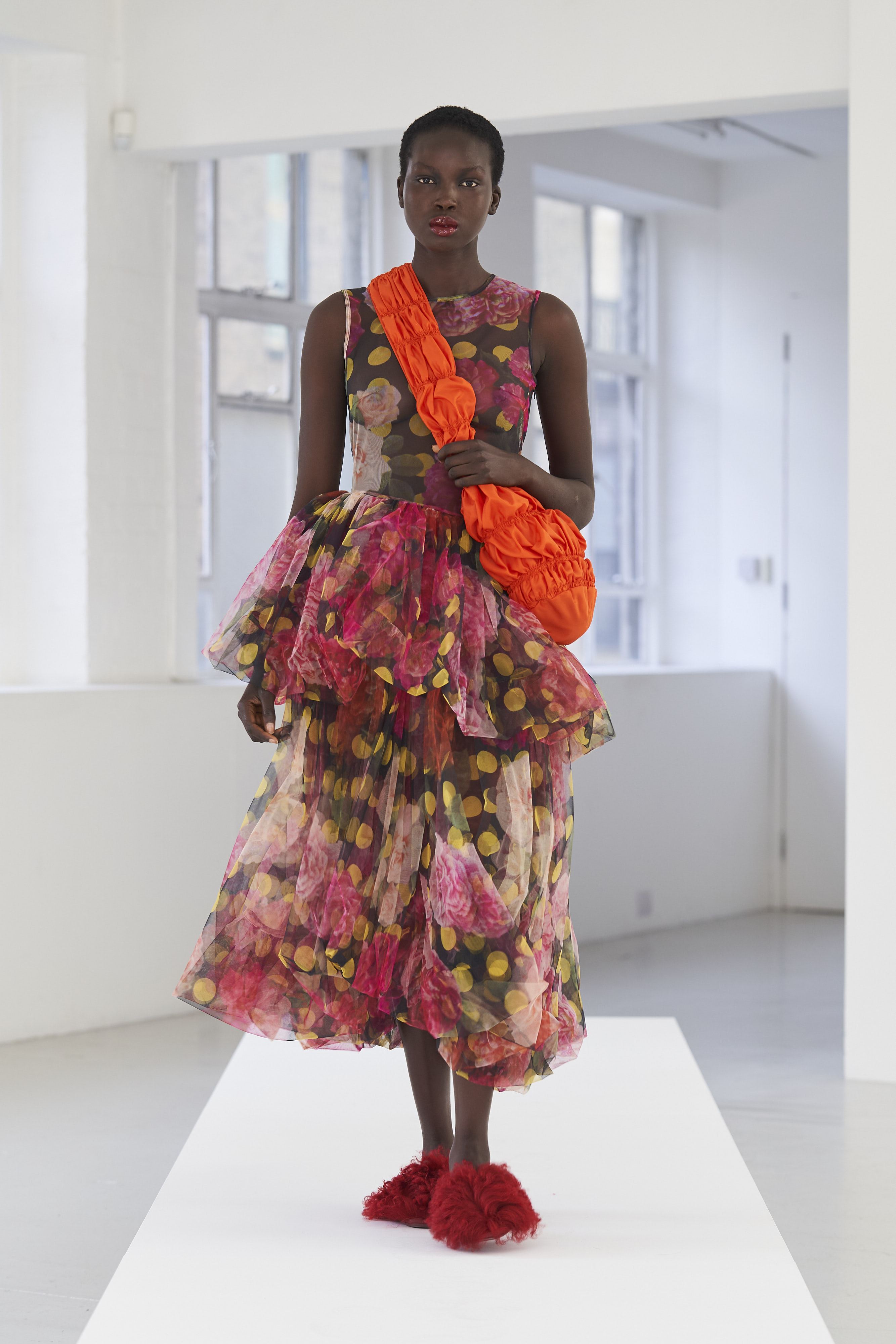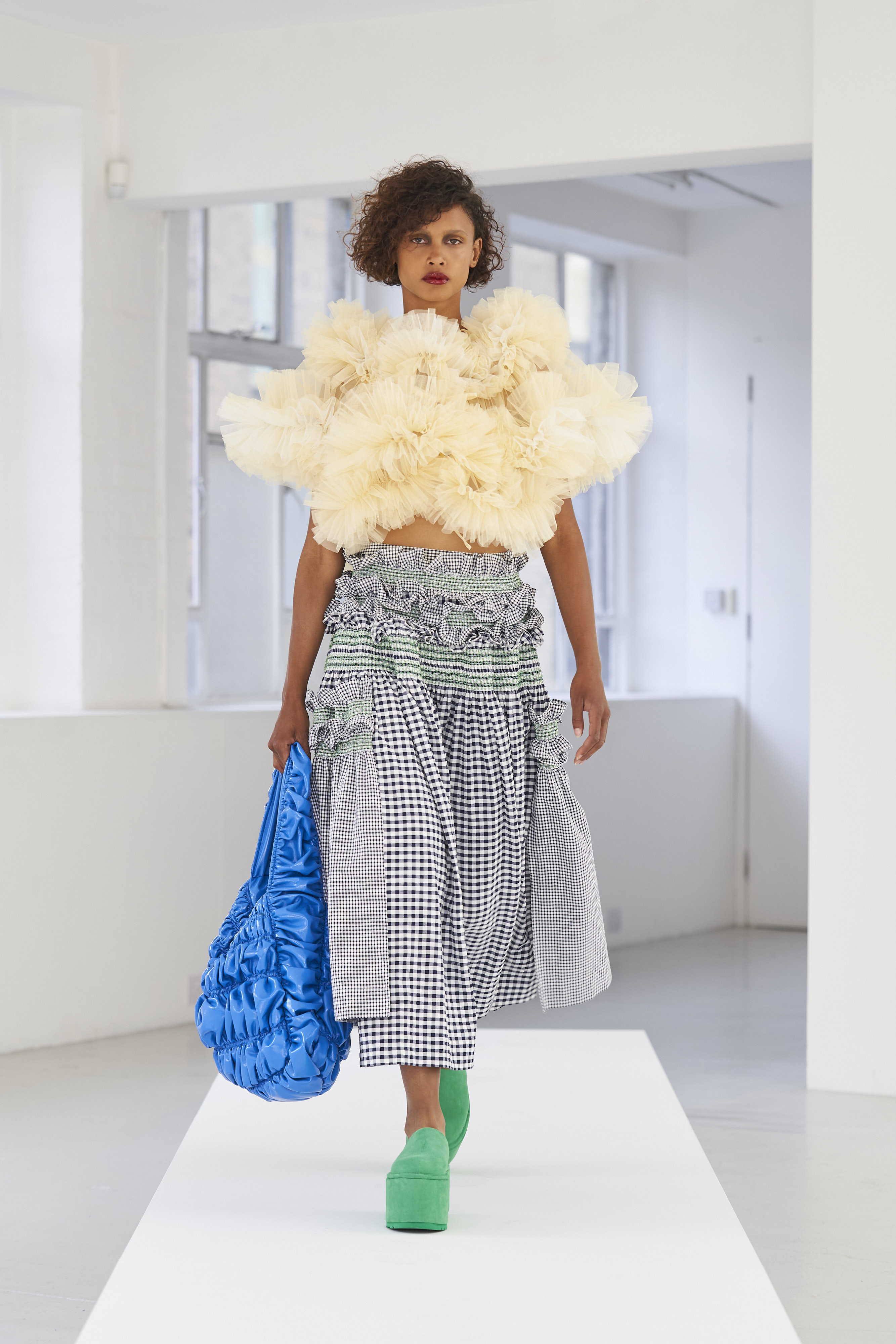 Дизайнер Молли Годдар провела показ новой коллекции в своей лондонской студии. Неоновые сумки из сатина модели несли поверх ярких свитеров в шахматный принт, фатиновых юбок и платьев с гиперобъемными аппликациями. Романтичные наряды в цветах чередовались с практичными и немного утилитарными платьями-балахонами. Экзотичный, но на деле – легко применимый в жизни, дизайн Молли Годдар разросся в новом сезоне до комфортных платьев-анораков, мягкой, будто домашней обуви (сотрудничество с Ugg) и знаковых пышных платьев, представленных в белом цвете, которые также станут идеальными для социально дистанцированной свадьбы.