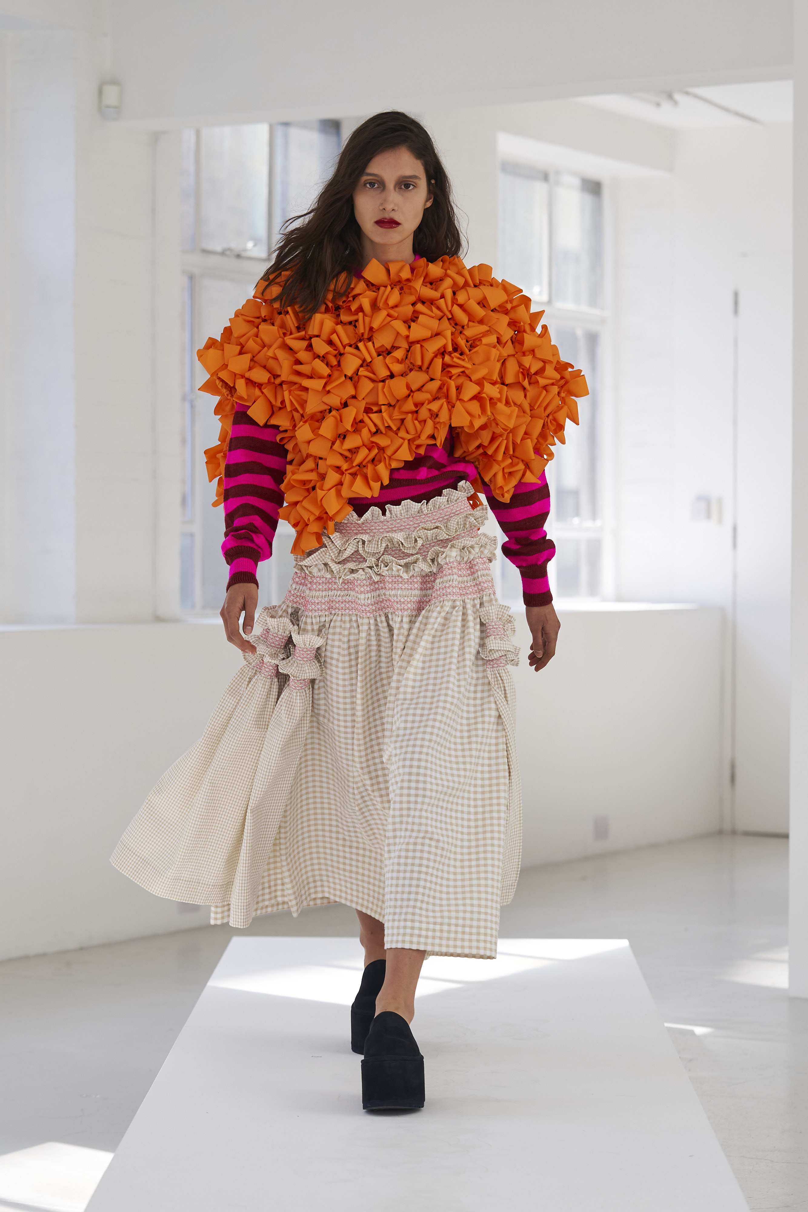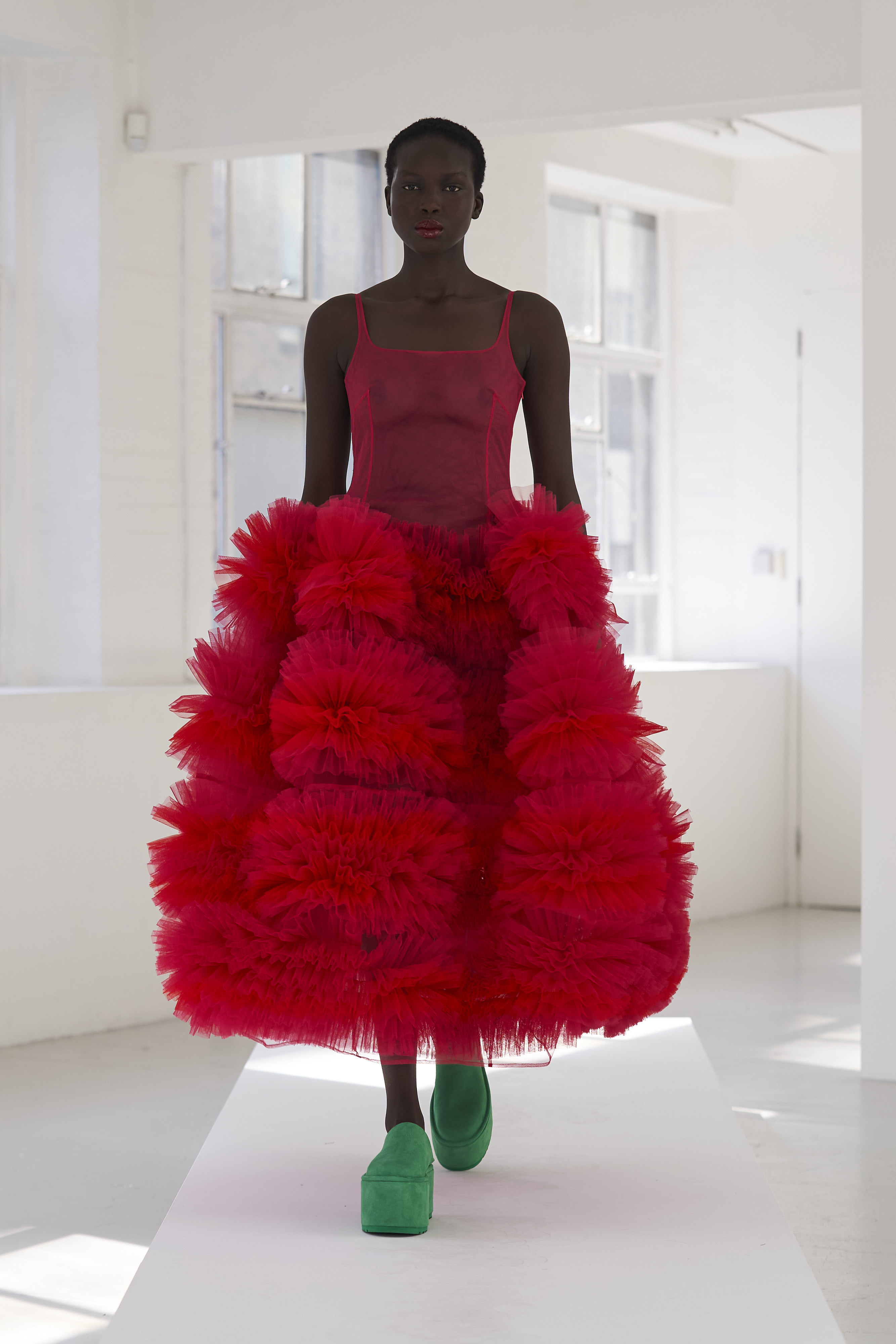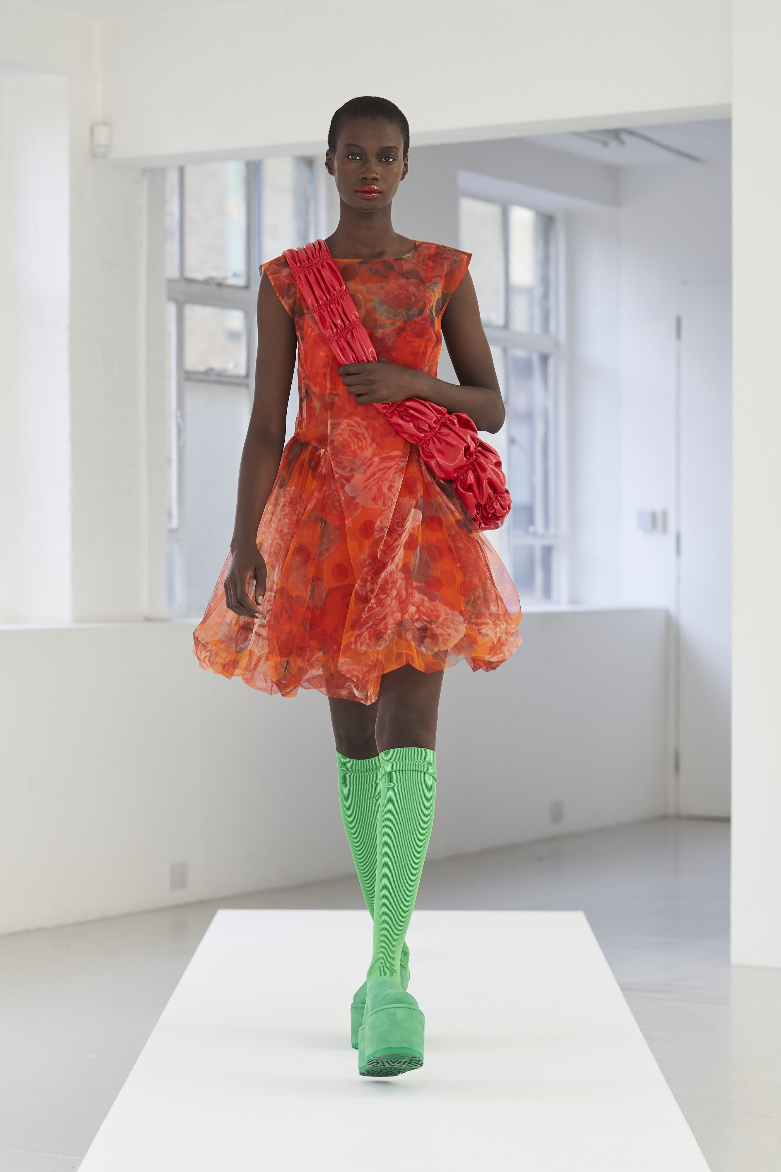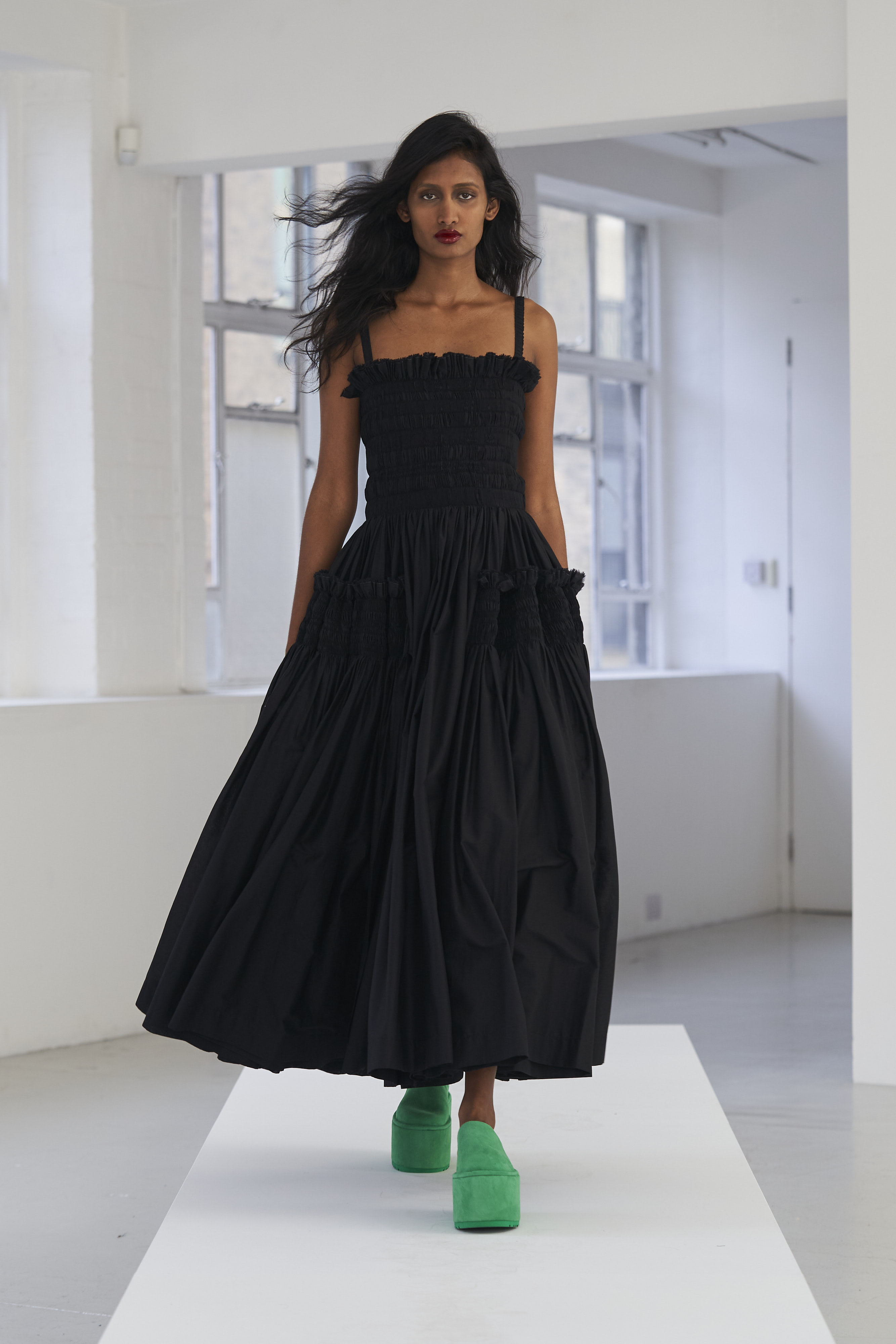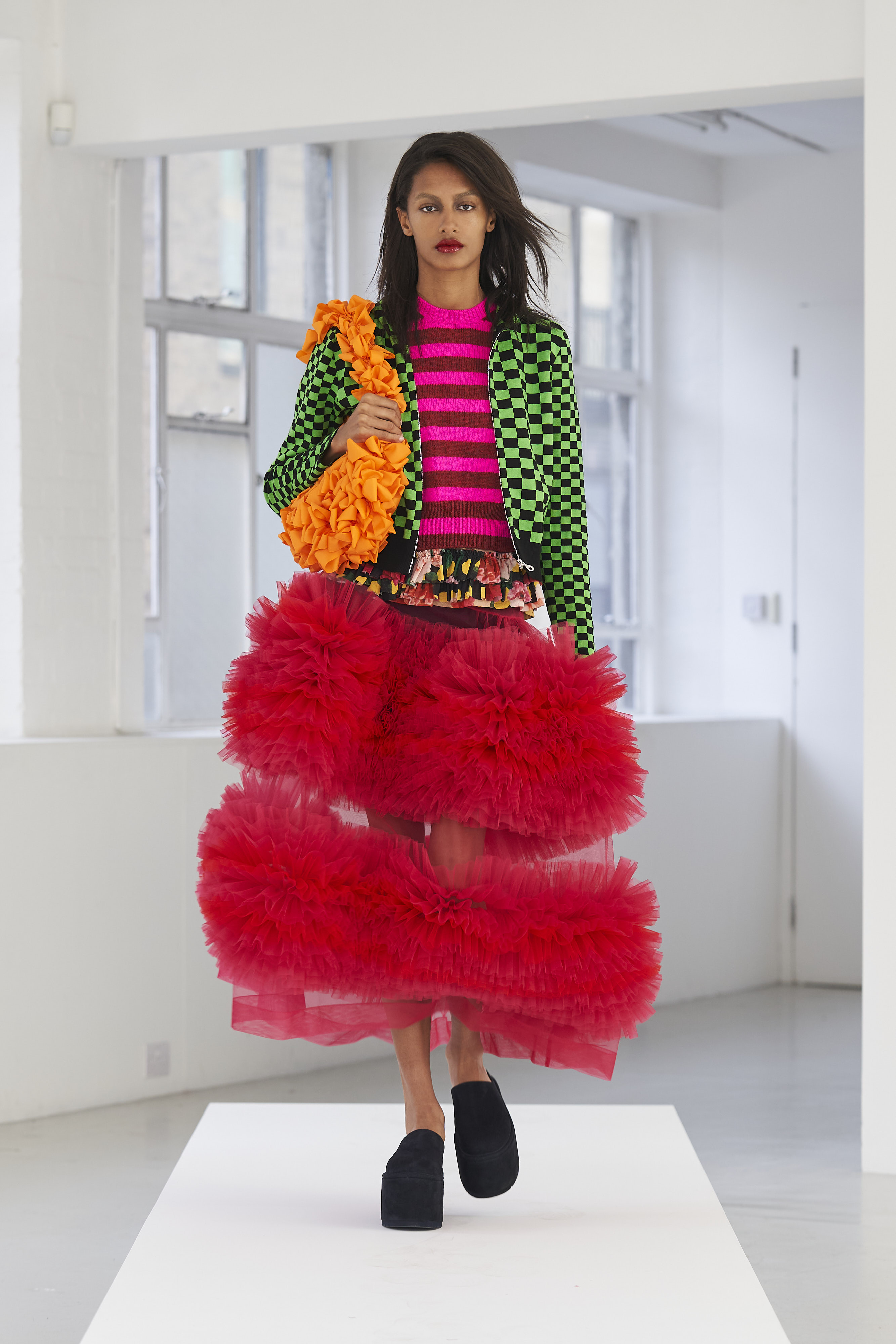 Дизайнер Молли Годдар провела показ новой коллекции в своей лондонской студии. Неоновые сумки из сатина модели несли поверх ярких свитеров в шахматный принт, фатиновых юбок и платьев с гиперобъемными аппликациями. Романтичные наряды в цветах чередовались с практичными и немного утилитарными платьями-балахонами. Экзотичный, но на деле – легко применимый в жизни, дизайн Молли Годдар разросся в новом сезоне до комфортных платьев-анораков, мягкой, будто домашней обуви (сотрудничество с Ugg) и знаковых пышных платьев, представленных в белом цвете, которые также станут идеальными для социально дистанцированной свадьбы.