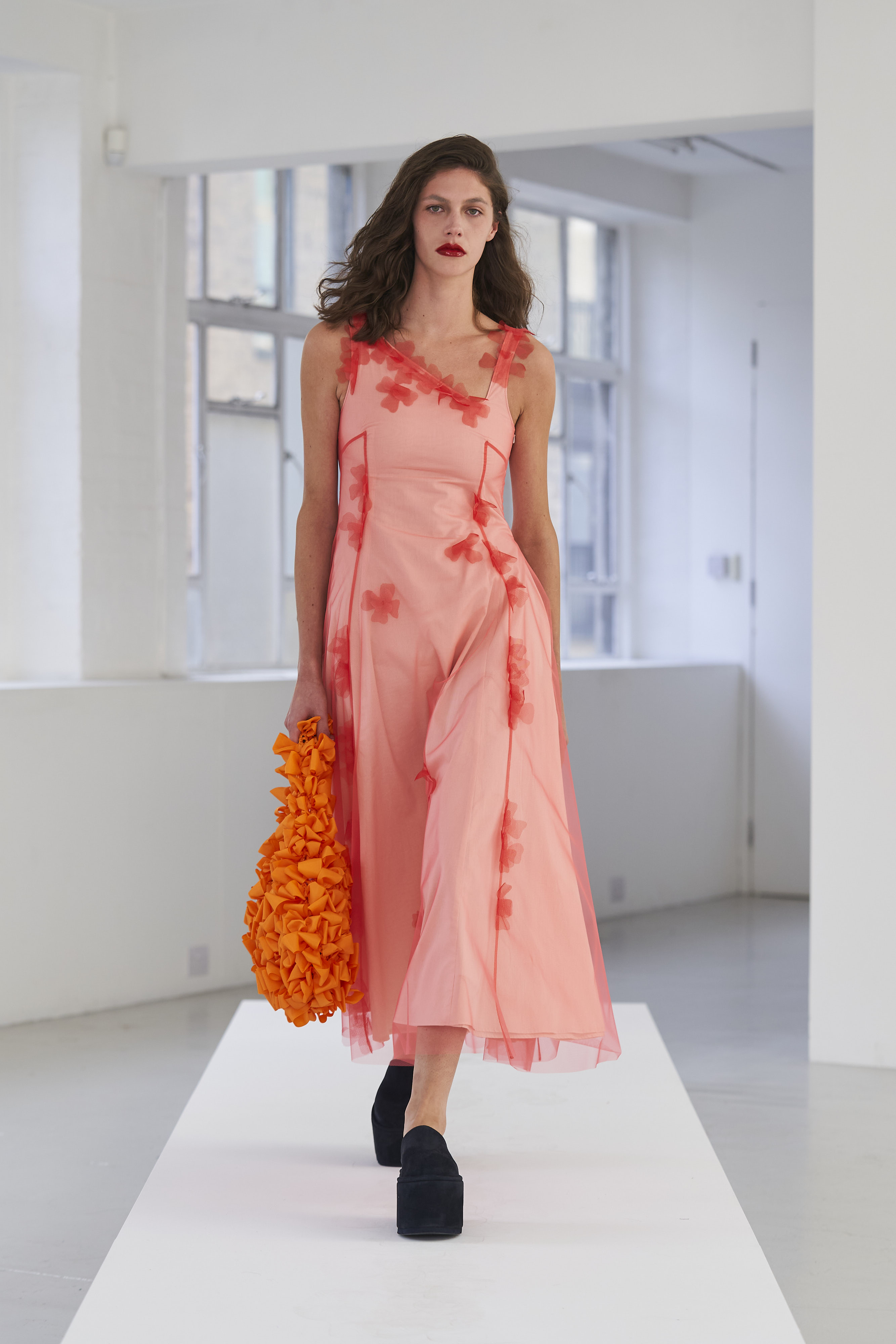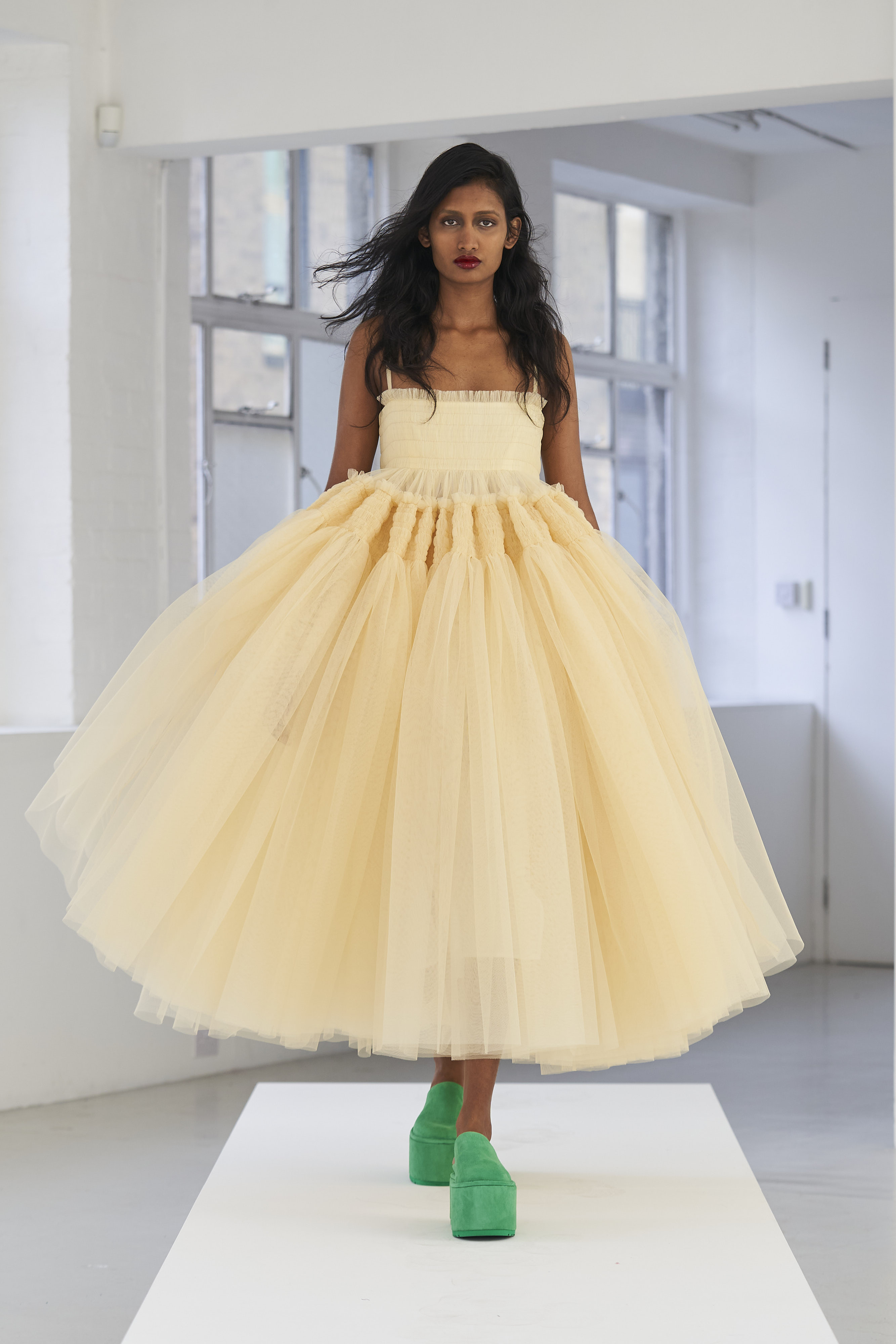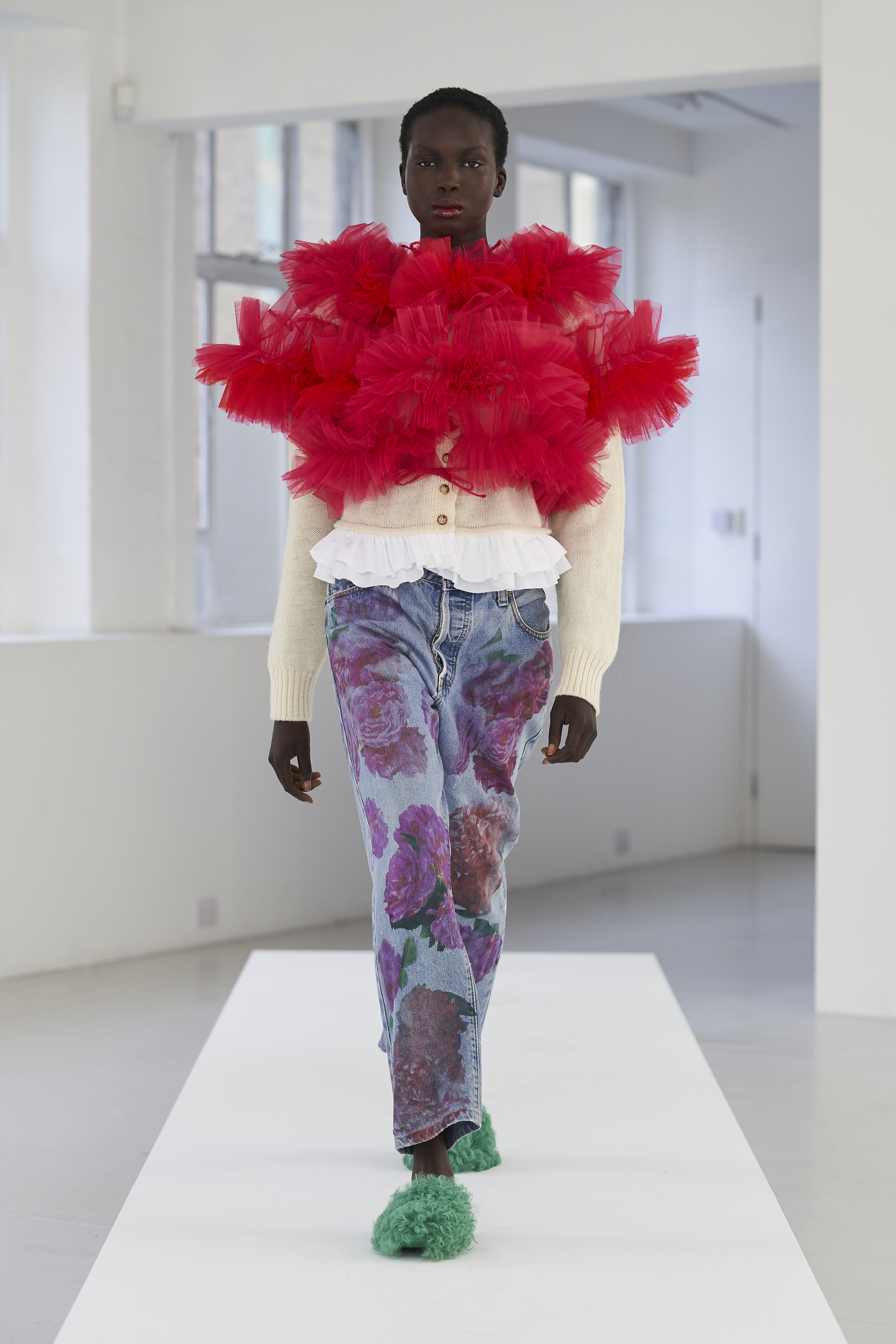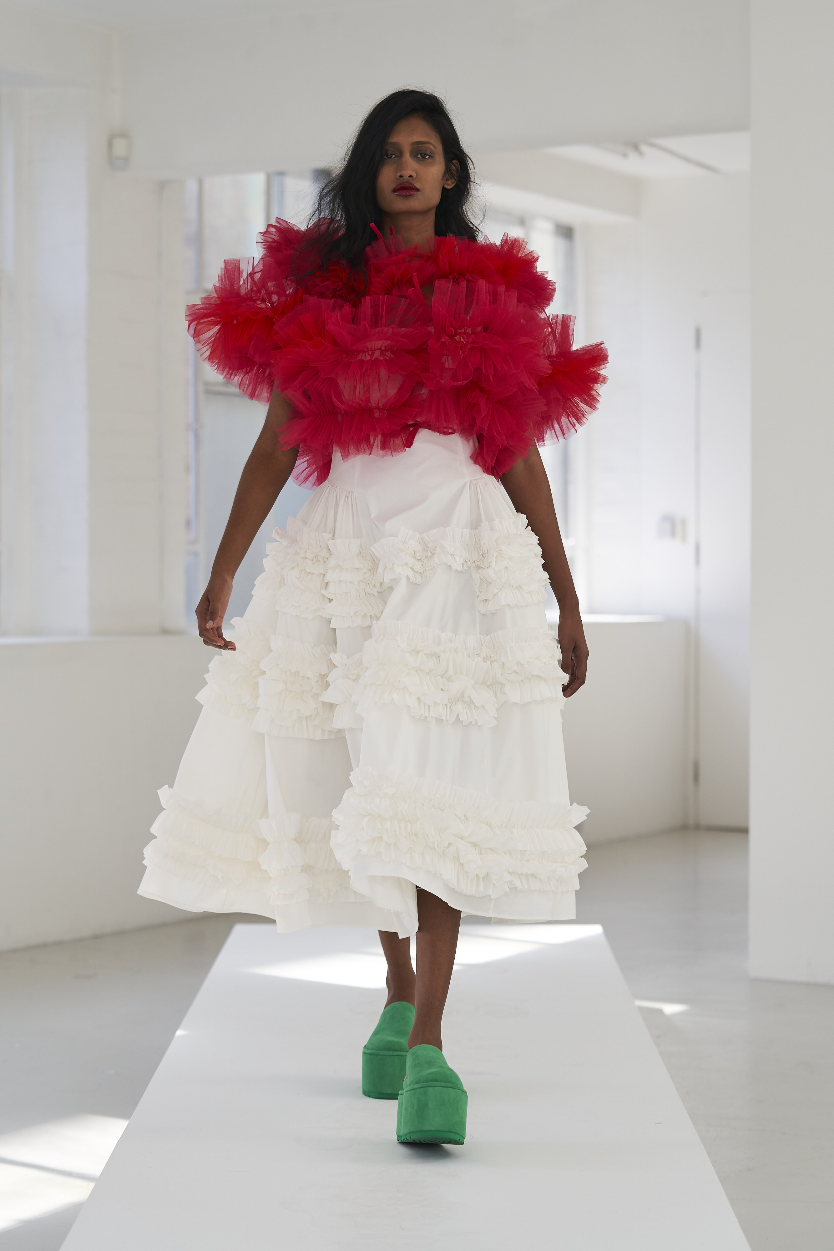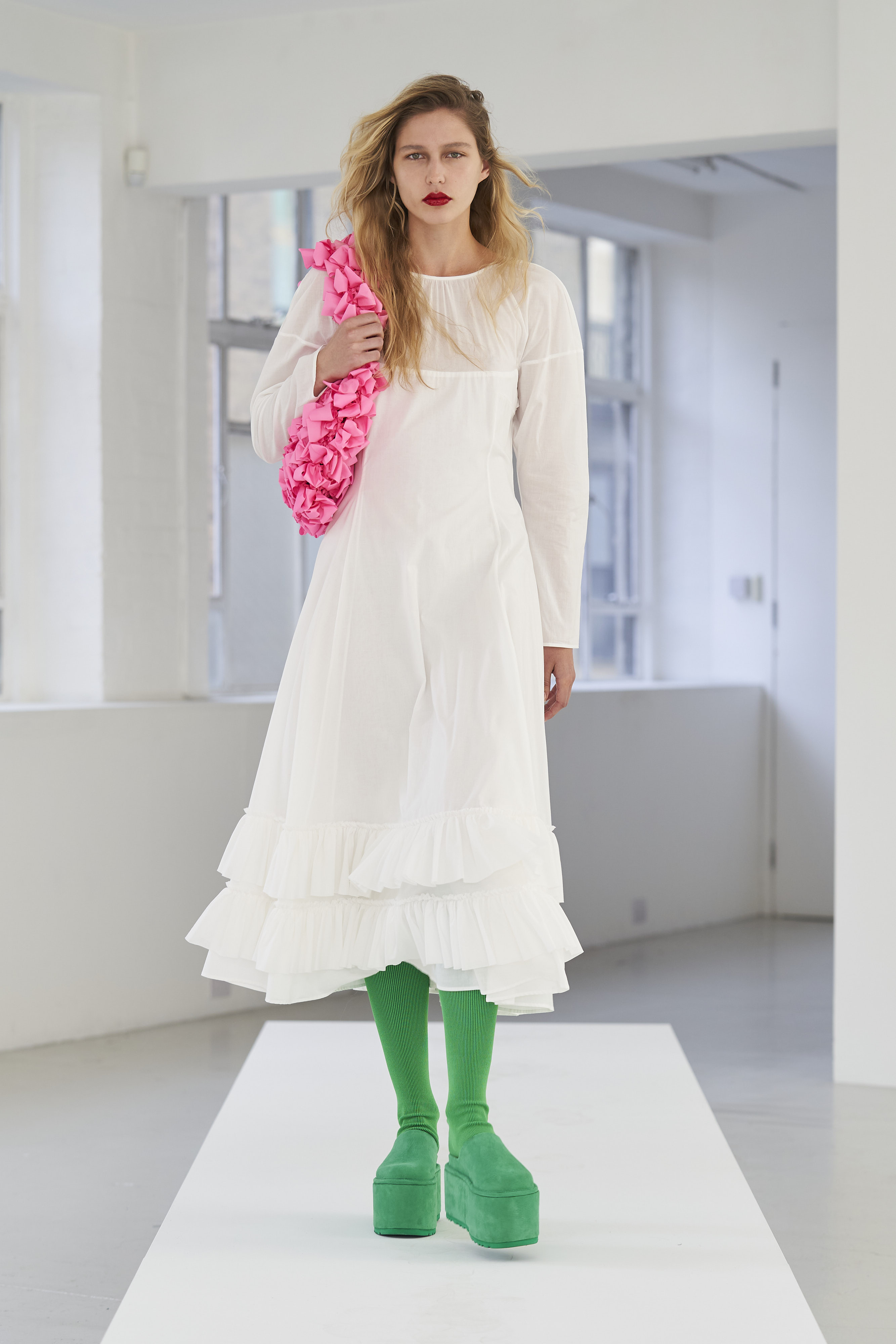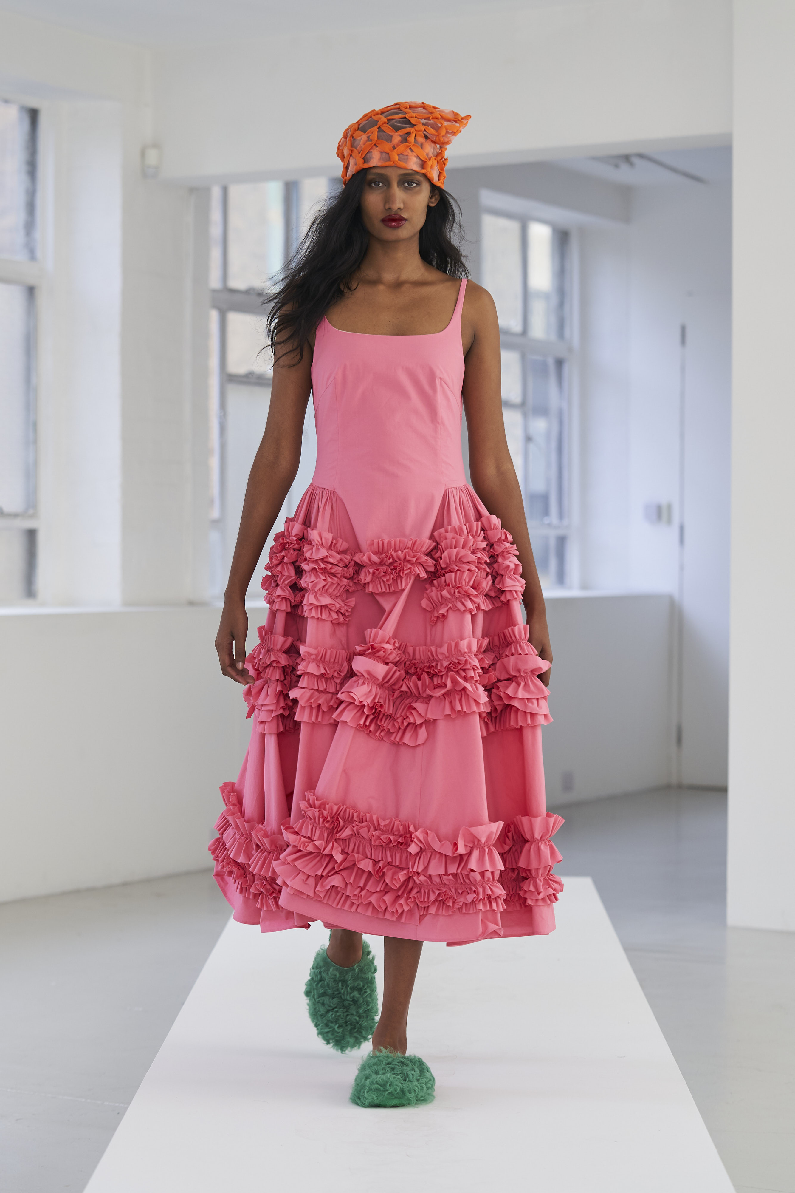 Дизайнер Молли Годдар провела показ новой коллекции в своей лондонской студии. Неоновые сумки из сатина модели несли поверх ярких свитеров в шахматный принт, фатиновых юбок и платьев с гиперобъемными аппликациями. Романтичные наряды в цветах чередовались с практичными и немного утилитарными платьями-балахонами. Экзотичный, но на деле – легко применимый в жизни, дизайн Молли Годдар разросся в новом сезоне до комфортных платьев-анораков, мягкой, будто домашней обуви (сотрудничество с Ugg) и знаковых пышных платьев, представленных в белом цвете, которые также станут идеальными для социально дистанцированной свадьбы.