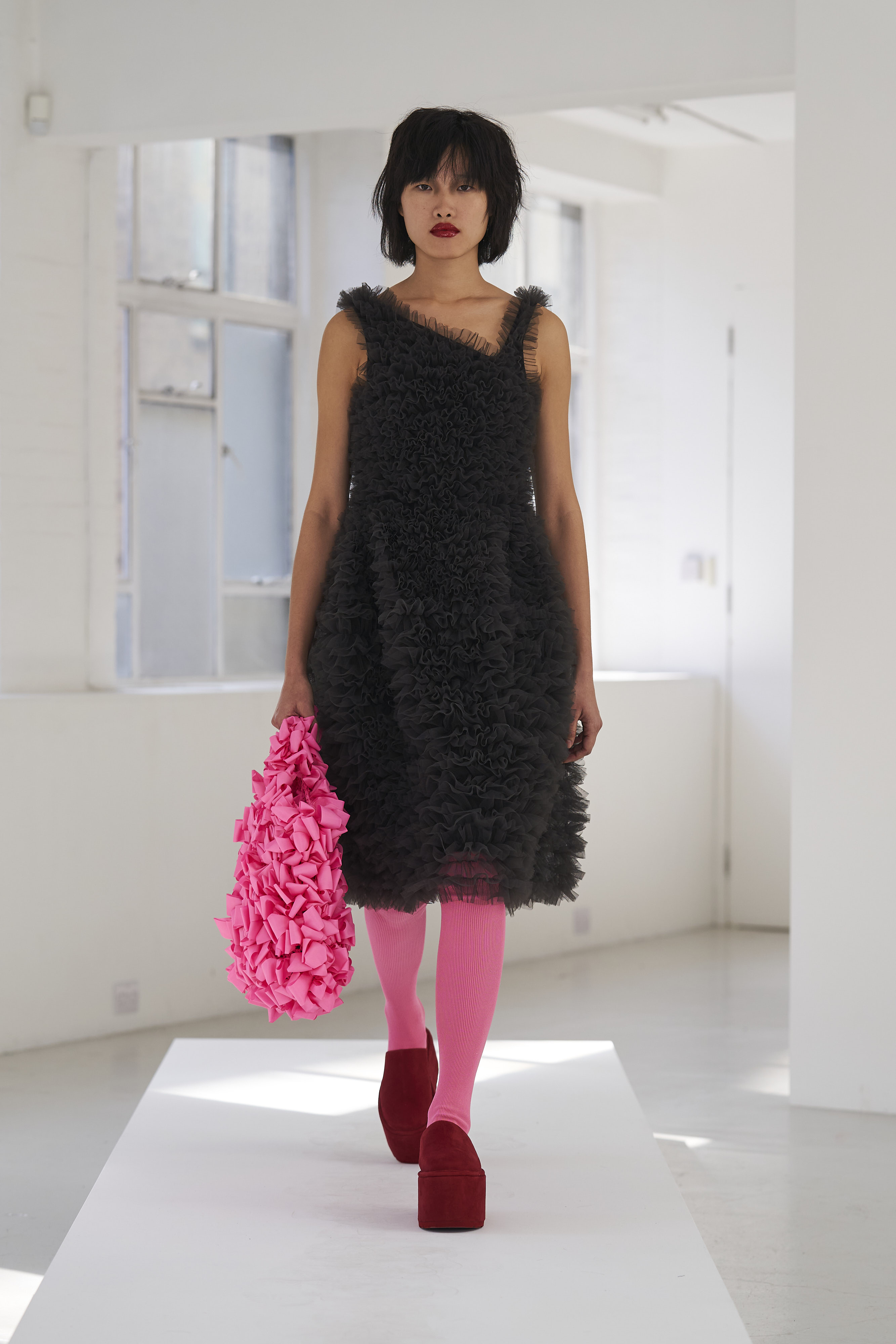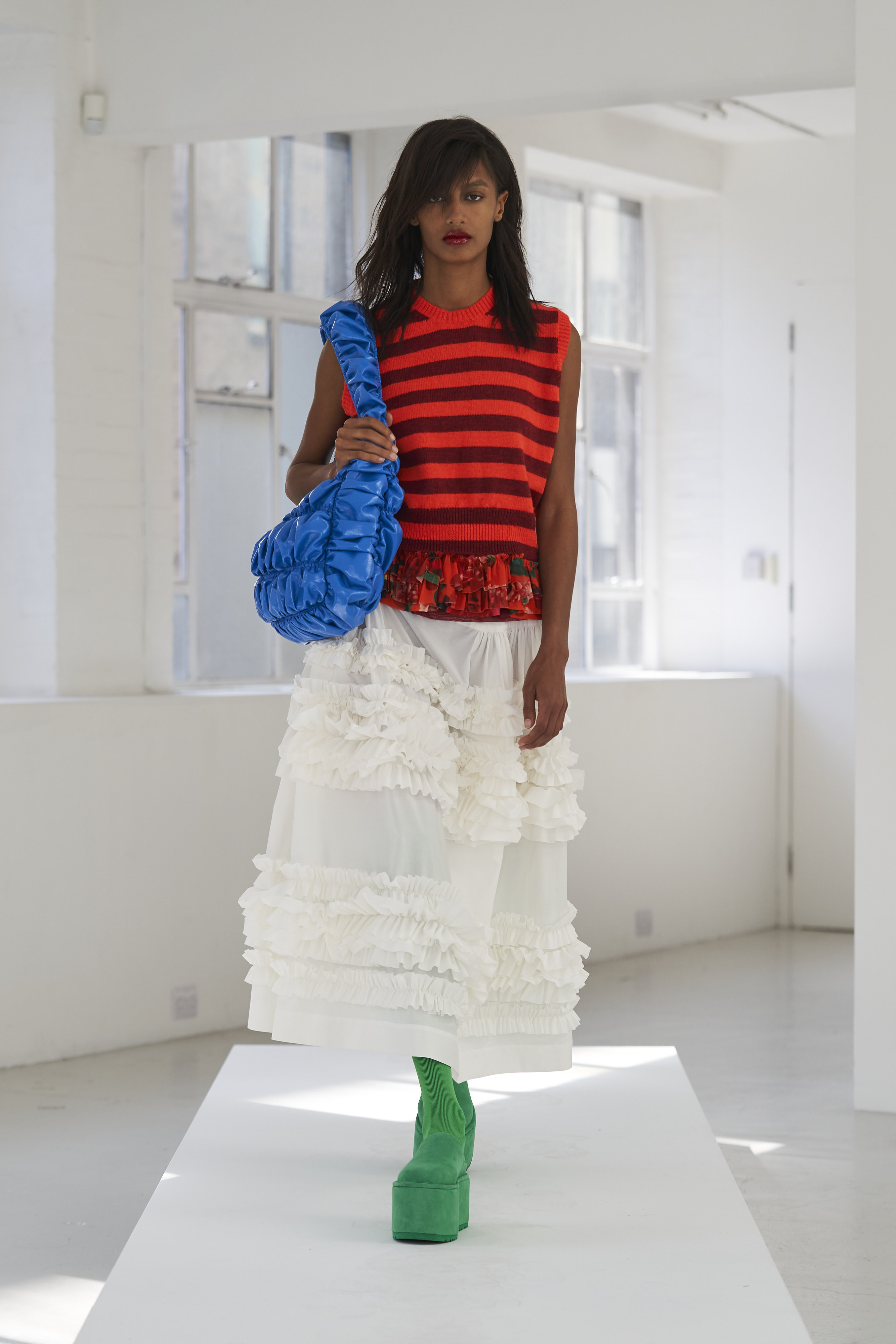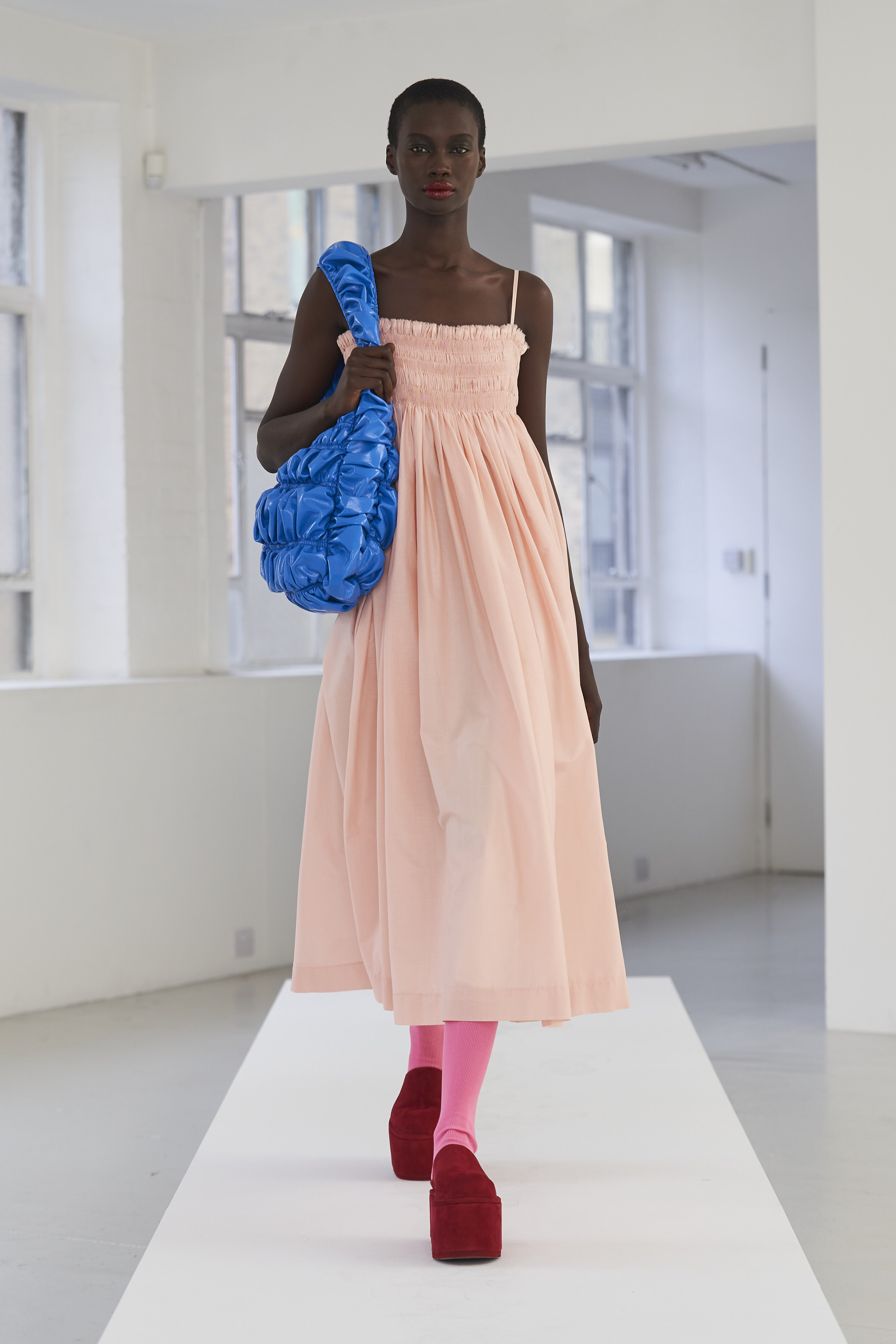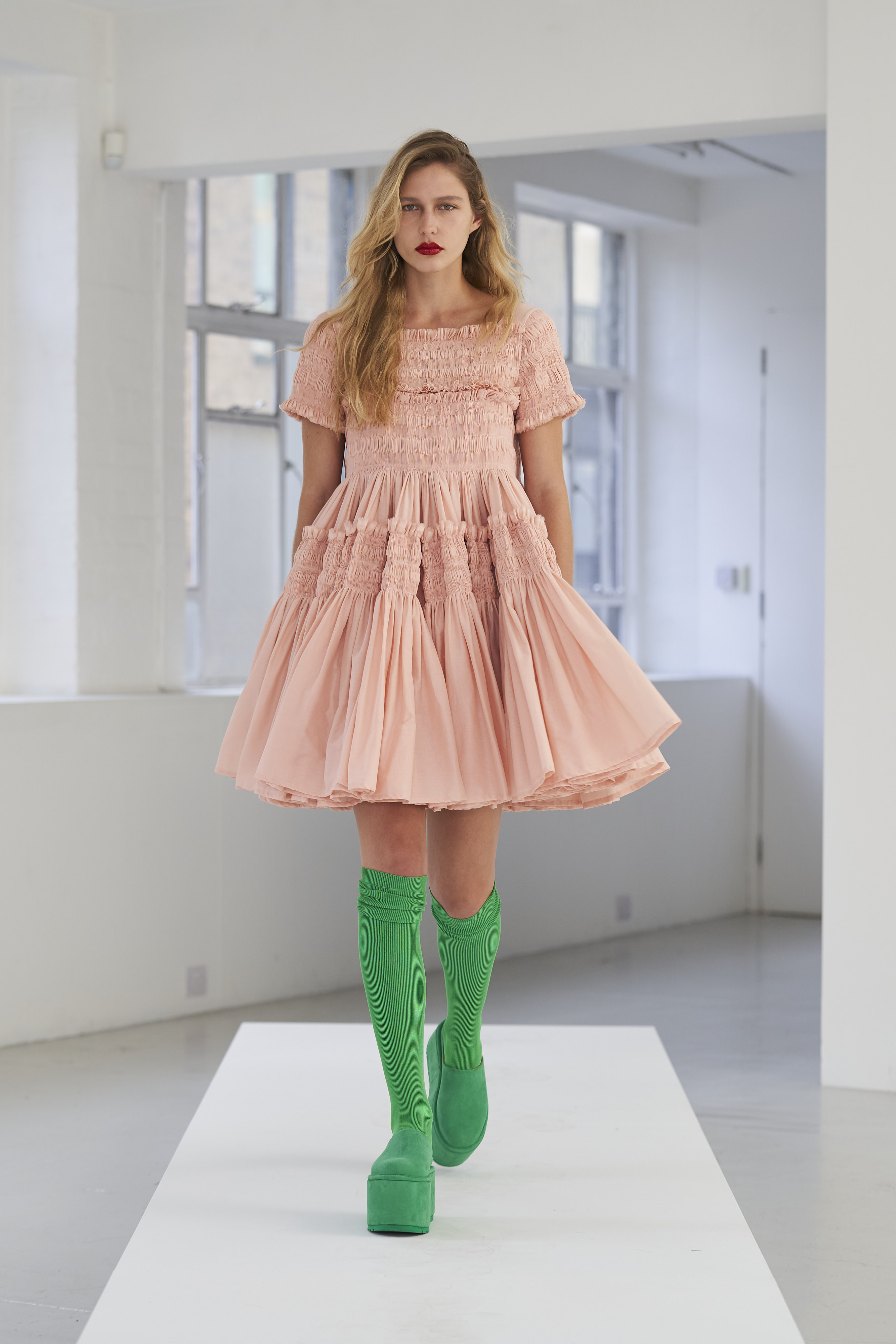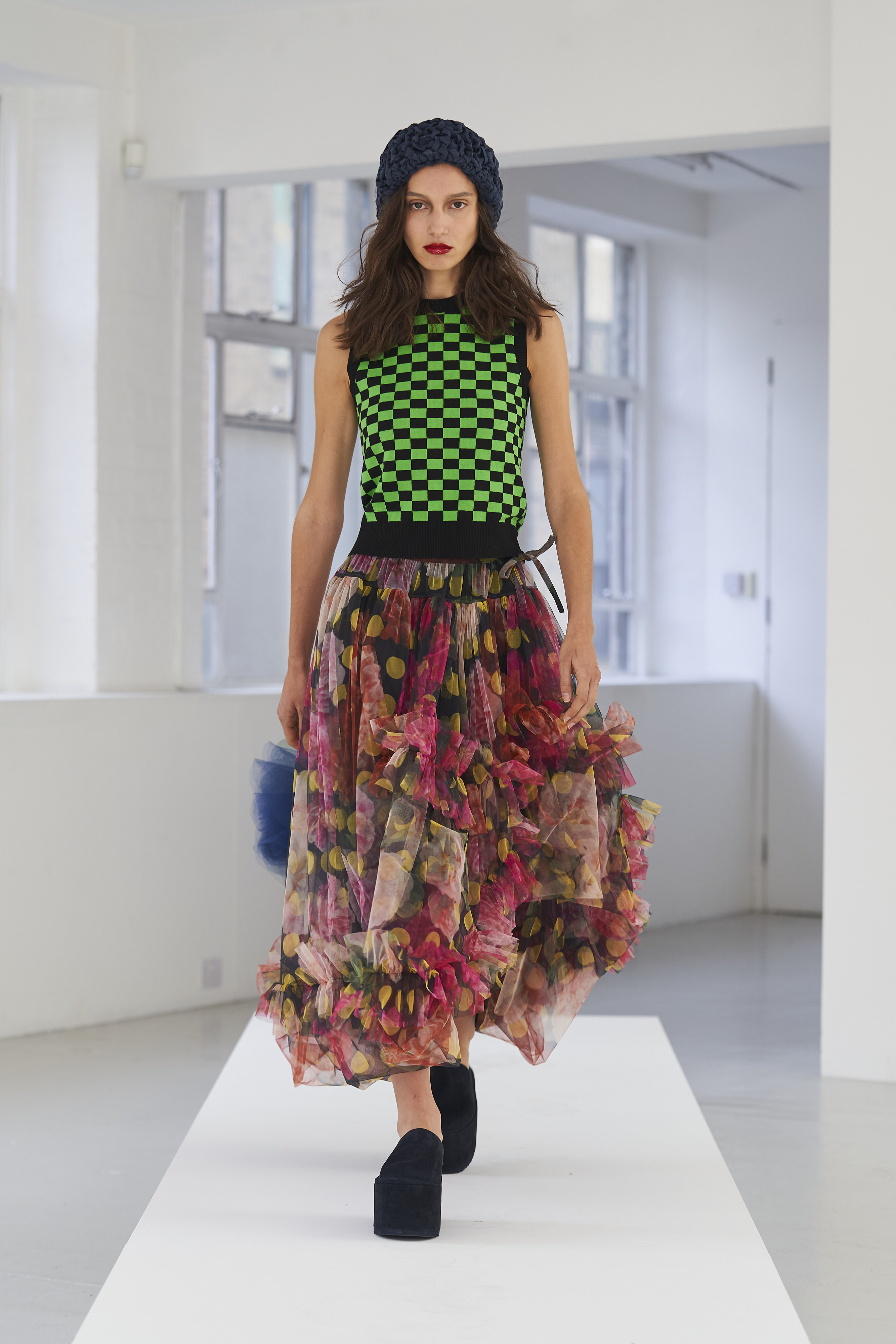 Дизайнер Молли Годдар провела показ новой коллекции в своей лондонской студии. Неоновые сумки из сатина модели несли поверх ярких свитеров в шахматный принт, фатиновых юбок и платьев с гиперобъемными аппликациями. Романтичные наряды в цветах чередовались с практичными и немного утилитарными платьями-балахонами. Экзотичный, но на деле – легко применимый в жизни, дизайн Молли Годдар разросся в новом сезоне до комфортных платьев-анораков, мягкой, будто домашней обуви (сотрудничество с Ugg) и знаковых пышных платьев, представленных в белом цвете, которые также станут идеальными для социально дистанцированной свадьбы.