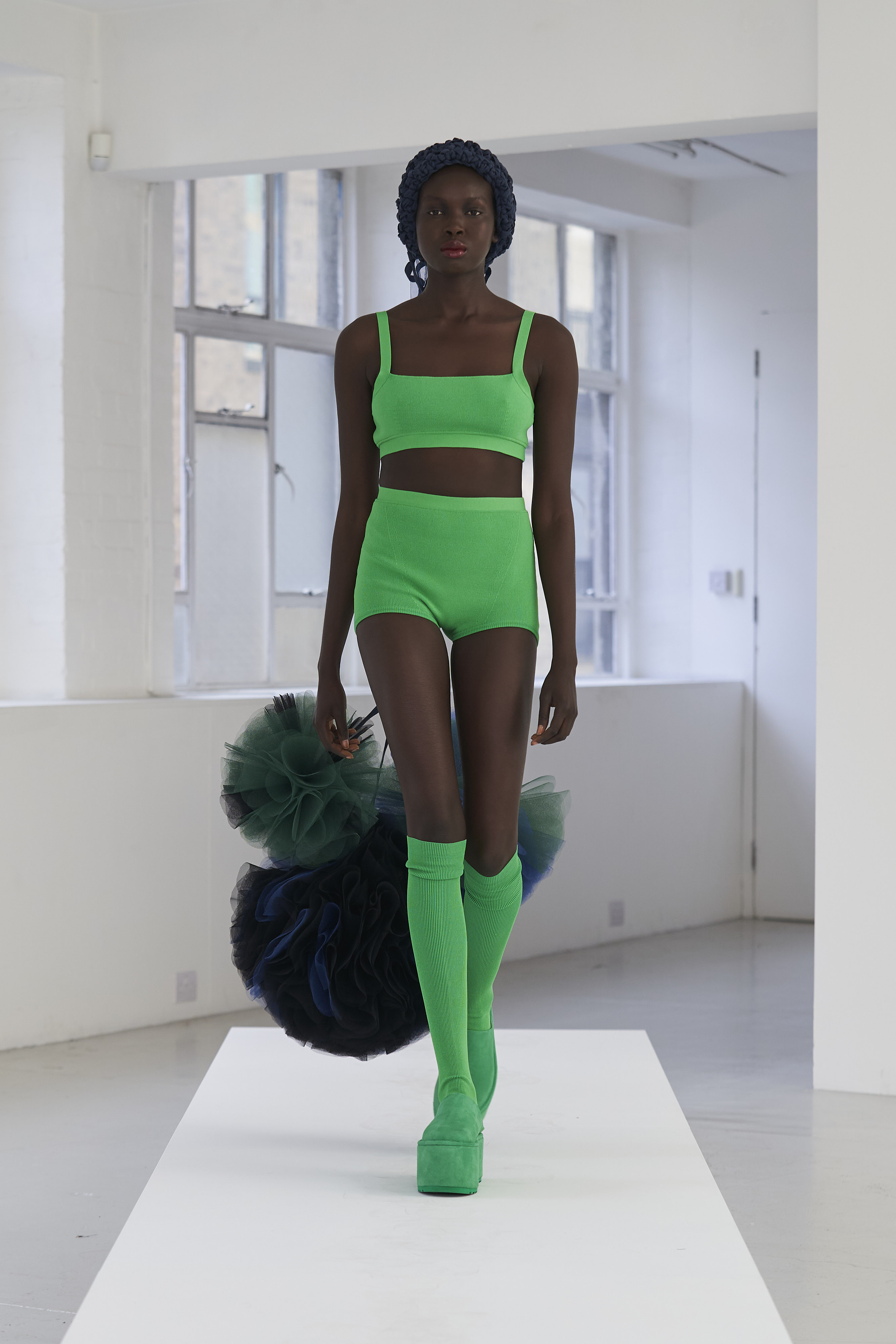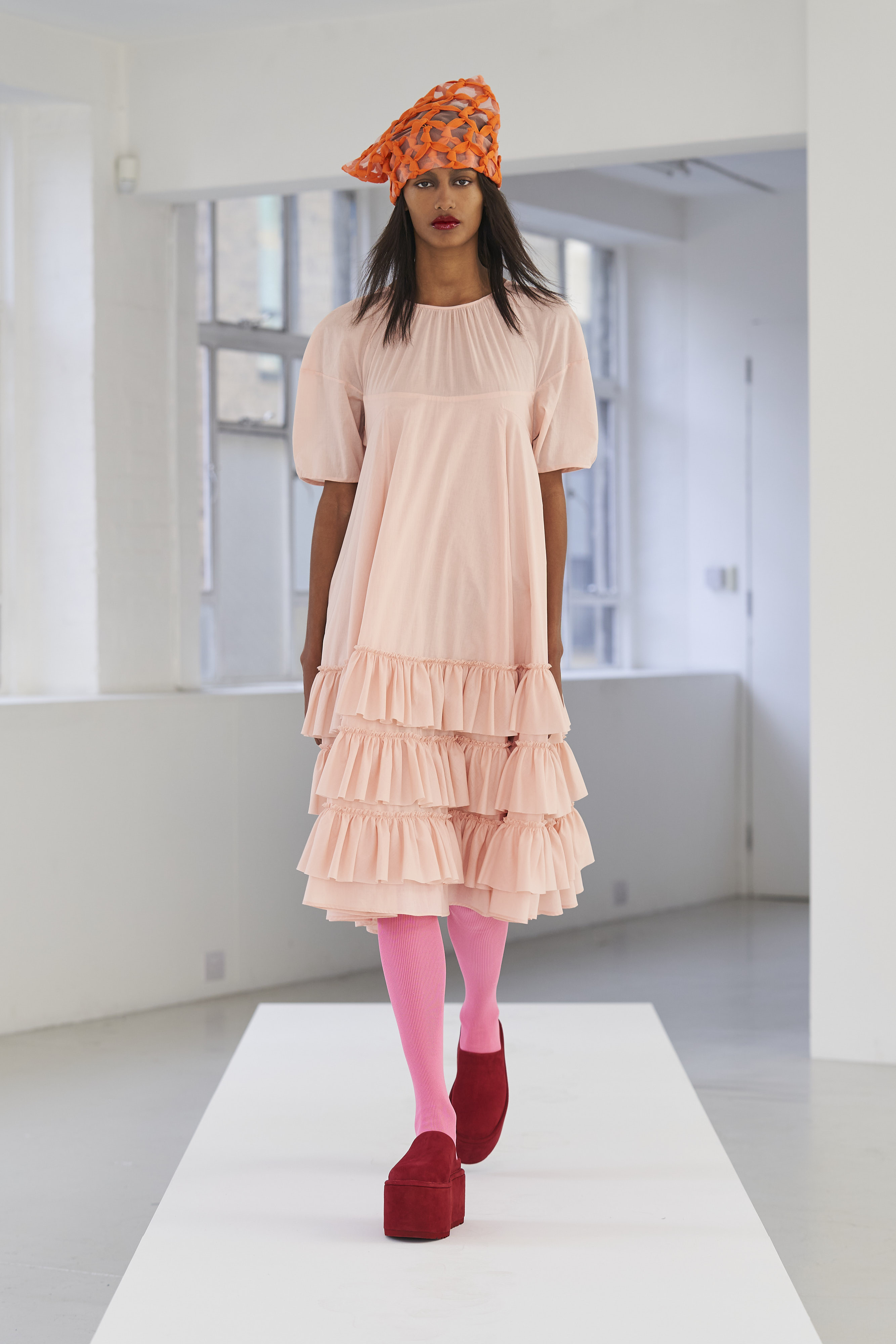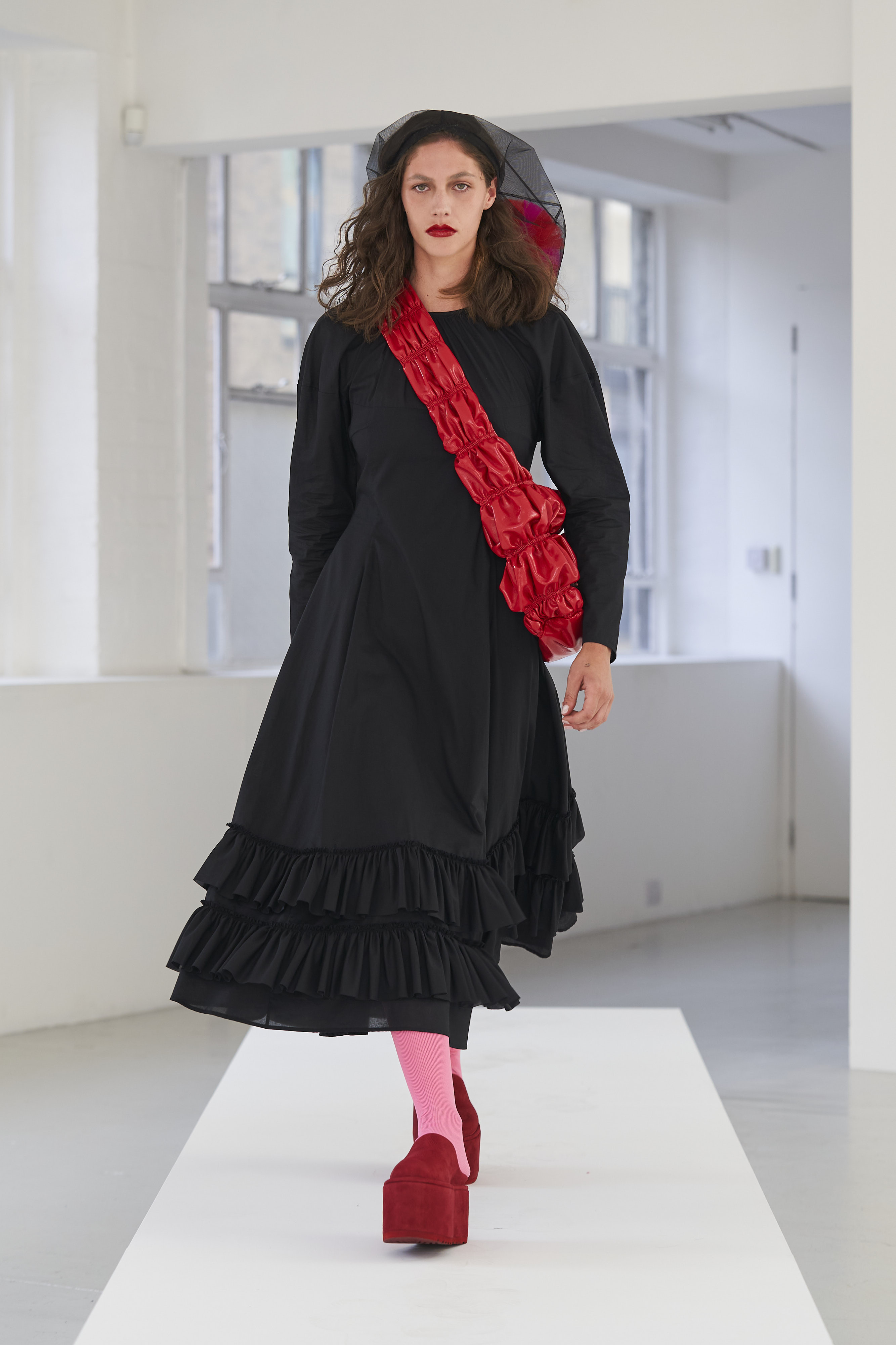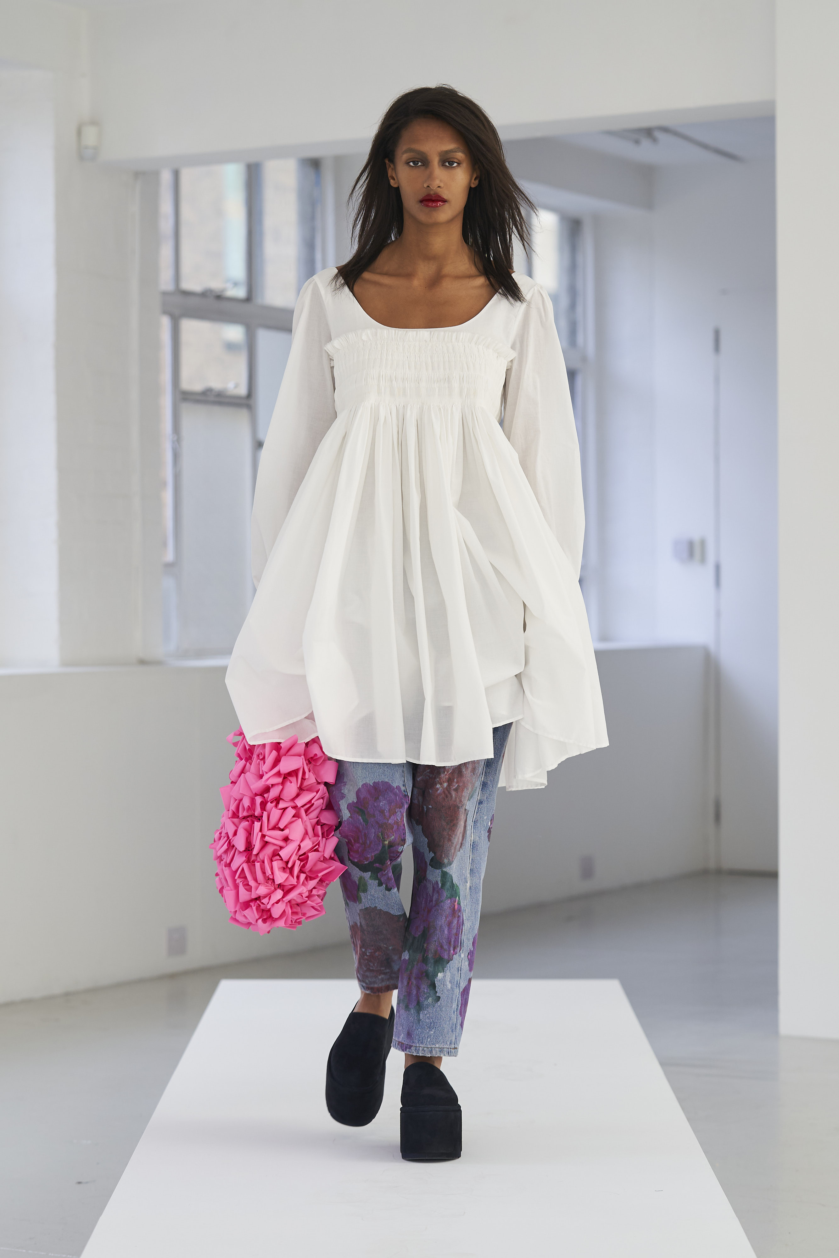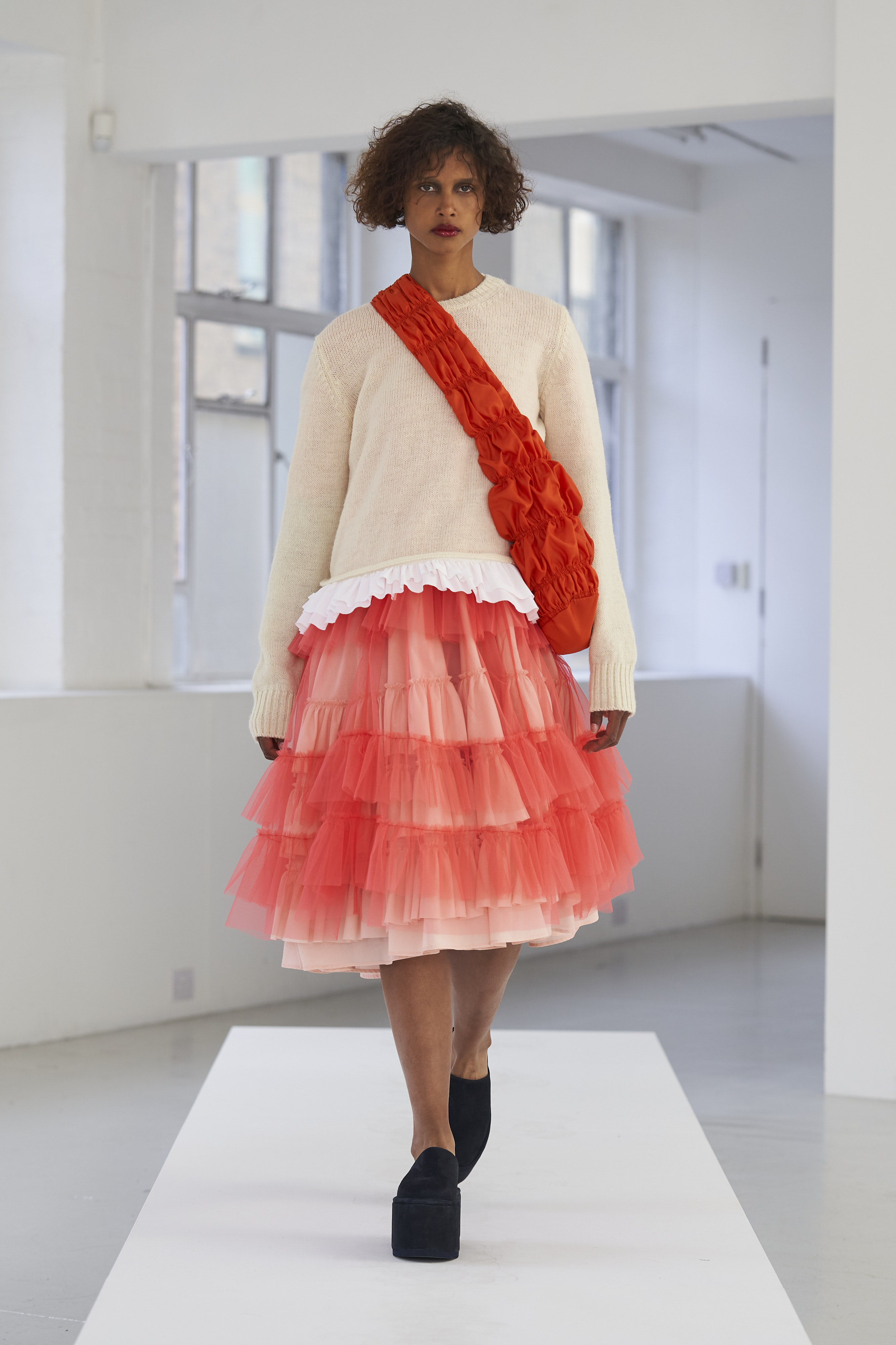 Дизайнер Молли Годдар провела показ новой коллекции в своей лондонской студии. Неоновые сумки из сатина модели несли поверх ярких свитеров в шахматный принт, фатиновых юбок и платьев с гиперобъемными аппликациями. Романтичные наряды в цветах чередовались с практичными и немного утилитарными платьями-балахонами. Экзотичный, но на деле – легко применимый в жизни, дизайн Молли Годдар разросся в новом сезоне до комфортных платьев-анораков, мягкой, будто домашней обуви (сотрудничество с Ugg) и знаковых пышных платьев, представленных в белом цвете, которые также станут идеальными для социально дистанцированной свадьбы.