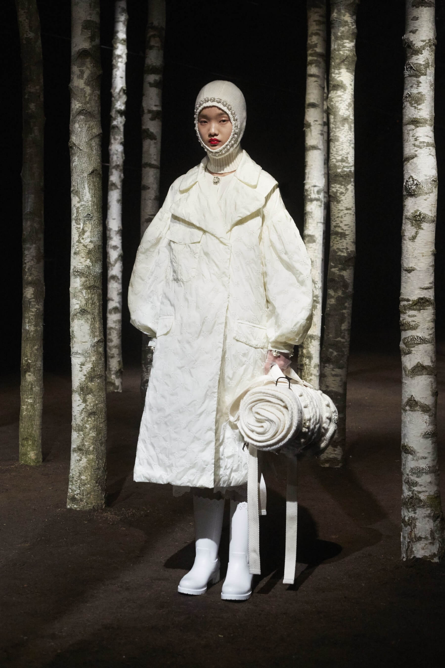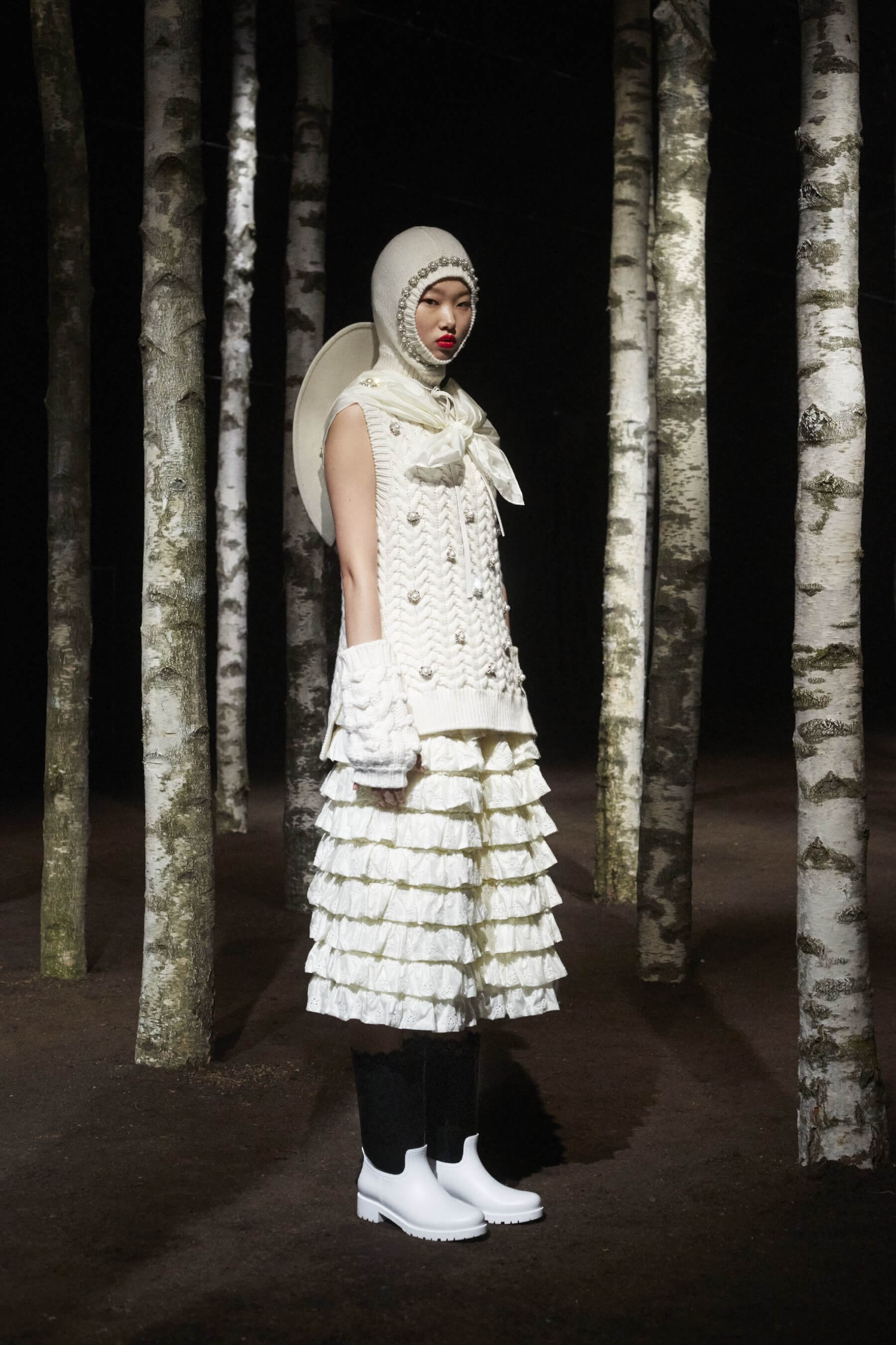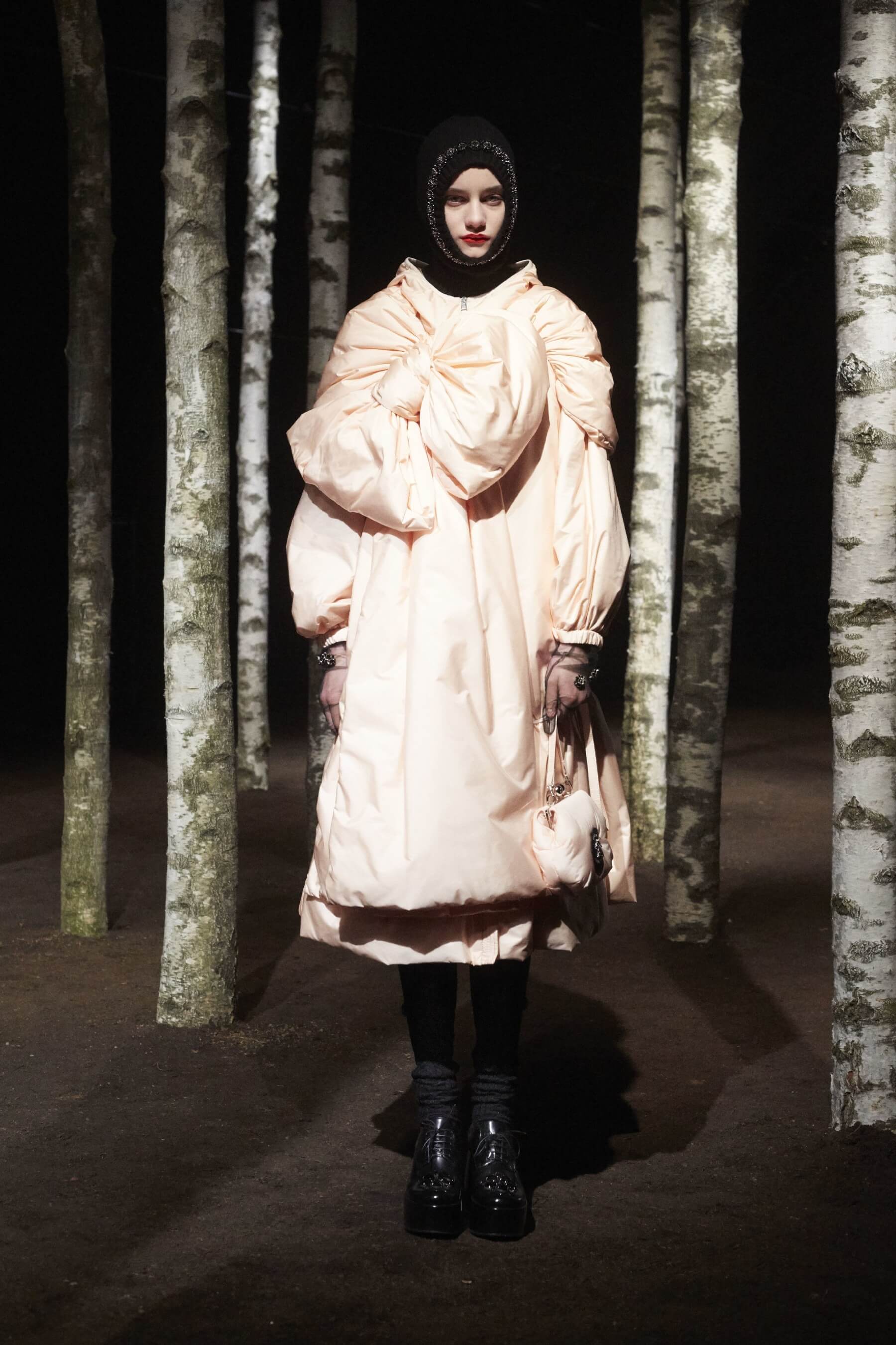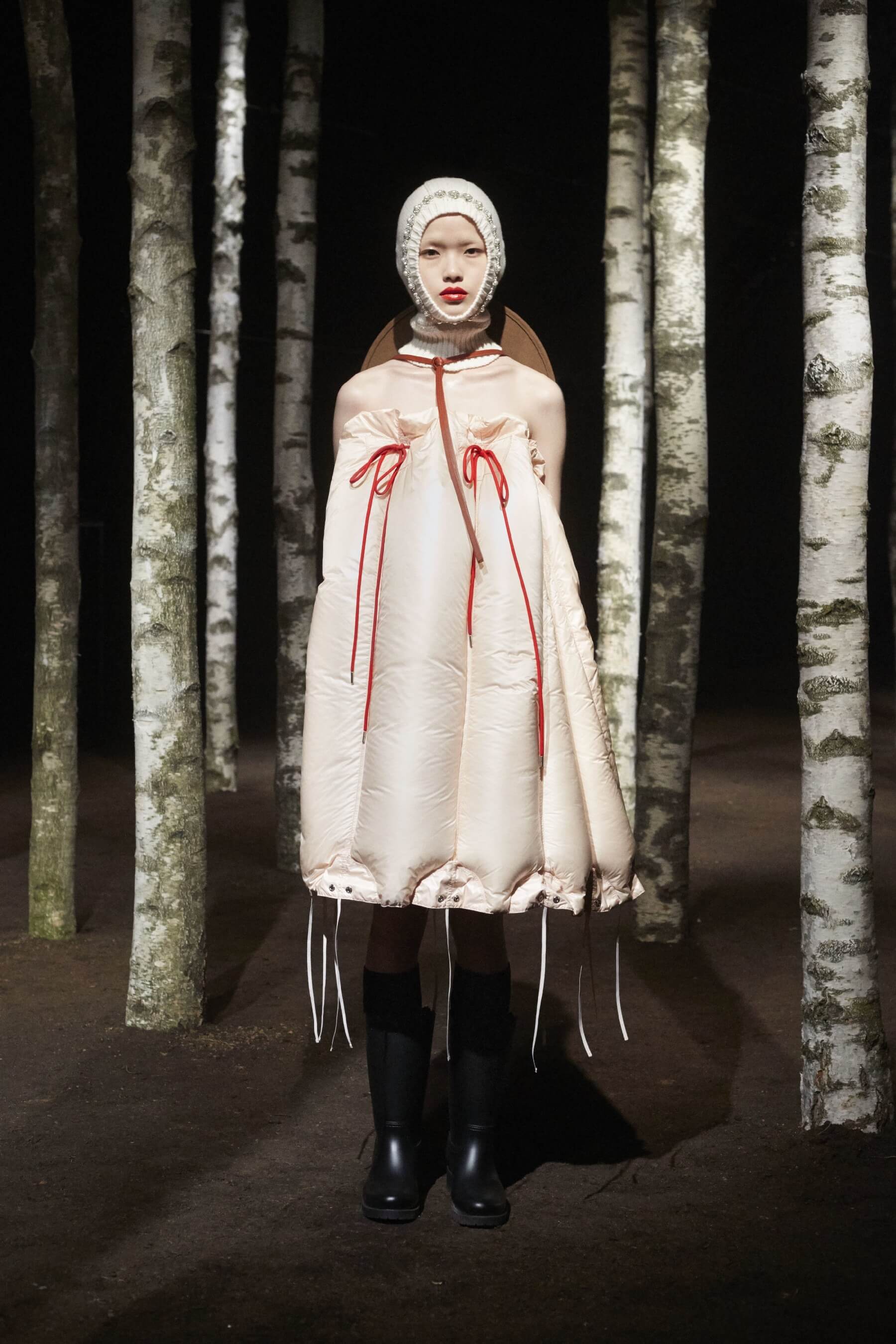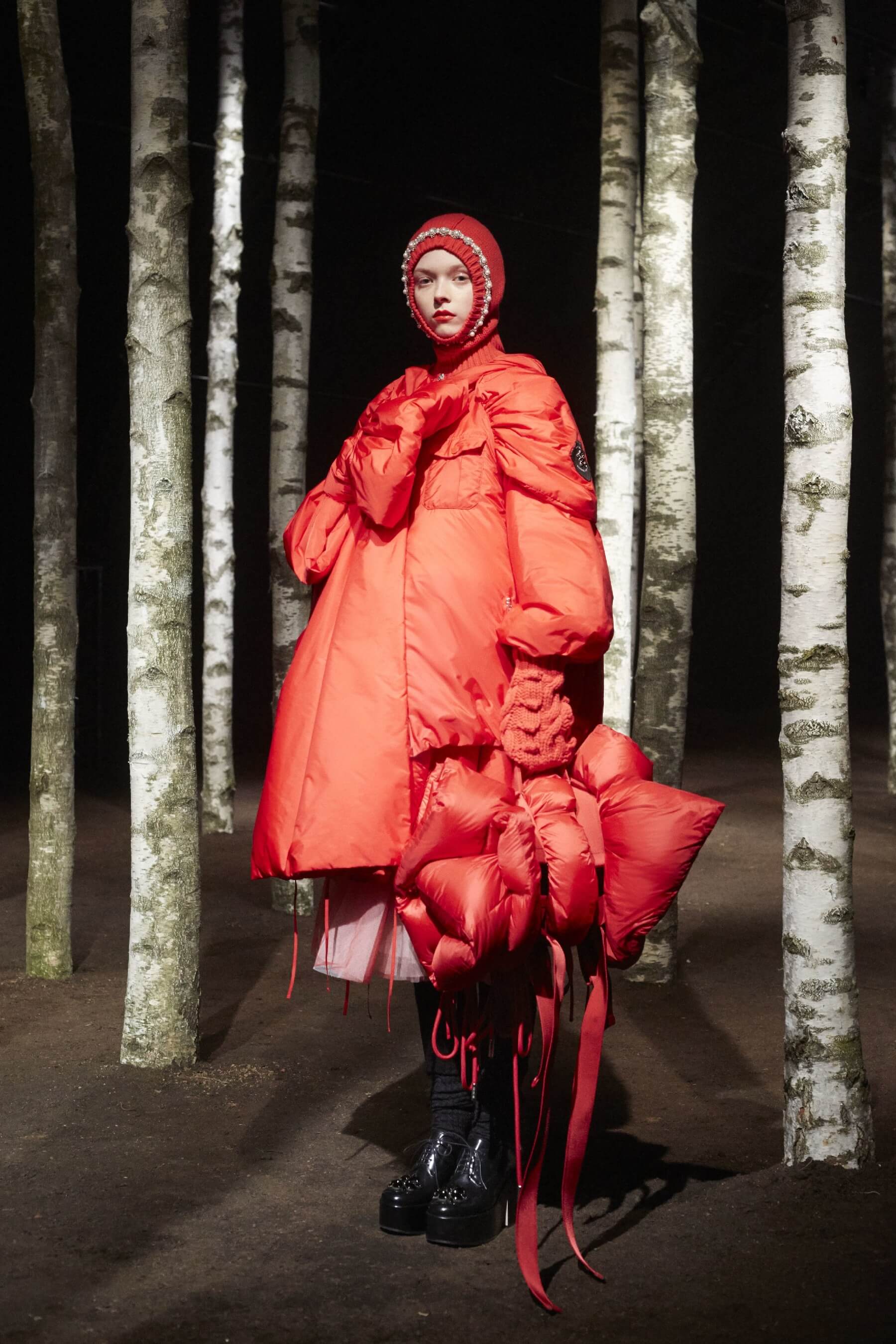 Модели у Симон Роша ходили по таинственному лесу в романтичных пуховиках с бантами, объёмных платьях со множеством оборок, кейпах и куртках, напоминающих перевязанные шнурами тенты и палатки. Головные уборы в виде изящных шапочек дополняли образы.