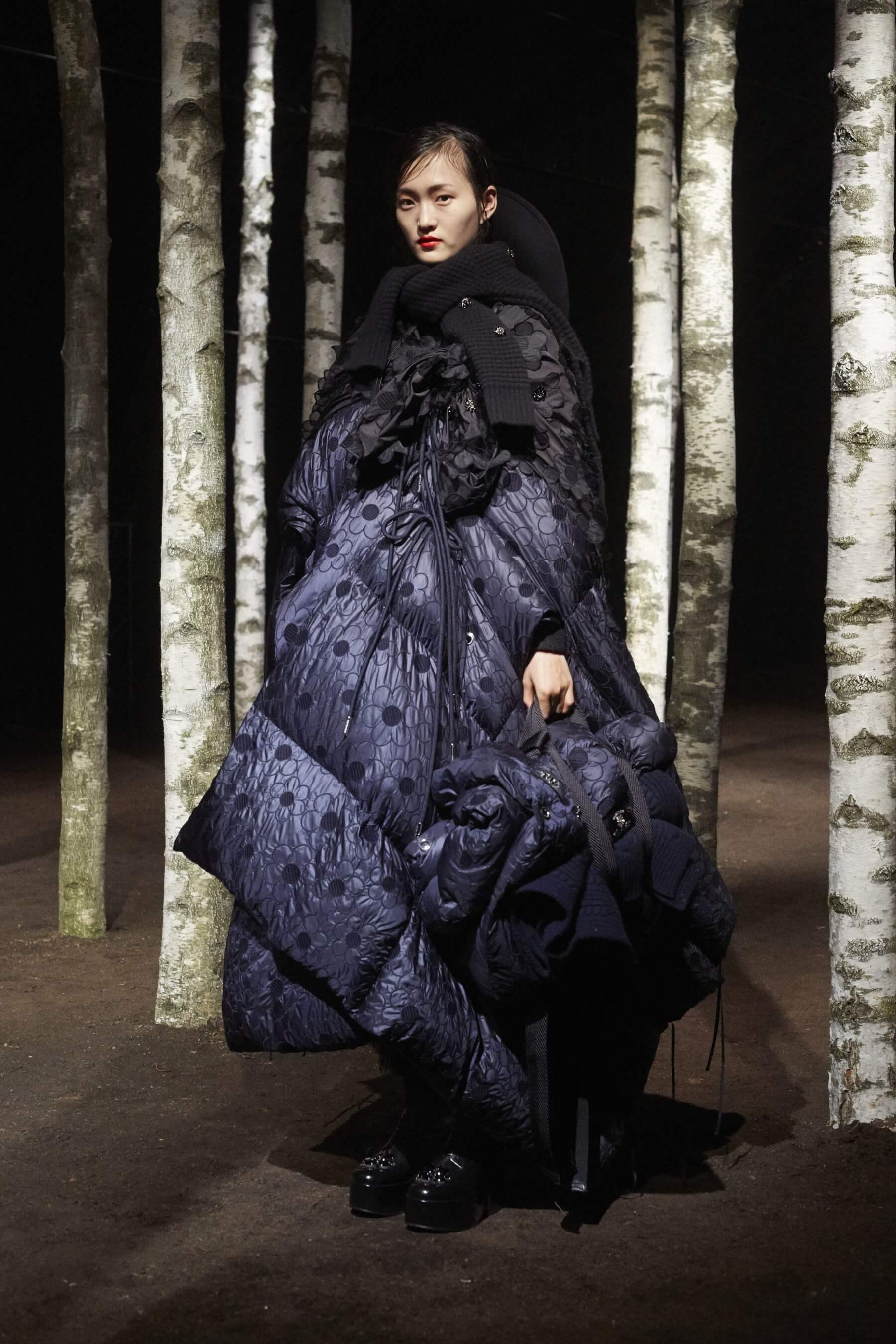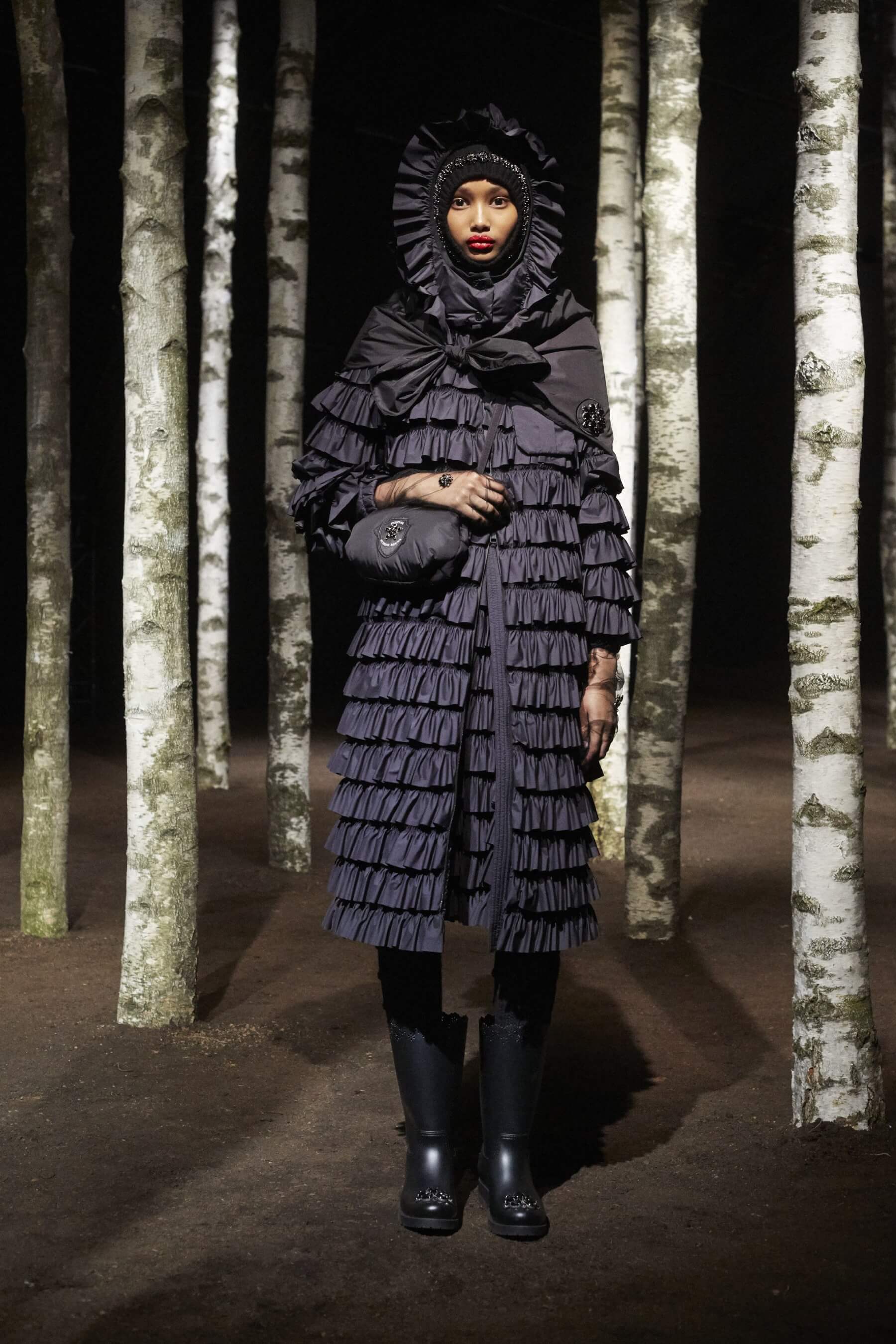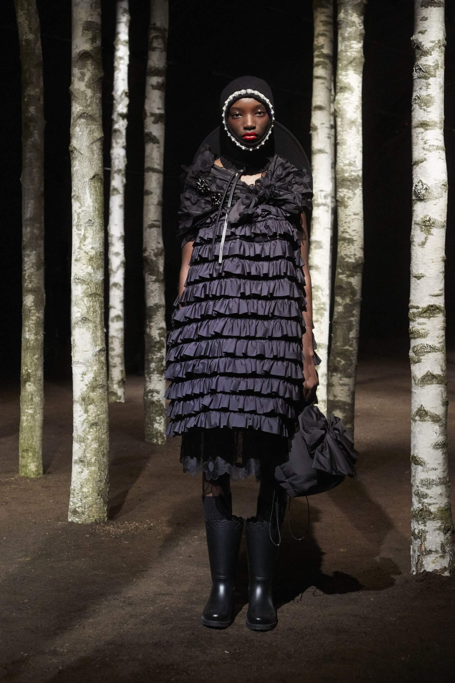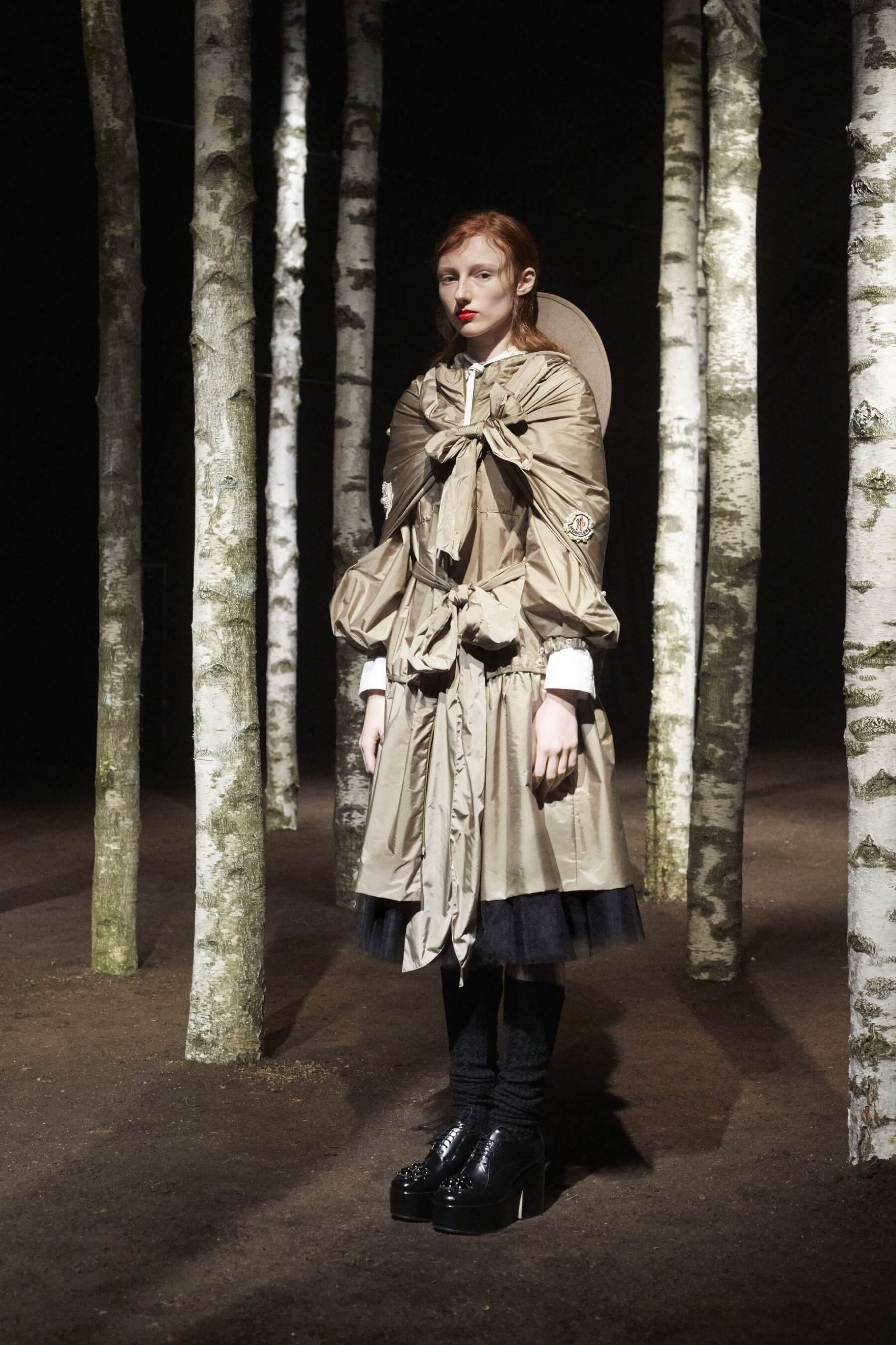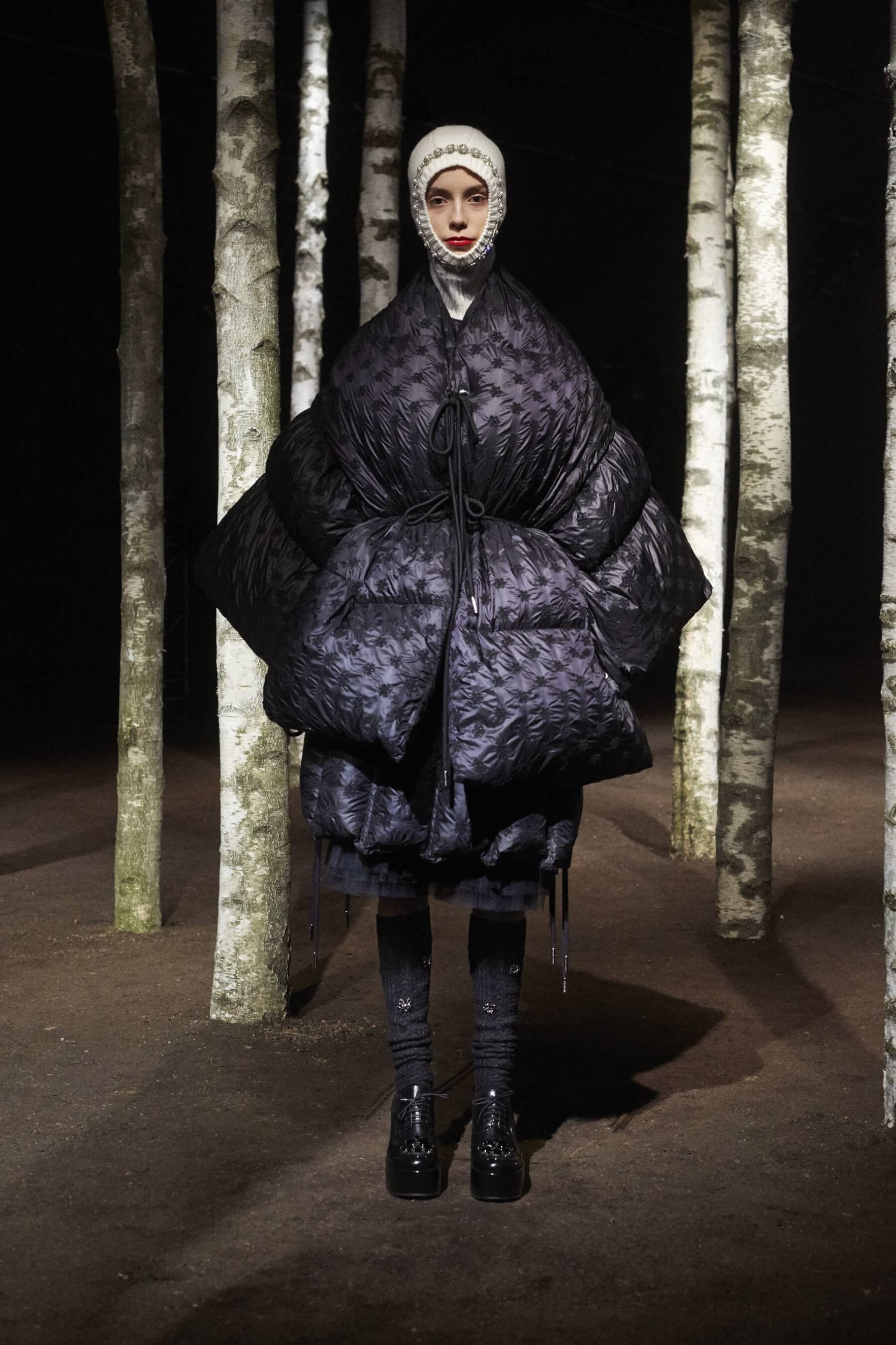 Модели у Симон Роша ходили по таинственному лесу в романтичных пуховиках с бантами, объёмных платьях со множеством оборок, кейпах и куртках, напоминающих перевязанные шнурами тенты и палатки. Головные уборы в виде изящных шапочек дополняли образы.