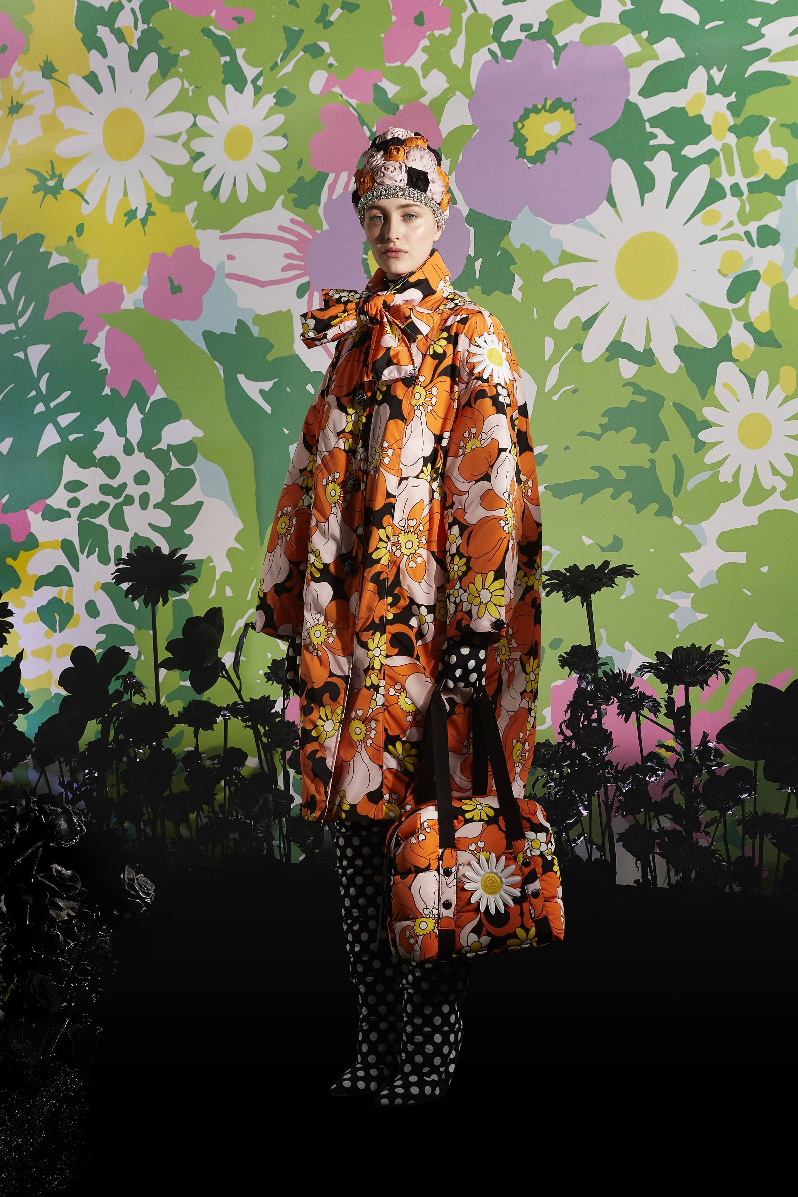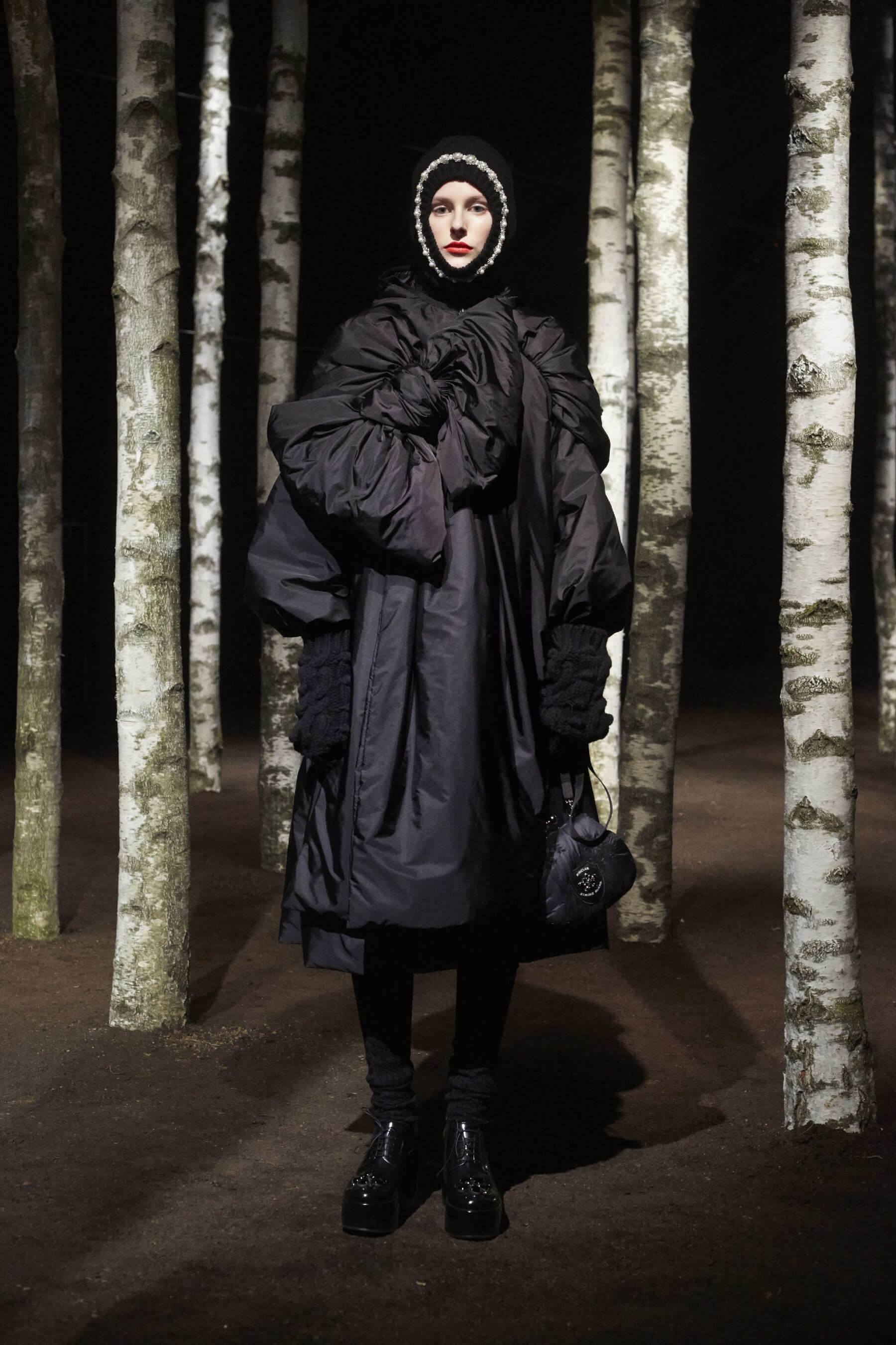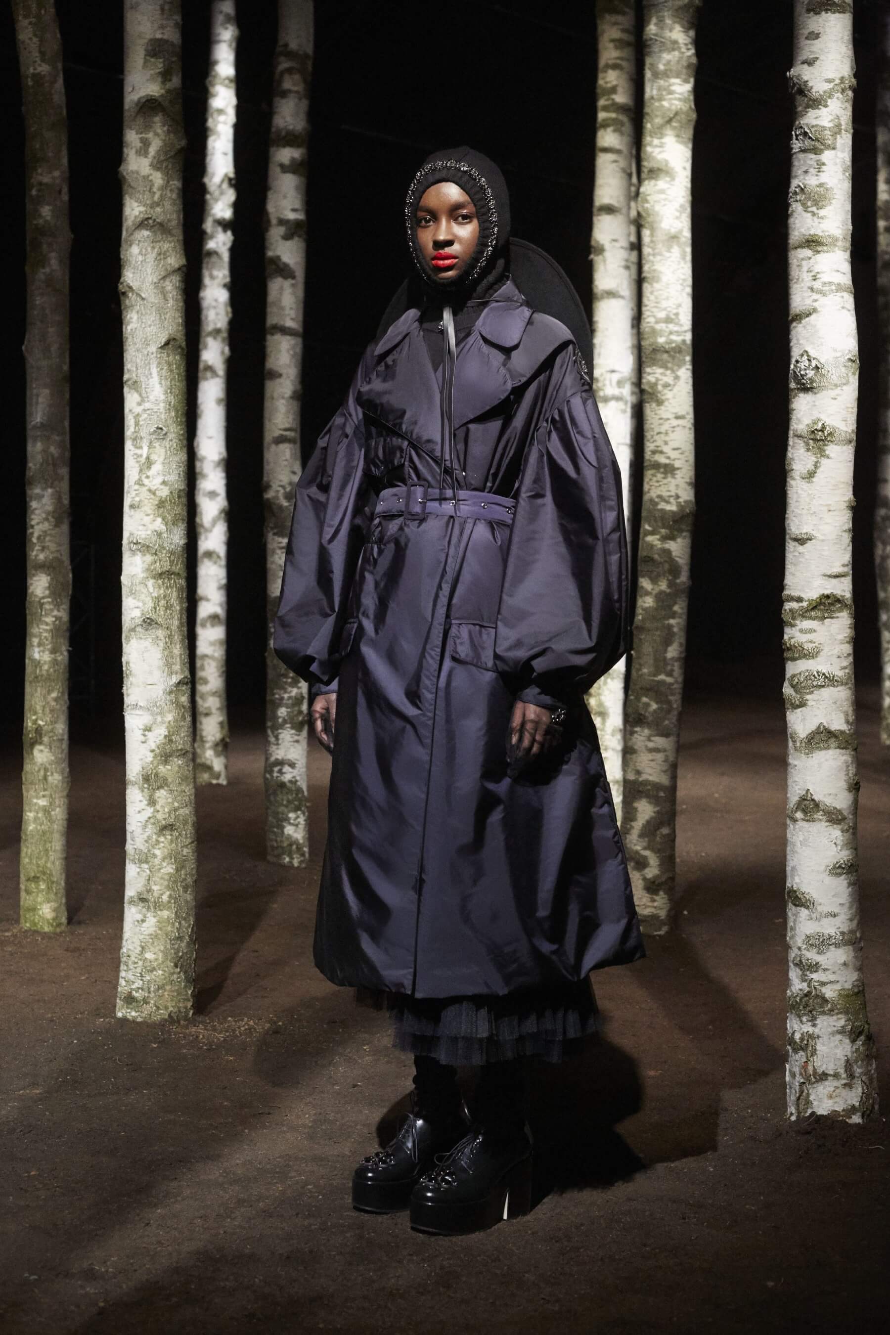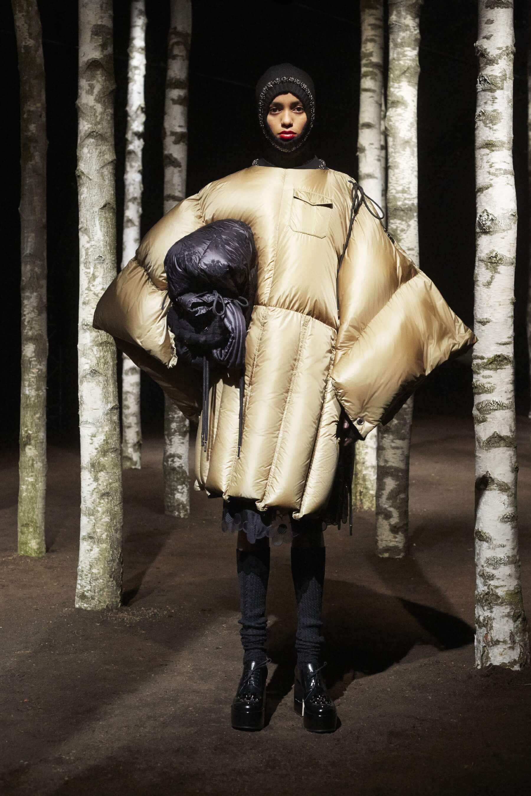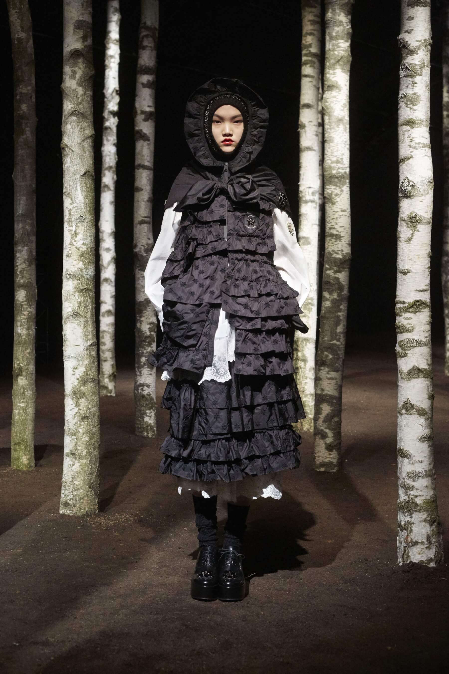 Модели у Симон Роша ходили по таинственному лесу в романтичных пуховиках с бантами, объёмных платьях со множеством оборок, кейпах и куртках, напоминающих перевязанные шнурами тенты и палатки. Головные уборы в виде изящных шапочек дополняли образы.