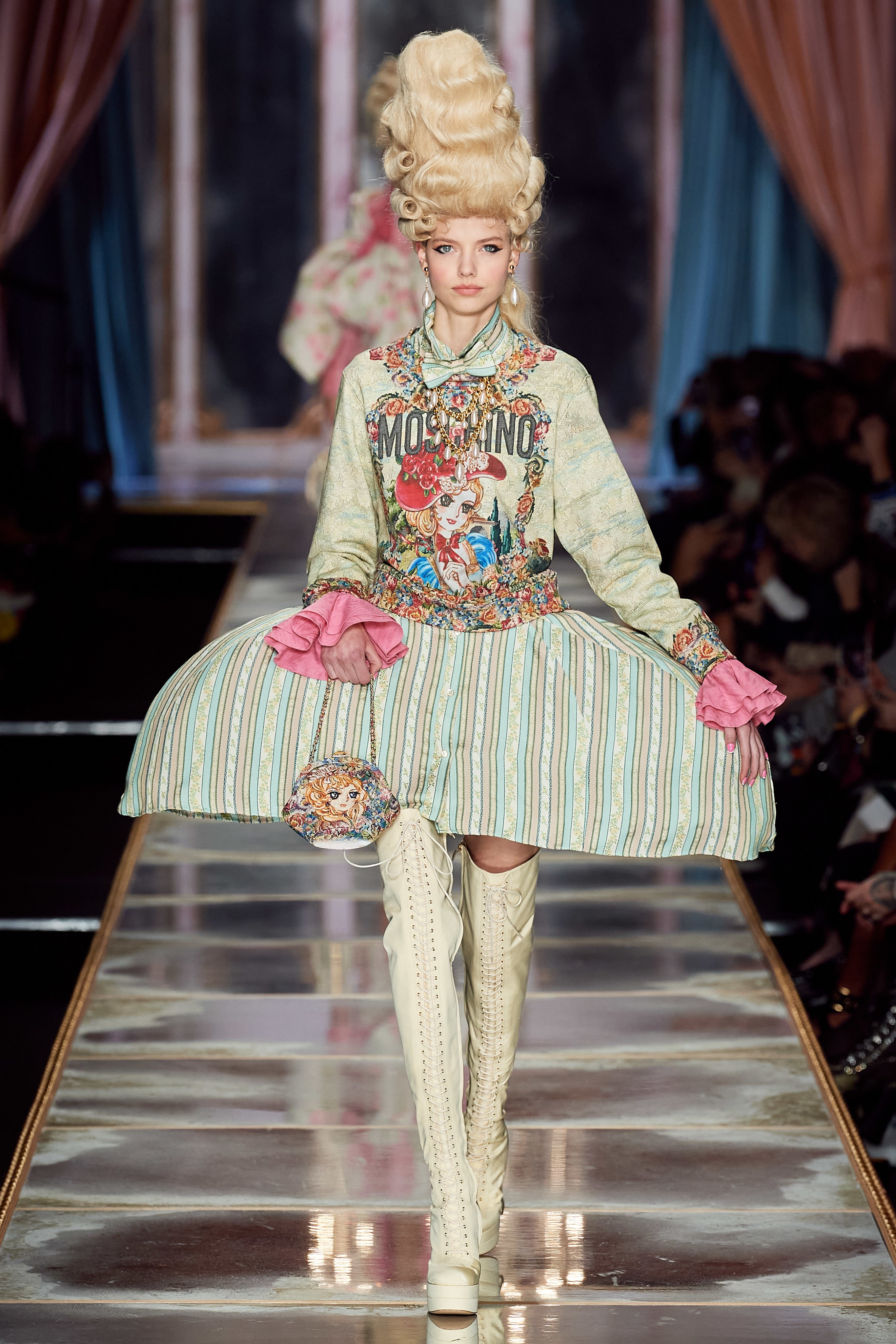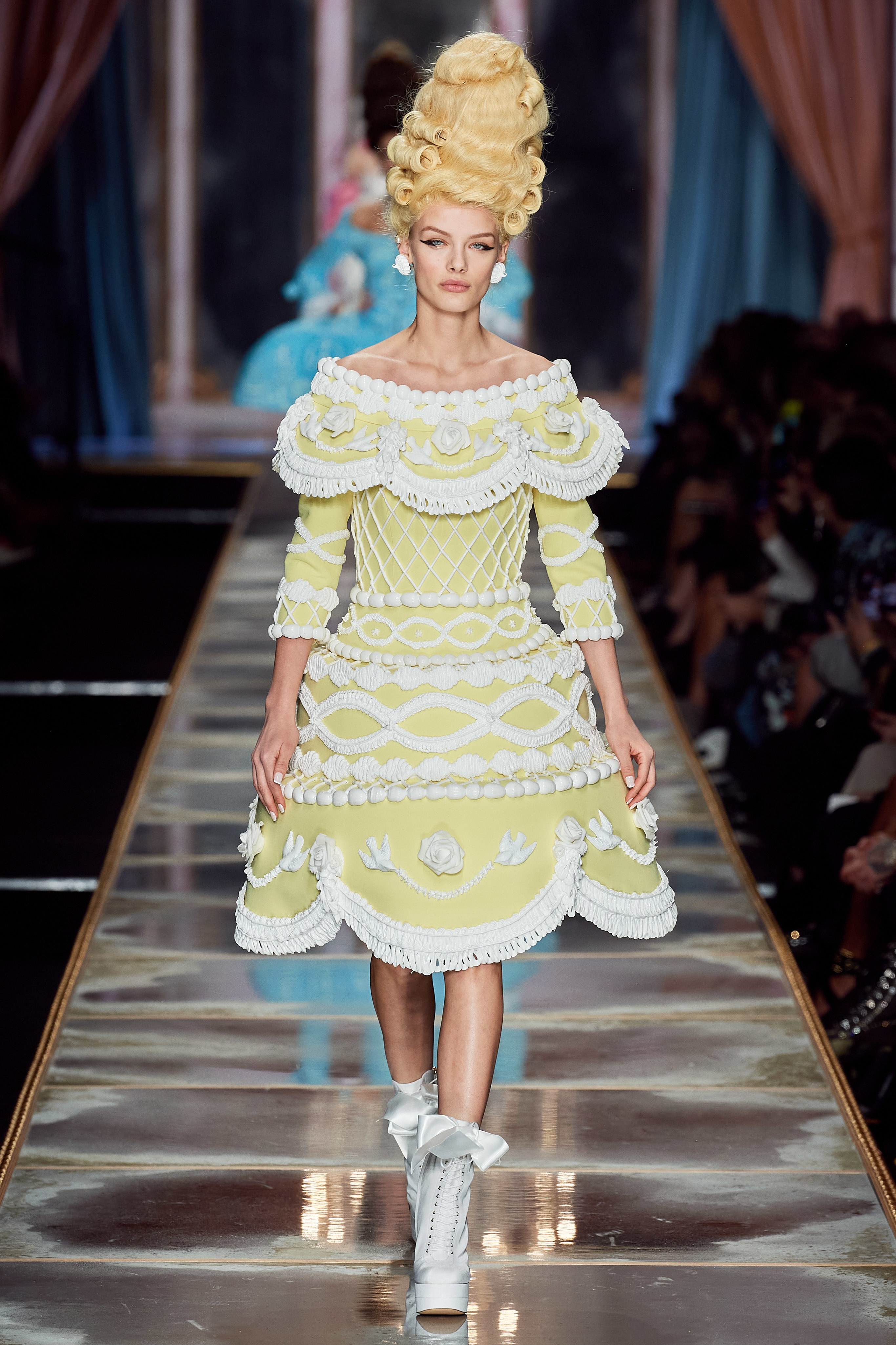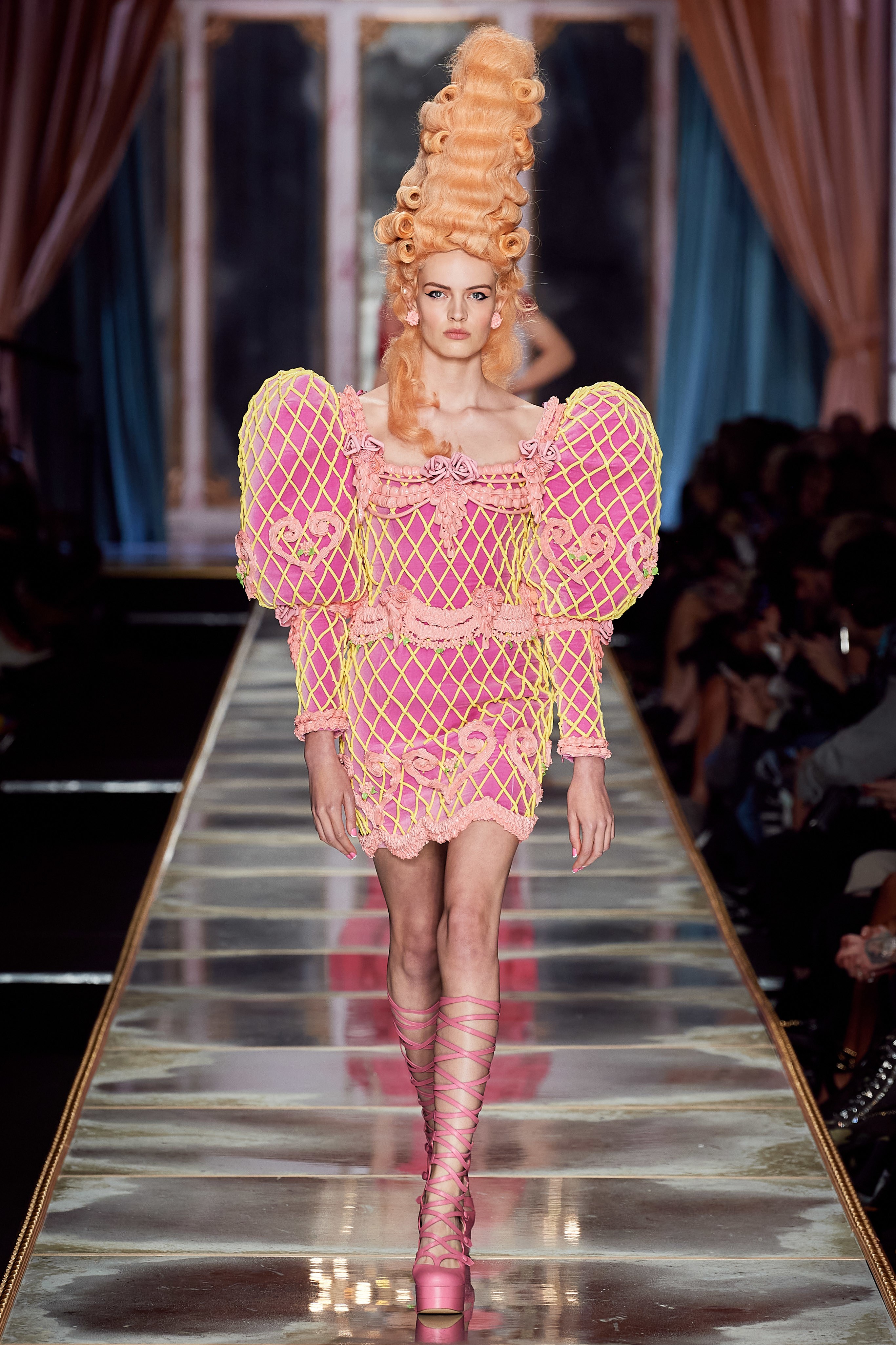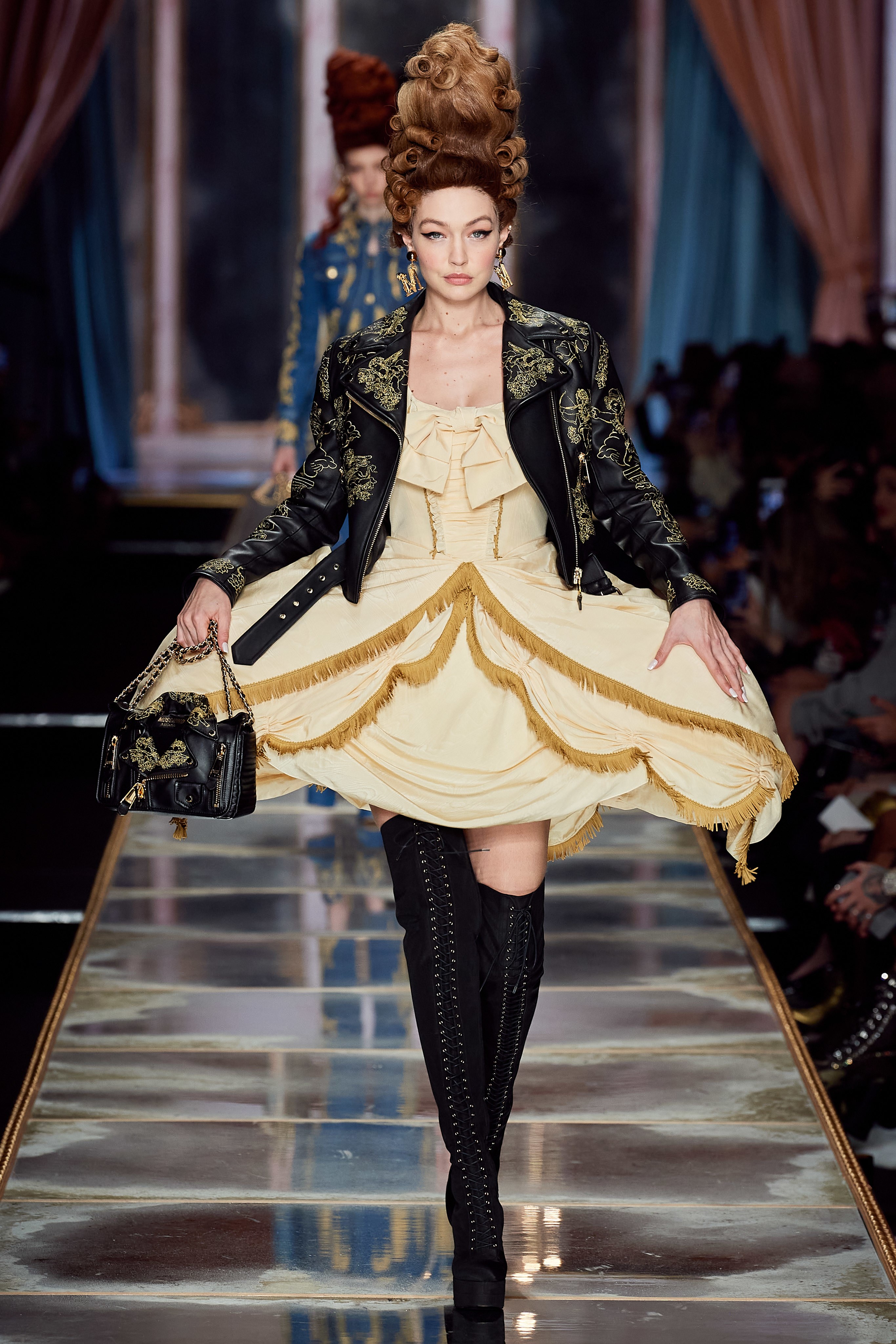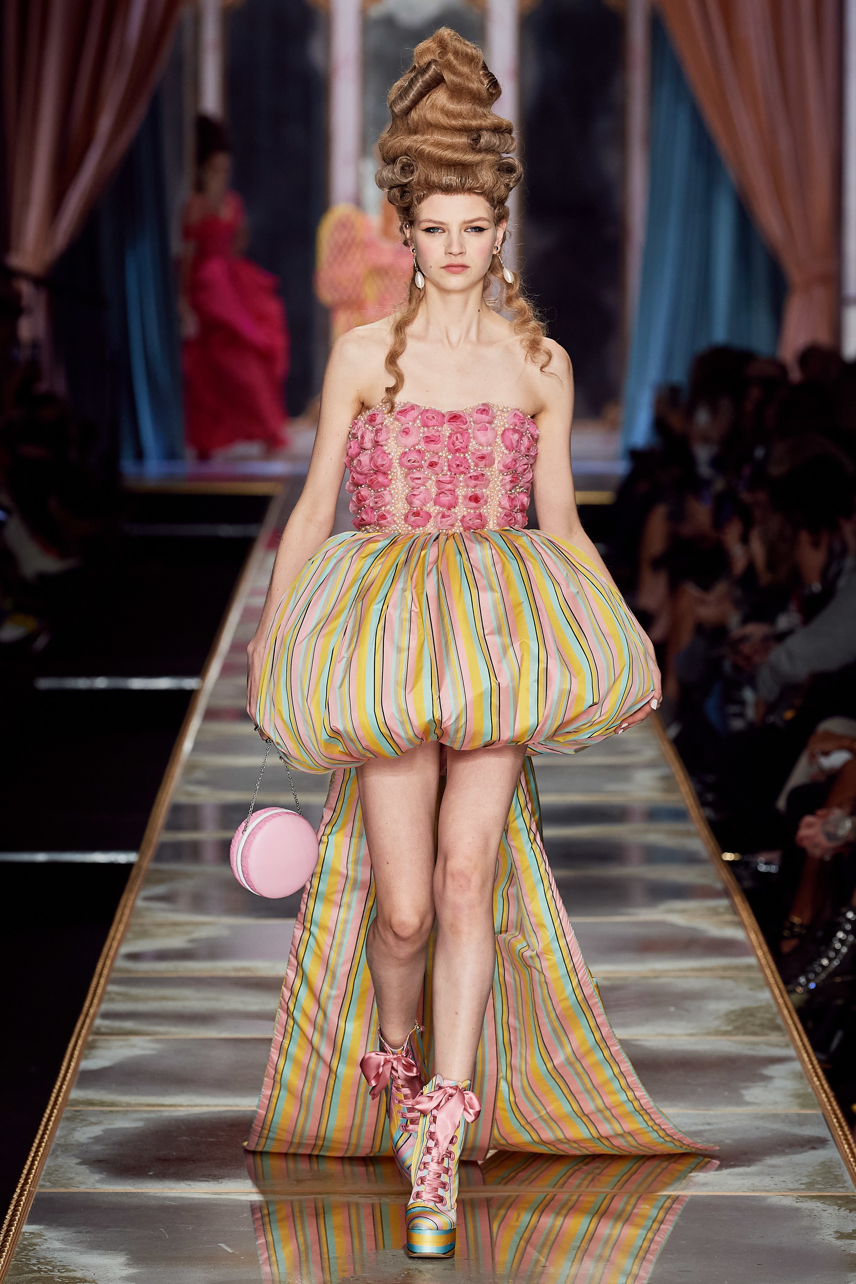 Пышная конструкция панье или кринолина — один из самых интересных и неожиданных трендов сезона. Модели, в том числе и Джиджи Хадид, выходили к гостям в высоких париках конфетных оттенков и платьях в духе рококо. Камзолы, зауженные кюлоты и фраки с богатой вышивкой также вошли в коллекцию. Дополнили всё платья в бантах с кружевами в стиле японских фрик-модниц токийского района Харадзюку и сумочки в виде сладостей.