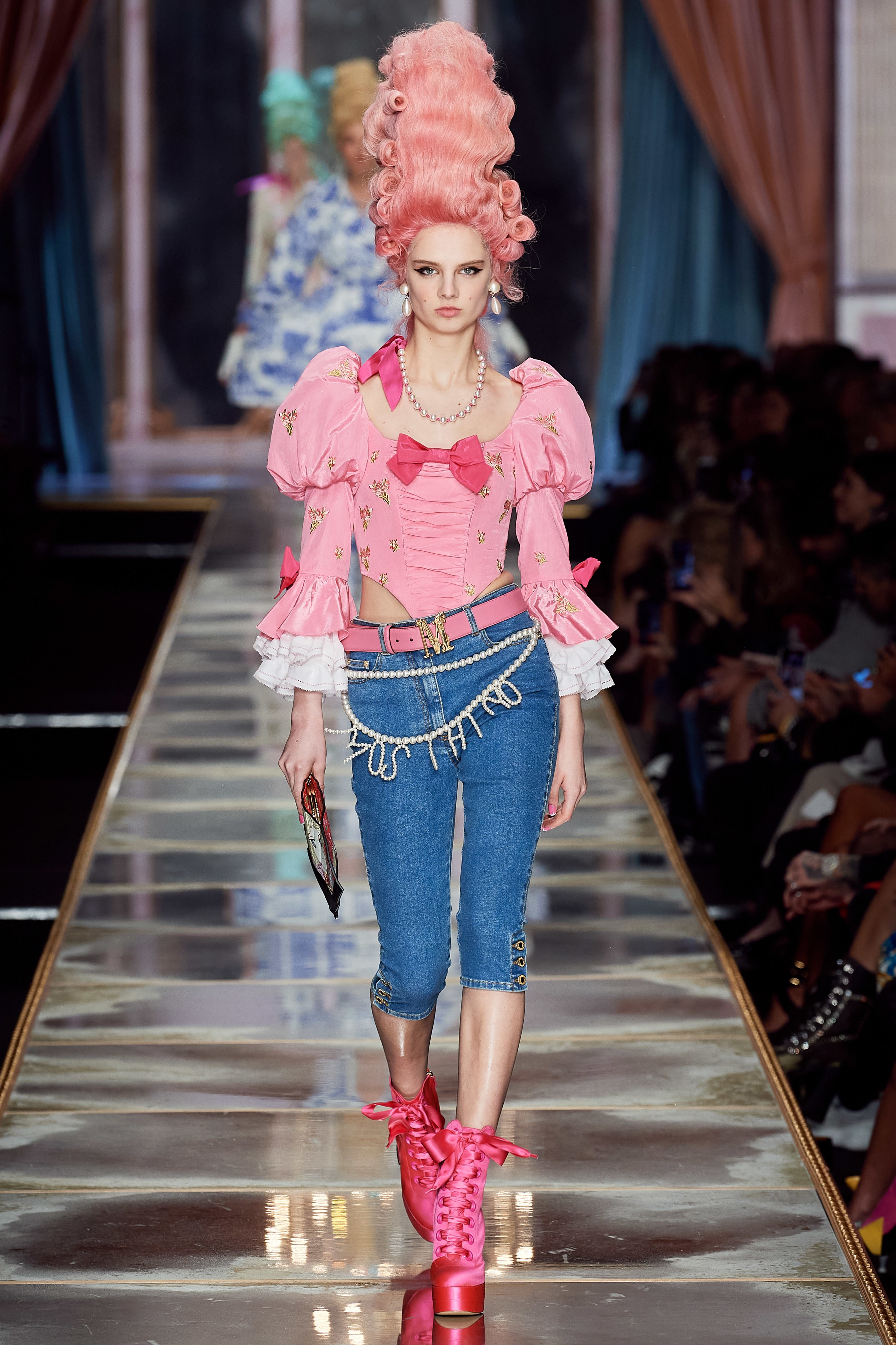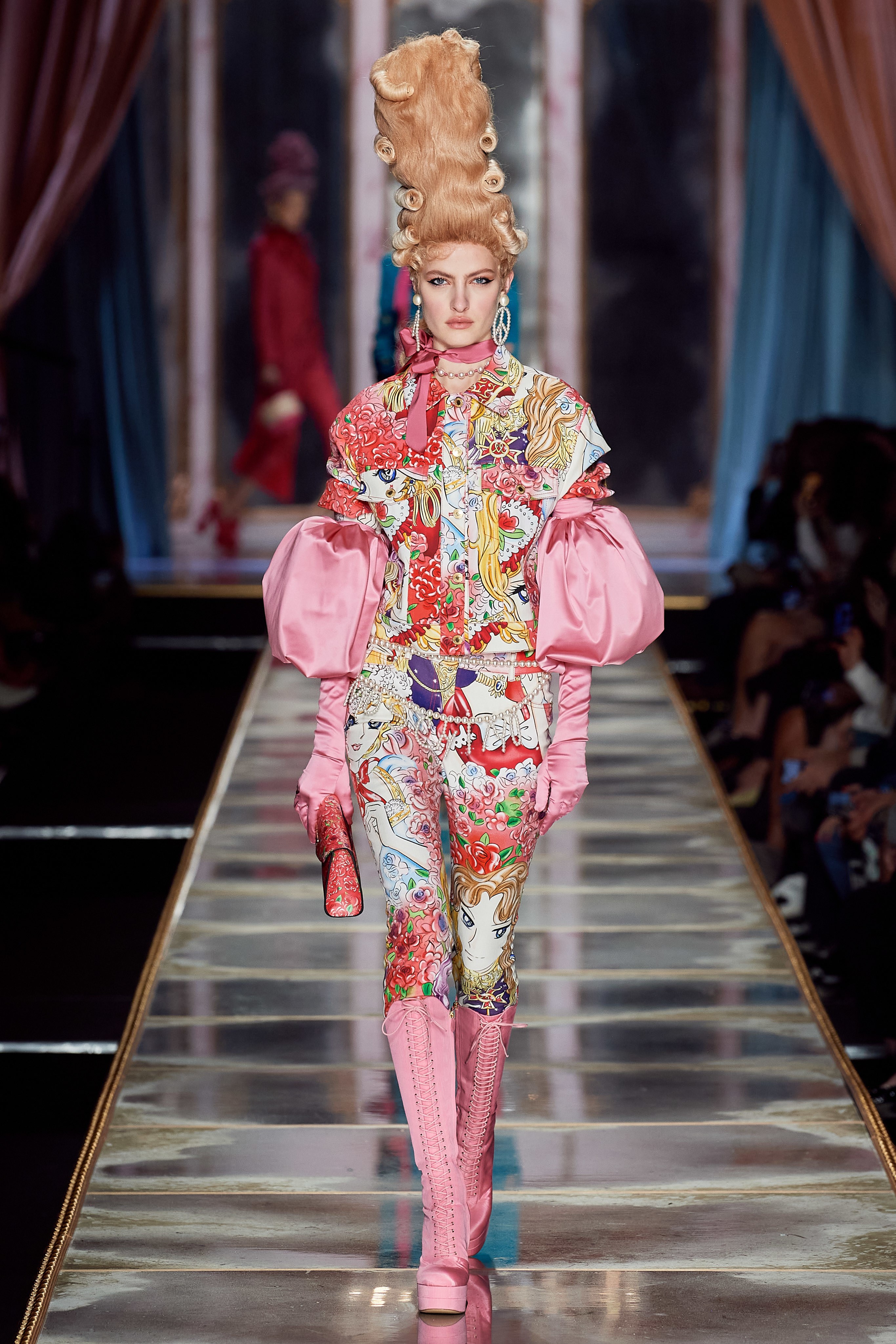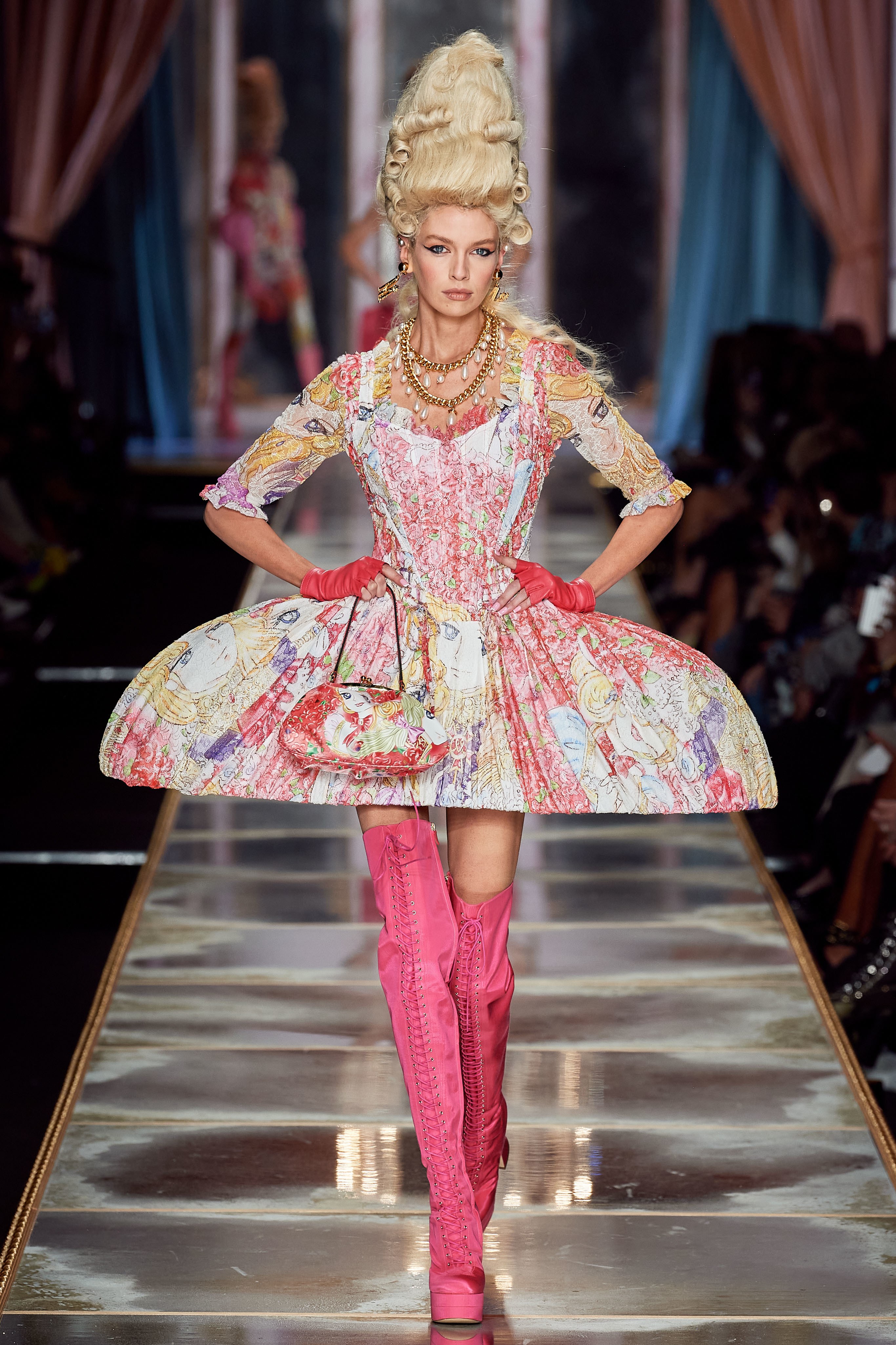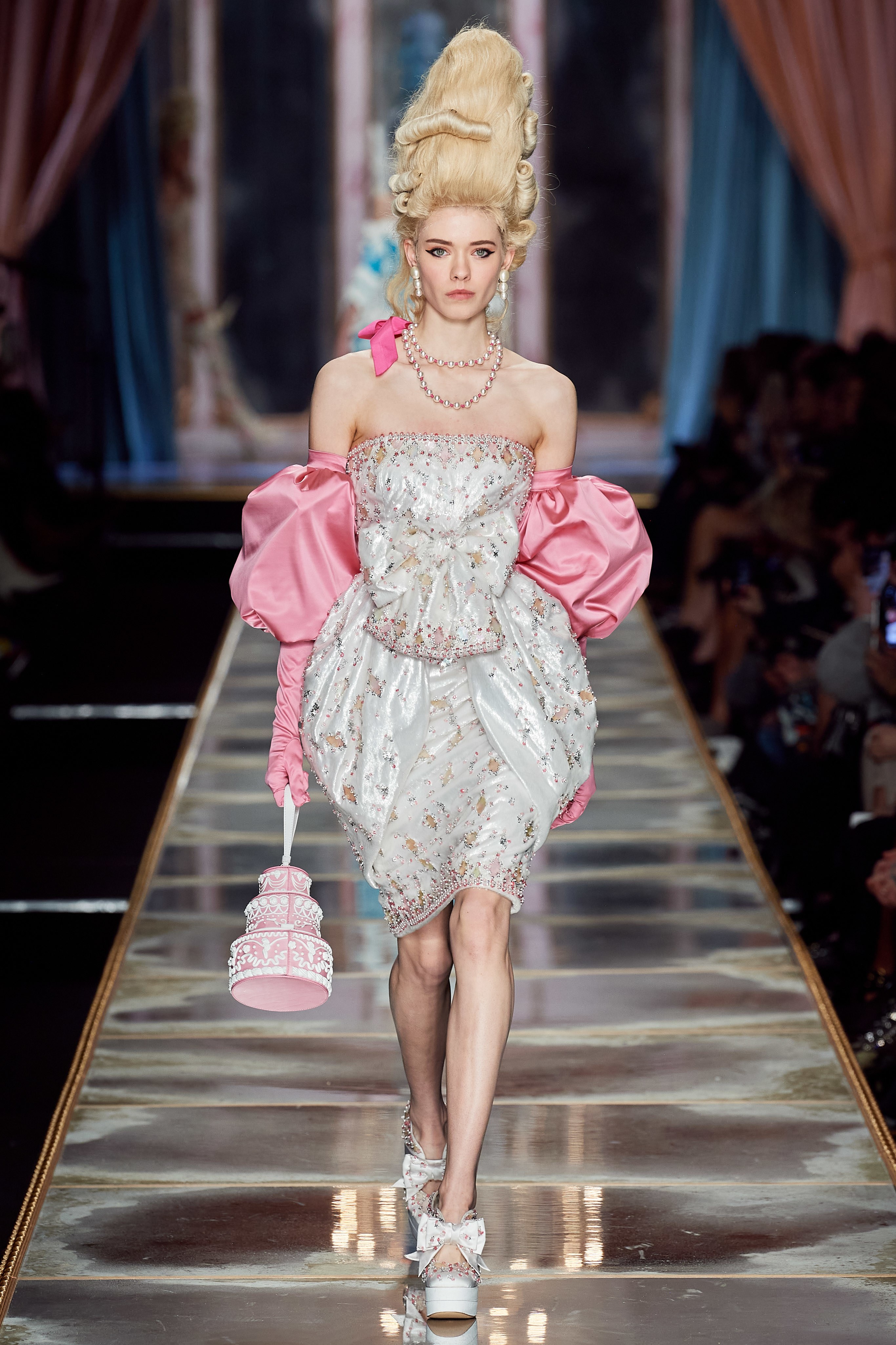 Пышная конструкция панье или кринолина — один из самых интересных и неожиданных трендов сезона. Модели, в том числе и Джиджи Хадид, выходили к гостям в высоких париках конфетных оттенков и платьях в духе рококо. Камзолы, зауженные кюлоты и фраки с богатой вышивкой также вошли в коллекцию. Дополнили всё платья в бантах с кружевами в стиле японских фрик-модниц токийского района Харадзюку и сумочки в виде сладостей.