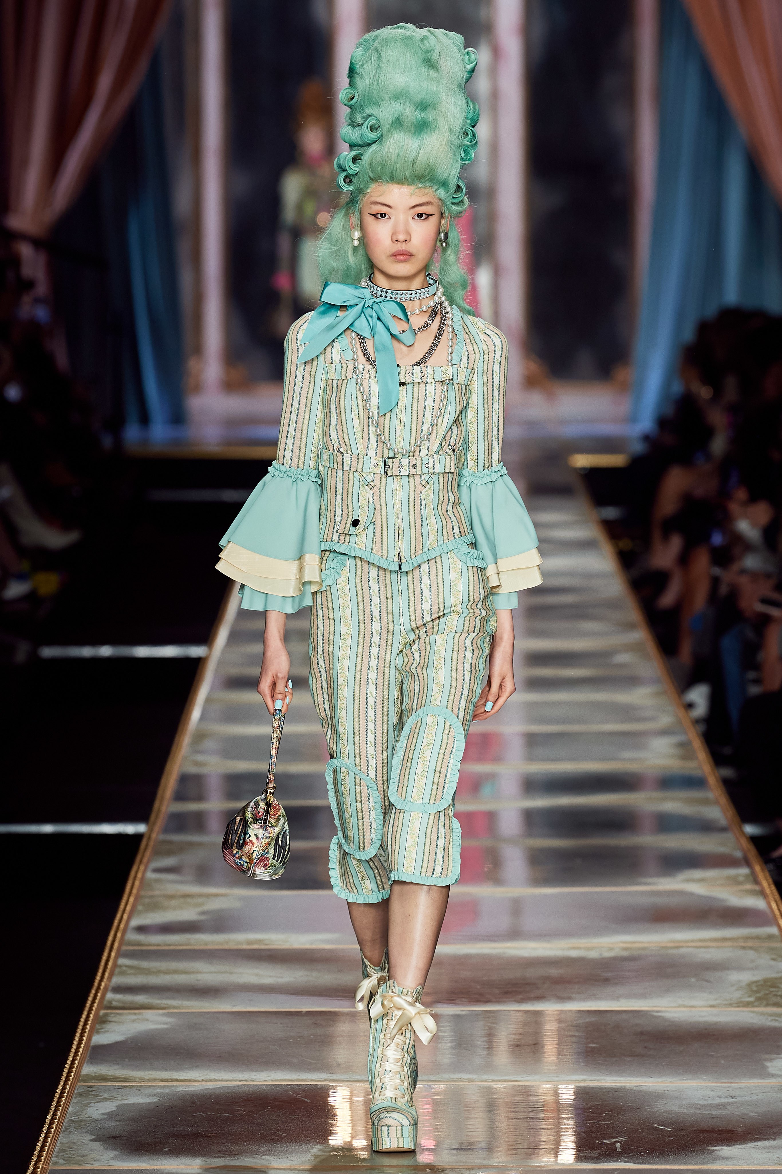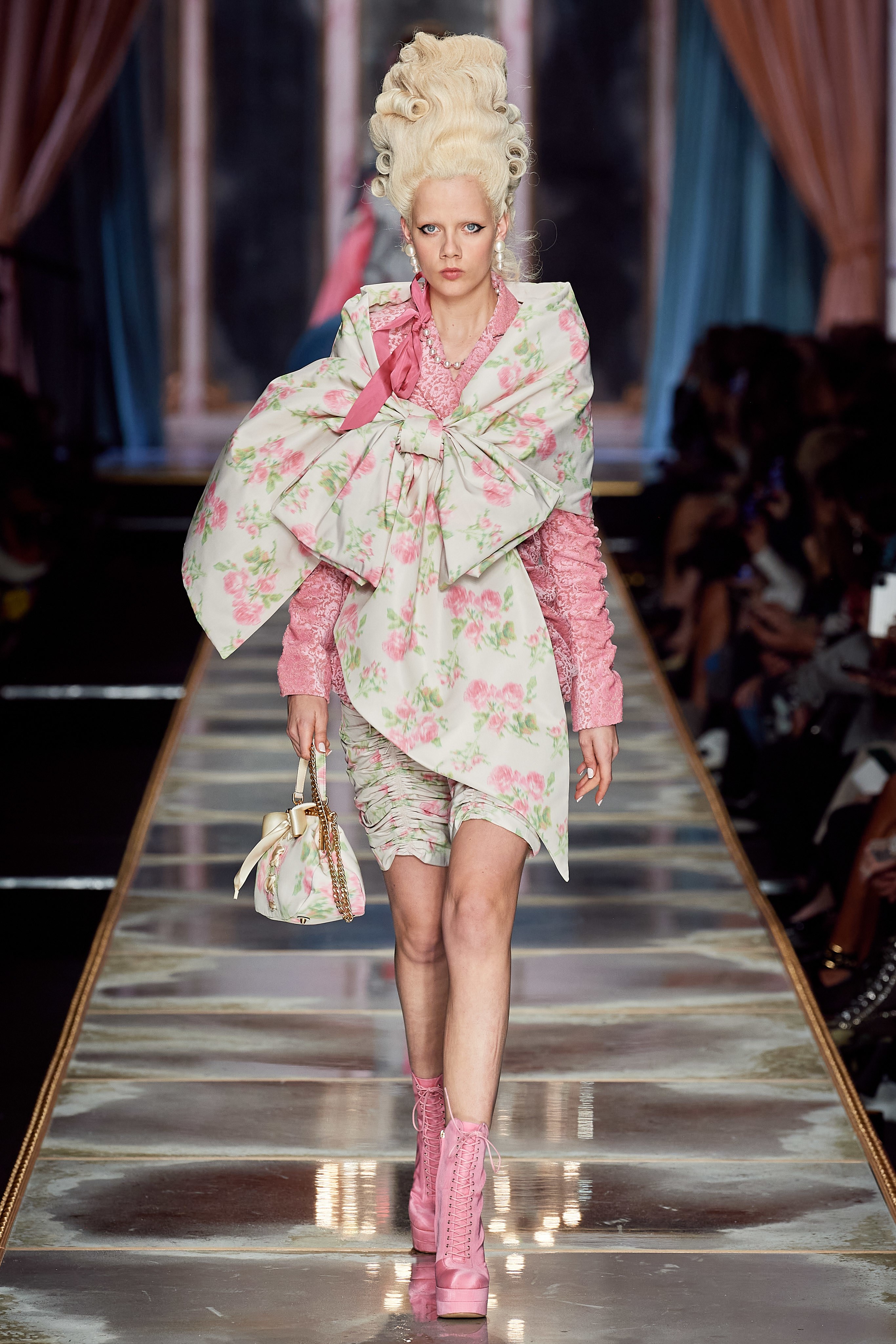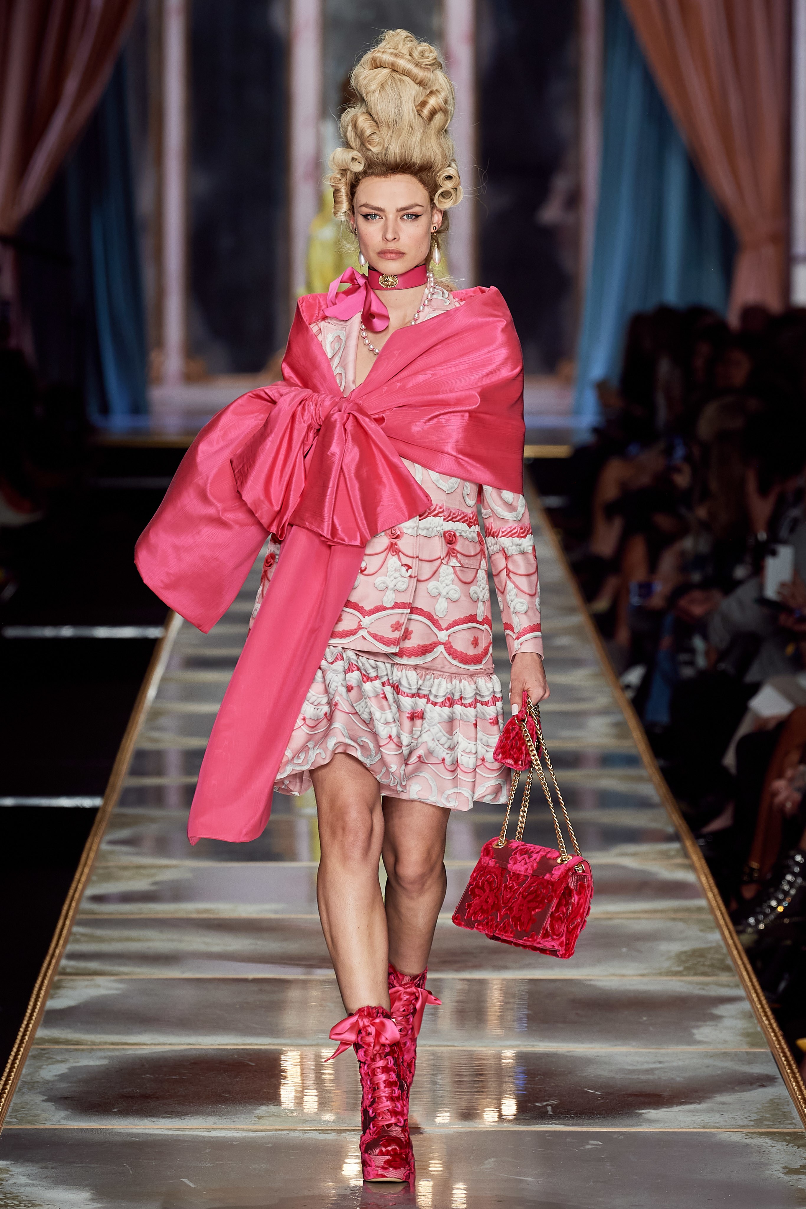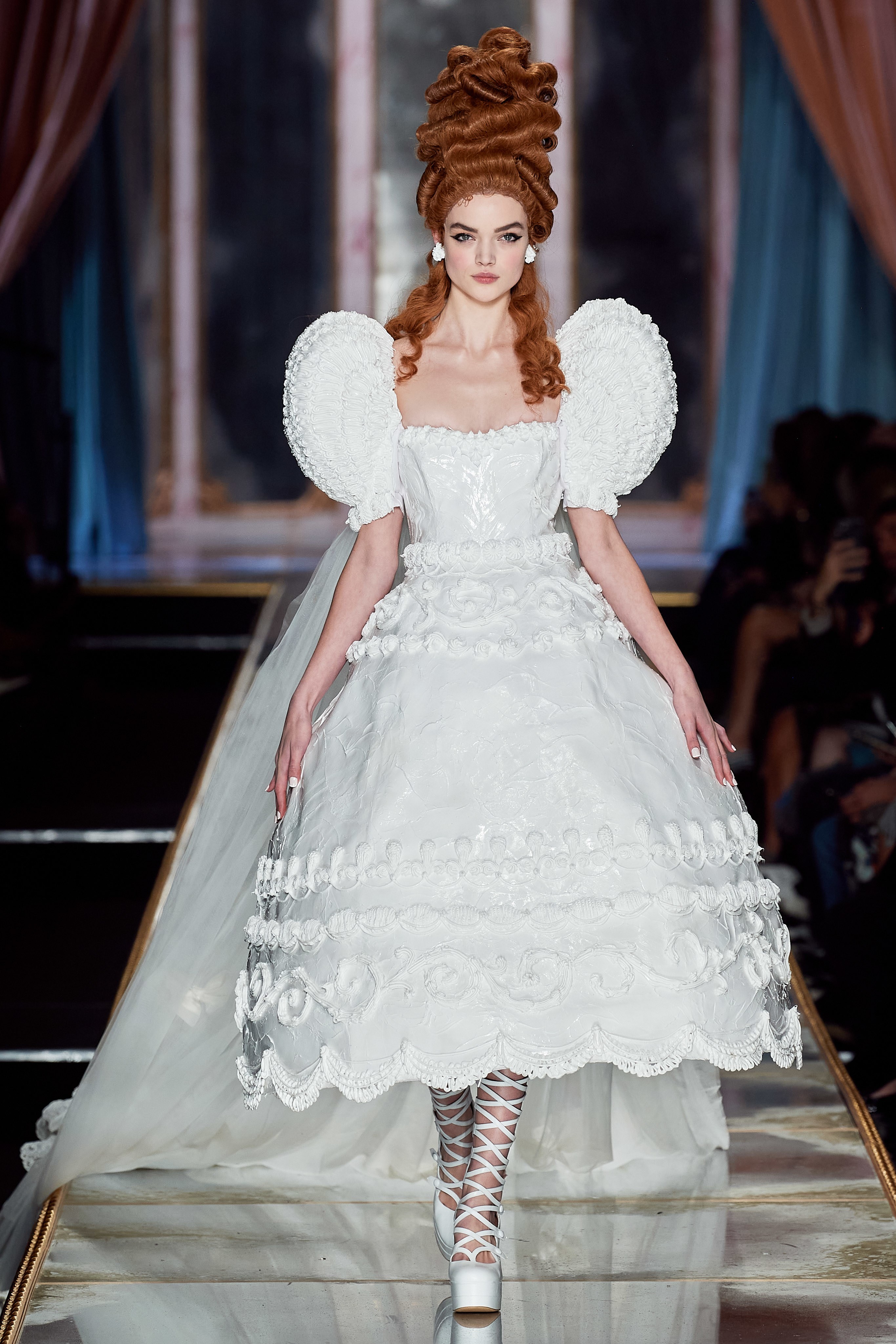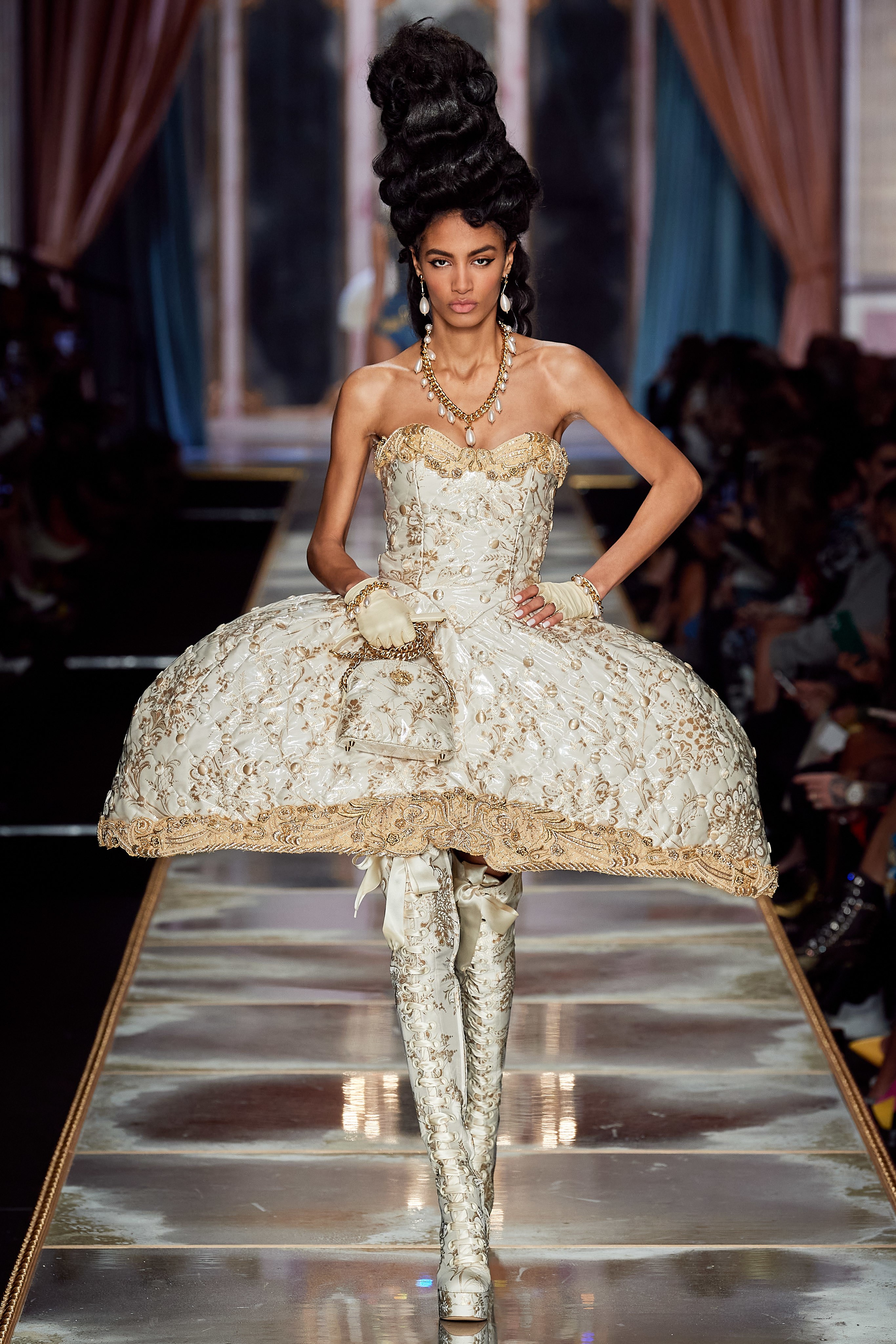 Пышная конструкция панье или кринолина — один из самых интересных и неожиданных трендов сезона. Модели, в том числе и Джиджи Хадид, выходили к гостям в высоких париках конфетных оттенков и платьях в духе рококо. Камзолы, зауженные кюлоты и фраки с богатой вышивкой также вошли в коллекцию. Дополнили всё платья в бантах с кружевами в стиле японских фрик-модниц токийского района Харадзюку и сумочки в виде сладостей.