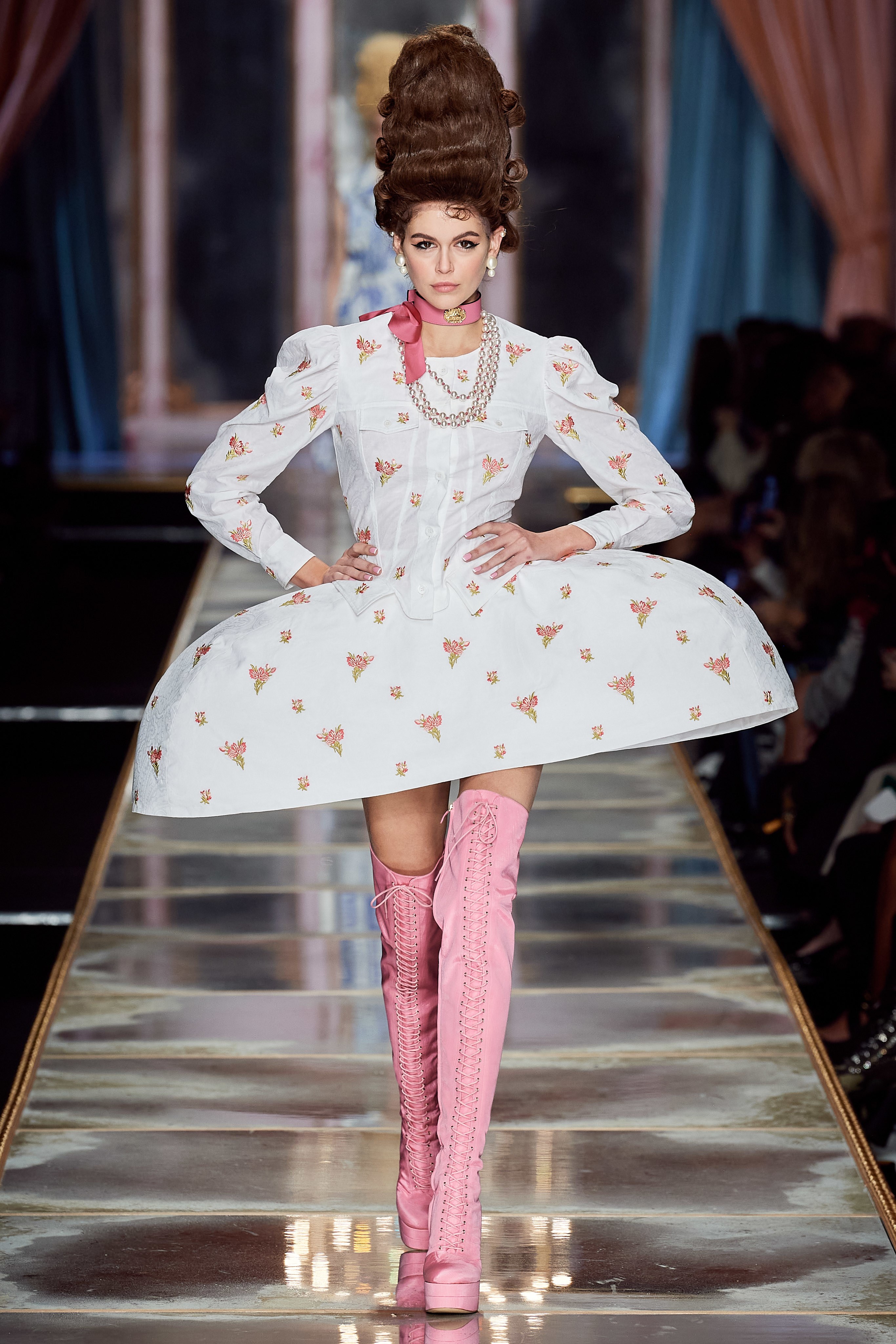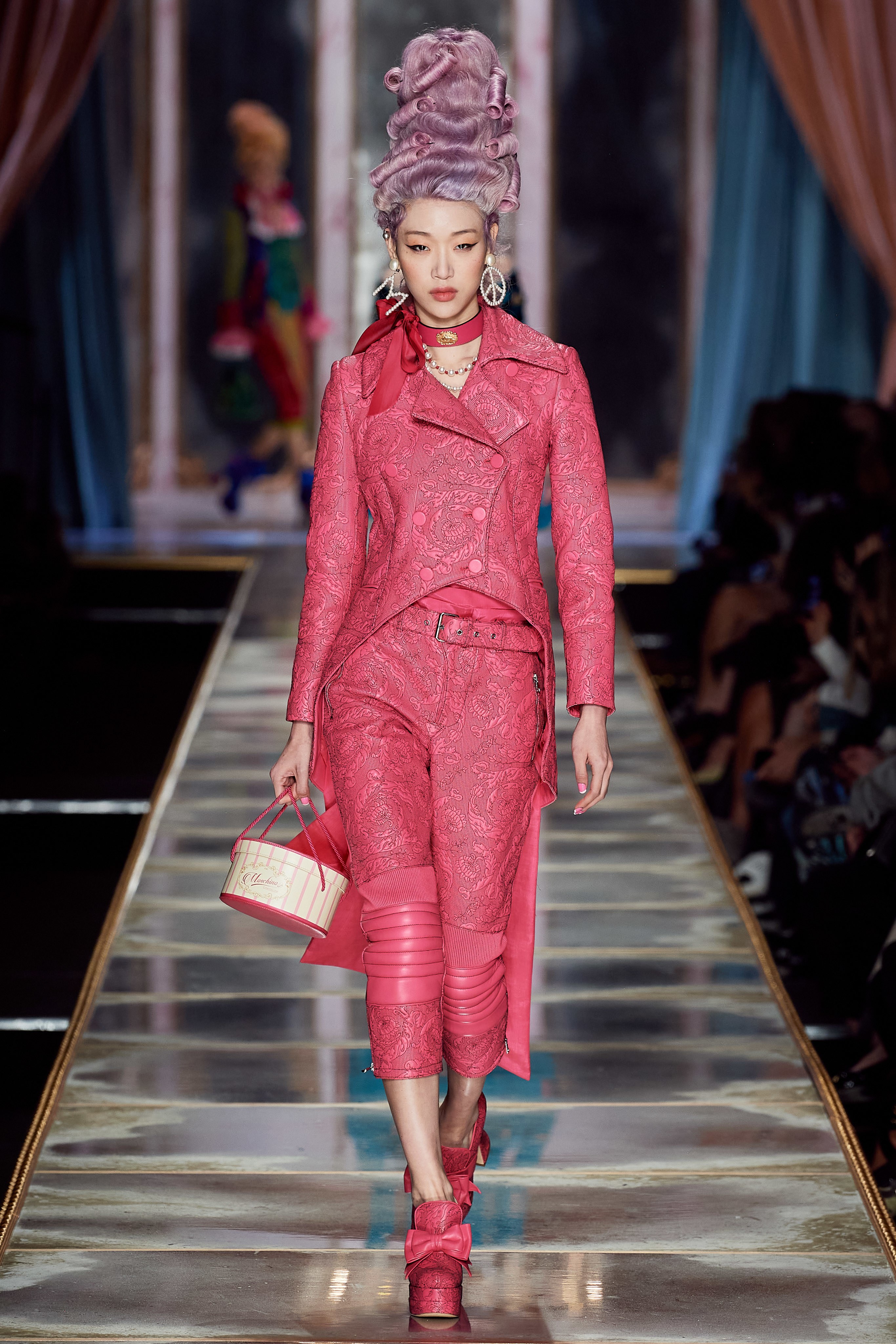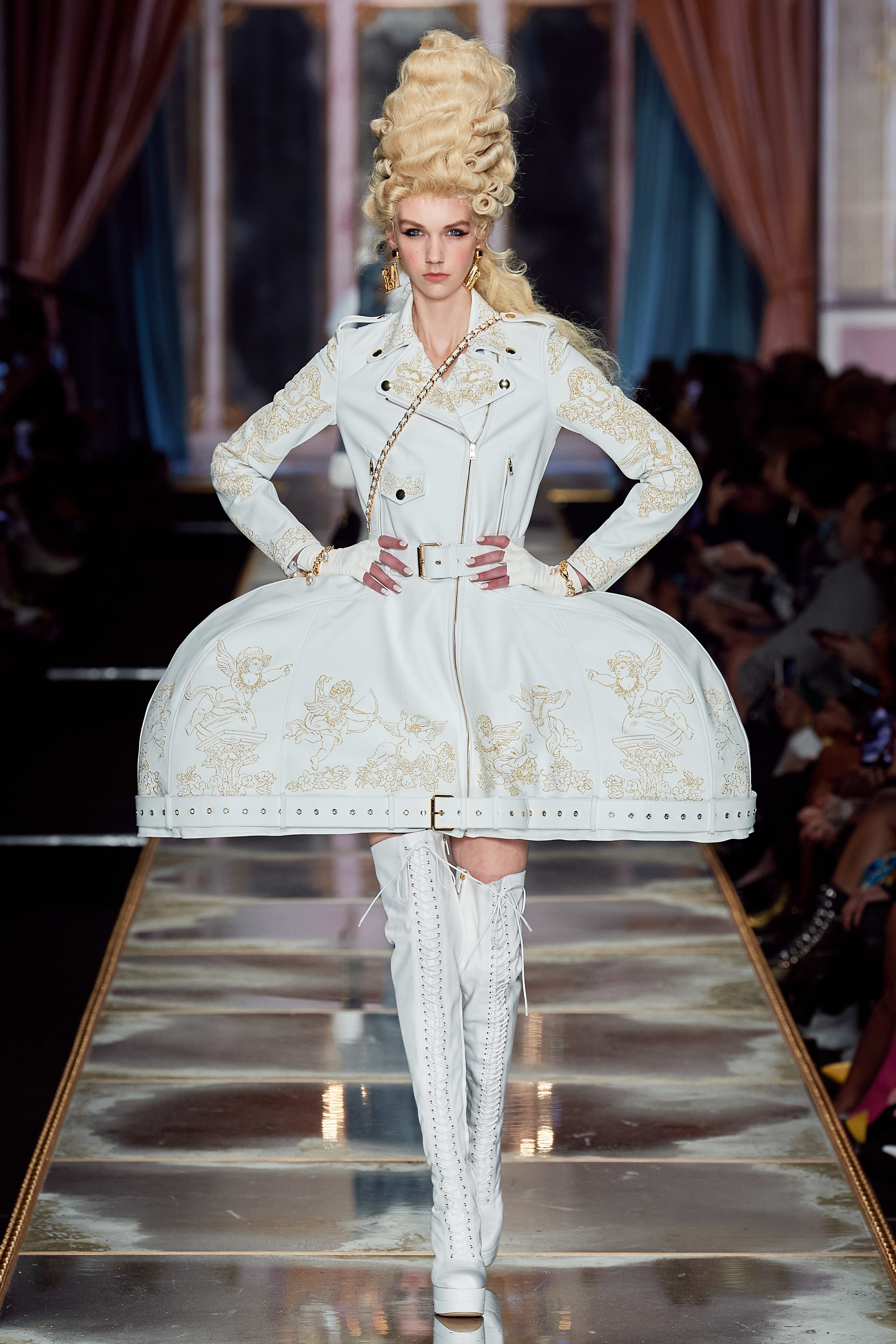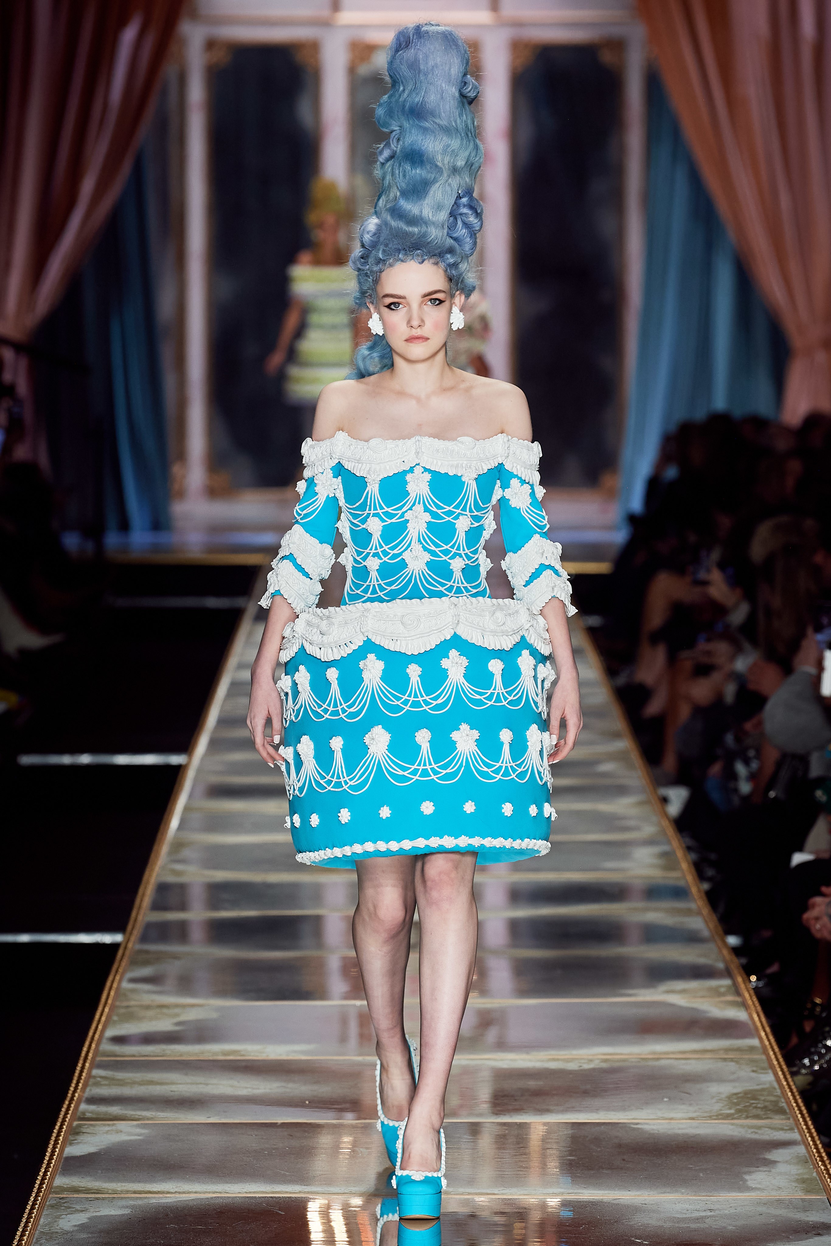 Пышная конструкция панье или кринолина — один из самых интересных и неожиданных трендов сезона. Модели, в том числе и Джиджи Хадид, выходили к гостям в высоких париках конфетных оттенков и платьях в духе рококо. Камзолы, зауженные кюлоты и фраки с богатой вышивкой также вошли в коллекцию. Дополнили всё платья в бантах с кружевами в стиле японских фрик-модниц токийского района Харадзюку и сумочки в виде сладостей.