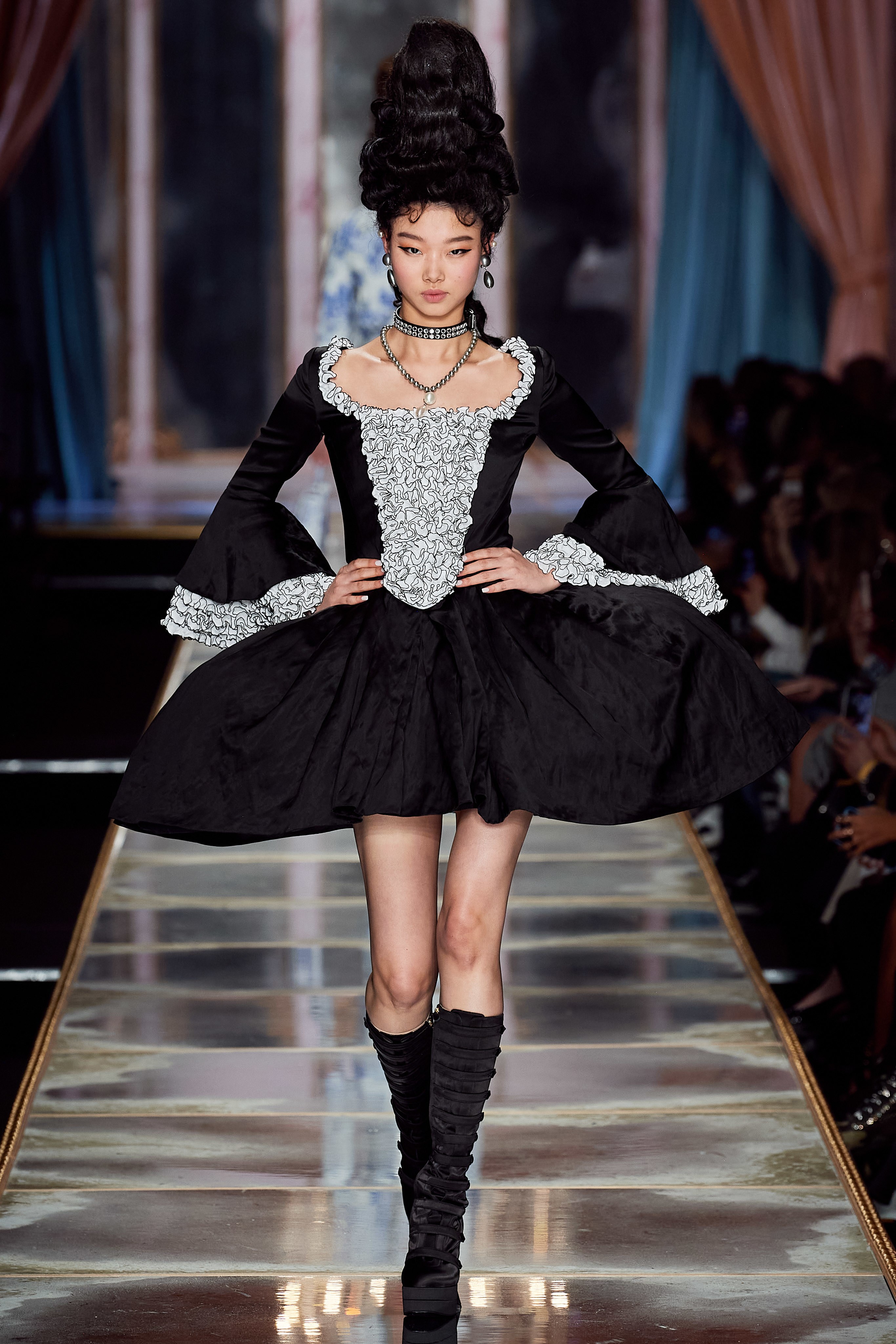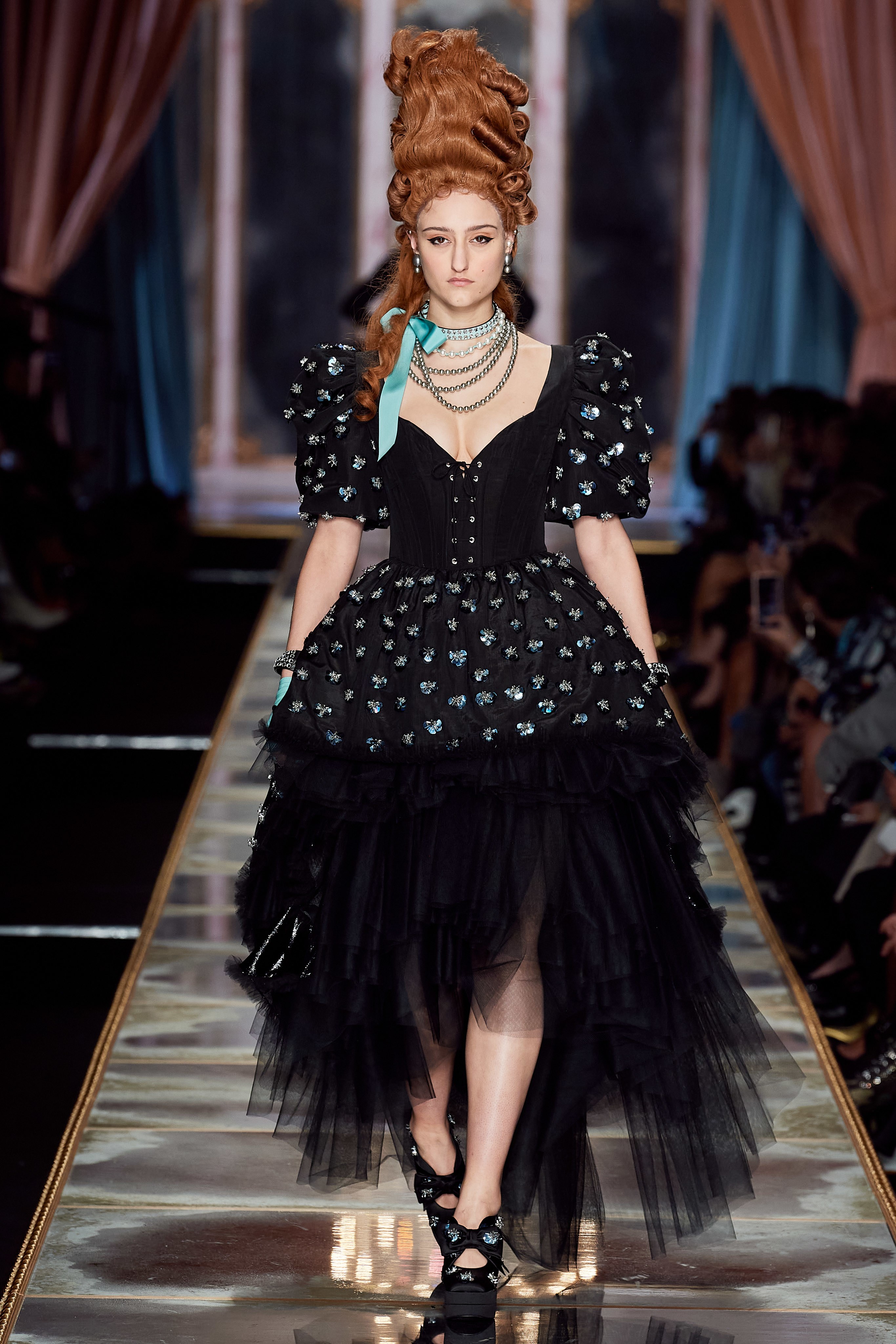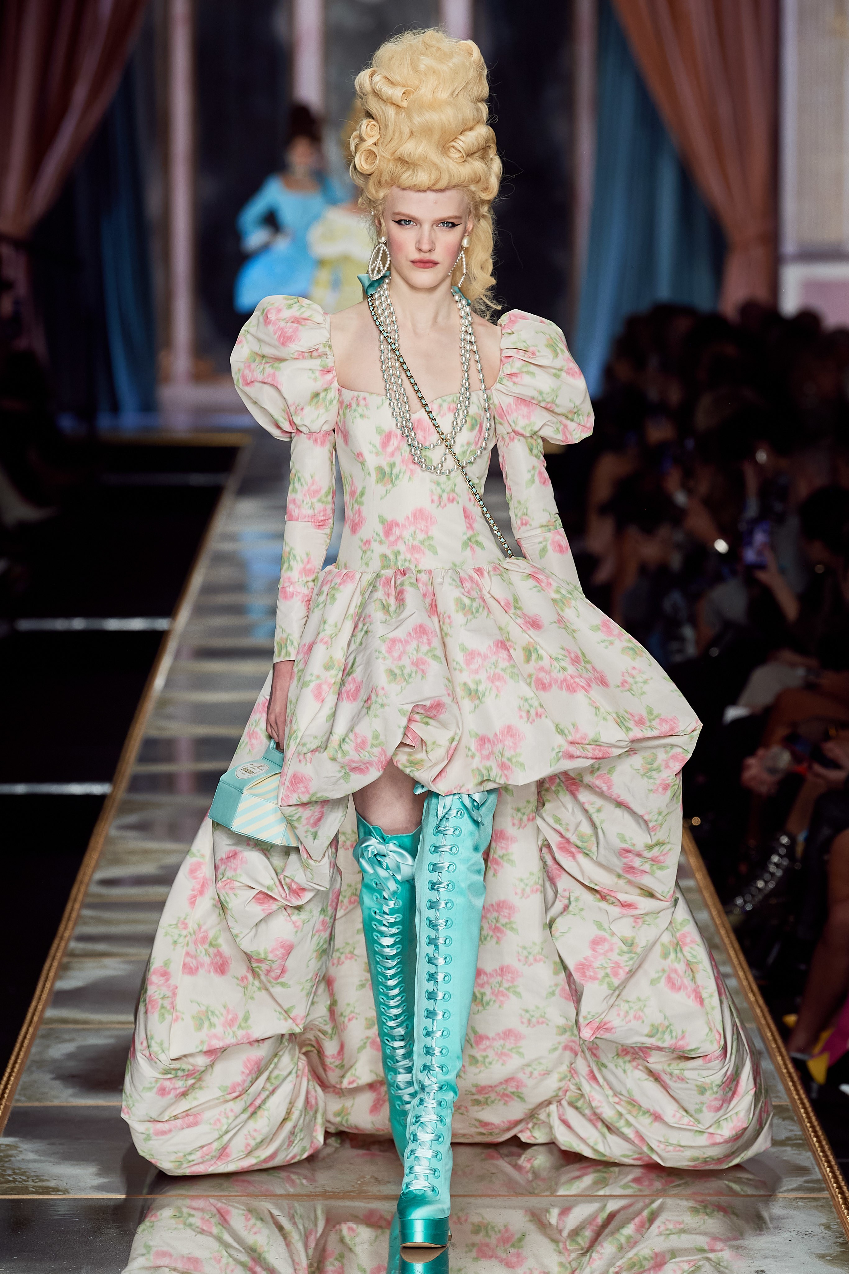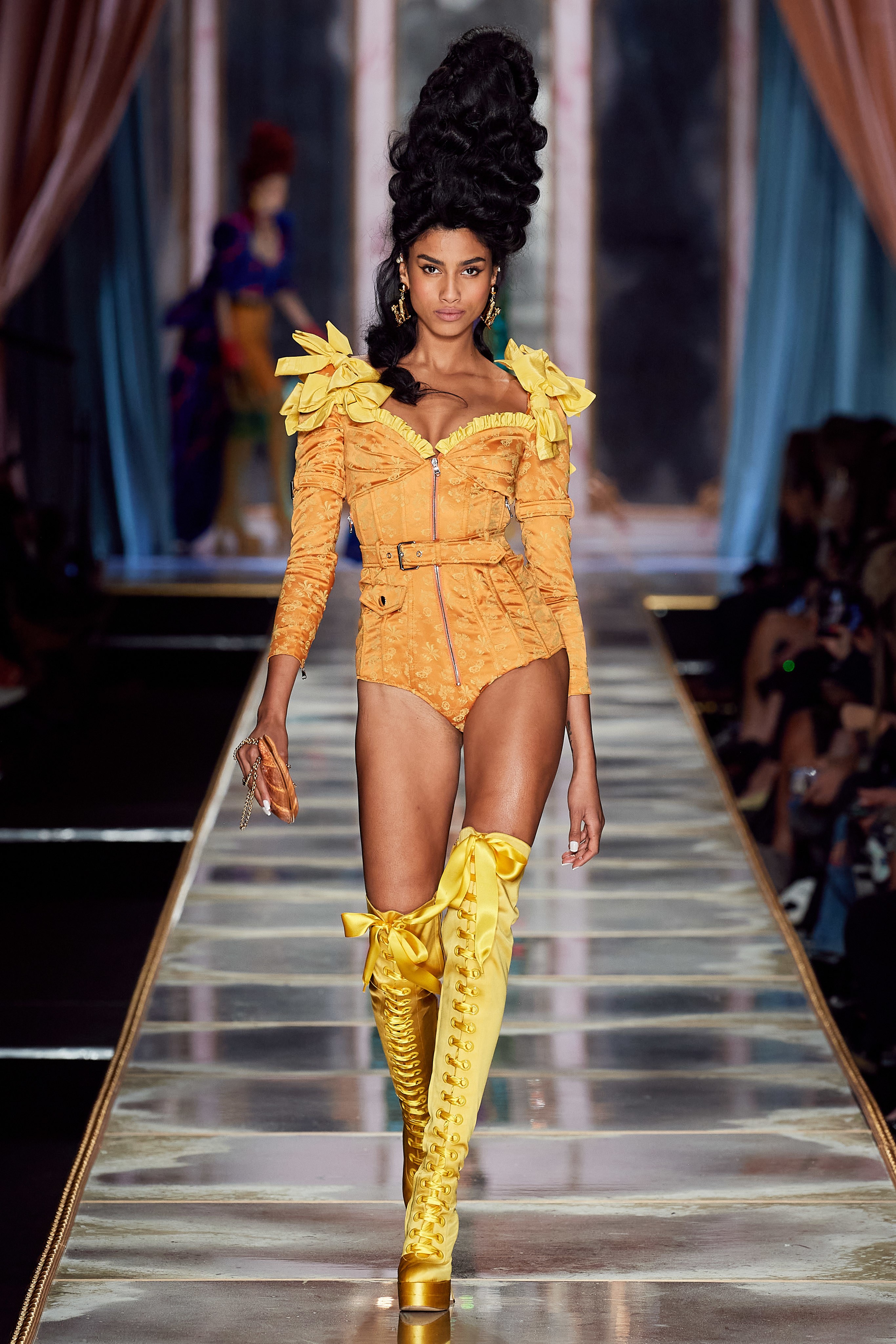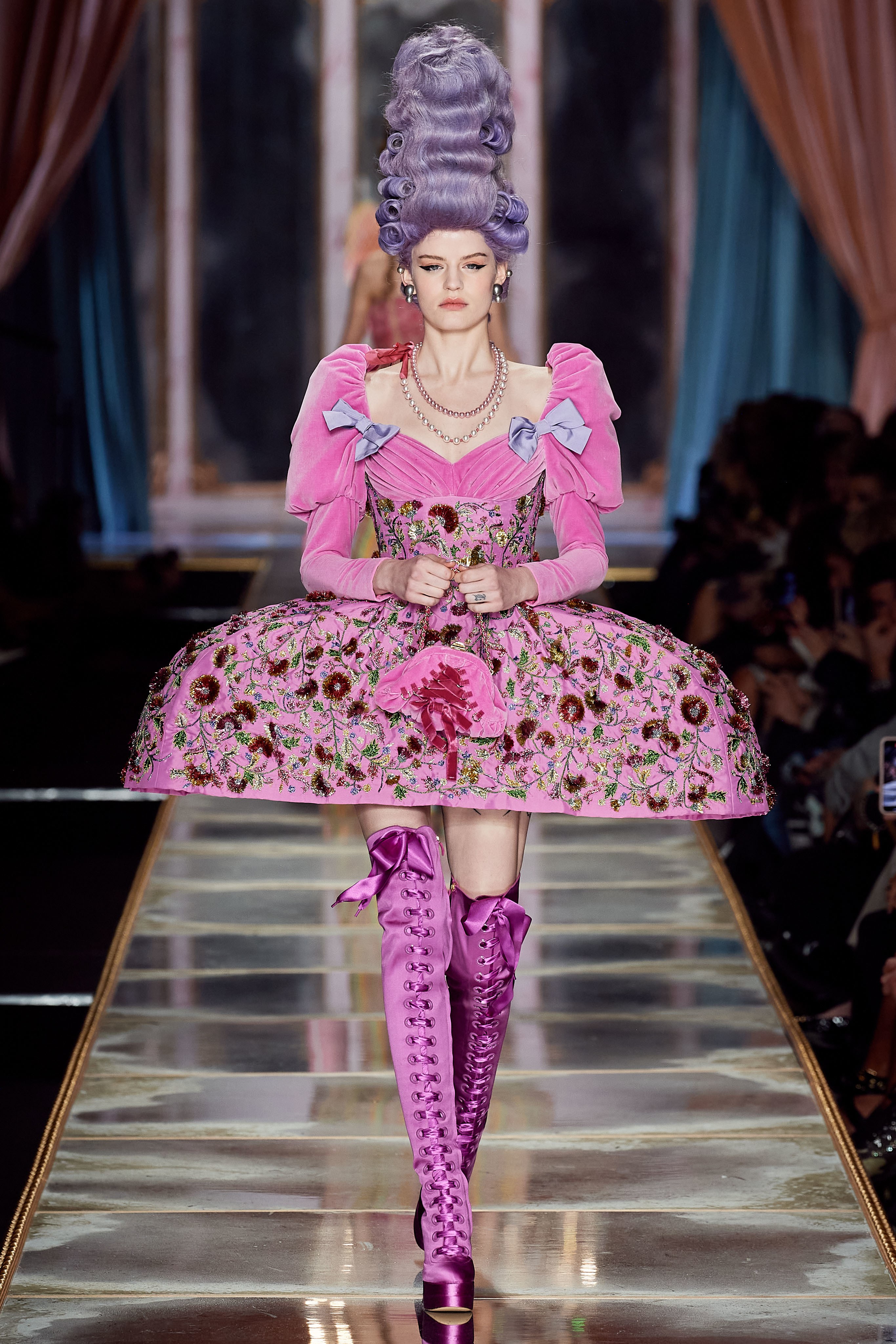 Пышная конструкция панье или кринолина — один из самых интересных и неожиданных трендов сезона. Модели, в том числе и Джиджи Хадид, выходили к гостям в высоких париках конфетных оттенков и платьях в духе рококо. Камзолы, зауженные кюлоты и фраки с богатой вышивкой также вошли в коллекцию. Дополнили всё платья в бантах с кружевами в стиле японских фрик-модниц токийского района Харадзюку и сумочки в виде сладостей.