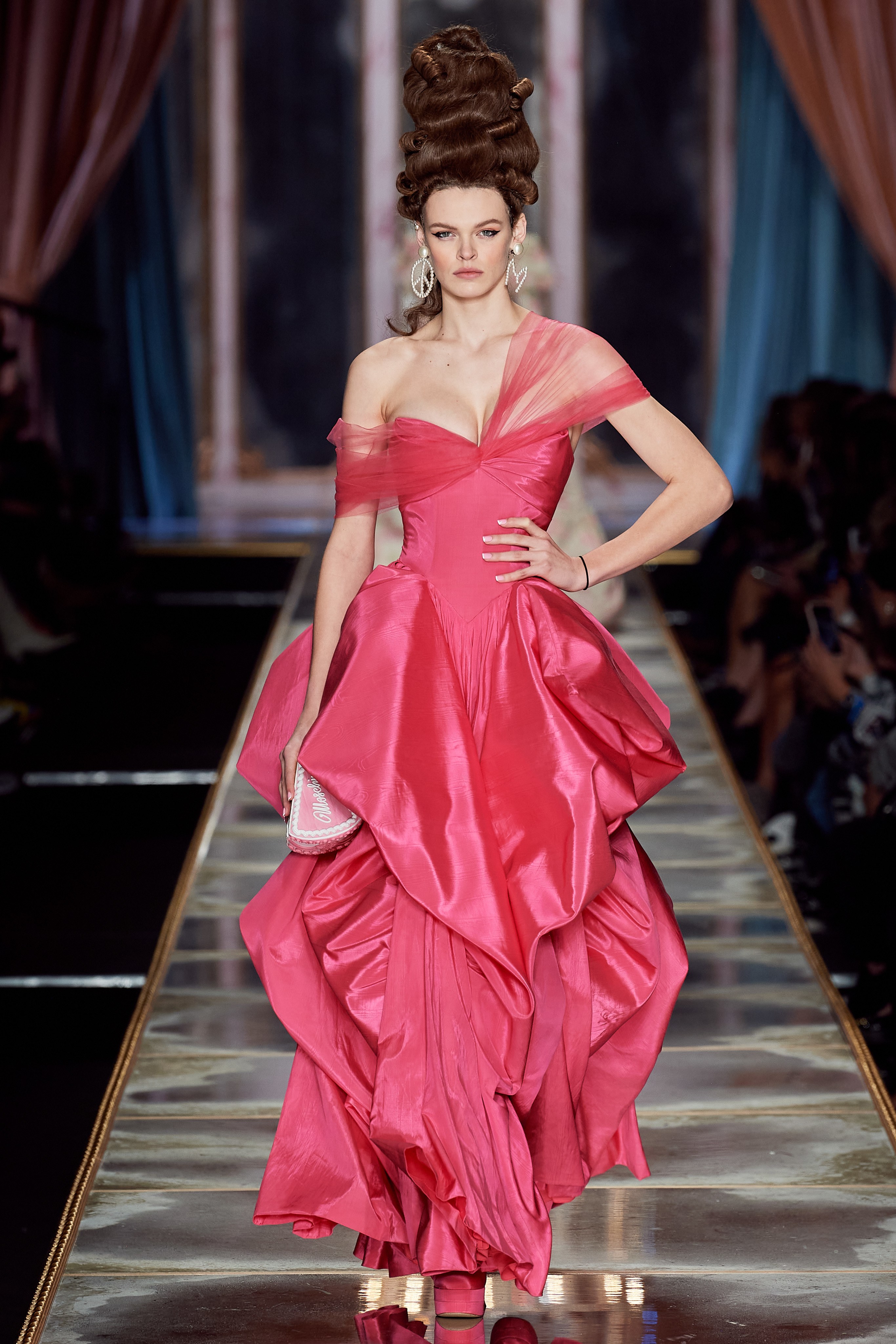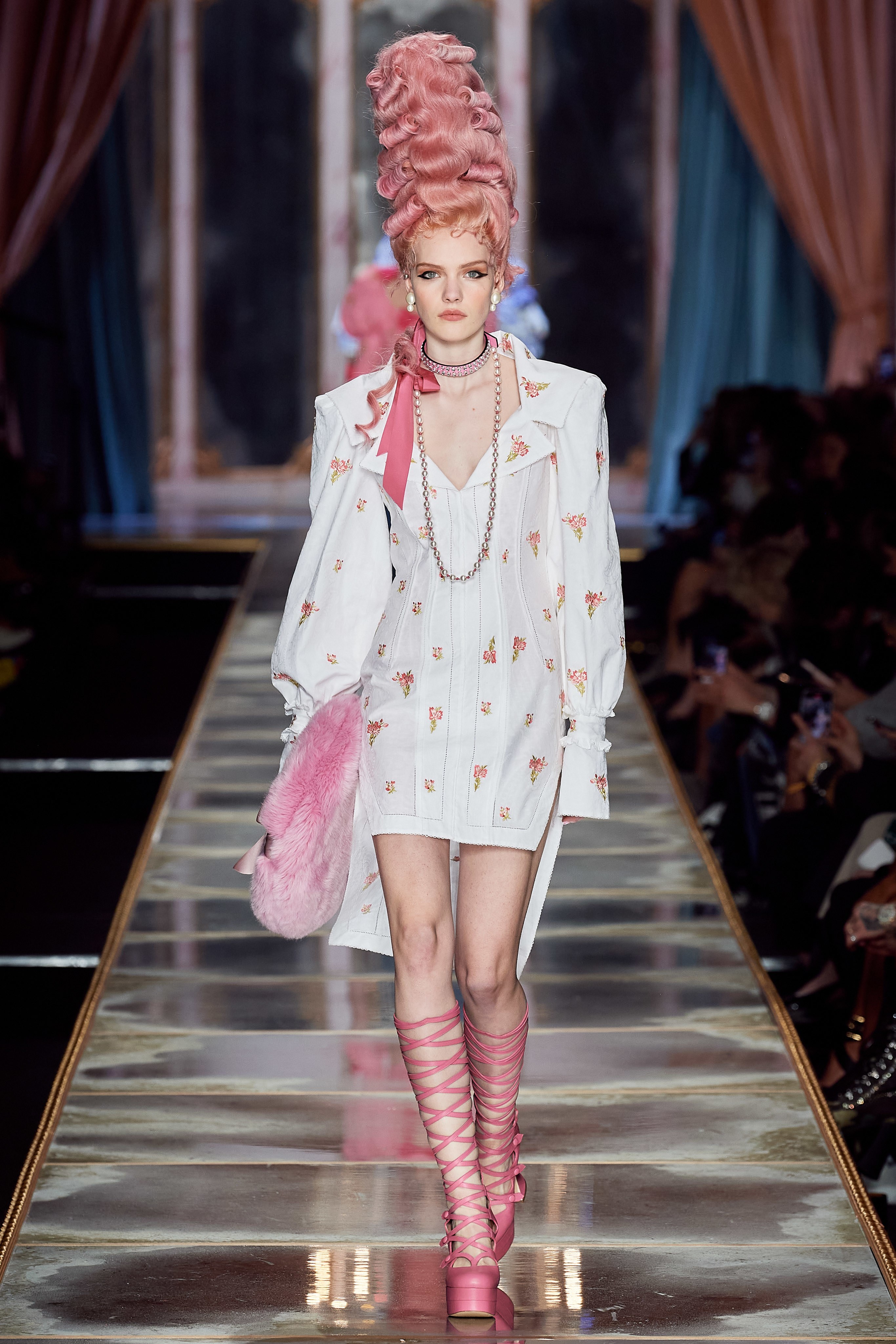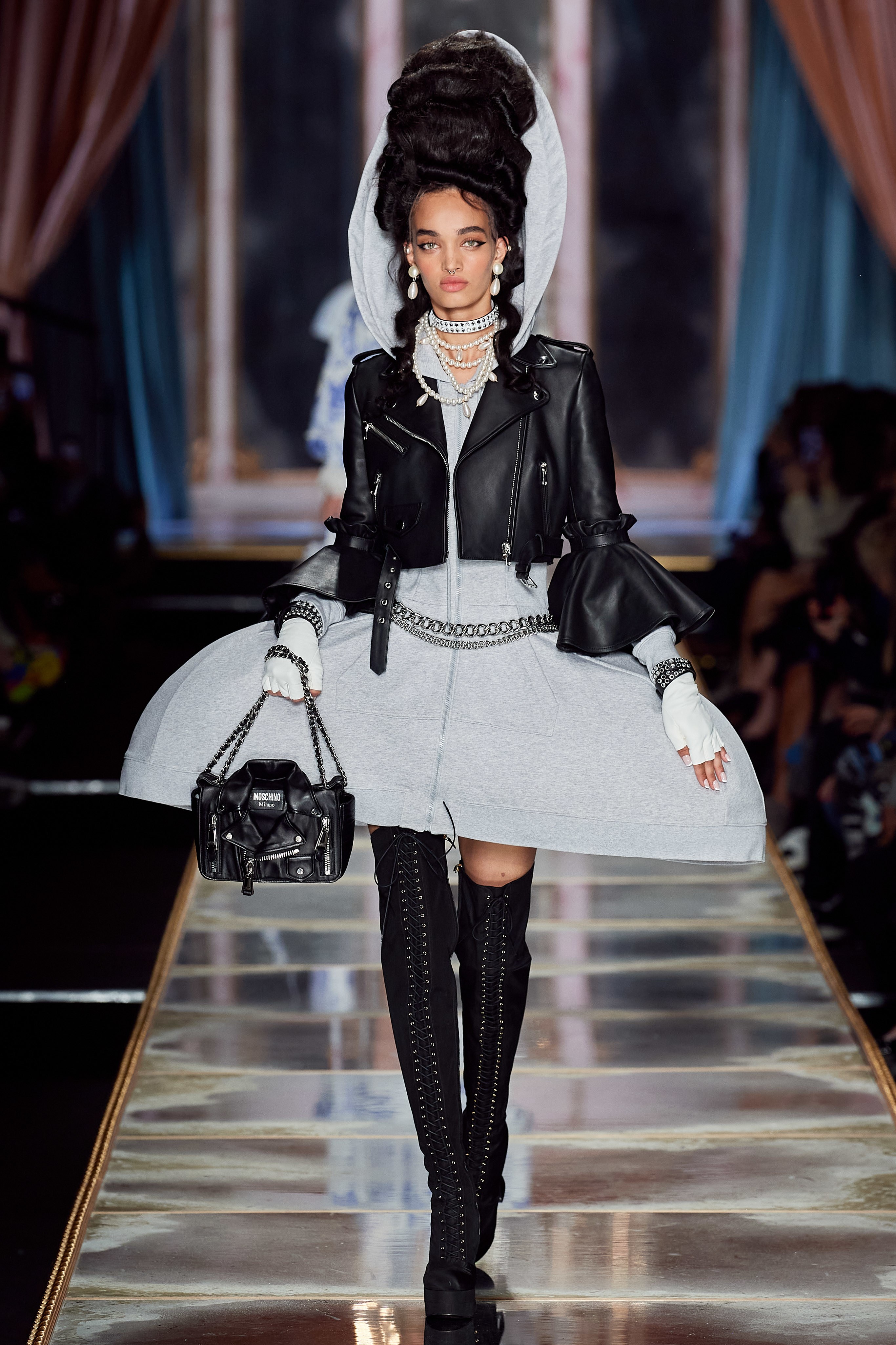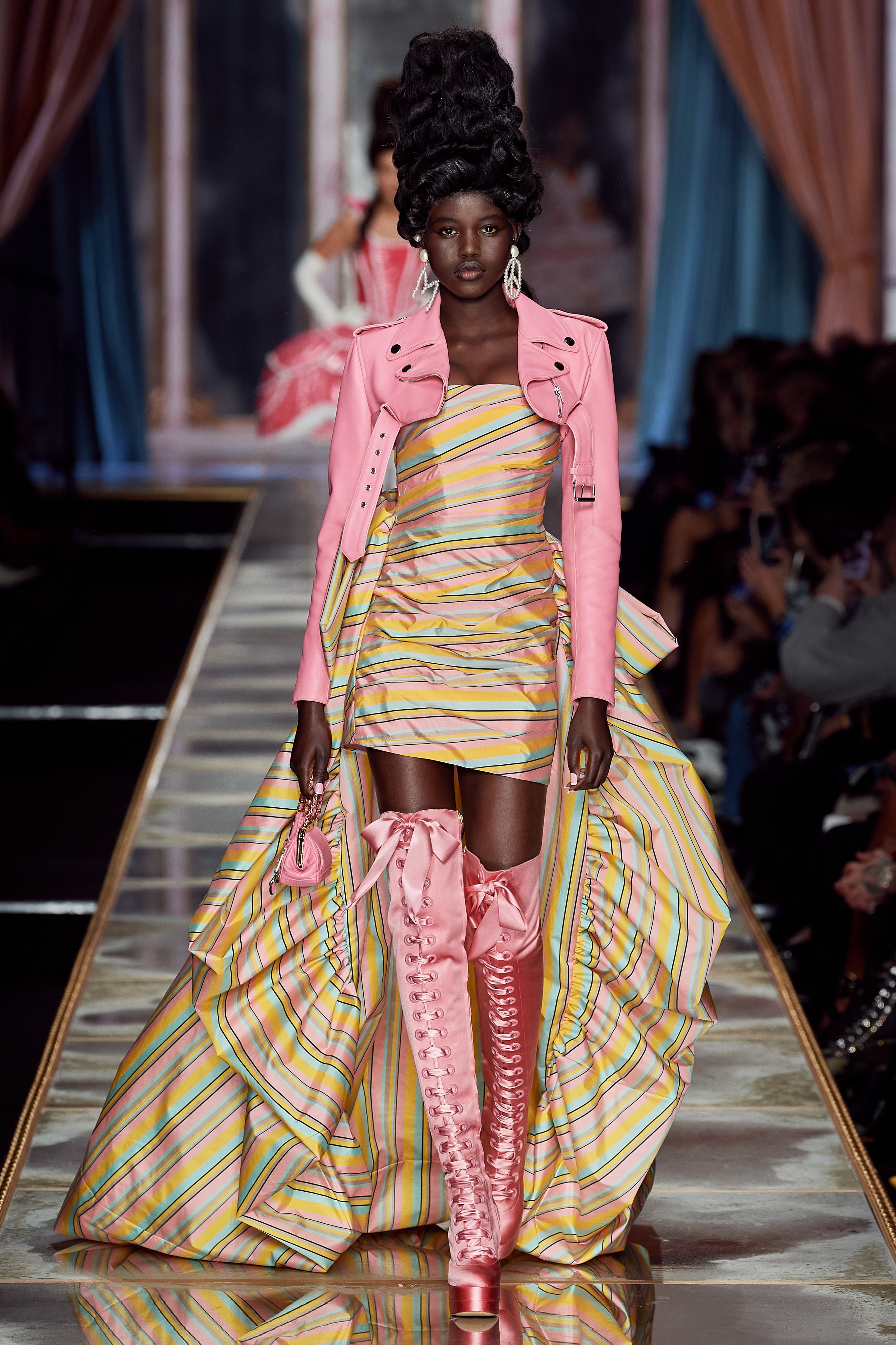 Пышная конструкция панье или кринолина — один из самых интересных и неожиданных трендов сезона. Модели, в том числе и Джиджи Хадид, выходили к гостям в высоких париках конфетных оттенков и платьях в духе рококо. Камзолы, зауженные кюлоты и фраки с богатой вышивкой также вошли в коллекцию. Дополнили всё платья в бантах с кружевами в стиле японских фрик-модниц токийского района Харадзюку и сумочки в виде сладостей.